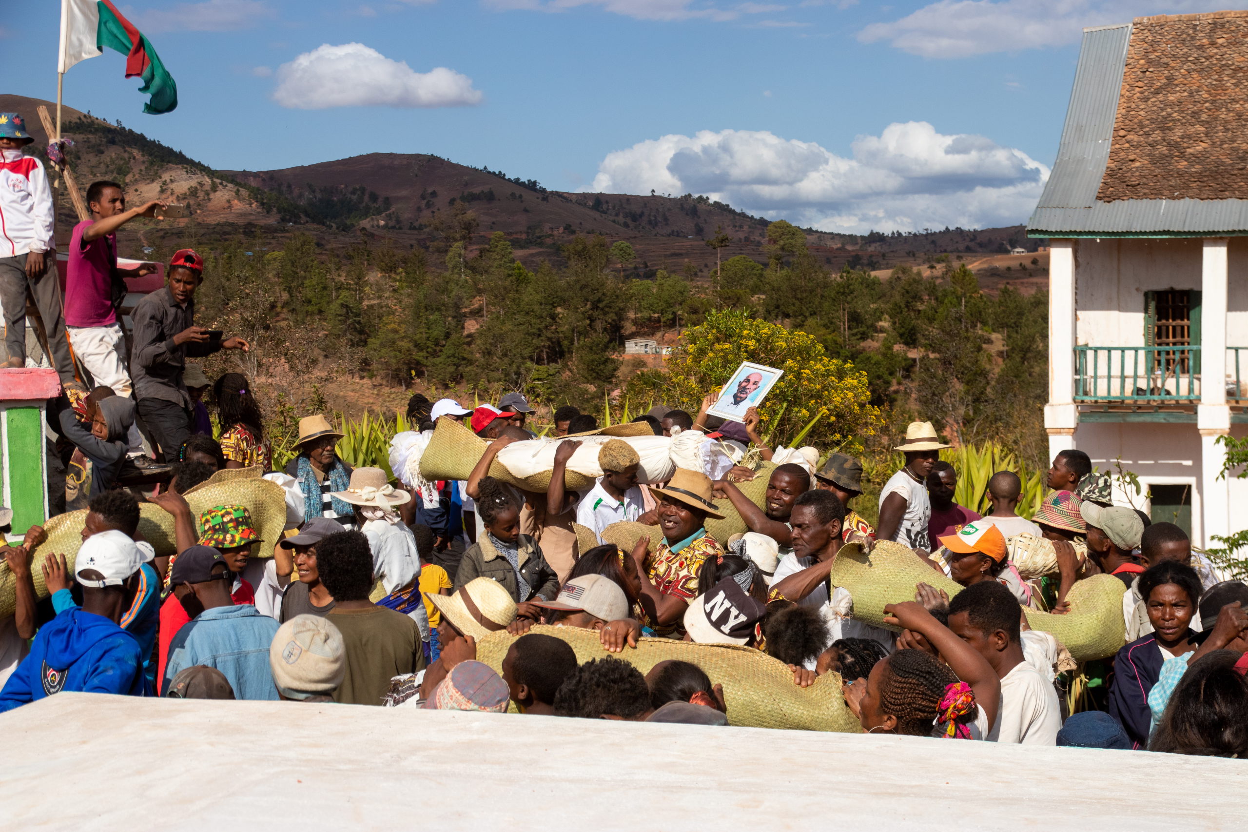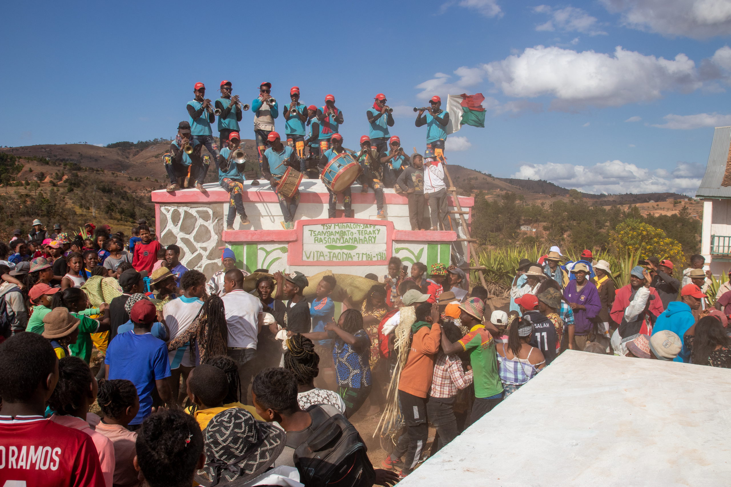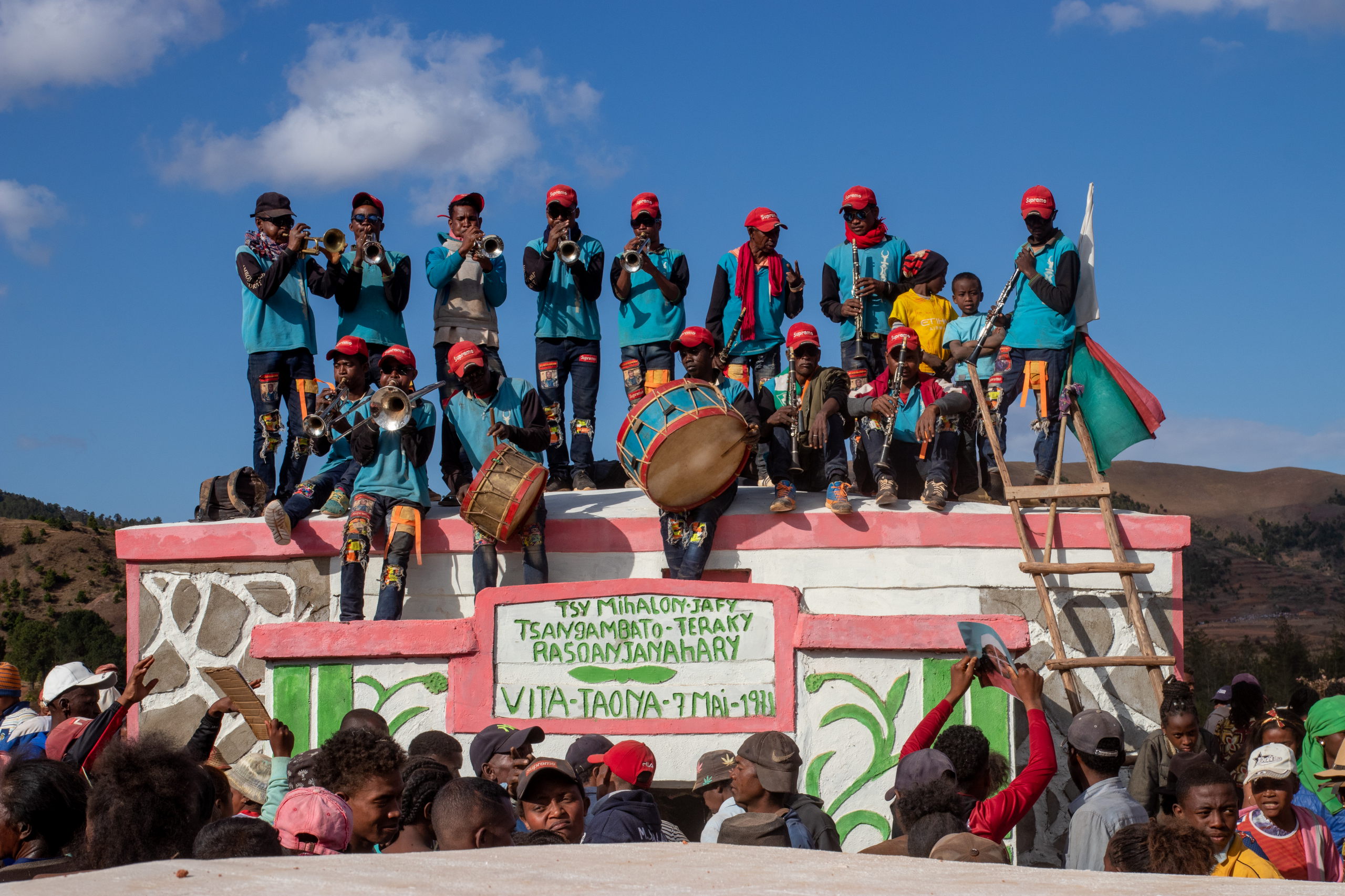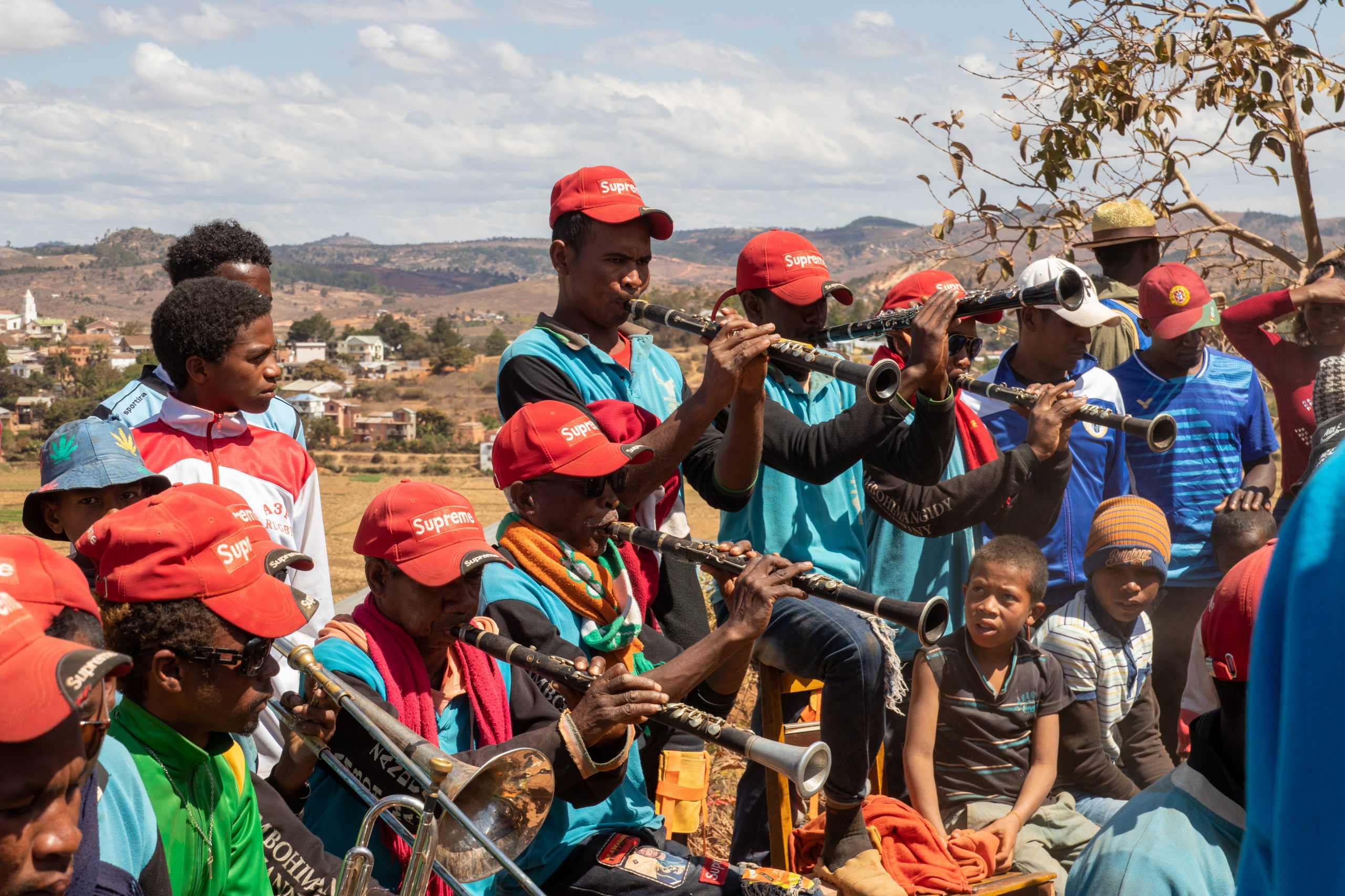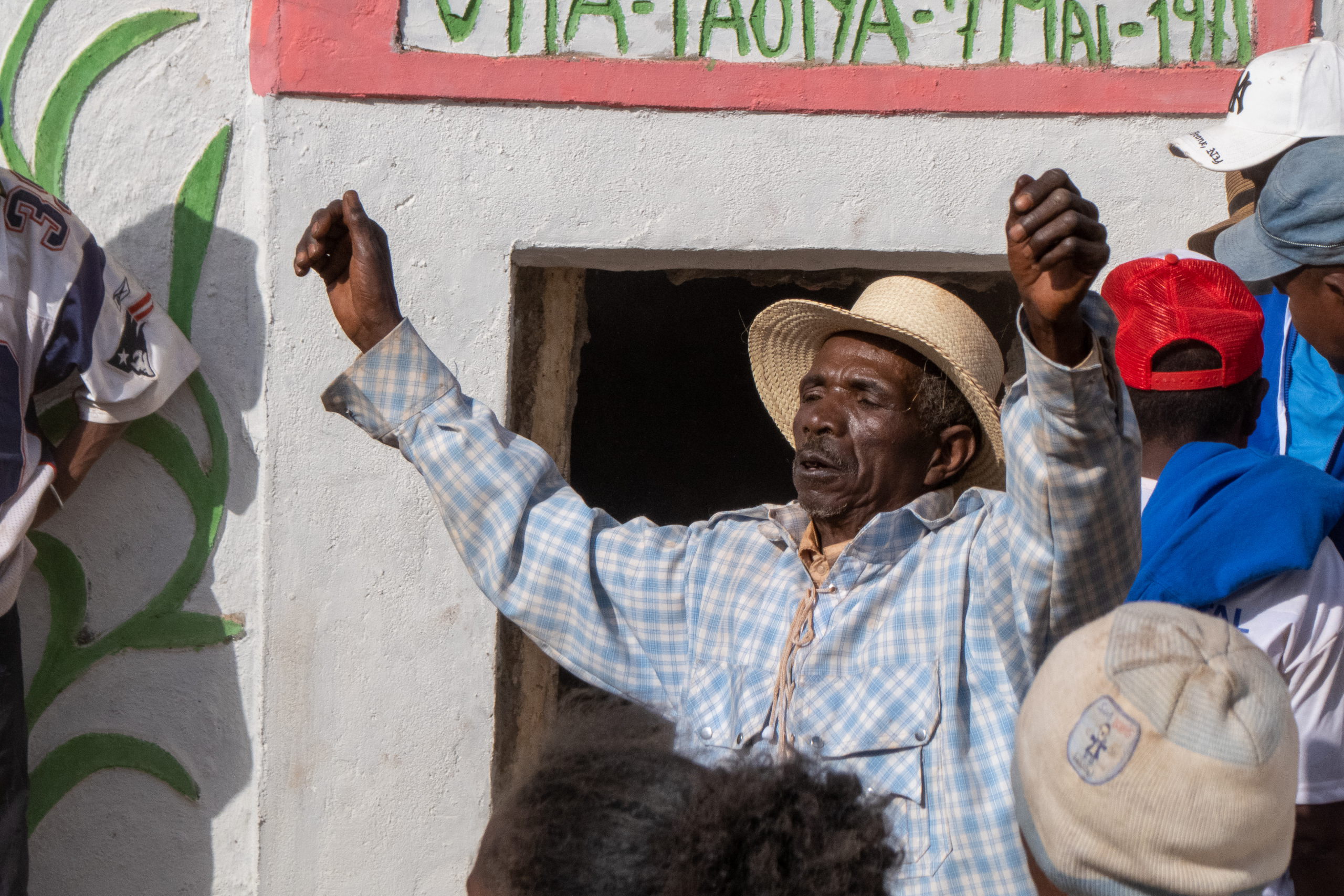 Ich bin aufgeregt, da heute die Chance besteht, eine Famadihana in der Umgebung zu sehen. Ich bespreche die Option mit Bari und er meint, dass auf den Weg nach Antananarivo viele sind und es zeitlich wesentlich günstiger ist. Perfekt. Dann kann’s losgehen. Bei einem Zwischenstopp versorge ich mich mit Reiscookies. Allerdings einer anderen Variante. Diese sind halbiert und noch einmal in reichlich Fett angebraten. Mjam. Bari fragt in mehreren Orten, nach Famadihanas, aber die waren alle schon gestern. Mist. Das Datum wird von einem Schamanen bereits ein Jahr in voraus festgelegt. Esgeht weiter ind wir nähern uns Tana. Ich dränge Bari erneut zu fragen, denn je näher an der großen Stadt, desto weniger wird dieser Brauch ausgeübt. Ich hatte die Hoffnung schon aufgegeben, aber ein Mann meint, oben bei der Kirche ist etwas am Laufen. Wir fahren hin und tatsächlich wird eine Famadihana gefeiert. Bari fragt das Familienoberhaupt um Erlaubnis, ob ich teilnehmen darf. Ja, wenn ich ein wenig in die Gemeinschaftskasse einzahle. Ausgezeichnet.