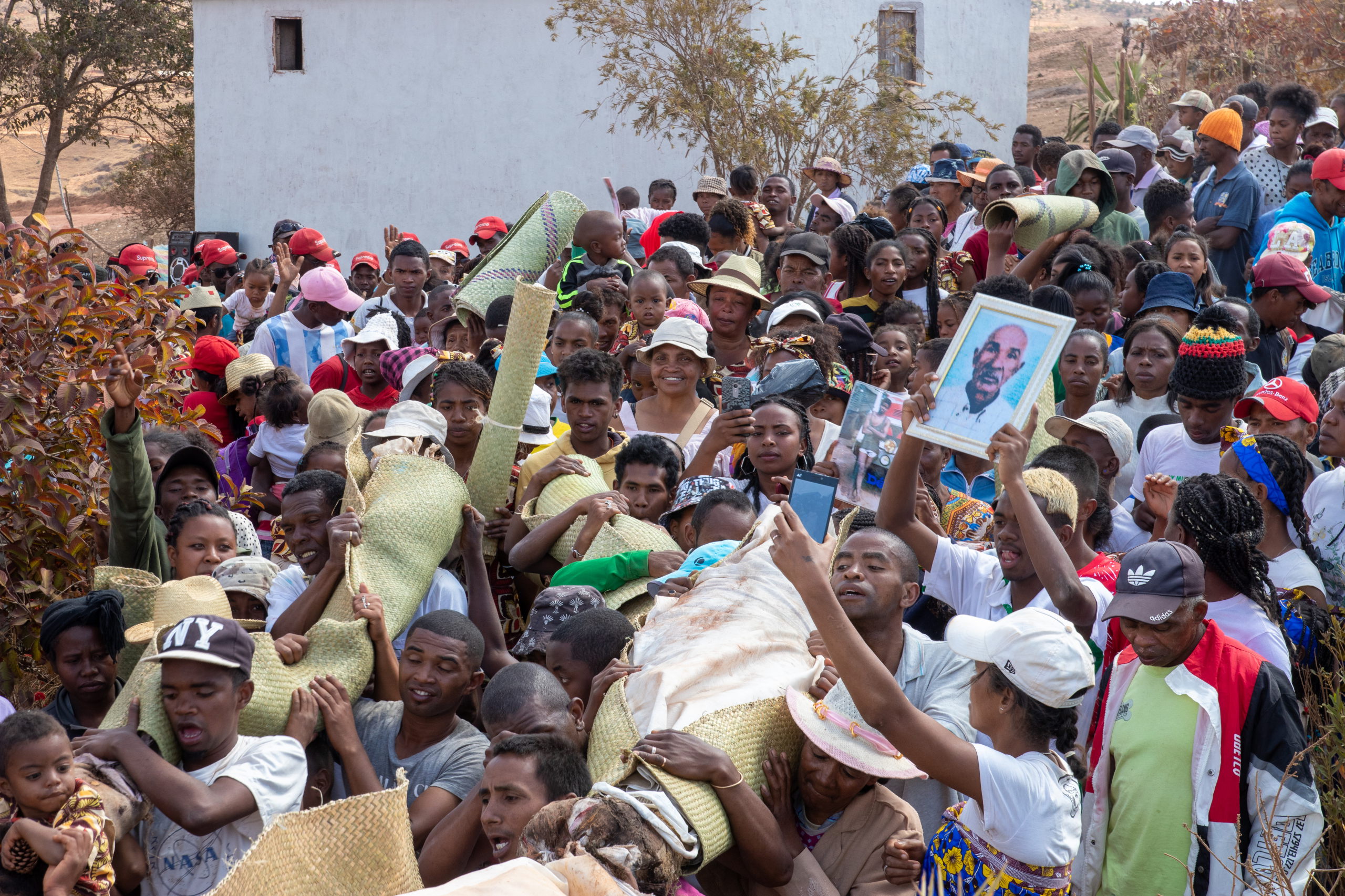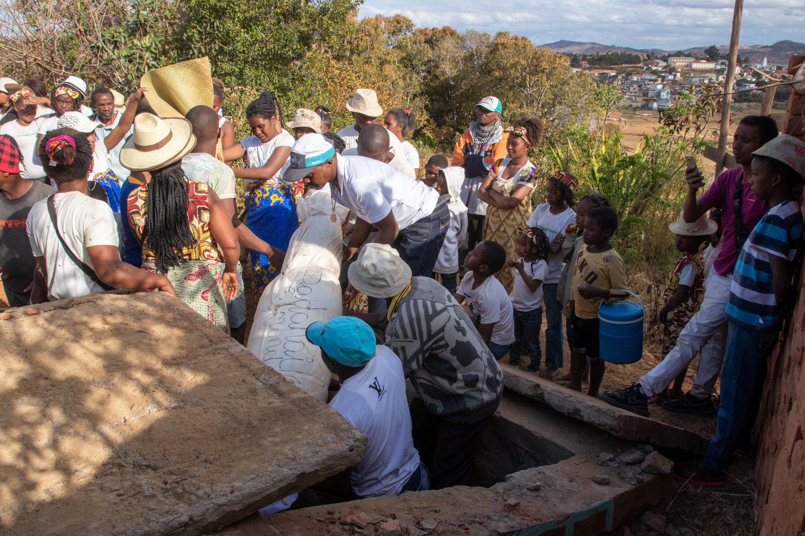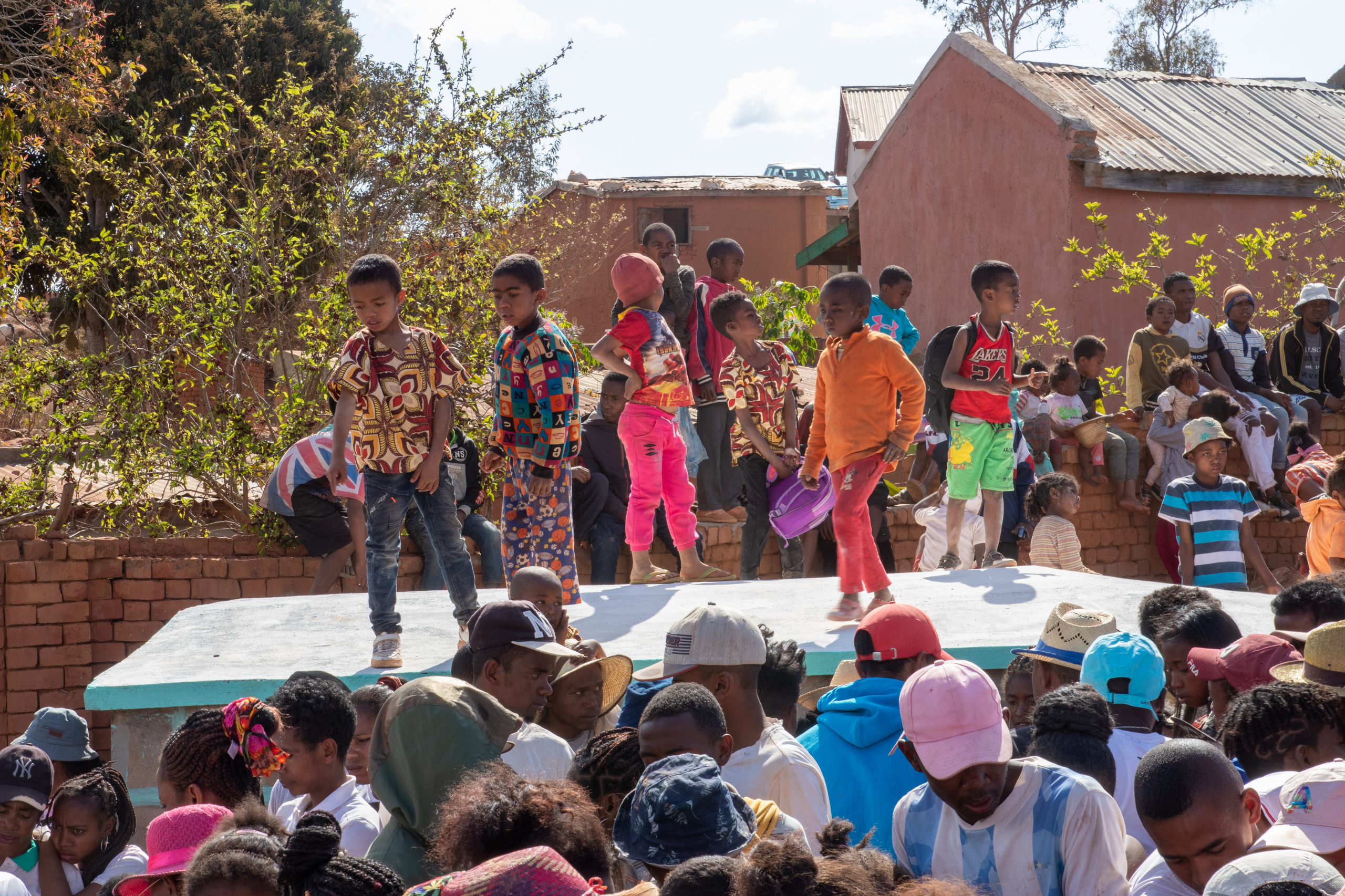Tja, und was ist nun so eine Famadihana eigentlich? In Madagaskar ist der Tod nicht für die Ewigkeit. Die Toten werden zu Geistern, die in Bäumen, Tieren und in der Luft Leben. Darum sollte man auch nicht mit ausgestrecktem Finger auf etwas zeigen, da man damit die Geister beleidigen könnte. In den Gruften ist es dunkel und kalt und die Toten sind gelangweilt und vermissen ihre Familien, weshalb sie von Zeit zu Zeit zurückkehren möchten. Bei einer Famadihana werden die Gräber geöffnet, die in Tücher gewickelten Toten zum Sonnenbaden aufgebahrt, während die Familie feiert und dann mit ihnen tanzt.