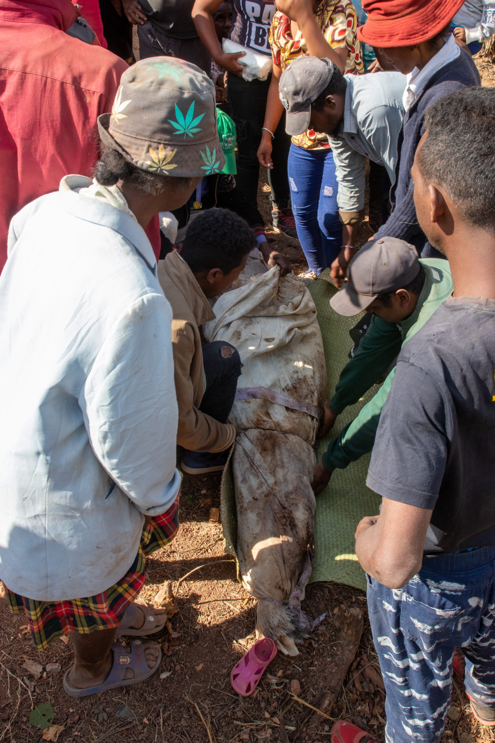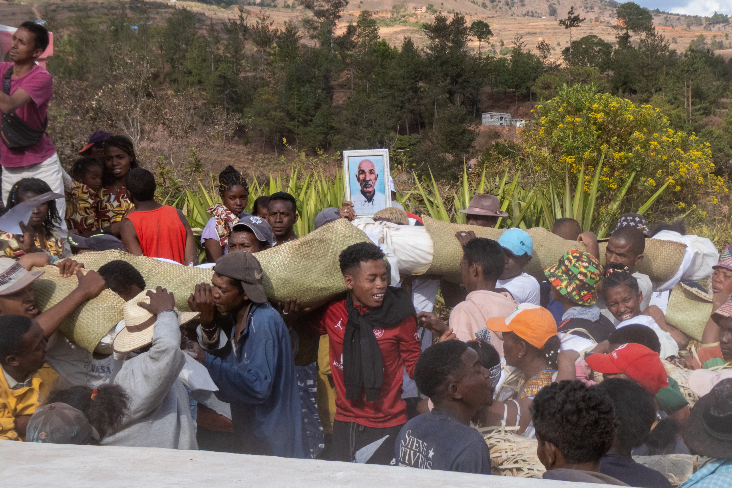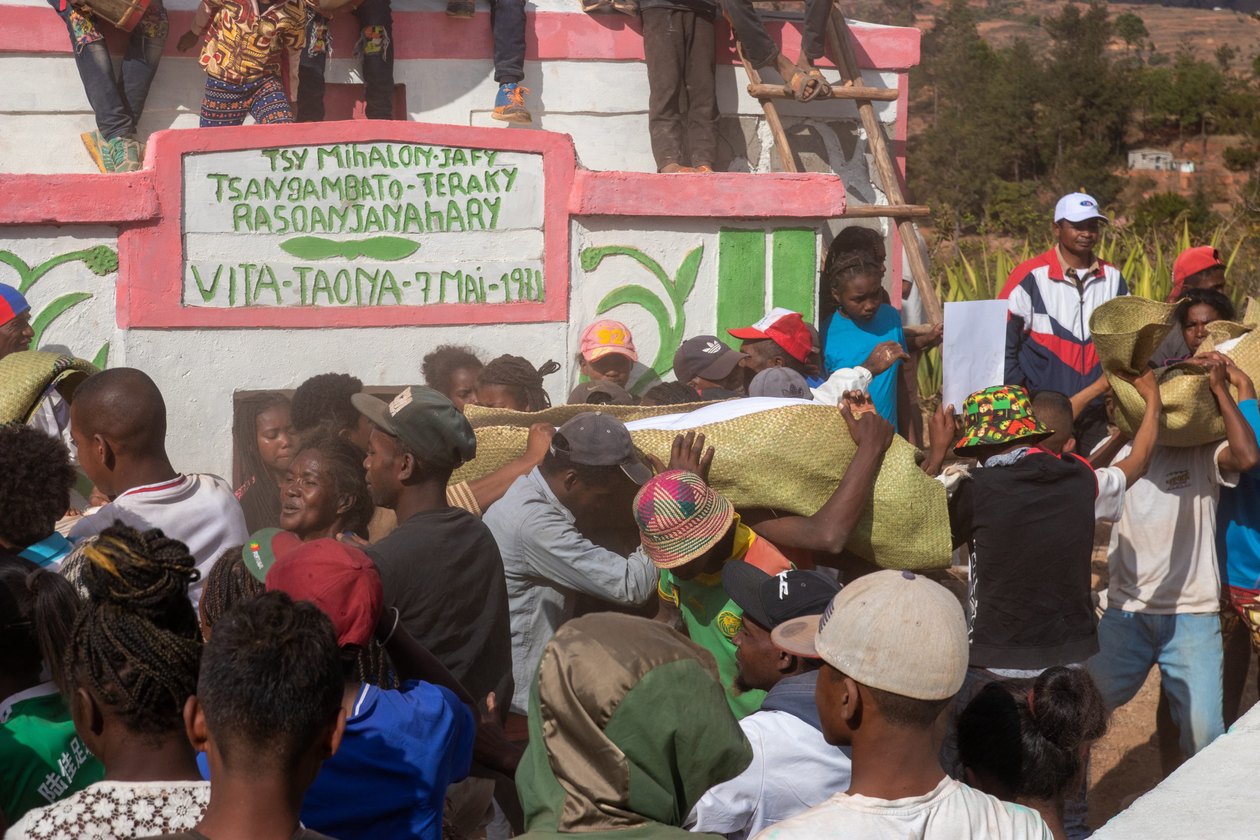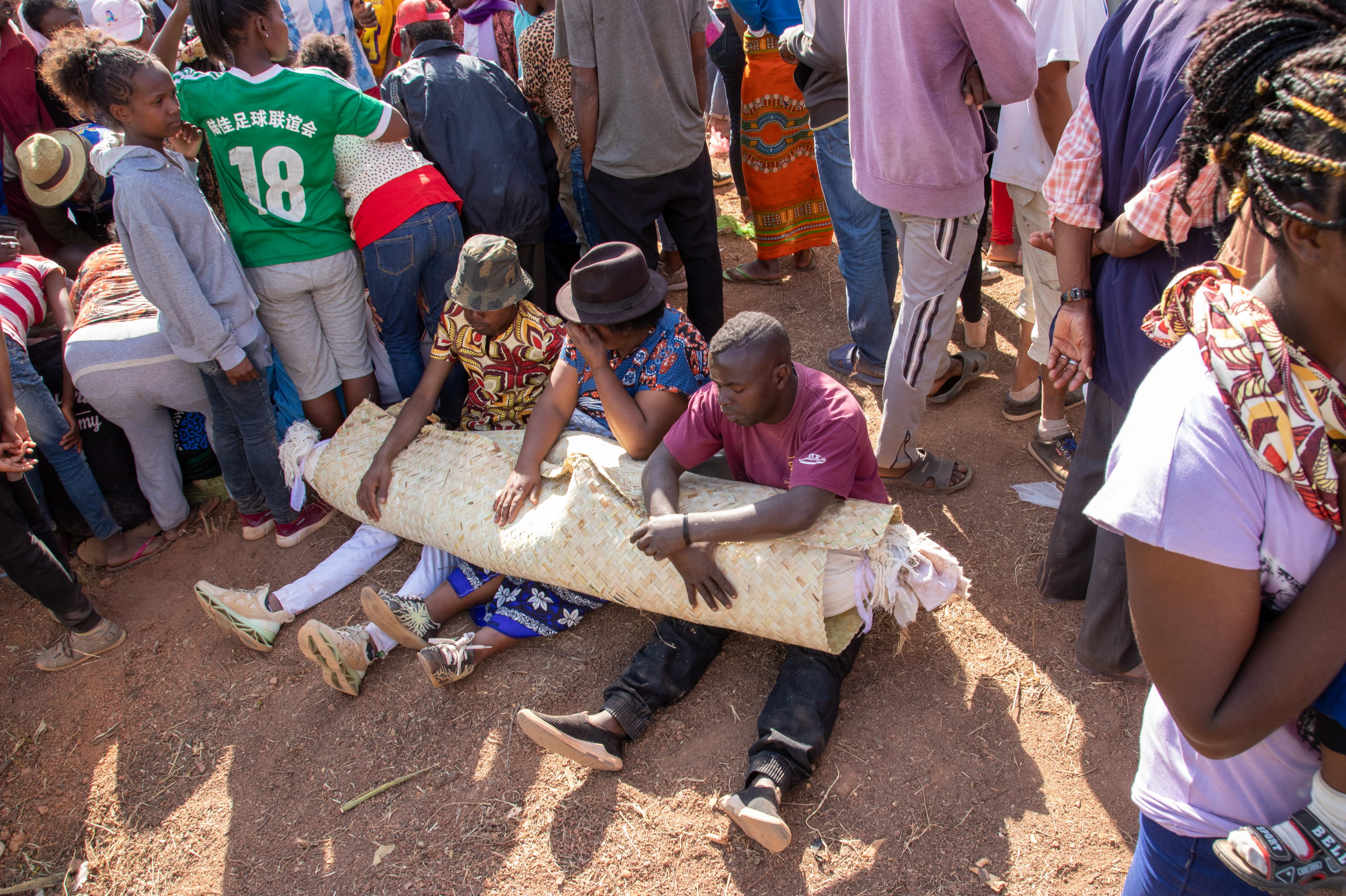 Plötzlich tut sich etwas. Die Überreste der in Seidentücher eingewickelten Toten werden in Matten gebettet und ein Zug formiert sich. Mit Musik, Tanz und einem Fahnenträger geht es zu den Gruften.