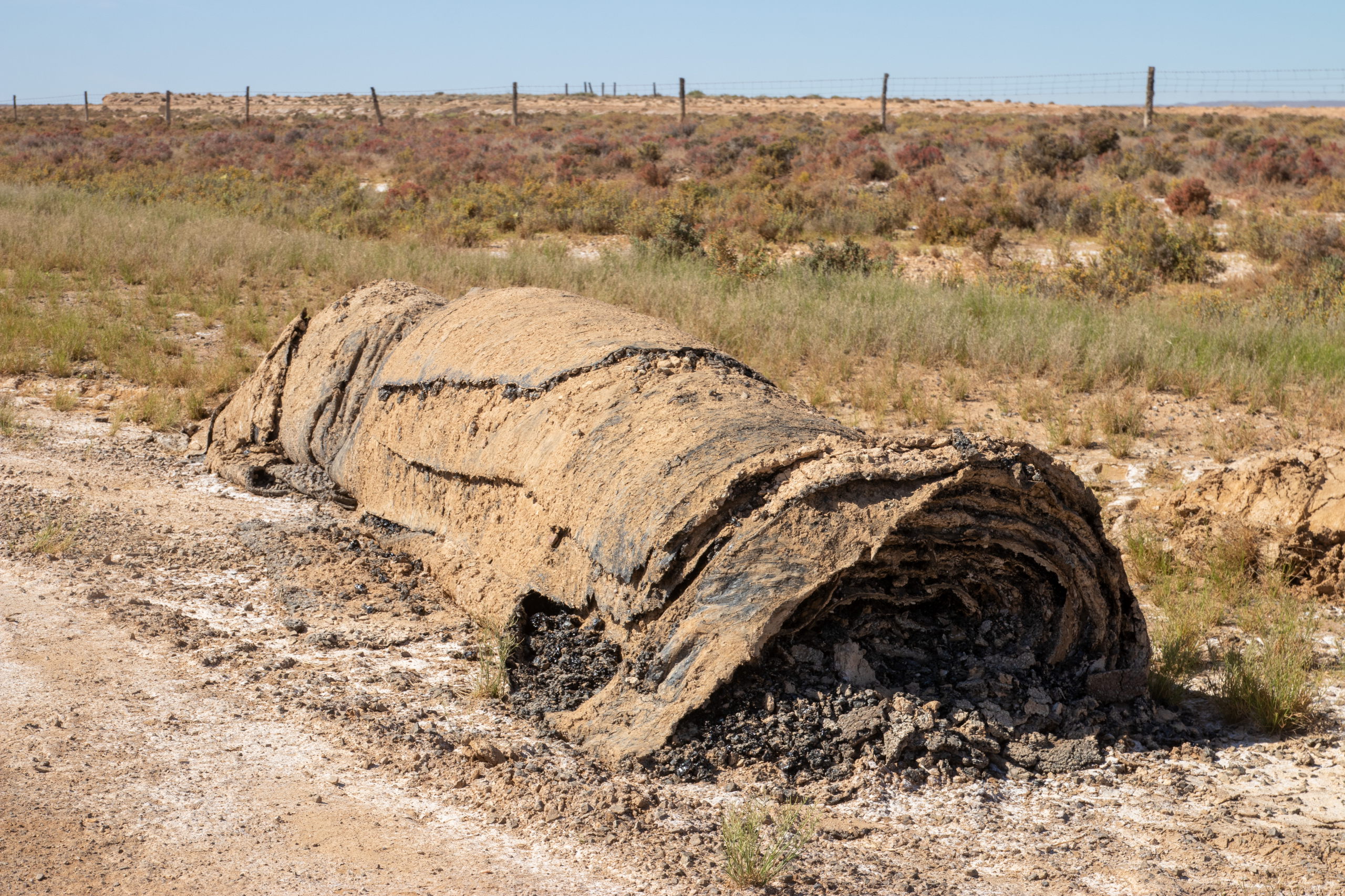 An manchen Stellen geht die asphaltierte Straße in eine Schotterstraße über. Komische Dinge liegen am Straßenrand. Als ich sie genauer betrachte, sehe ich, dass der Straßenbelag aufgerollt und hier abgelegt wurde. Tja, da war die Straße wohl ziemlich hinüber.