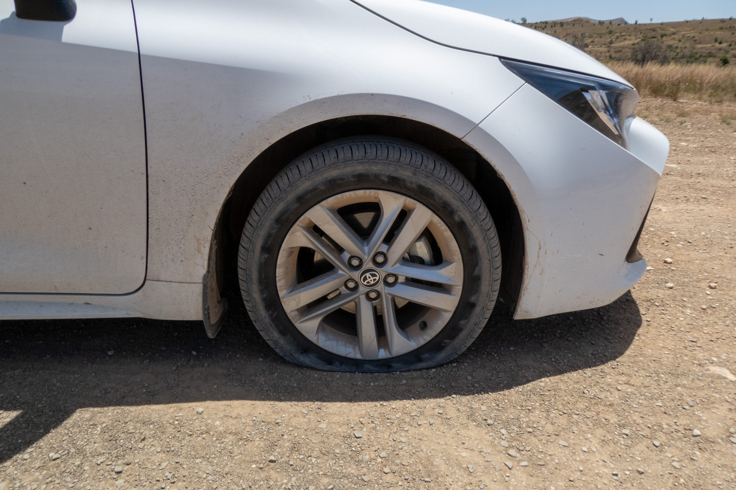 In Blinman angekommen, biege ich rechts ab und fahre Richtung Hawker. Über eine kurze Schotterstraße geht es hoch zur Great China Wall, einer Felsformation entlang eines Bergrückens. Und da passiert es. Ich habe einen Platten. Mist, ich bin wohl über einen der scharfkantigen Steine gefahren. Kein Problem. Selbst ist der Mann und nach nur 20 Minuten Werkeln in der prallen Sonne ist der Reifen professionell gewechselt. Allerdings möchte ich hier am A. der Welt kein Risiko eingehen, weshalb von nun an Schotterstraßen Tabu sind. Außerdem sollte ich schnellstmöglich eine Werkstatt aufsuchen, um den Reifen flicken zu lassen. Das wird heute schwierig, denn es ist Sonntag und keine Werkstatt hat offen. Deshalb beschließe ich zum Wilpena Pound im Ikara-Flinders Ranges National Park zu fahren und morgen die nächstgelegene Werkstatt anzusteuern.
