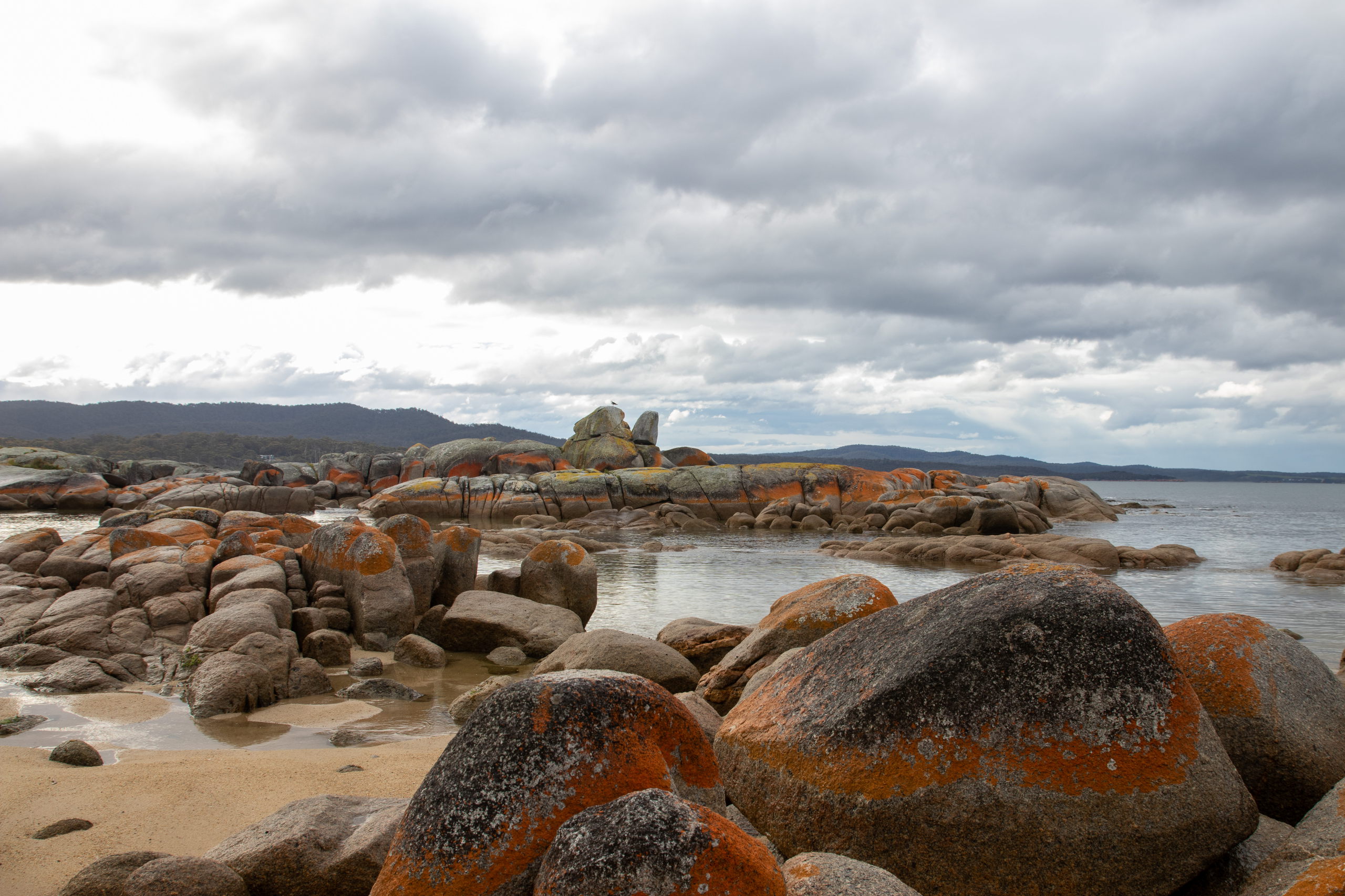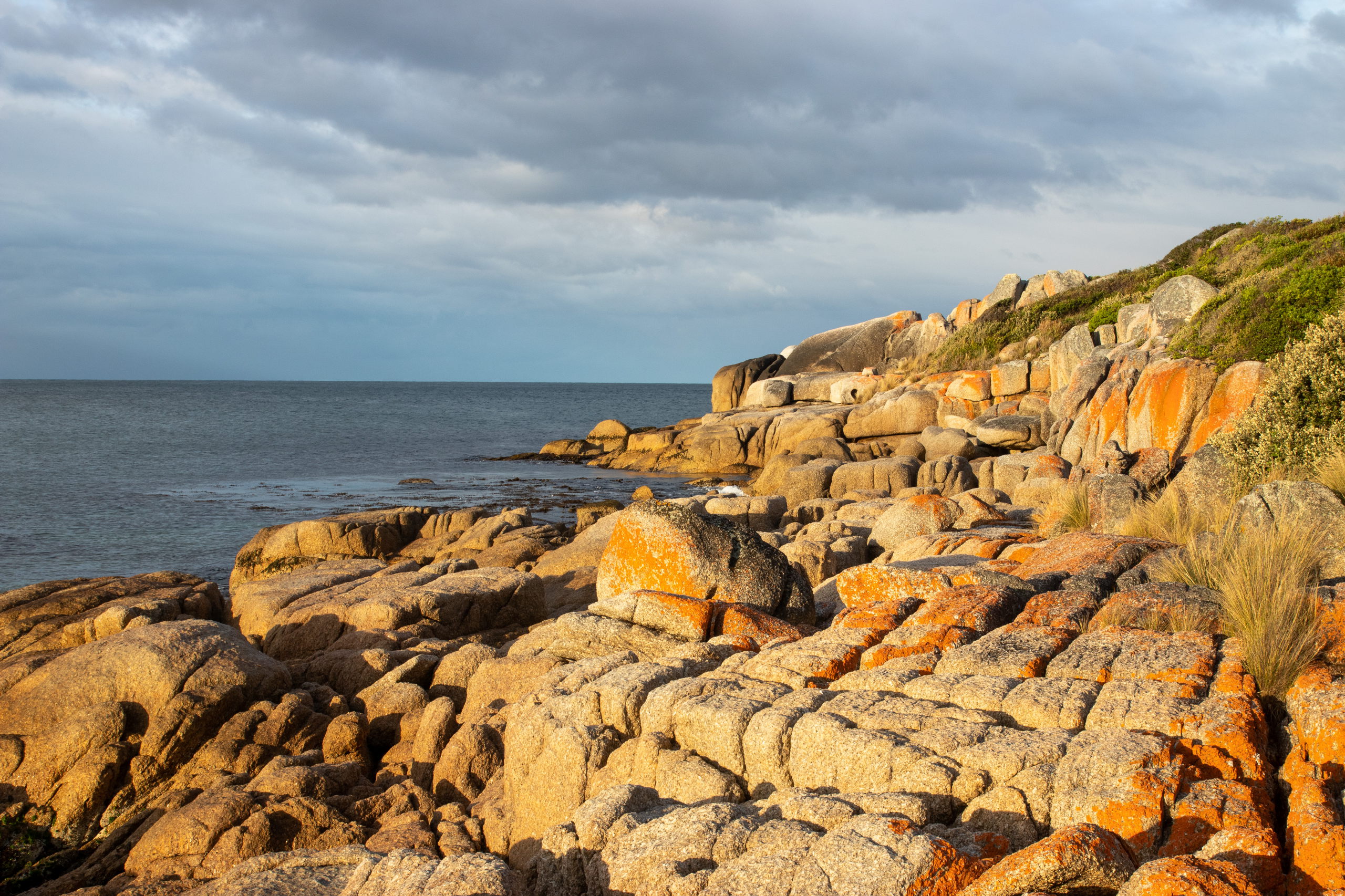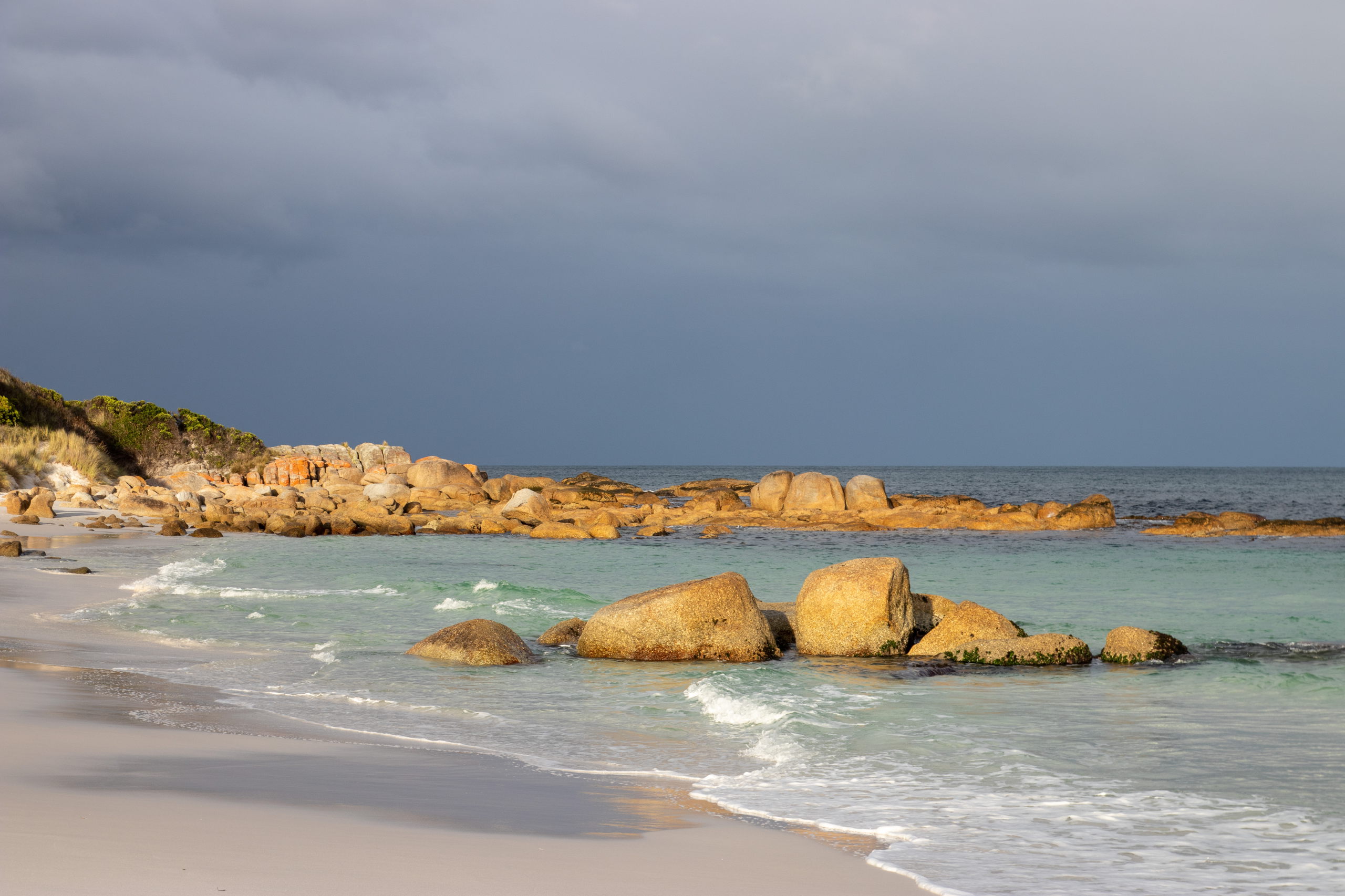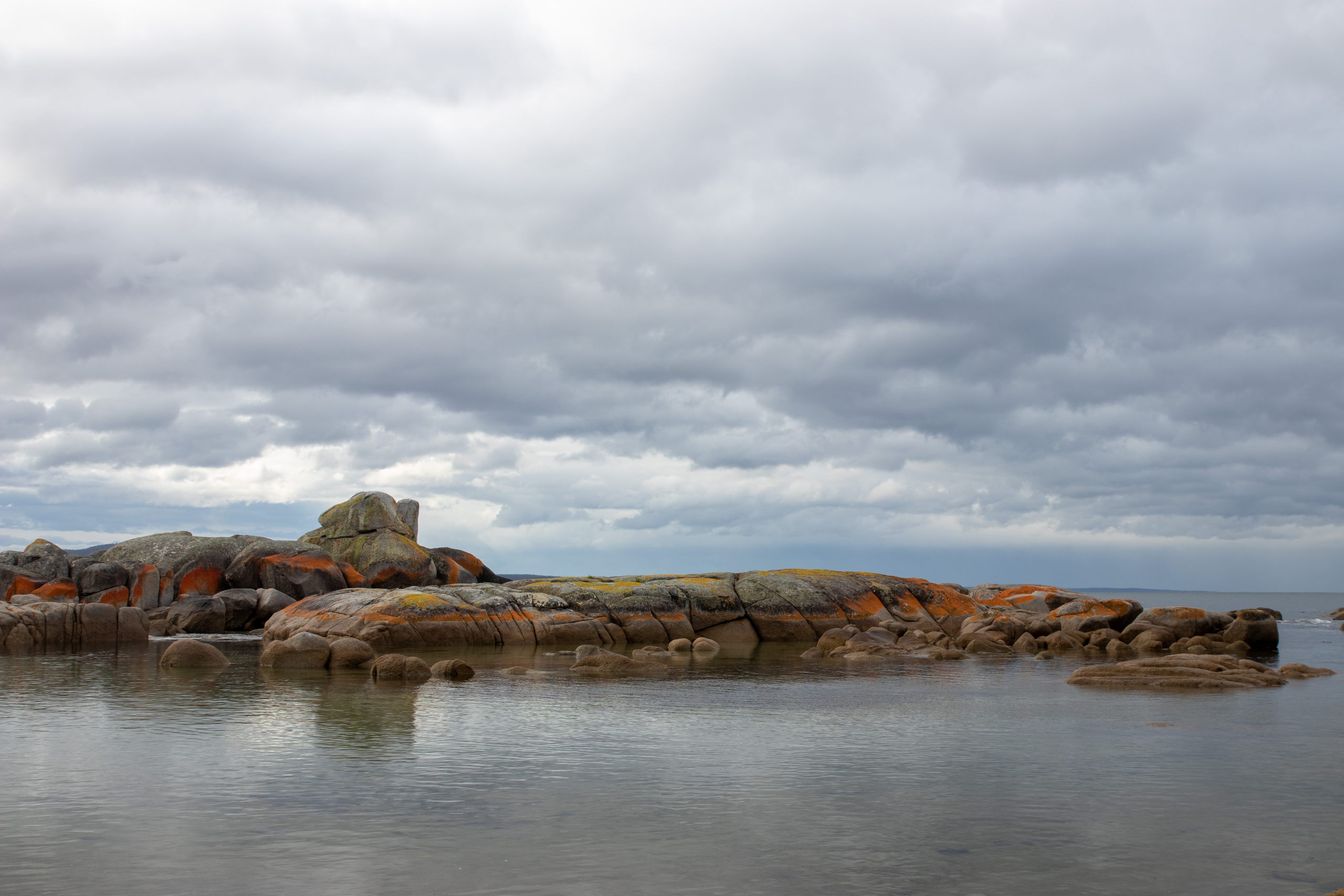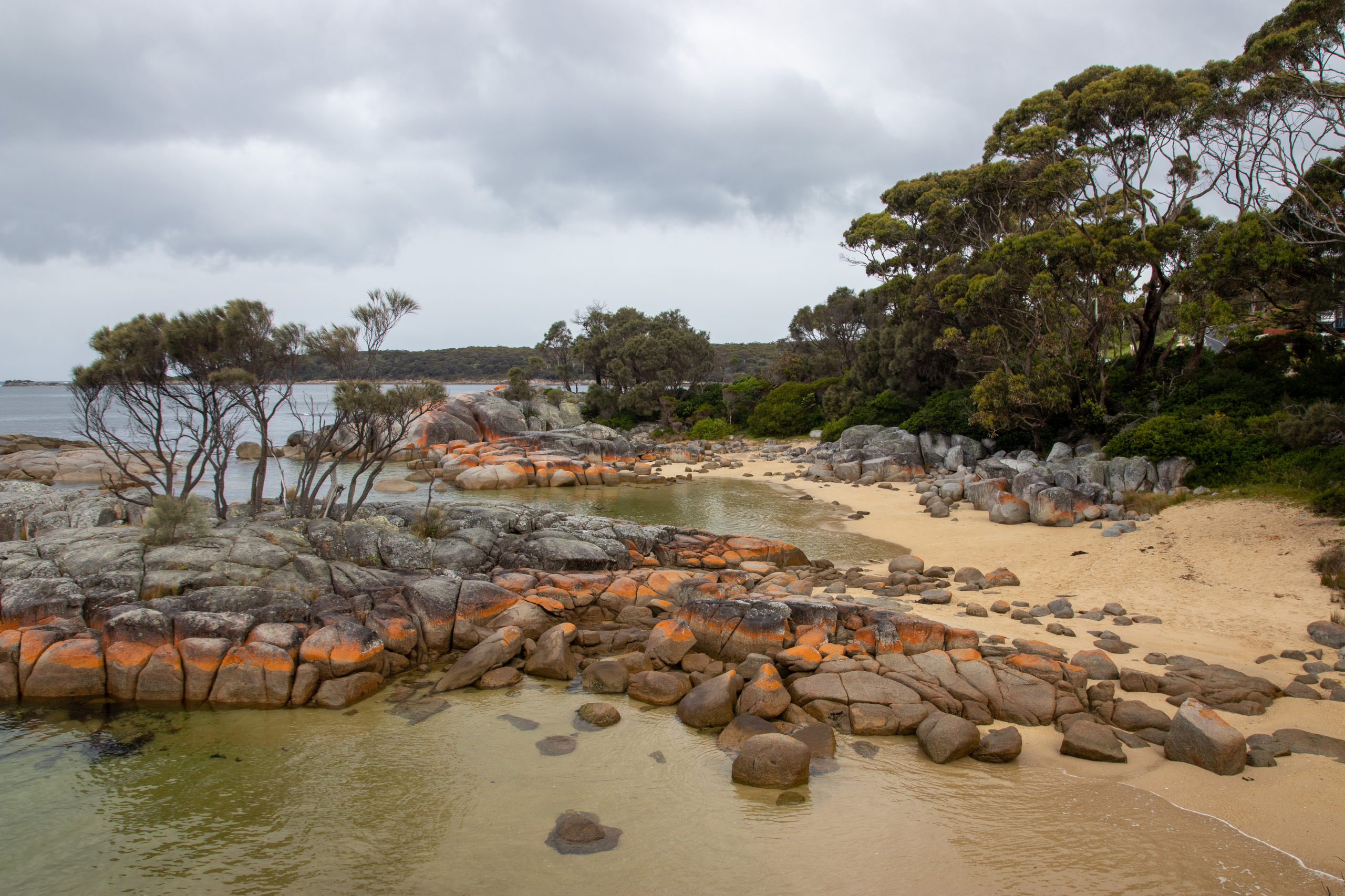 Ein Stück weiter liegt die Jeanneret Beach Campsite, mein Schlafplatz für heute. Auch hier gibt es viele Felsen, die mit rötlichen Flechten bewachsen sind. Sieht super schön aus und ich genieße es, die Felsen entlang zu hüpfen. Tja, es wird eben erst am Ende des Tages abgerechnet. Und dieser geht super schön zu Ende. Wie auch schon an vielen anderen Tagen ist es in der Nacht wieder sternenklar. Dass das für das Wetter am nächsten Tag nichts heißen mag, habe ich inzwischen geschnallt. Ich ziehe mir McMax rein, stelle einen Blogartikel online und schlafe dabei fast im Sitzen ein.