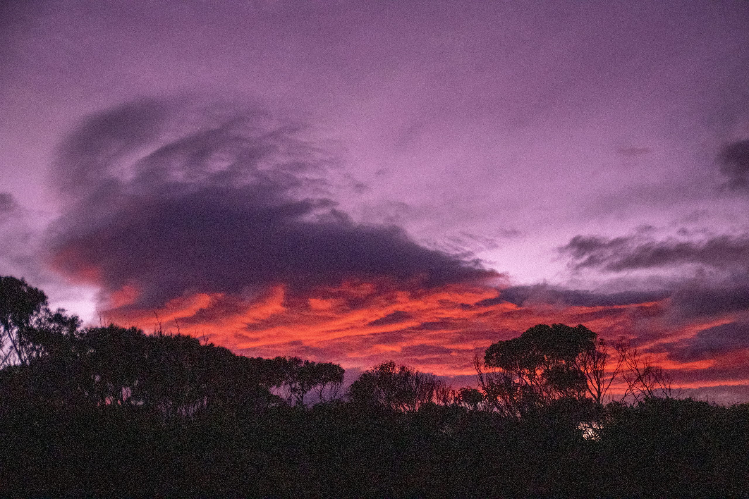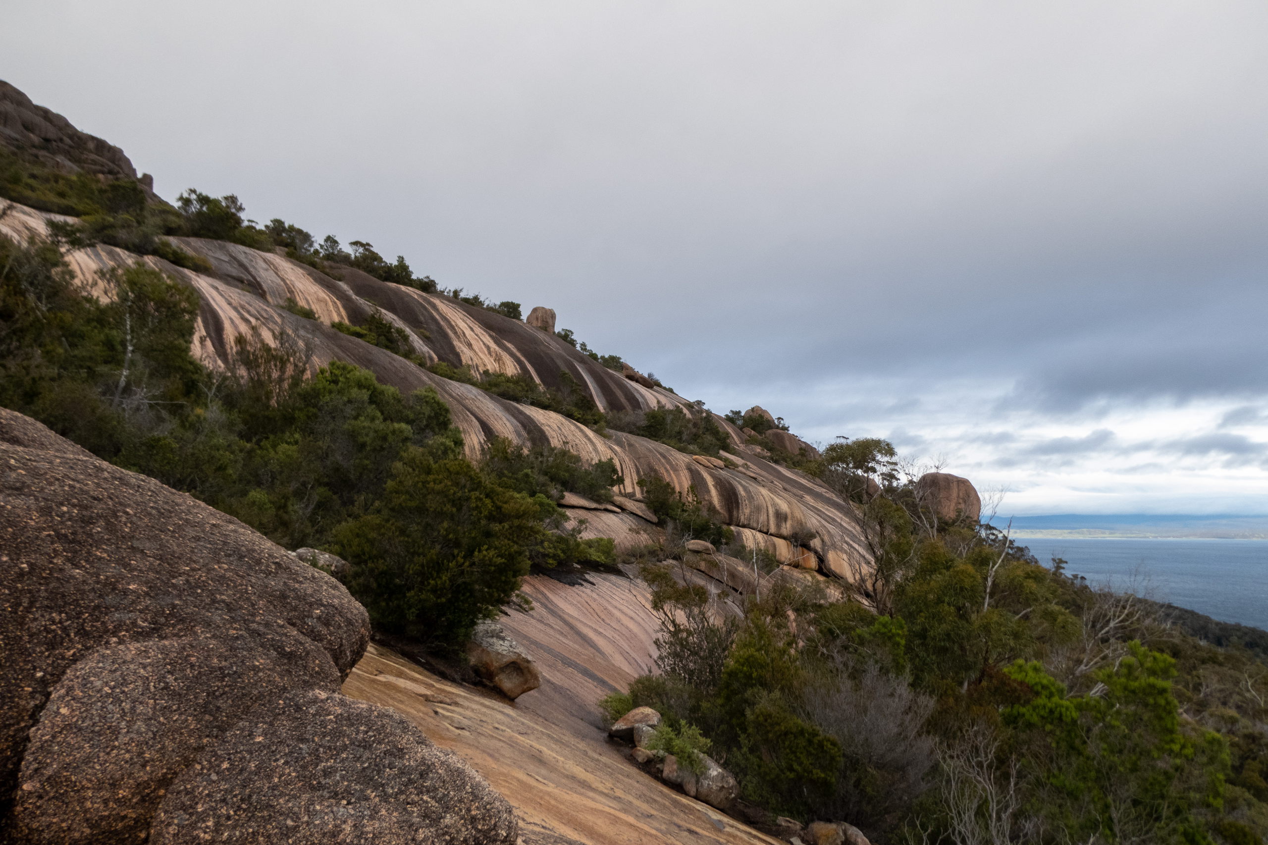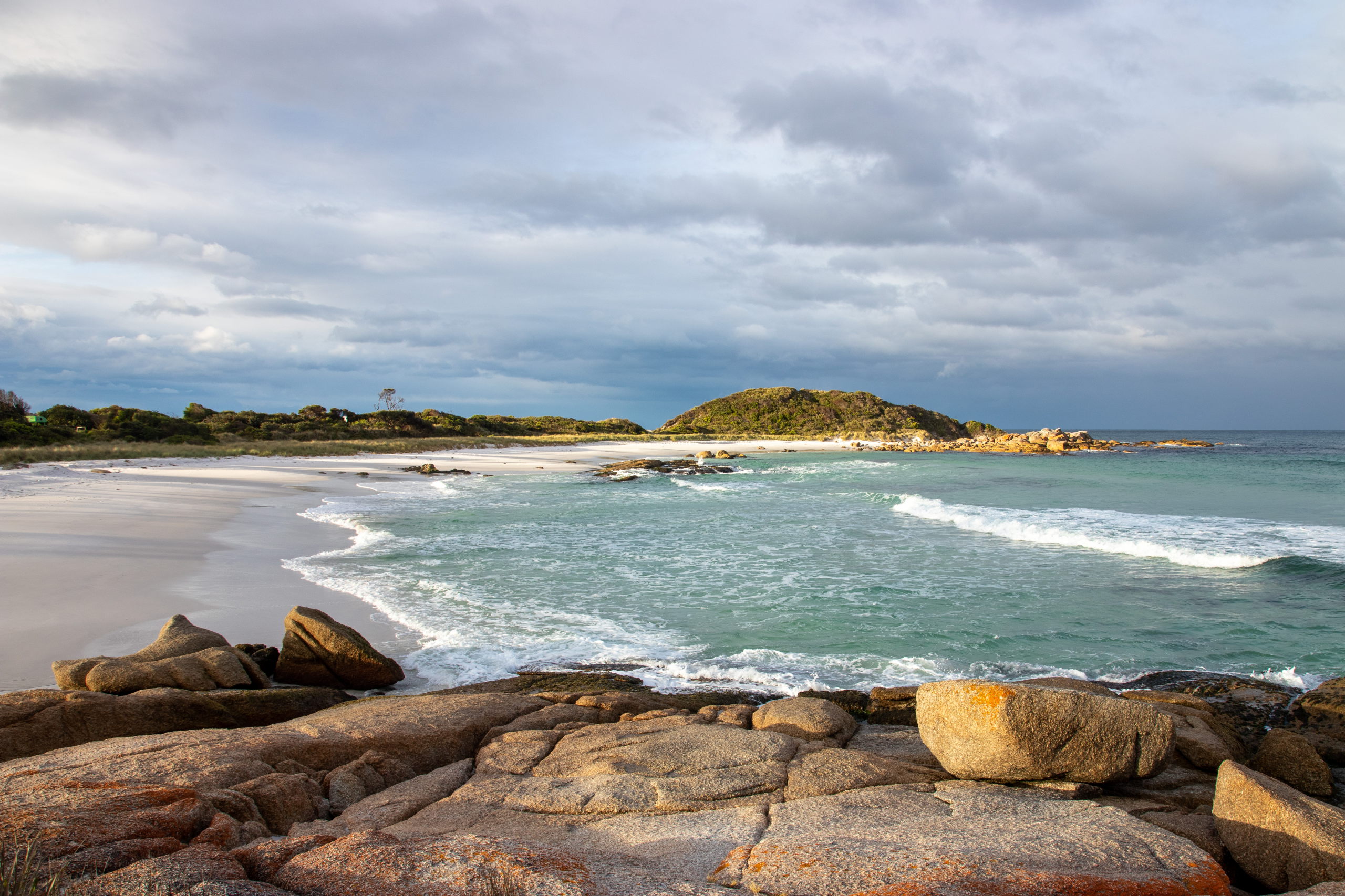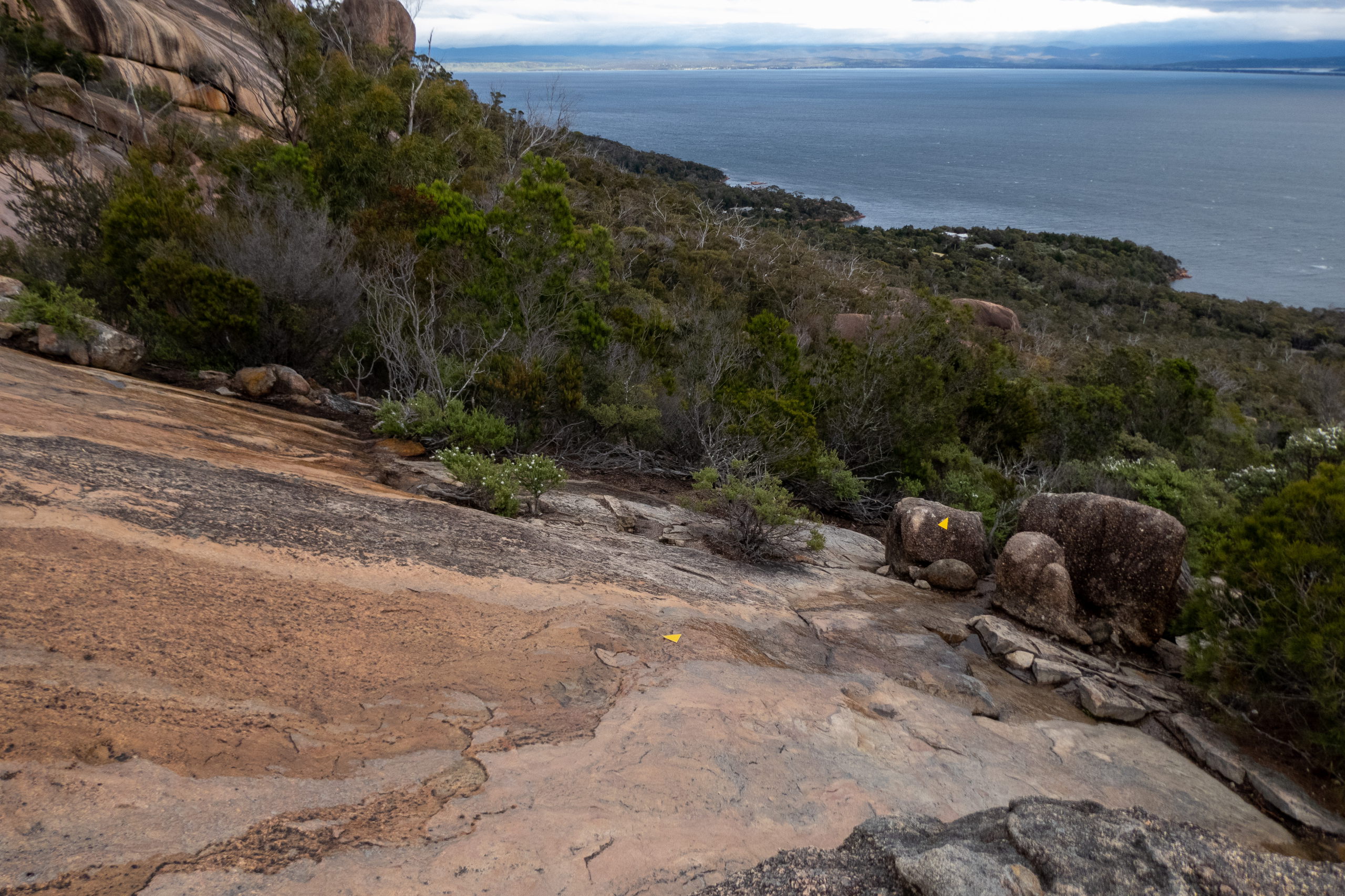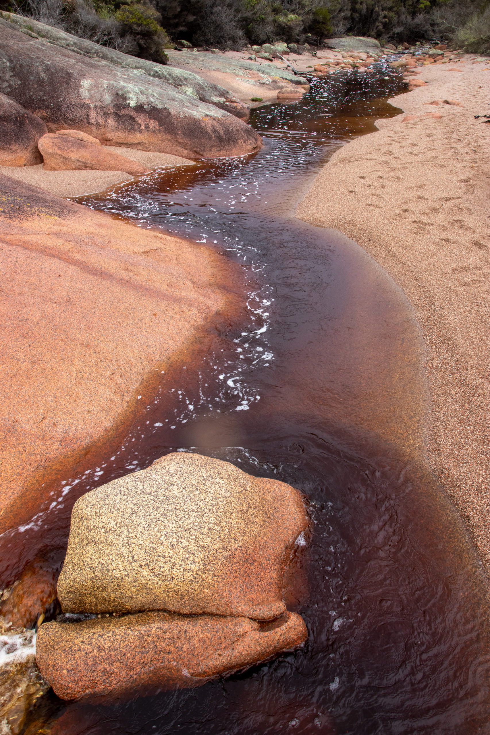 Ein Stück weiter liegt die Jeanneret Beach Campsite, mein Schlafplatz für heute. Auch hier gibt es viele Felsen, die mit rötlichen Flechten bewachsen sind. Sieht super schön aus und ich genieße es, die Felsen entlang zu hüpfen. Tja, es wird eben erst am Ende des Tages abgerechnet. Und dieser geht super schön zu Ende. Wie auch schon an vielen anderen Tagen ist es in der Nacht wieder sternenklar. Dass das für das Wetter am nächsten Tag nichts heißen mag, habe ich inzwischen geschnallt. Ich ziehe mir McMax rein, stelle einen Blogartikel online und schlafe dabei fast im Sitzen ein.