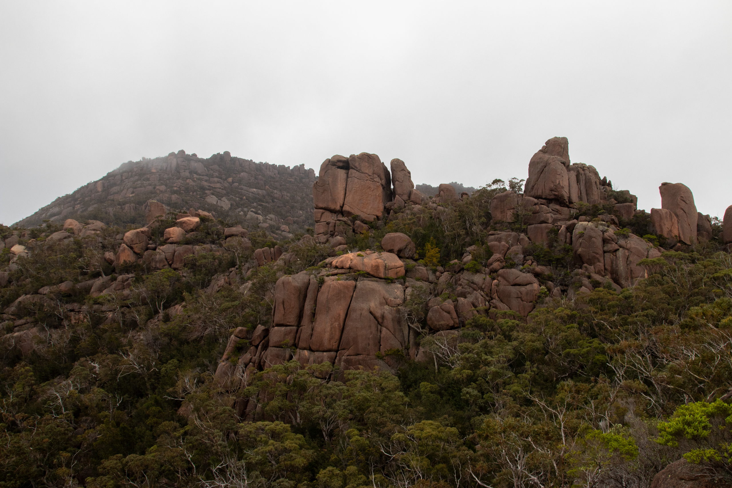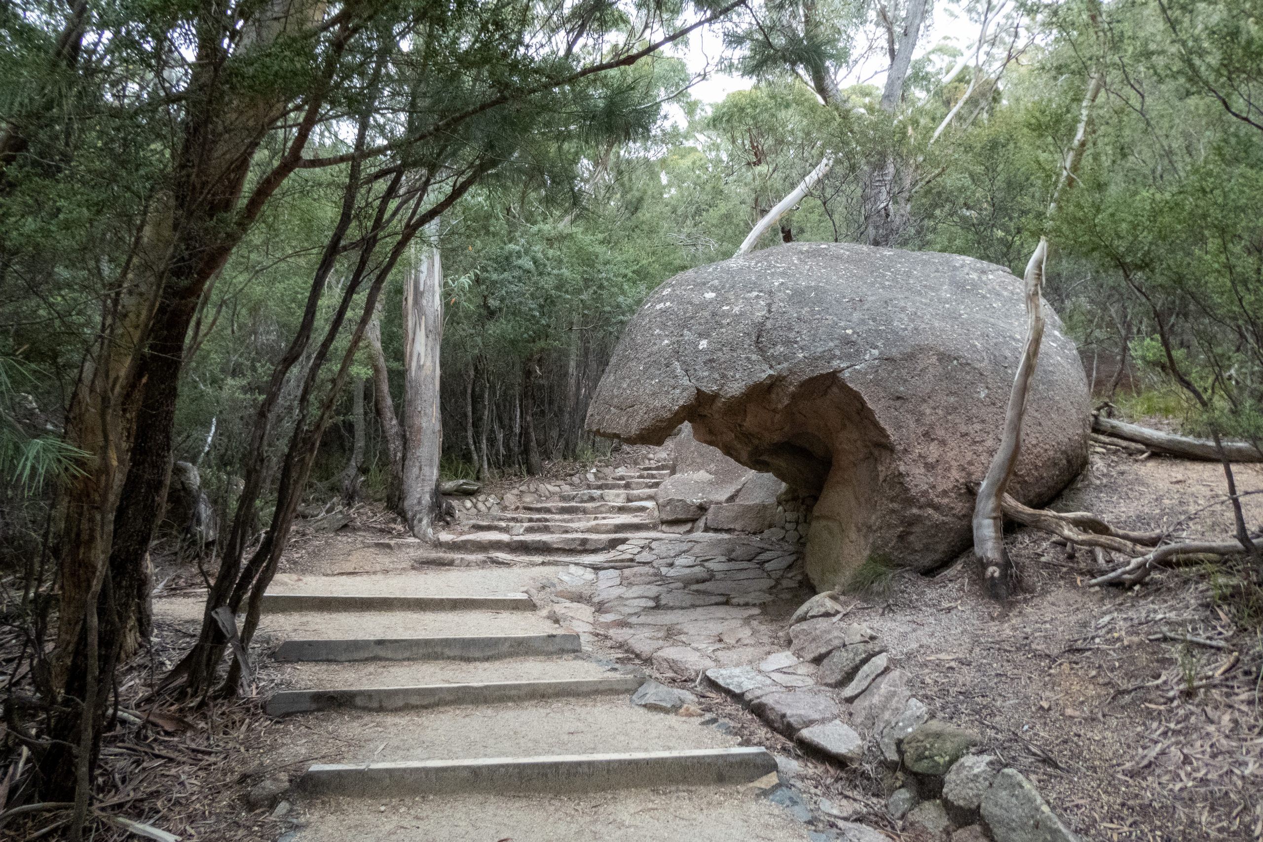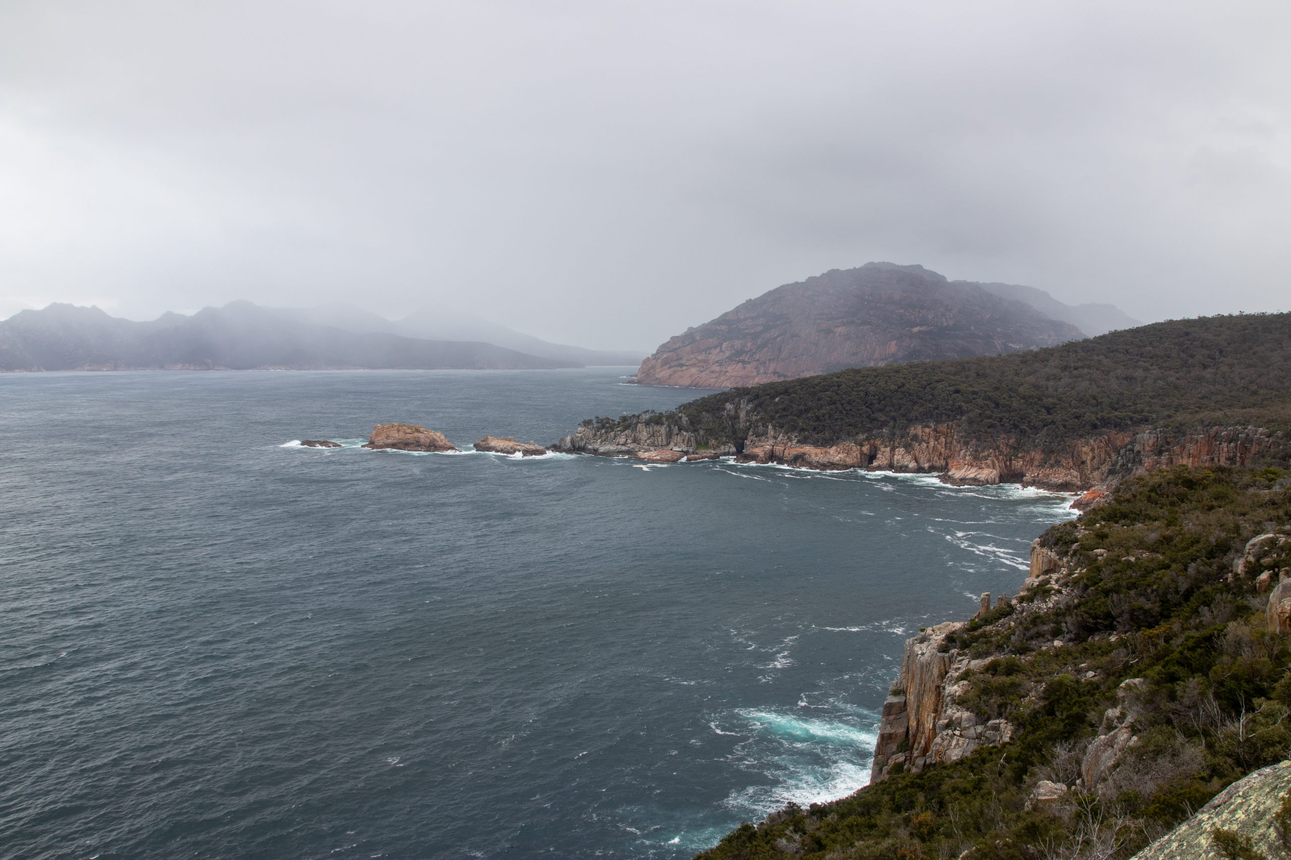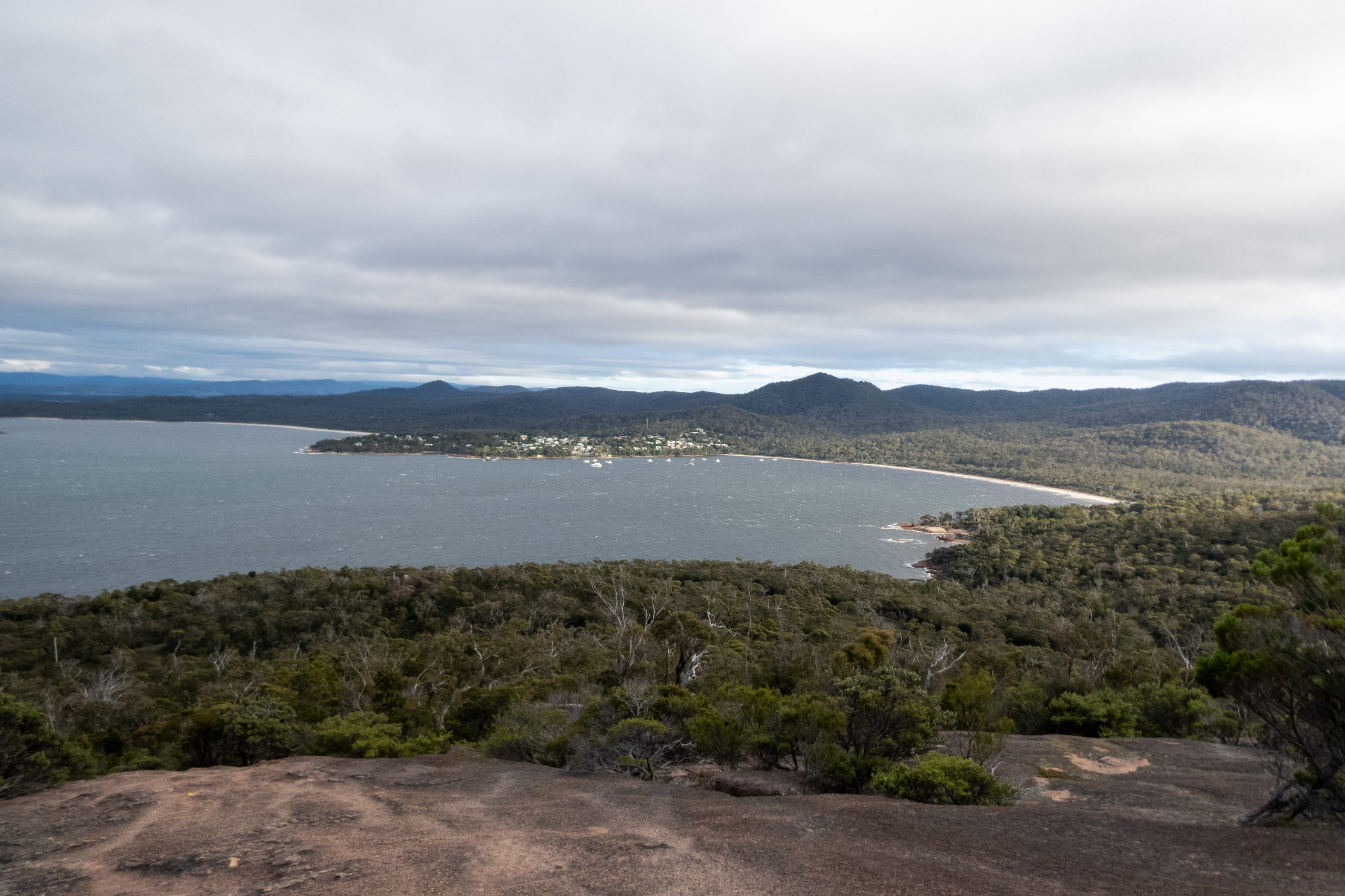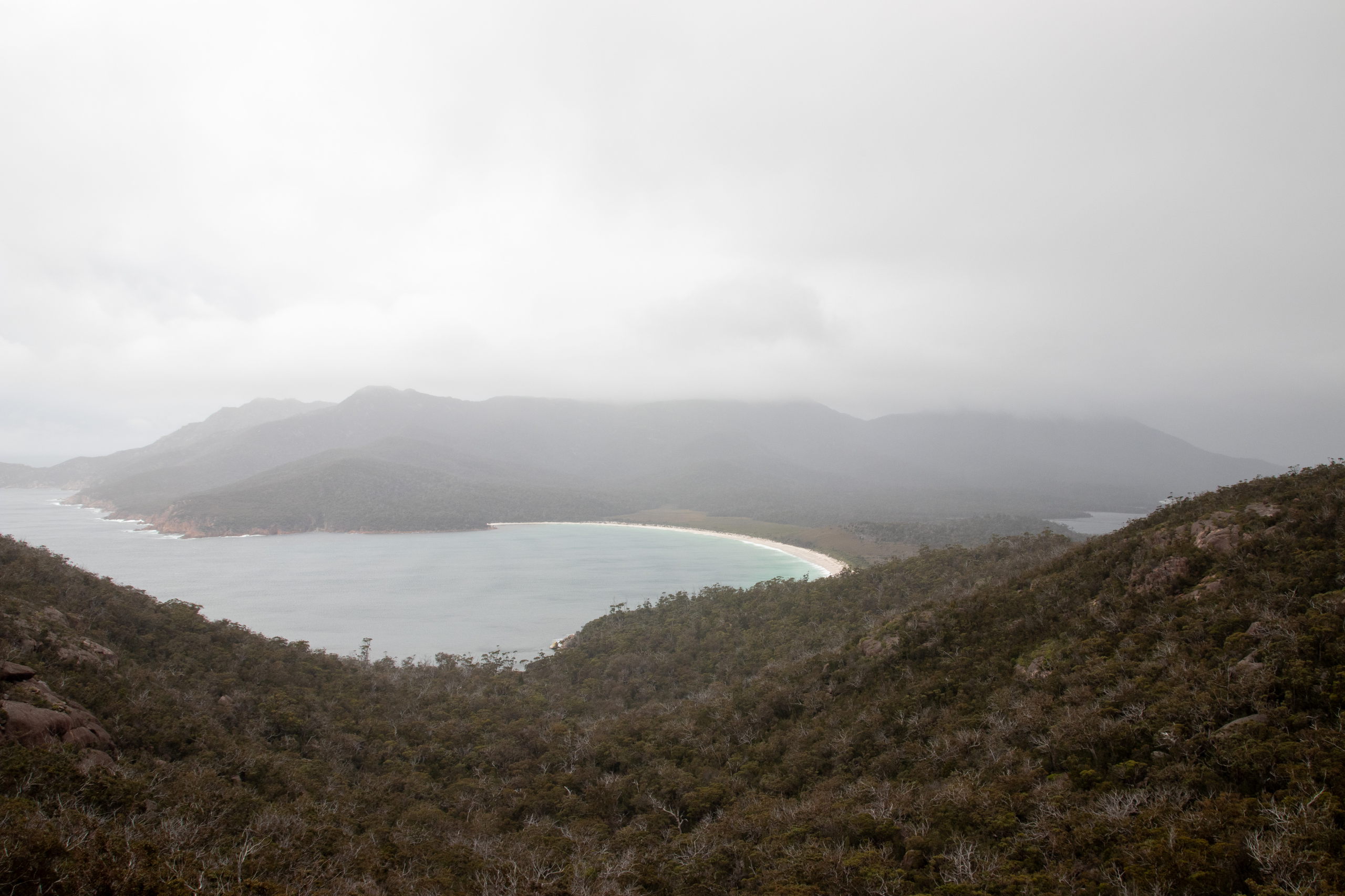 Nach einer kurzen Pause hirsche ich über einen gut befestigten Weg zum Wineglass Bay Lookout hoch. Als ich oben ankomme, beginnt es auf die Minute genau zu regnen. Na toll. Schön langsam kann mich das Wetter dort, wo die Sonne nicht hinscheint. Also in Tasmanien. 😁 Die Rundwanderung wird gestrichen und meine Stimmung hat sich dem Zustand meiner Kleidung angepasst. Angepisst. Immerhin war die Entscheidung richtig, am Mount Amos umzudrehen. Da möchte ich jetzt nicht oben stehen und runter müssen. Die Entscheidung über die Bootsfahrt ist somit auch hinfällig. Ich setze mich ins Auto, schreibe etwas für den Blog und trockne vor mich hin. Es ist kühl. Der Check des Wetterberichts ergibt: 4 Grad wärmer an der Bay of Fires. Na dann ab zur Bay of Fires. Ist ja egal, wo ich mir den Hintern breit sitze.