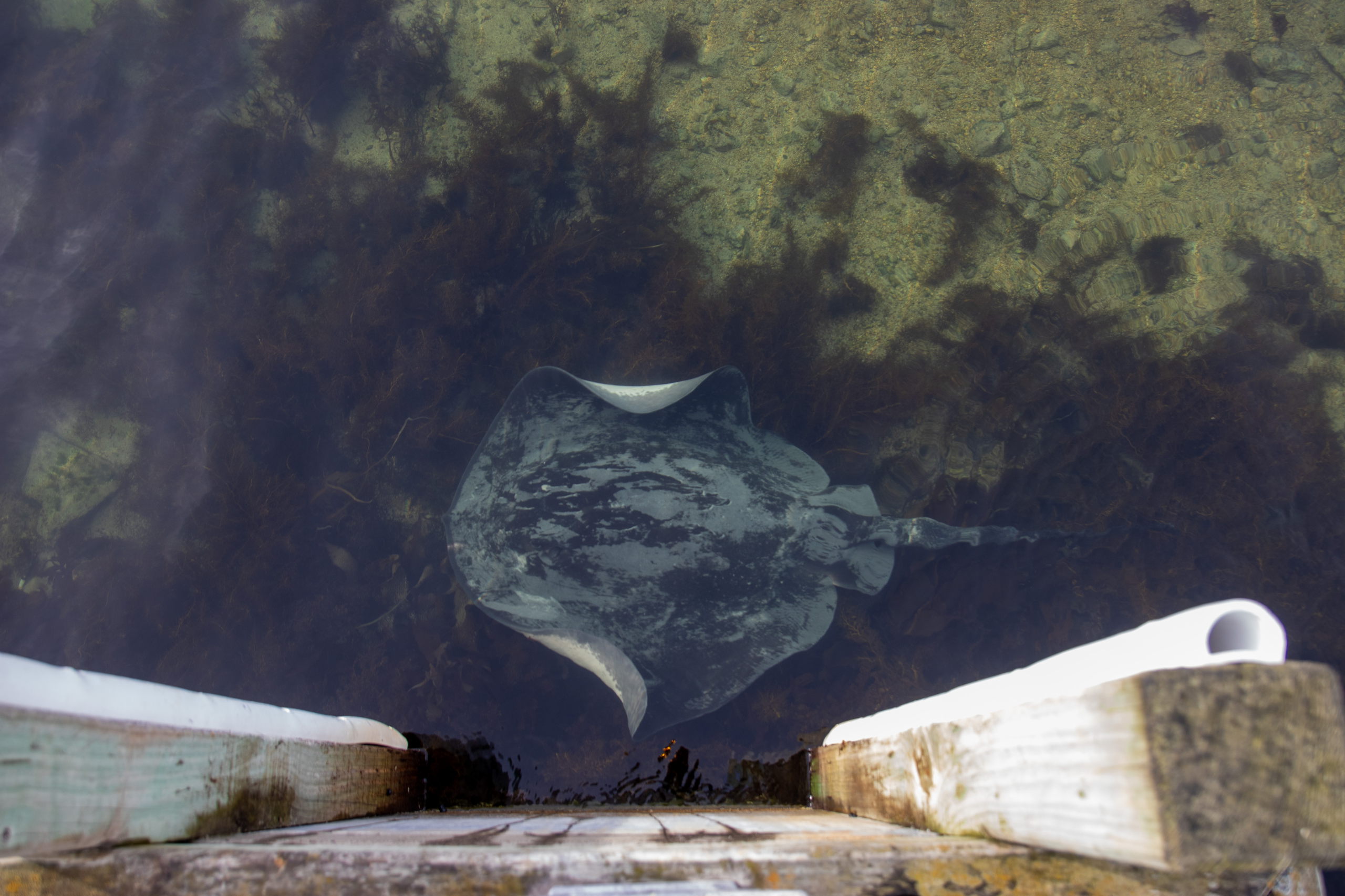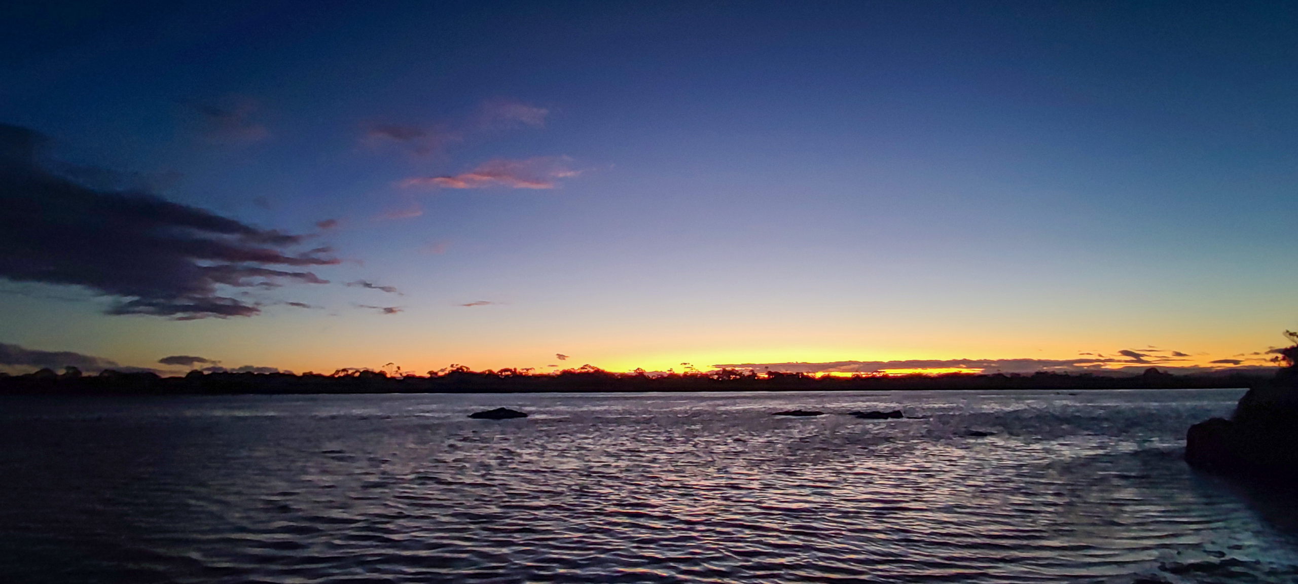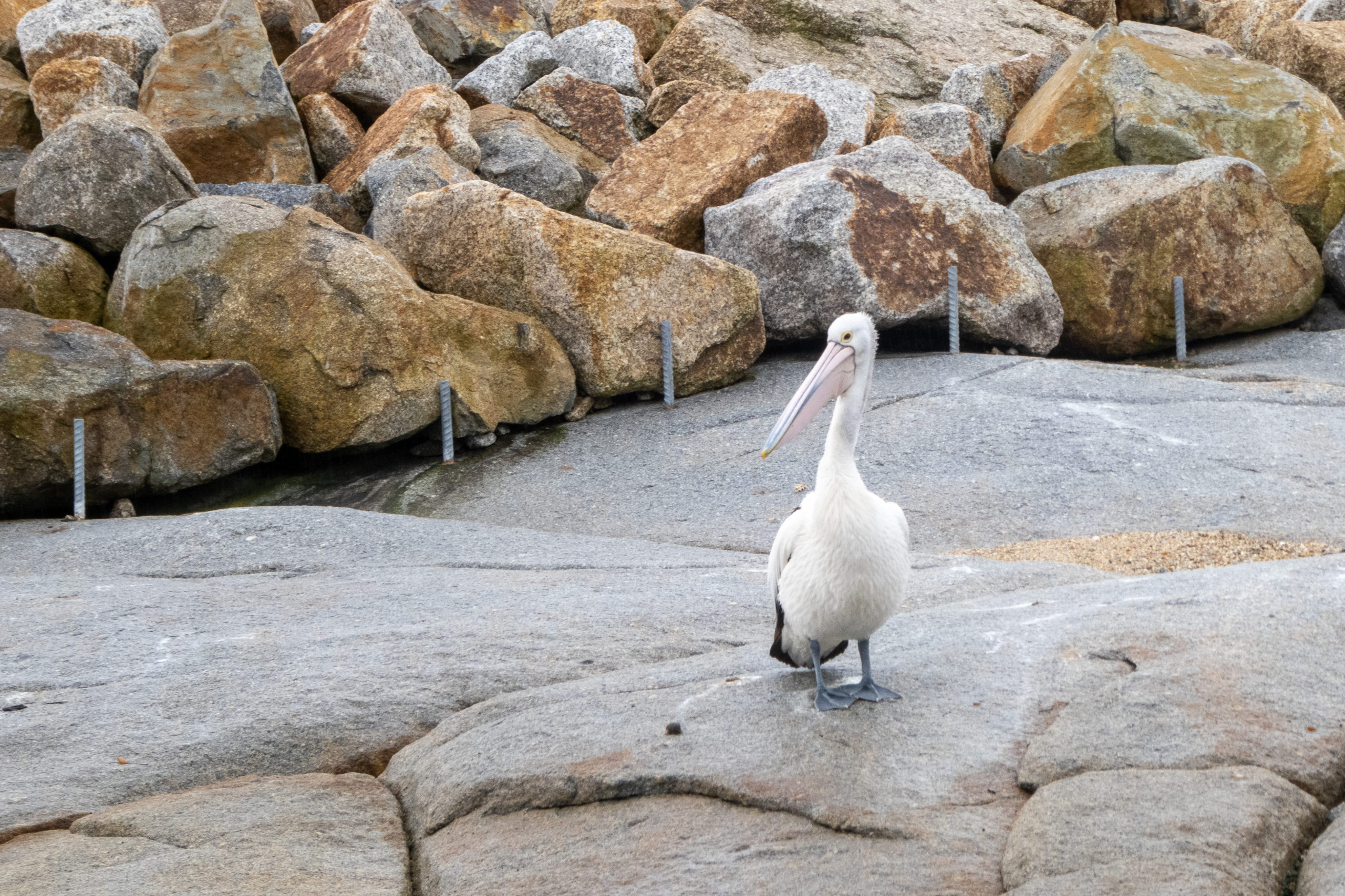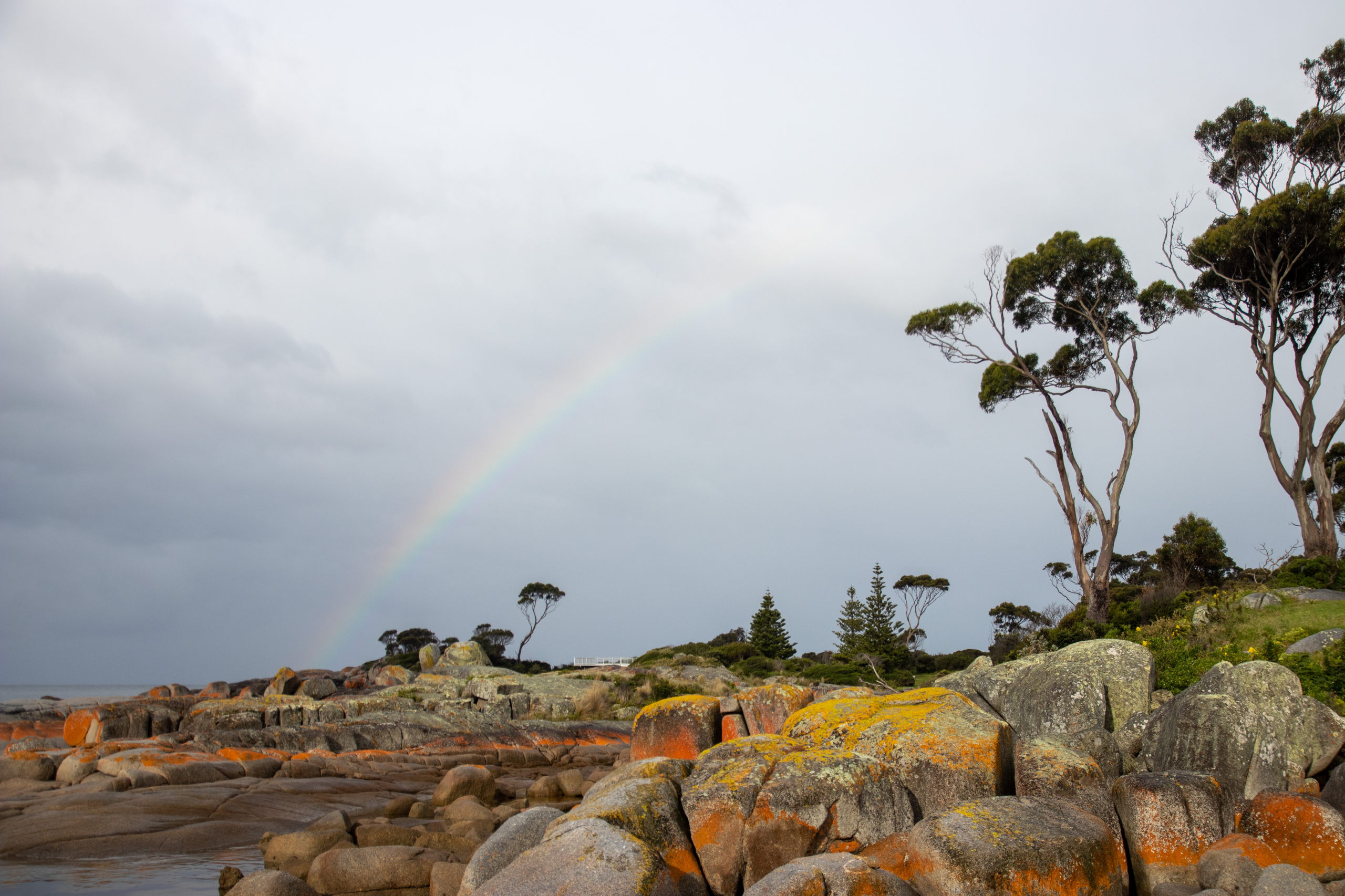 Am späten Nachmittag erreiche ich die Binalong Bay, an der die Sonne ein wenig zwischen den Wolken hervor blinzelt. Sieht so aus, als würde sich der Tag gerade noch einmal so retten. Am Hafen sitzt ein Pelikan und ein Fischer zeigt mir einen Rochen, der gemütlich an der Hafenmauer entlang gleitet. Cool. Es tröpfelt leicht. Hmmm, Sonne + Regen = Regenbogen. Und da ist er auch schon. Wow.