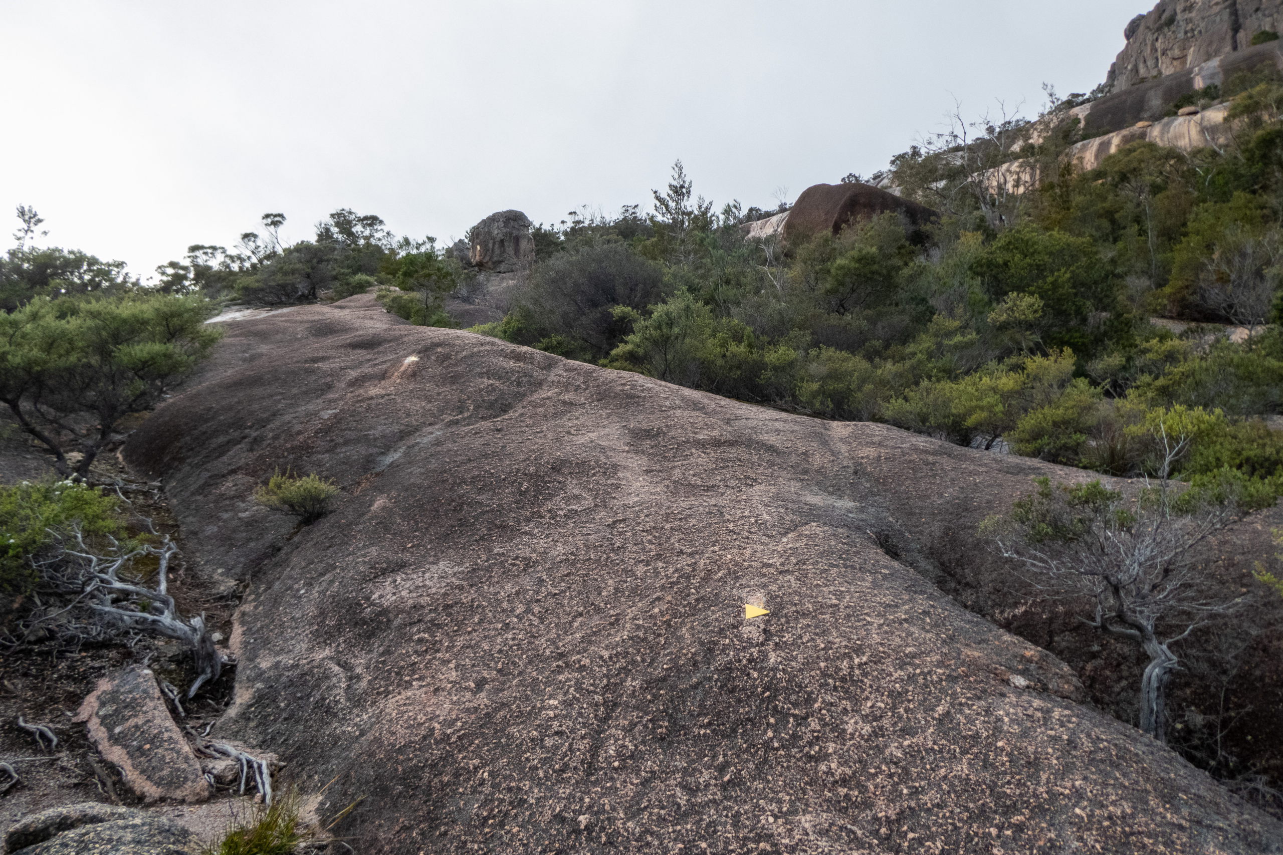 Zuerst führt der Weg gemächlich bergauf, bis die Felsen beginnen. Hier ist noch einmal ein Warnhinweis aufgestellt. OK, verstanden. Ich gehe weiter. Die erste heikle Stelle kann ich umgehen, aber immer wieder sind Stellen, an denen Wasser über den Fels fließt. Nicht gerade einfach und teilweise geht es nur unter Zuhilfenahme der Hände. Es ist echt rutschig und nachdem ich zweimal abgerutscht bin, beschließe ich umzudrehen. Einfacher wird es nicht werden und außerdem ist für etwas später Regen gemeldet. Der kann natürlich auch früher kommen und dann möchte ich nicht am Gipfel stehen und alles hinunter gehen müssen. Vorsichtig steige ich ab und kralle mich an Büschen fest, bis ich wieder beim Auto bin. Gut, dass ich noch Plan B habe.