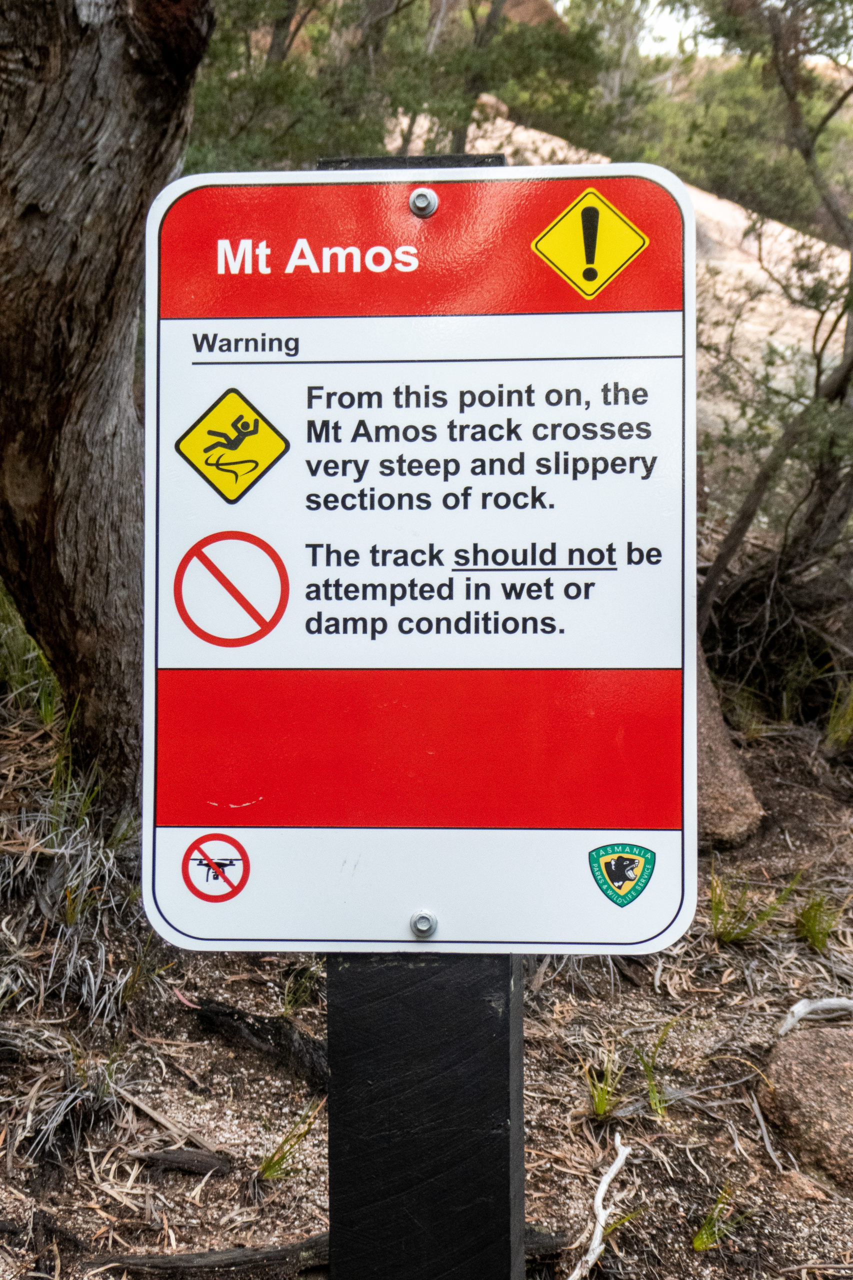 Der Wecker wird um vier Uhr gekonnt auf halb sechs Uhr gestellt. Keine Lust so früh aufzustehen. Am Parkplatz für die Wanderung auf den Mount Amos ziehe ich mir ein kleines Frühstück rein und starte zum Ausgangspunkt. Schilder mit Warnhinweisen sind aufgestellt. Der Weg ist sehr rutschig, wenn es nass oder feucht ist. Hmmm, gestern hat es geregnet. Mal gucken, ob der Wind schon alles aufgetrocknet hat. In einem Buch kann man sich eintragen. Eine gute Idee, da ich ja alleine unterwegs bin.