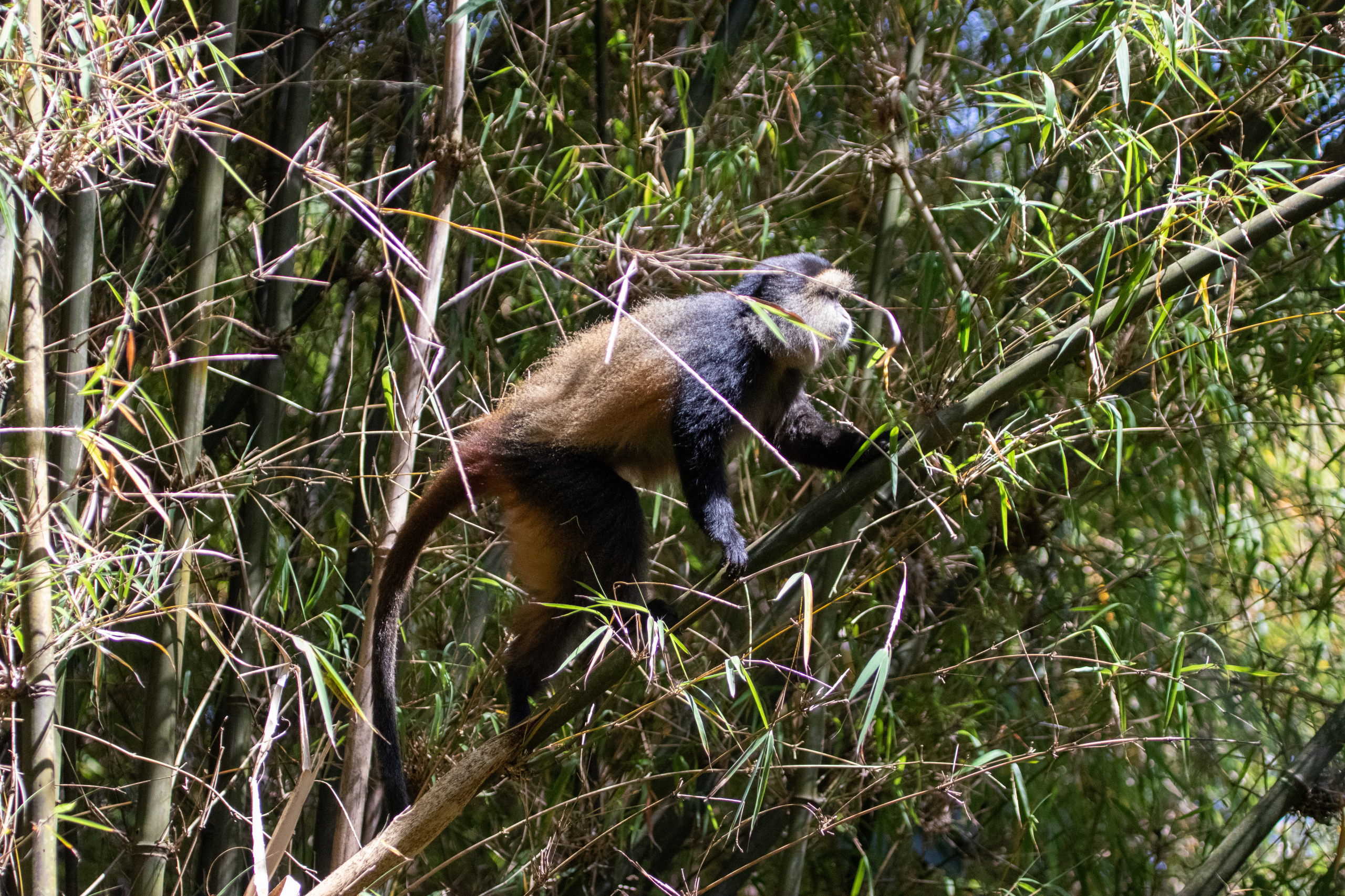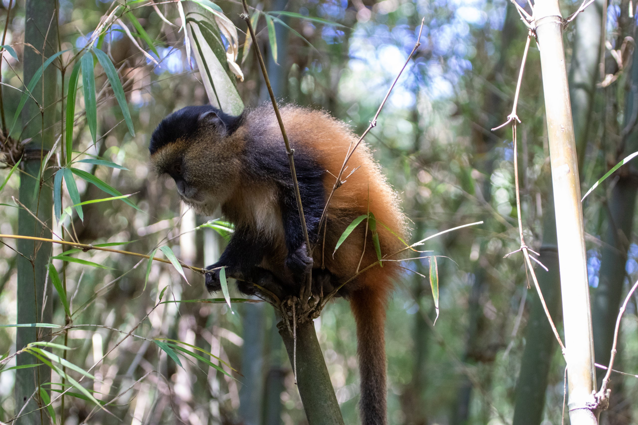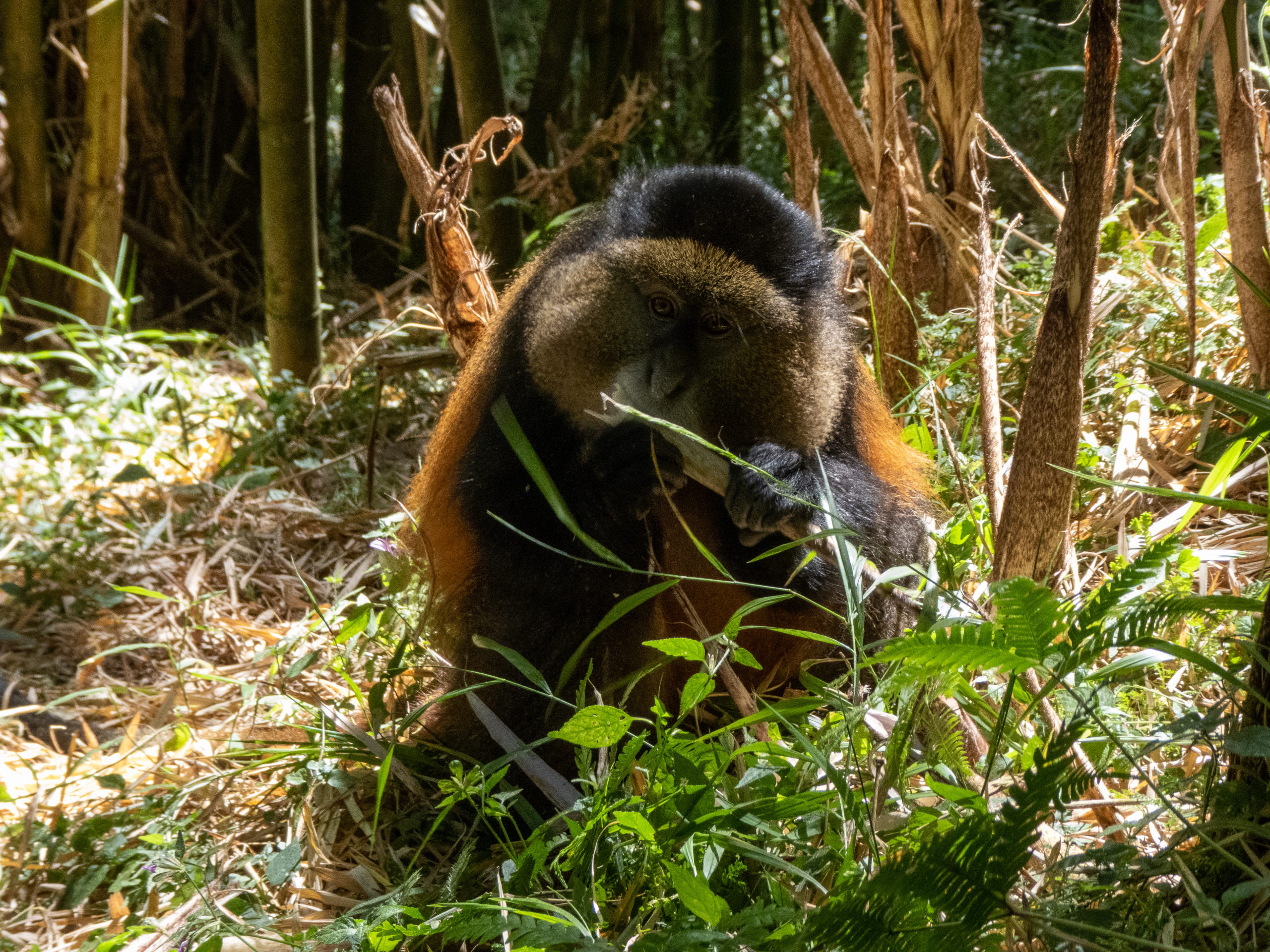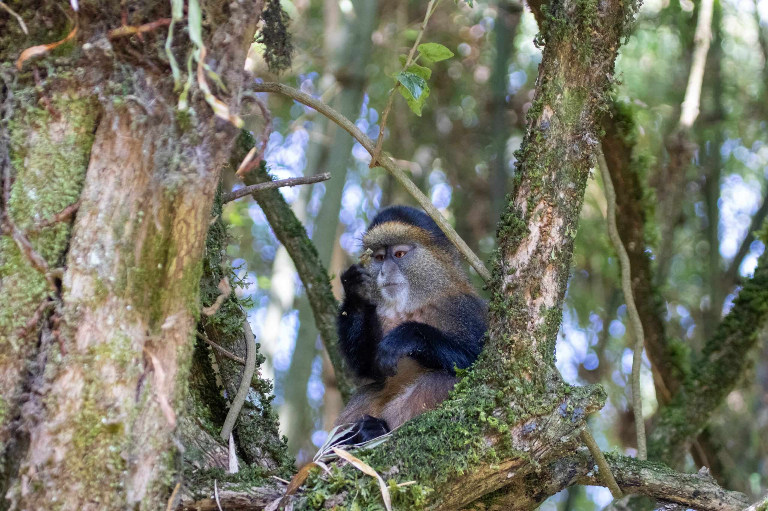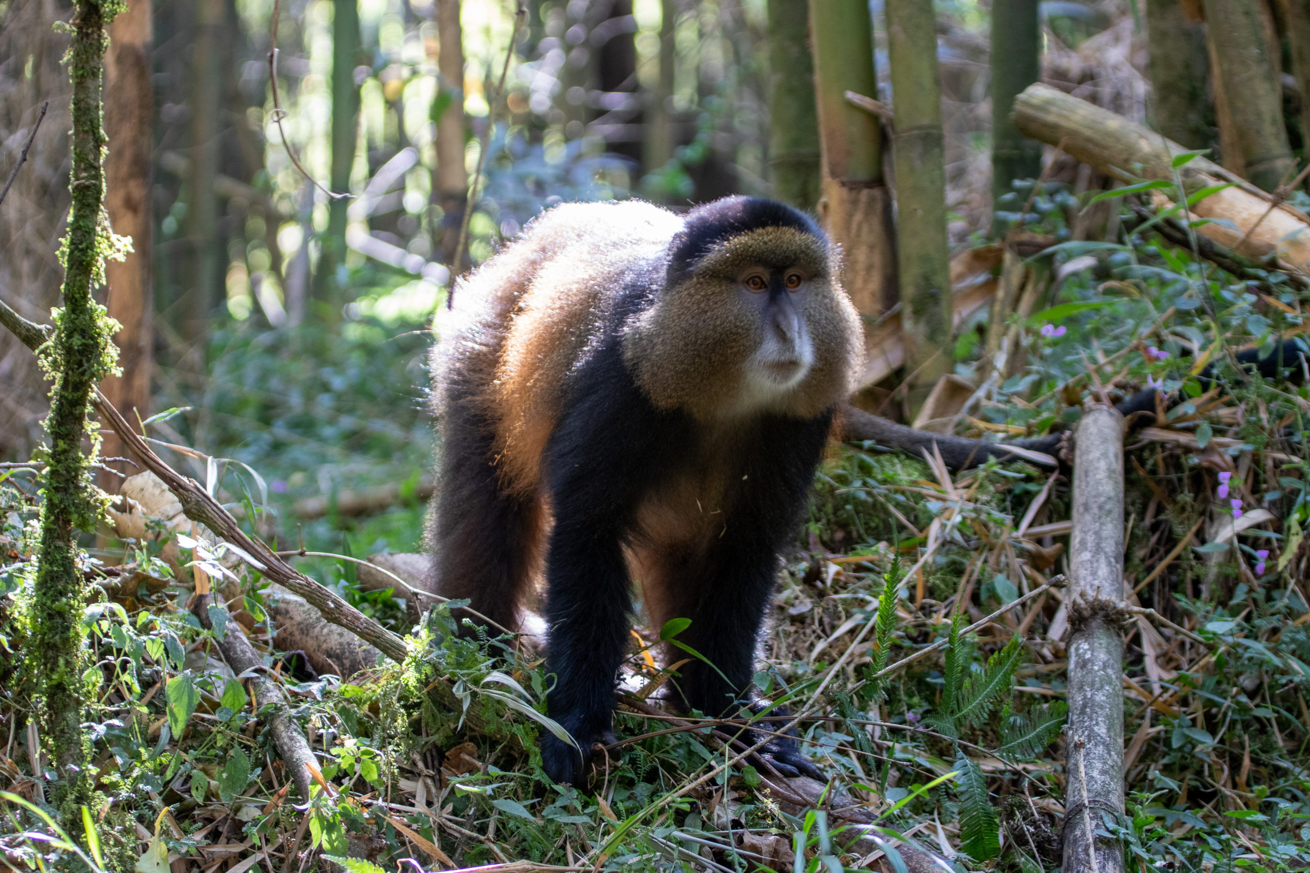 Vor dem Briefing gibt es eine Tanzvorführung der lokalen Community, dann werden uns die Regeln erklärt und wir starten los. Guide, zwei bewaffnete Männer und acht Touris. Offiziell werden wir von wilden Tieren beschützt, da wir aber sehr nahe an der Grenze zur DR Kongo unterwegs sind, glaube ich, dass das nicht der einzige Grund ist. Durch den Wald geht es hinauf, bis wir um halb elf Uhr auf die Tracker treffen. Sie haben die Golden Monkeys bereits am frühen Morgen aufgespäht und unseren Guide dirigiert. Von nun an tickt die Uhr. Wir haben eine Stunde.