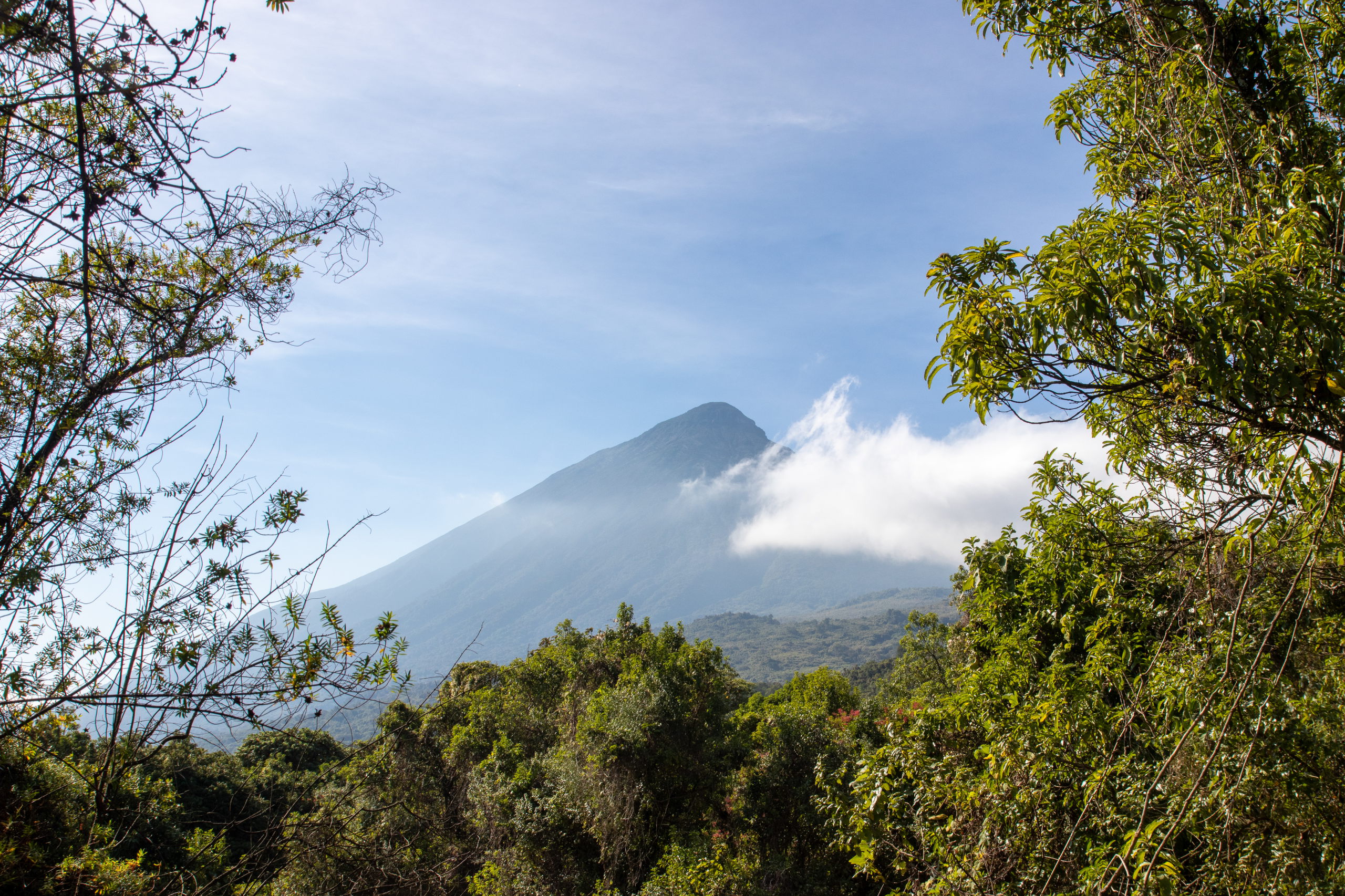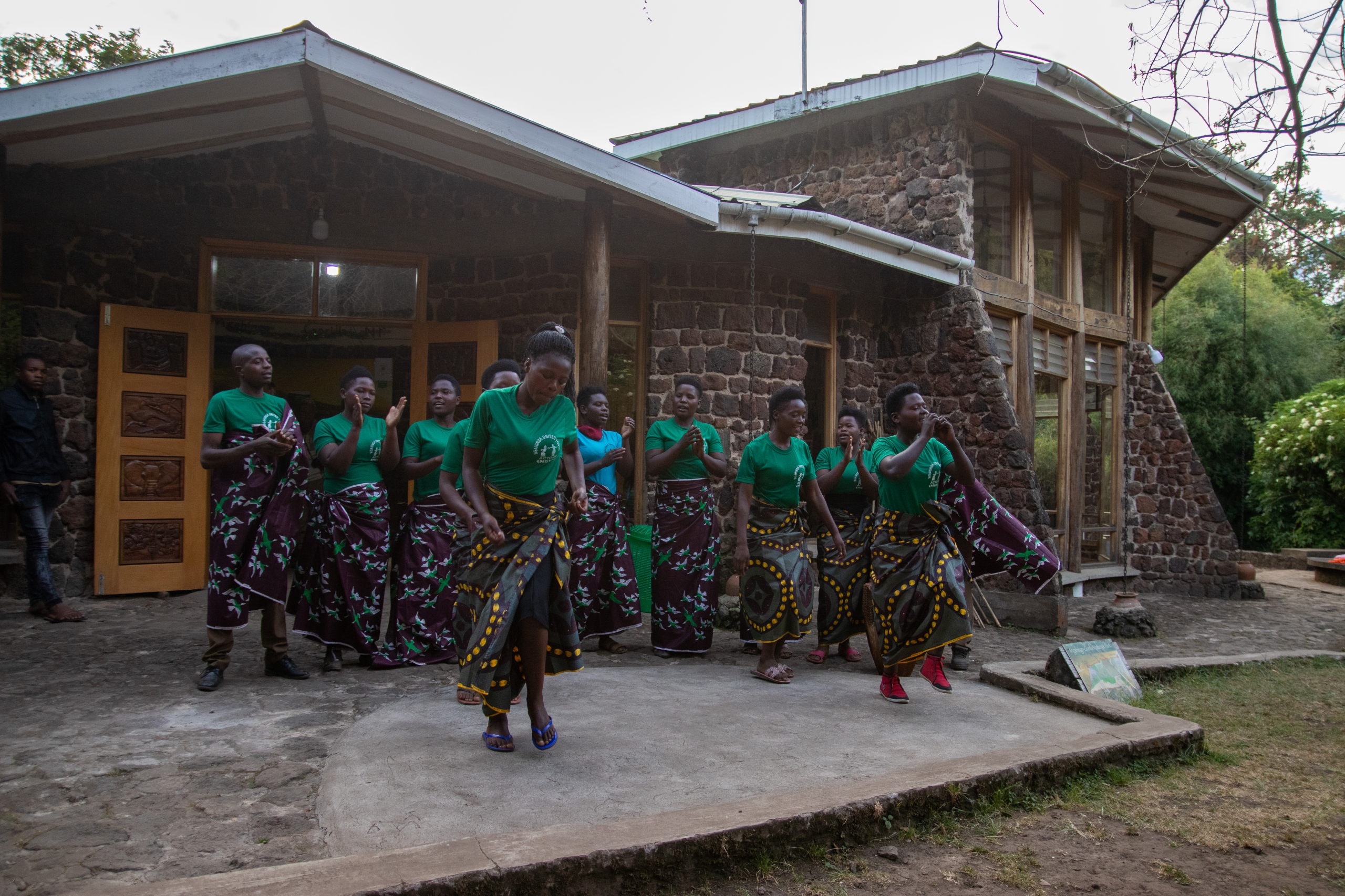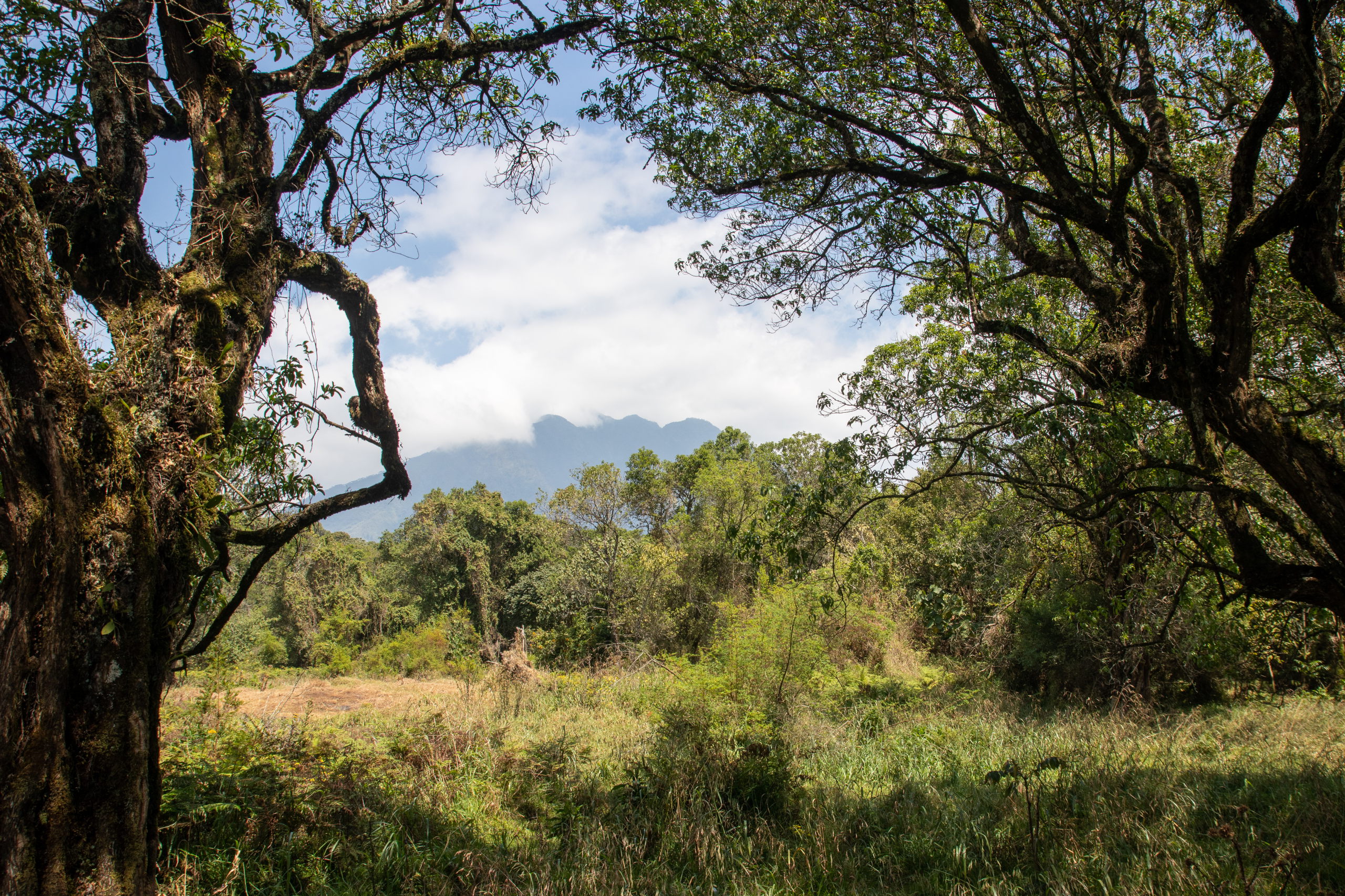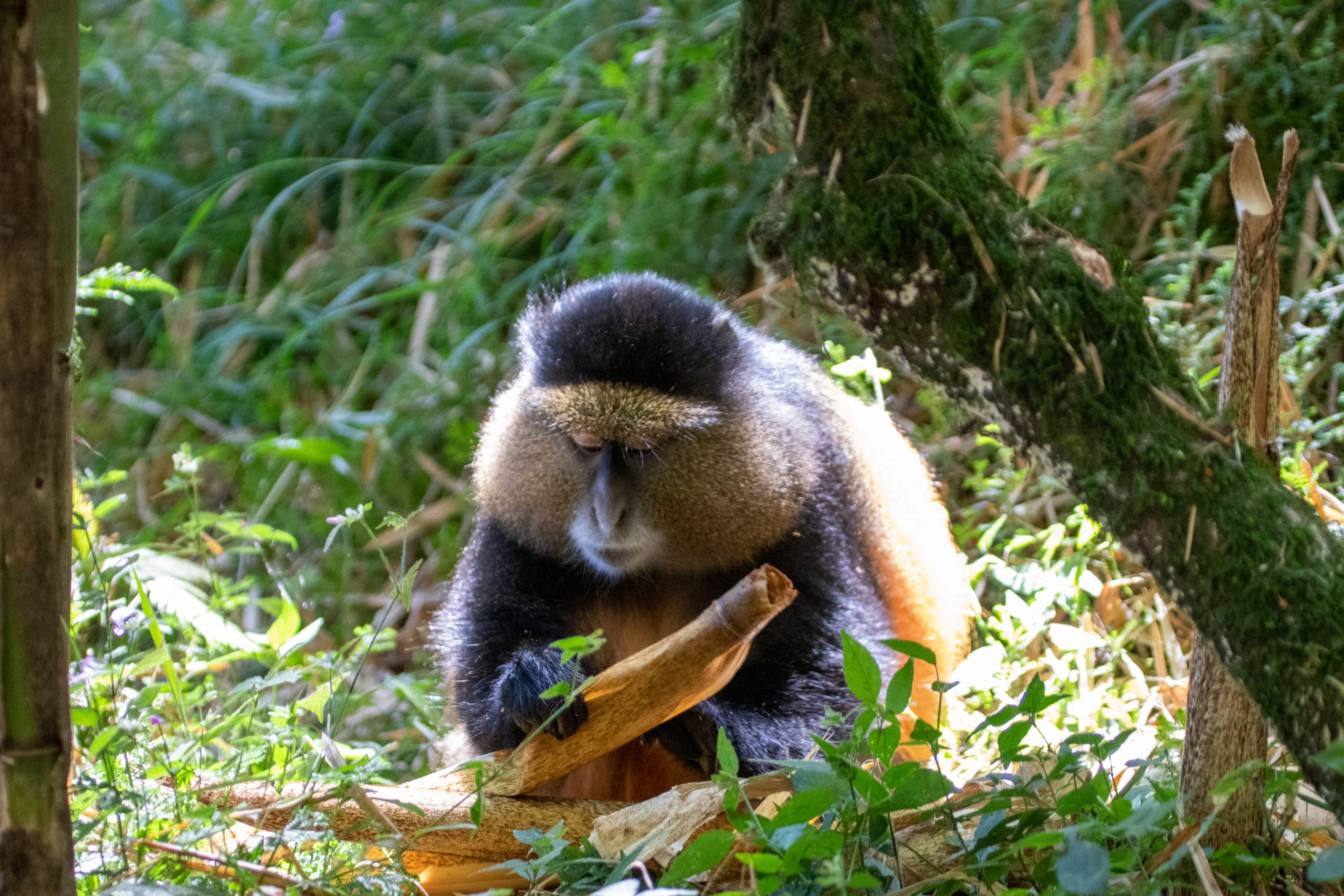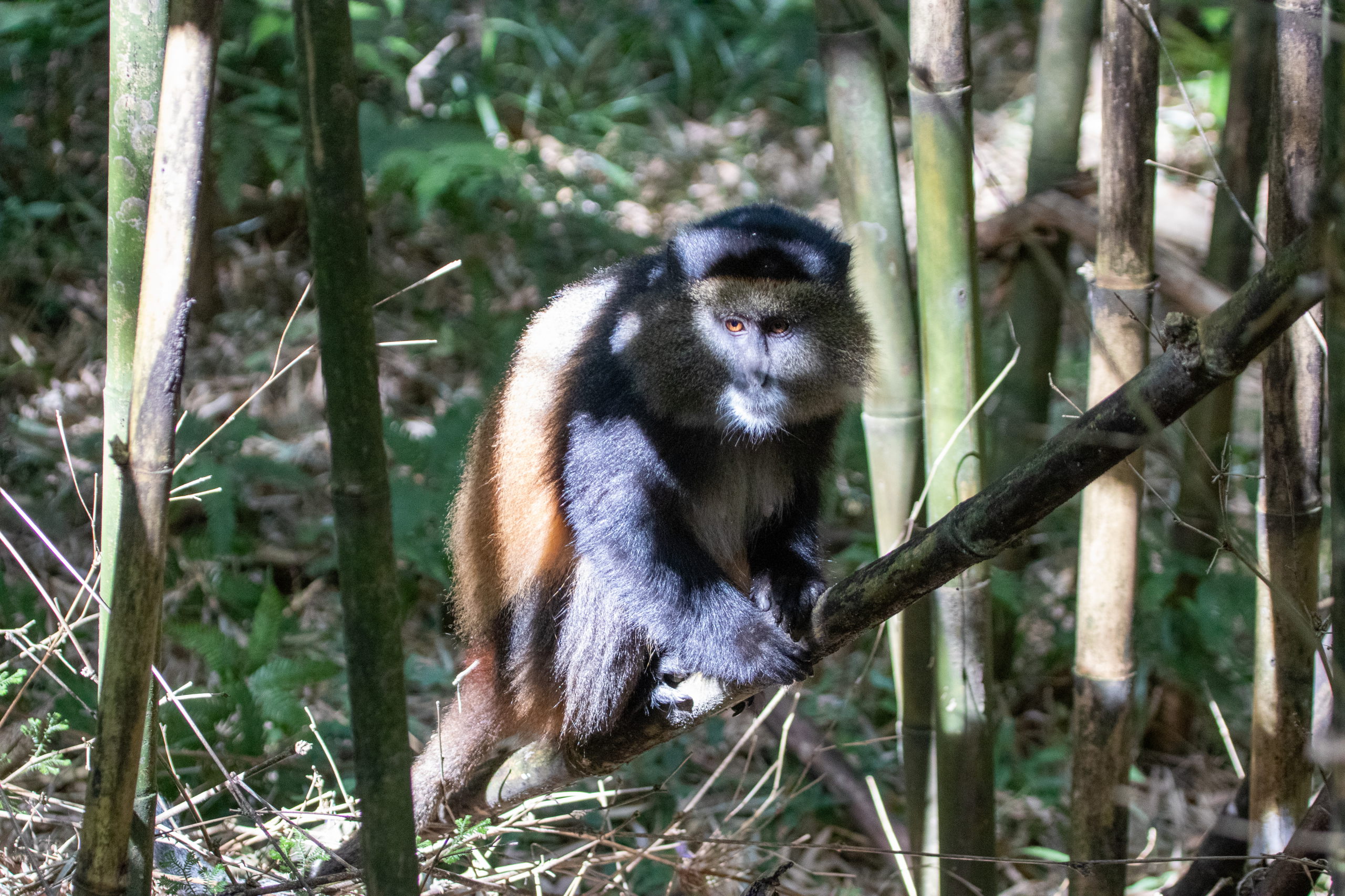 Vor dem Briefing gibt es eine Tanzvorführung der lokalen Community, dann werden uns die Regeln erklärt und wir starten los. Guide, zwei bewaffnete Männer und acht Touris. Offiziell werden wir von wilden Tieren beschützt, da wir aber sehr nahe an der Grenze zur DR Kongo unterwegs sind, glaube ich, dass das nicht der einzige Grund ist. Durch den Wald geht es hinauf, bis wir um halb elf Uhr auf die Tracker treffen. Sie haben die Golden Monkeys bereits am frühen Morgen aufgespäht und unseren Guide dirigiert. Von nun an tickt die Uhr. Wir haben eine Stunde.