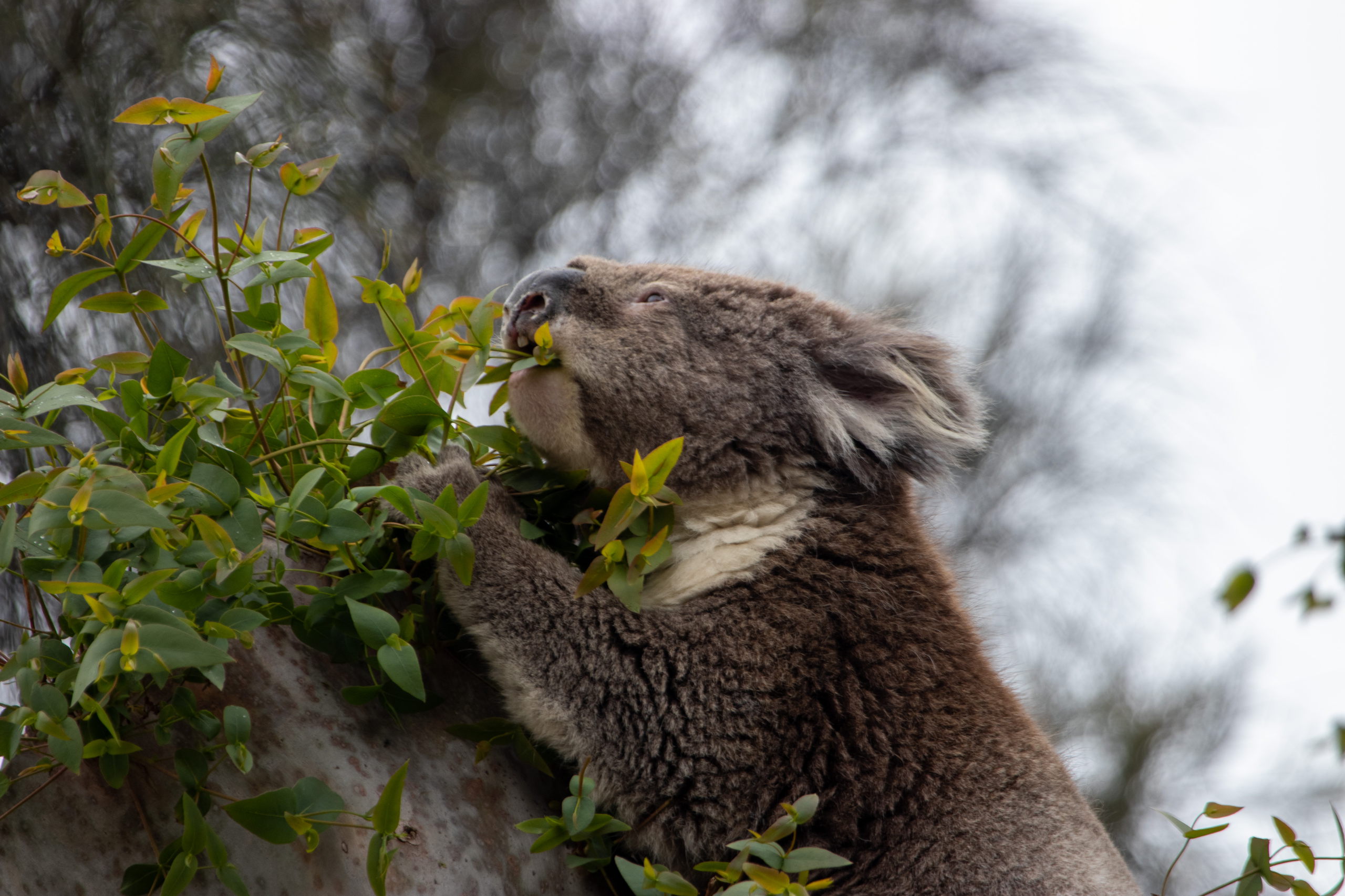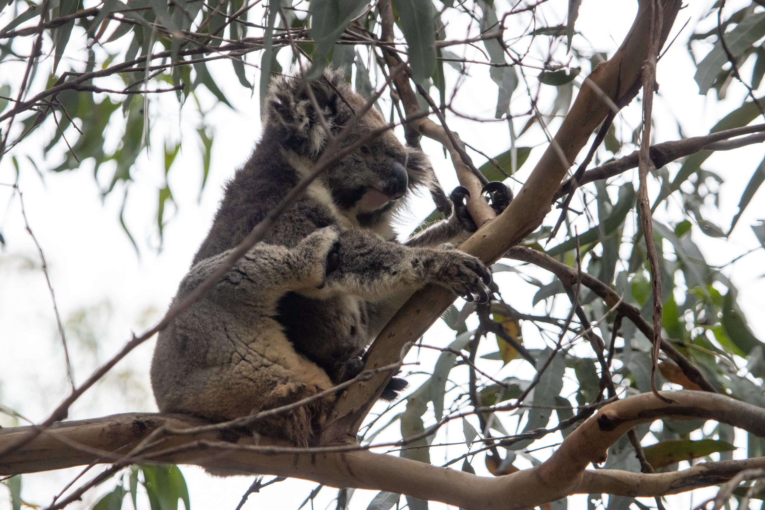 Da es gestern spät geworden ist, wird heute lange geschlafen und so komme ich erst gegen Mittag weg. Egal, ich habe ja keinen Stress. Nachdem ich wieder auf der Great Ocean Road bin, biege ich ein Stück weiter in Kennett River ab und fahre eine Schotterstraße hinauf in einen Eukalyptuswald. Bereits im Ort steht neben der Straße eine Gruppe und starrt einen Baum an. Da ist sicher ein flauschiger Koala zu sehen. Ich versuche mein Glück jedoch etwas oberhalb, weiter weg vom Trubel der Gruppenreisenden. Und tatsächlich entdecke ich nach nur ein paar Minuten das erste Fellknäuel in einer Baumkrone. Juhu, mein erster Koala. Ich sehe noch mehrere und sage anderen Leuten, wo sie zu sehen sind. Am Rückweg beginnt es wieder einmal zu regnen. Ein Camper bleibt stehen und bietet mir an, mich zum Auto mitzunehmen. Voll nett, aber ich gehe lieber zu Fuß. Vielleicht entdecke ich ja noch einen Koala. Leider nein. Jedoch sitzt einer mitten im Ort und frisst genüsslich und in aller Seelenruhe Eukalyptusblätter vom Baum.