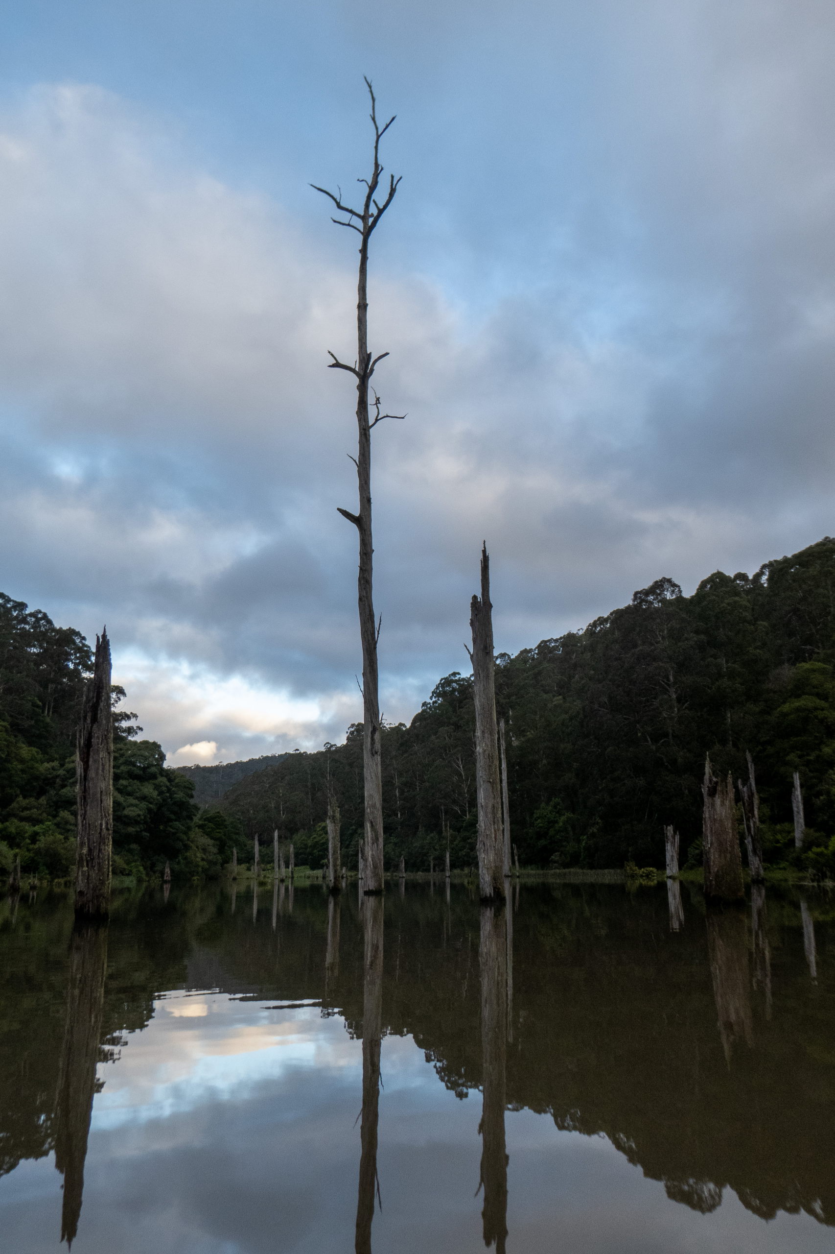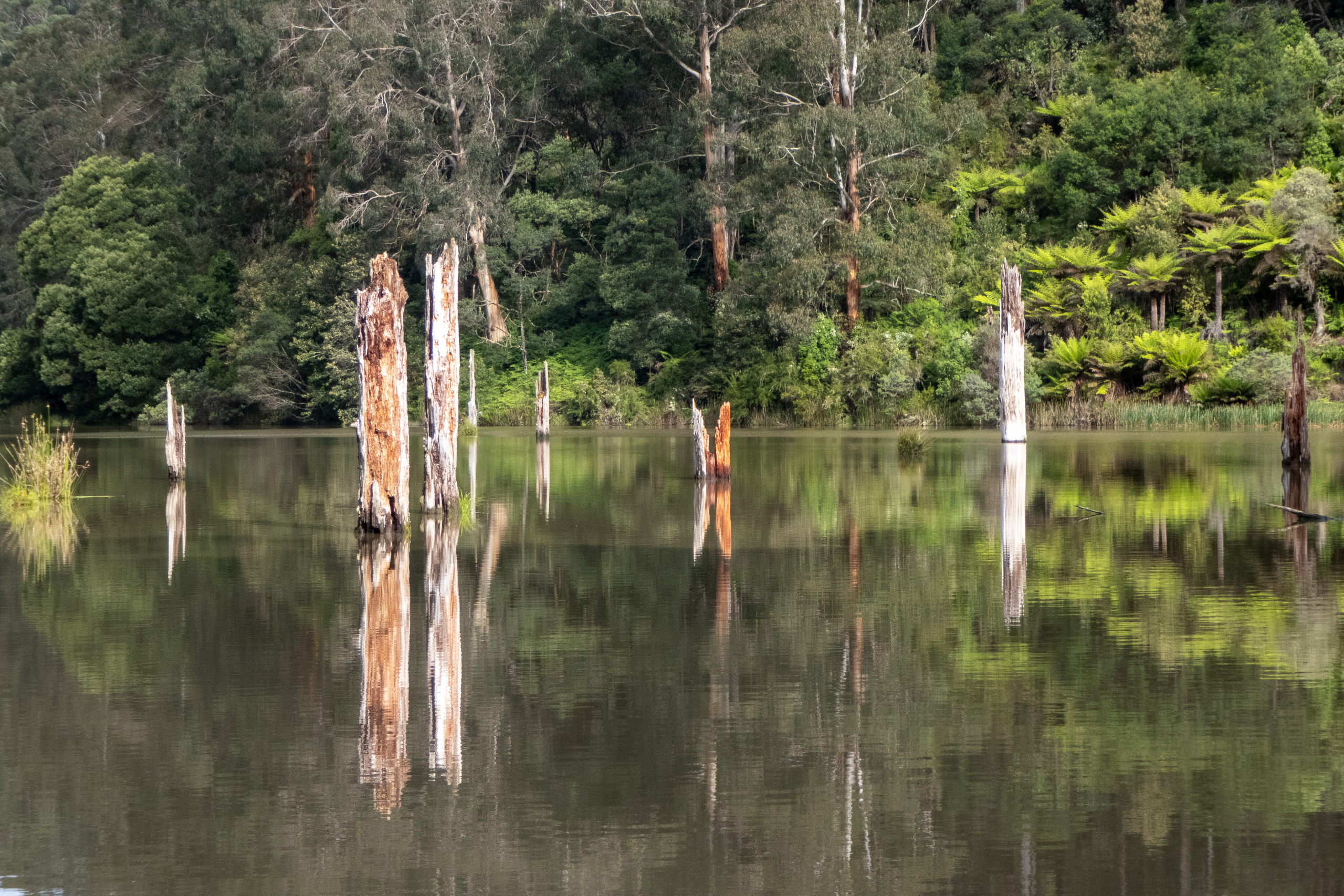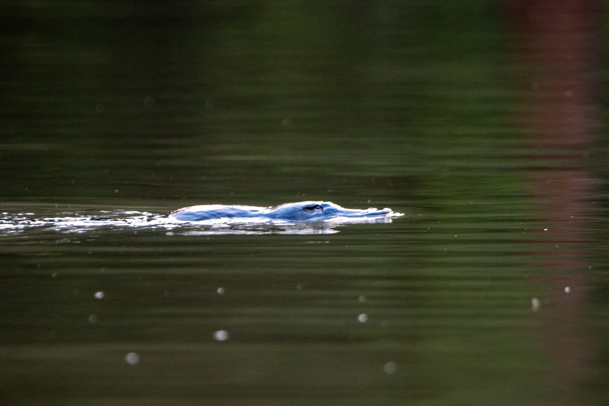 Um sieben Uhr treffen wir Bruce und folgen ihm zum Parkplatz beim Lake Elizabeth. Wir wandern den Weg von vorhin zum See und steigen in die beiden Kanus, die Bruce noch fachmännisch verknotet. Damit rudert er uns über den idyllischen und friedvollen See. Es sind einige Schnabeltiere unterwegs. Wenn sie beim Tauchen nach Nahrung nicht die Richtung ändern, kann man anhand der aufsteigenden Blasen sogar erahnen, wo es auftauchen wird. Ab und zu gelingt es uns, die scheuen Tiere bleiben allerdings immer auf Abstand. Aber ein besonders wagemutiges Schnabeltier schwimmt direkt vor dem Kanu vorbei. Wie cool.