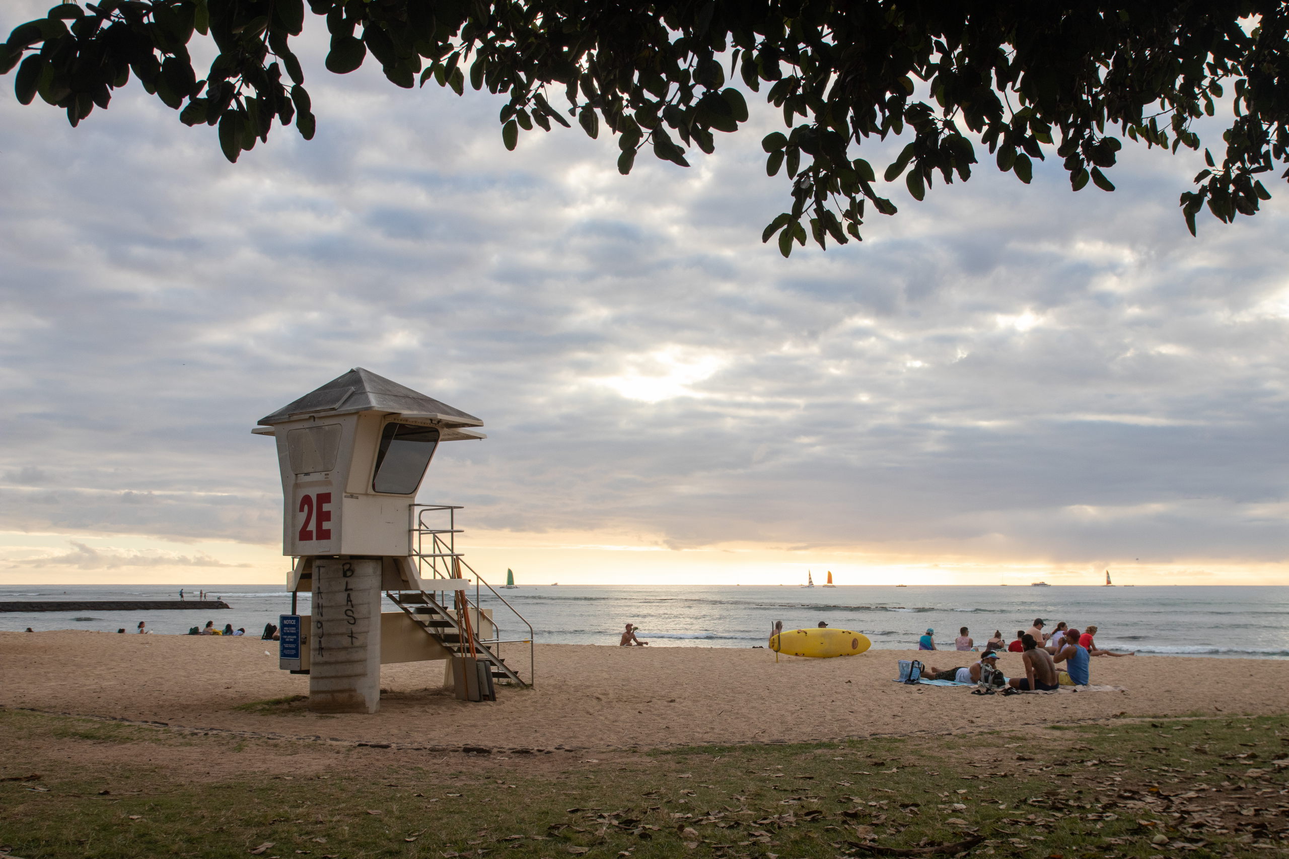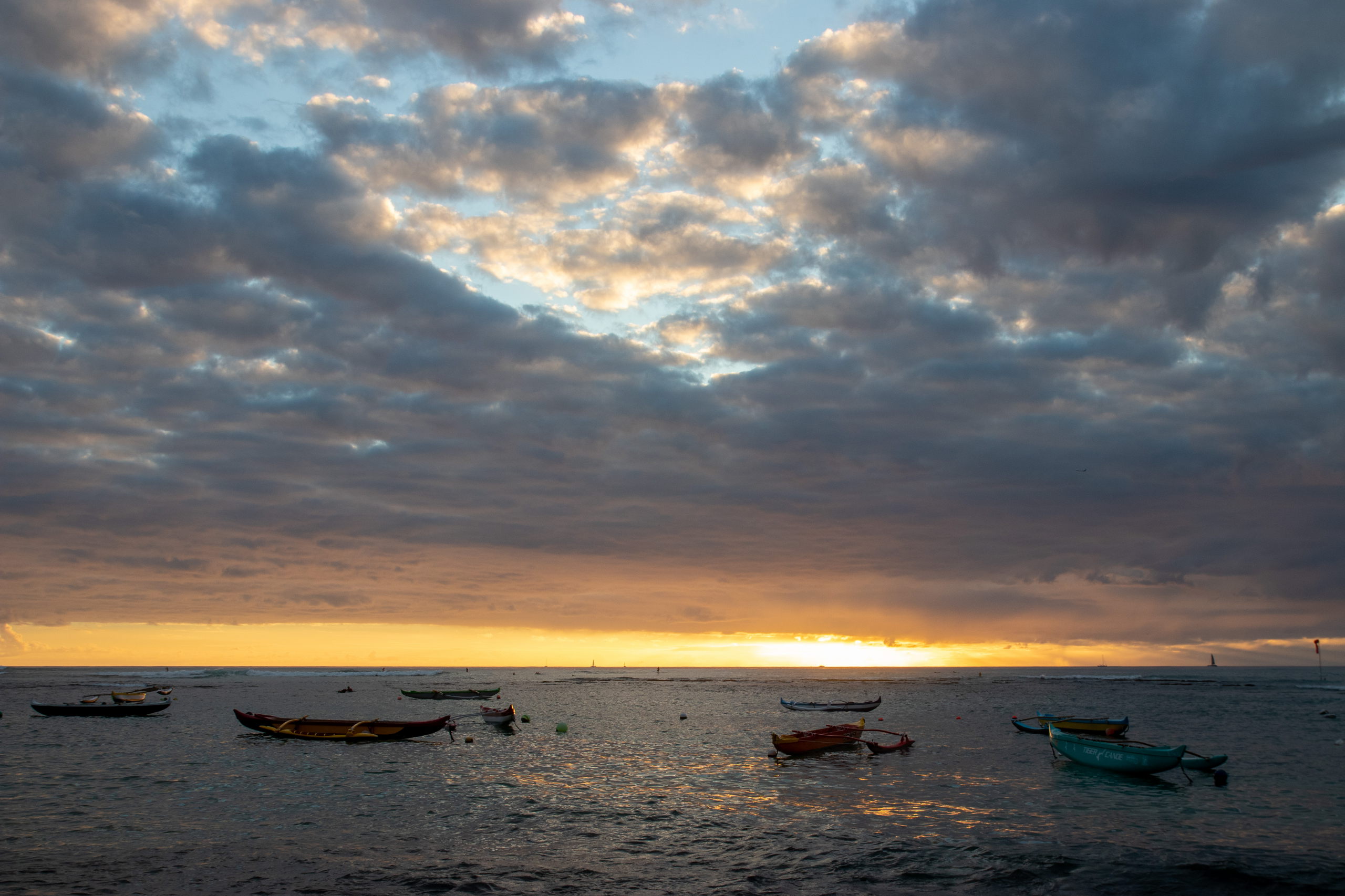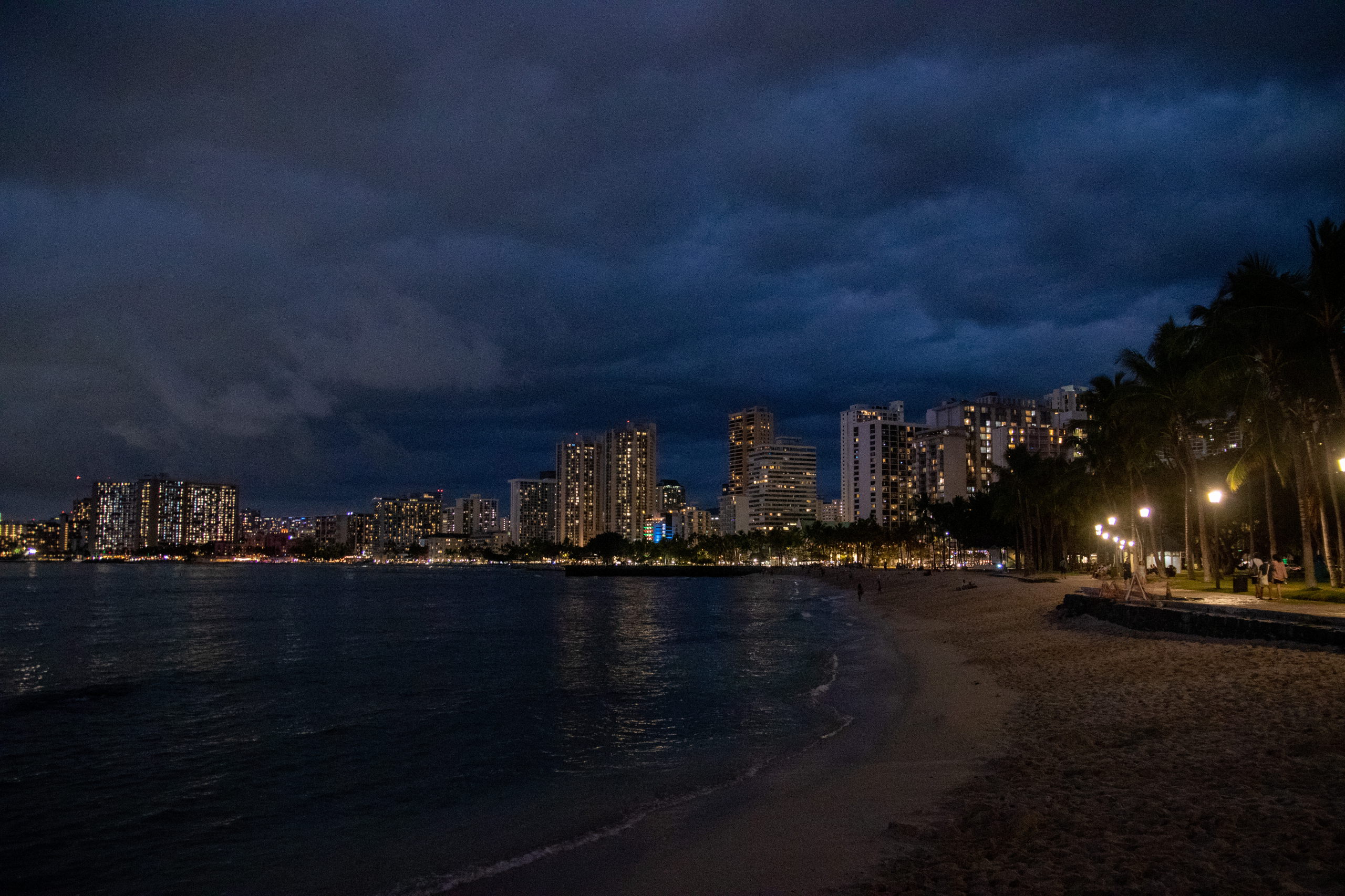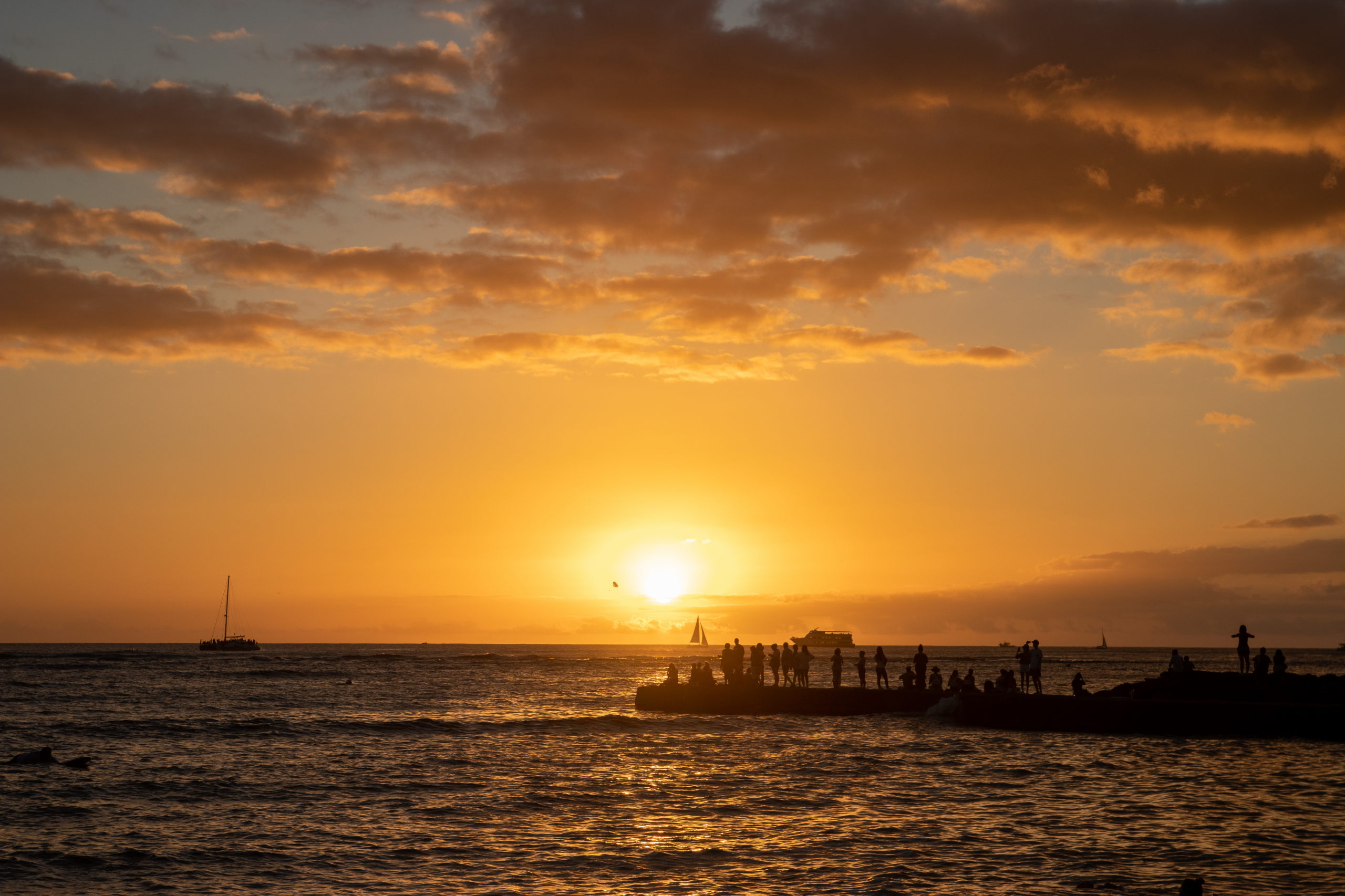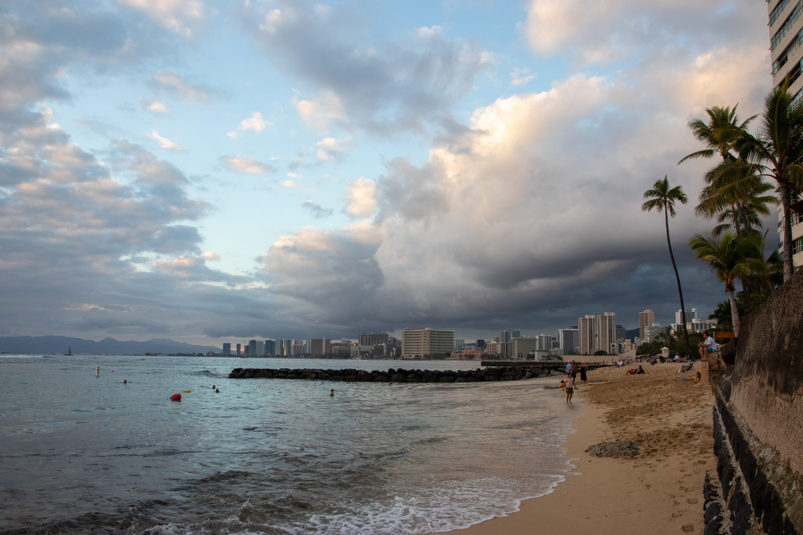 Da mich bereits der Hunger plagt, mache ich noch einen Umweg nach Chinatown. Leider hat fast alles geschlossen und das Viertel hat ohne das Gewusel wenig Flair. Schade. Zumindest gibt es in einem Shop Kokoswasser. Der Rückweg über vier Meilen zieht sich und da ich nun viel nördlicher als in Australien bin, ist der Sonnenuntergang bereits um sechs Uhr. Gefühlt hat sich ganz Honolulu am Strand versammelt, um sich das Schauspiel anzusehen. Meine Wenigkeit natürlich auch.