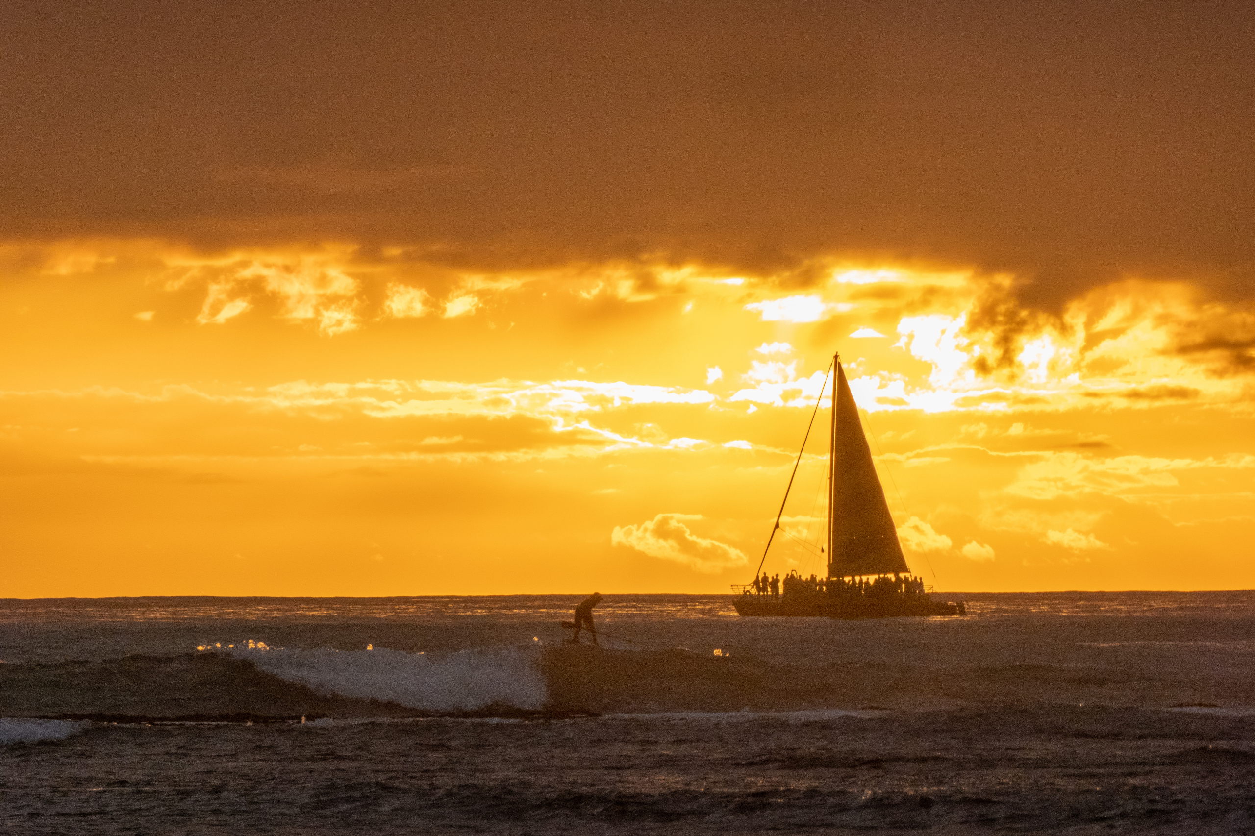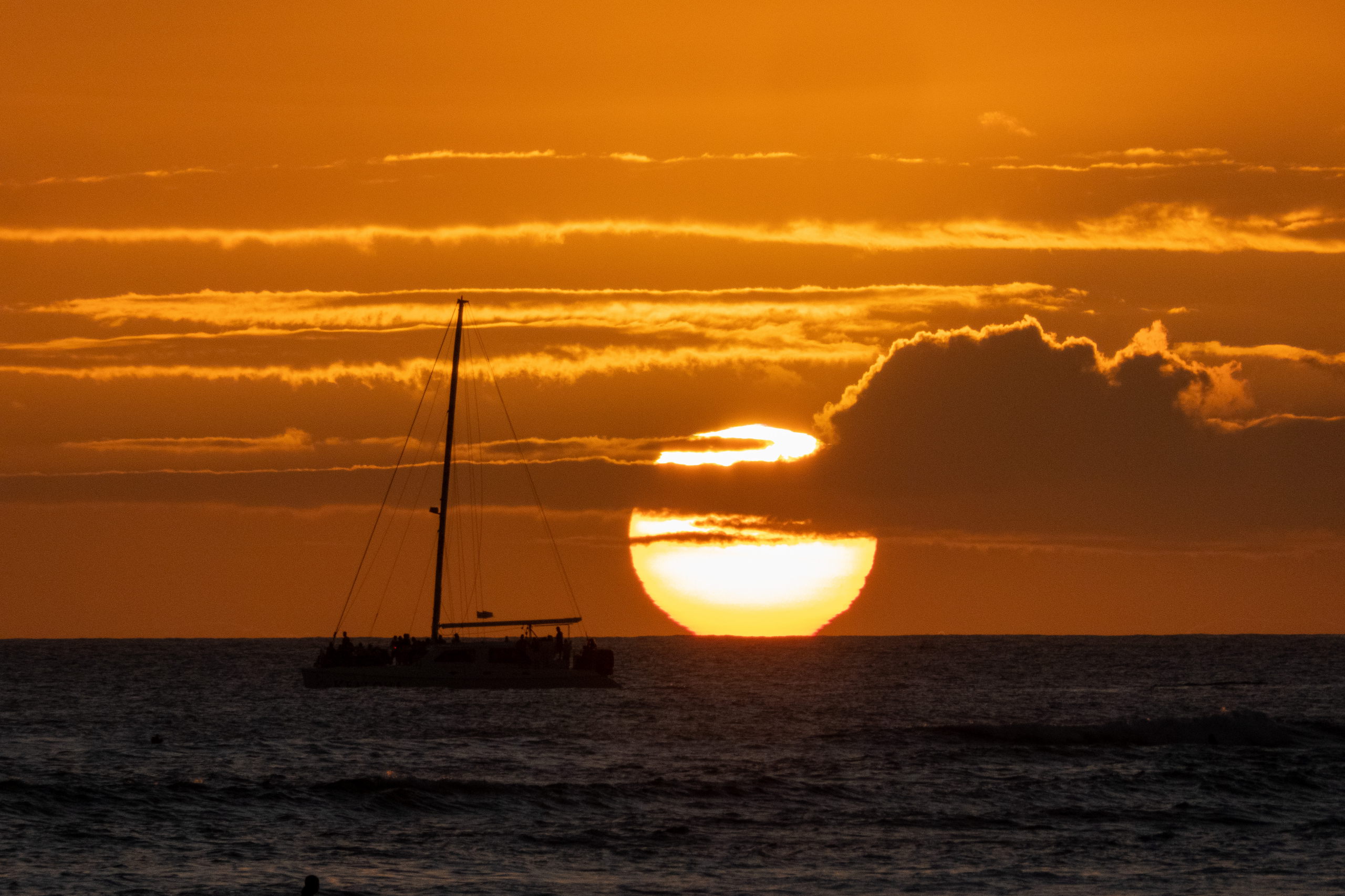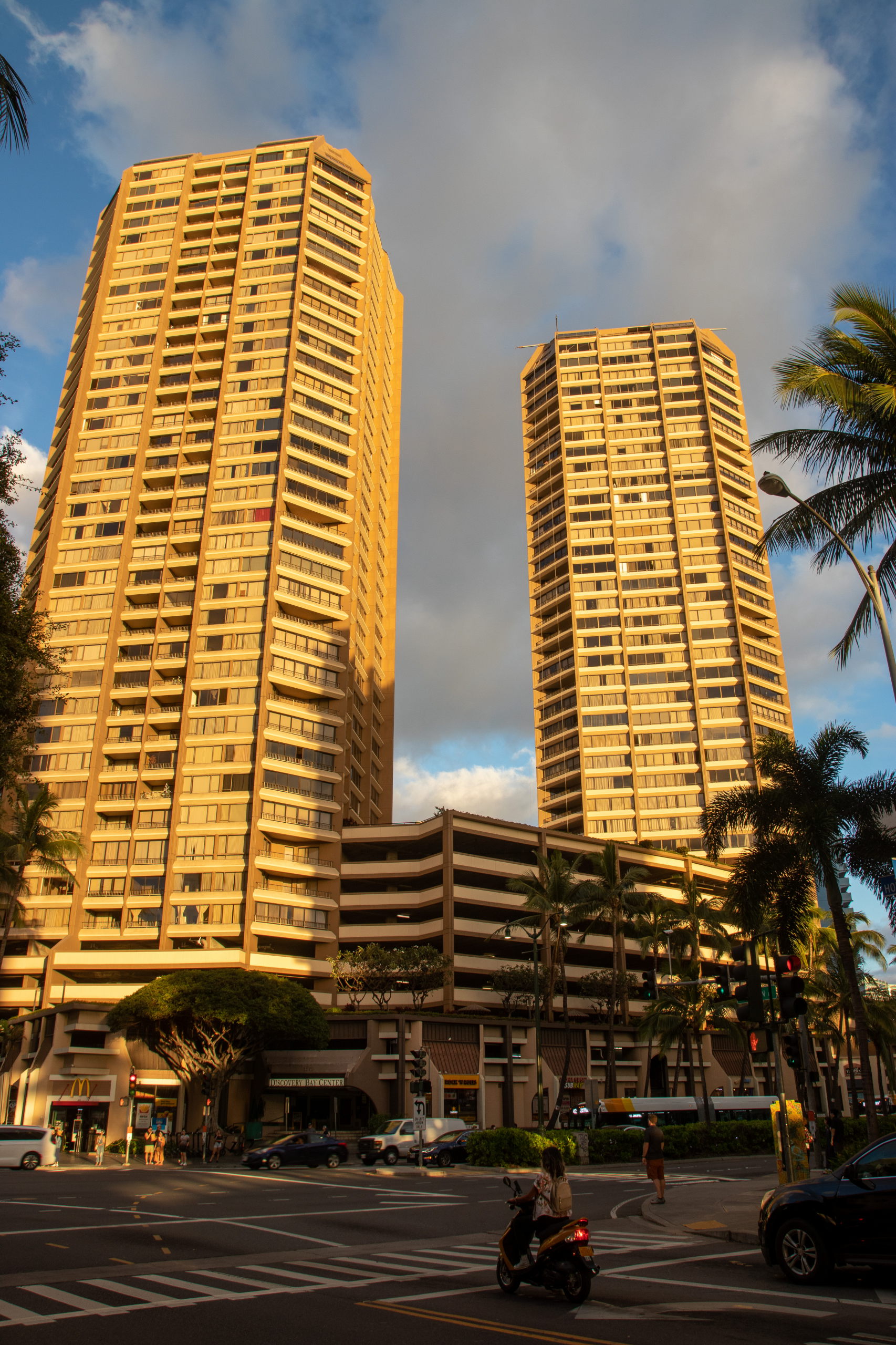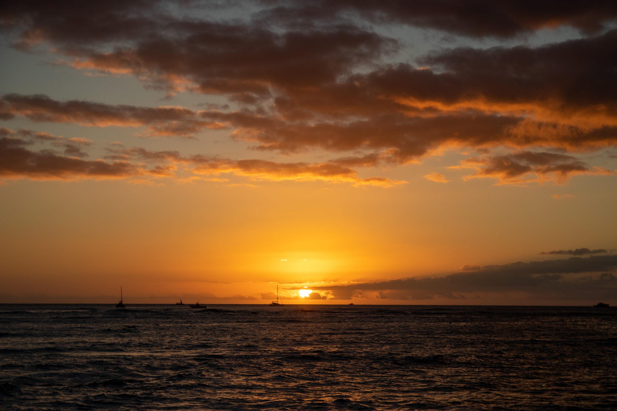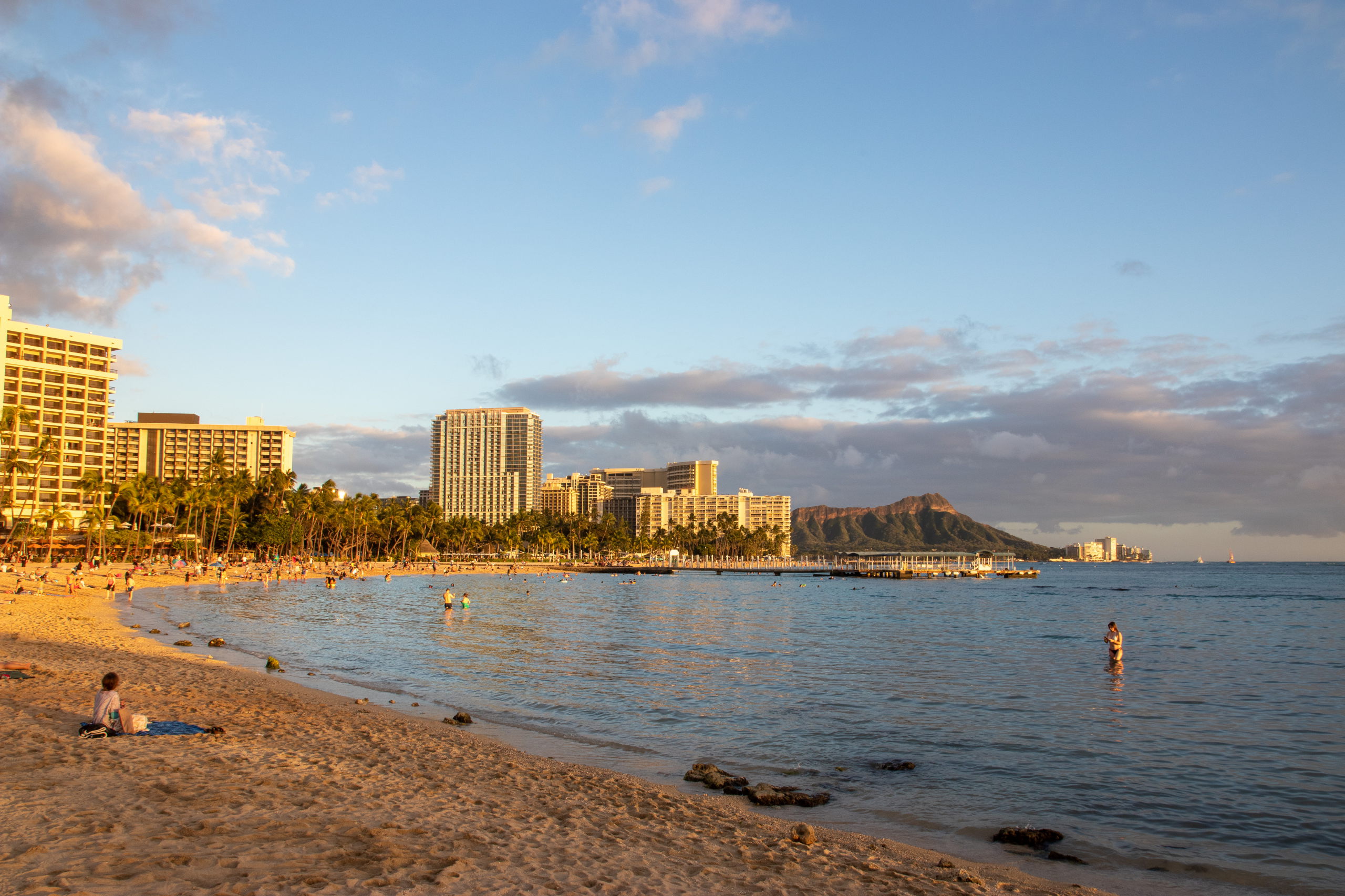 Da mich bereits der Hunger plagt, mache ich noch einen Umweg nach Chinatown. Leider hat fast alles geschlossen und das Viertel hat ohne das Gewusel wenig Flair. Schade. Zumindest gibt es in einem Shop Kokoswasser. Der Rückweg über vier Meilen zieht sich und da ich nun viel nördlicher als in Australien bin, ist der Sonnenuntergang bereits um sechs Uhr. Gefühlt hat sich ganz Honolulu am Strand versammelt, um sich das Schauspiel anzusehen. Meine Wenigkeit natürlich auch.
