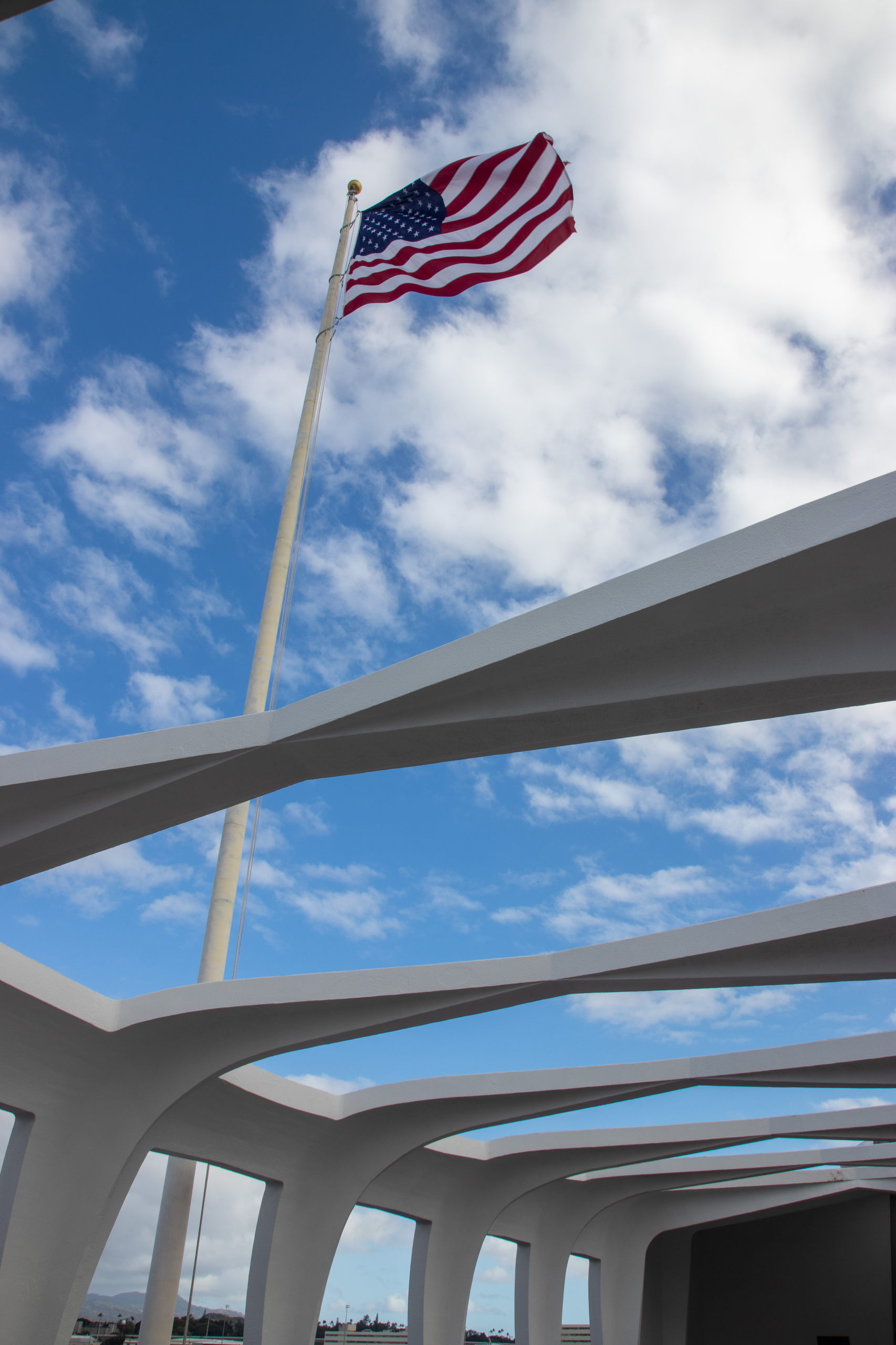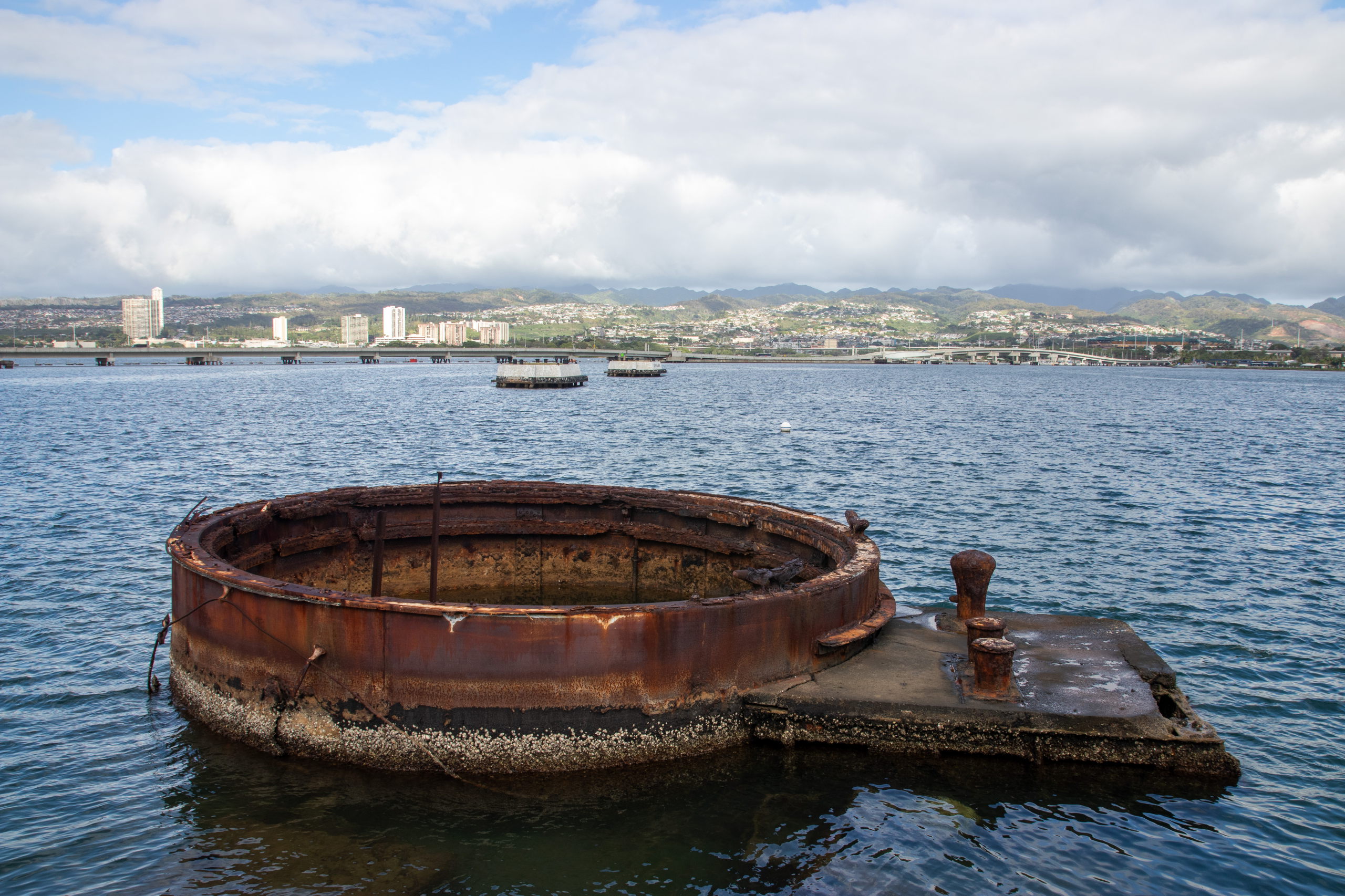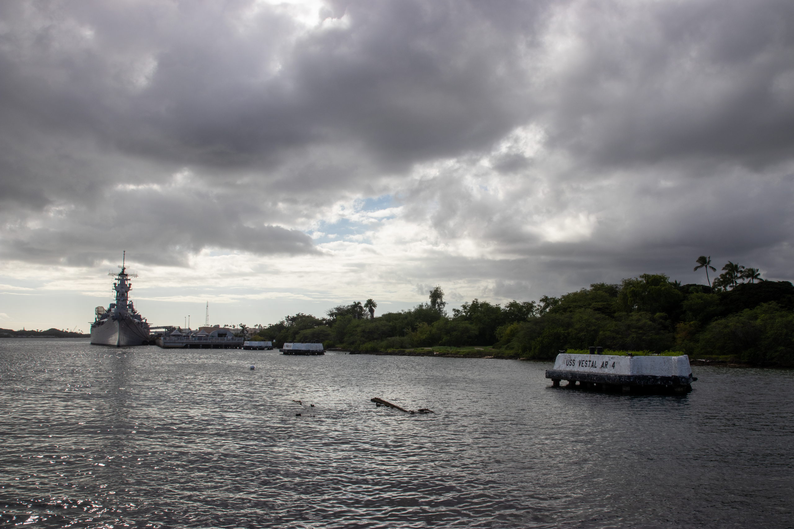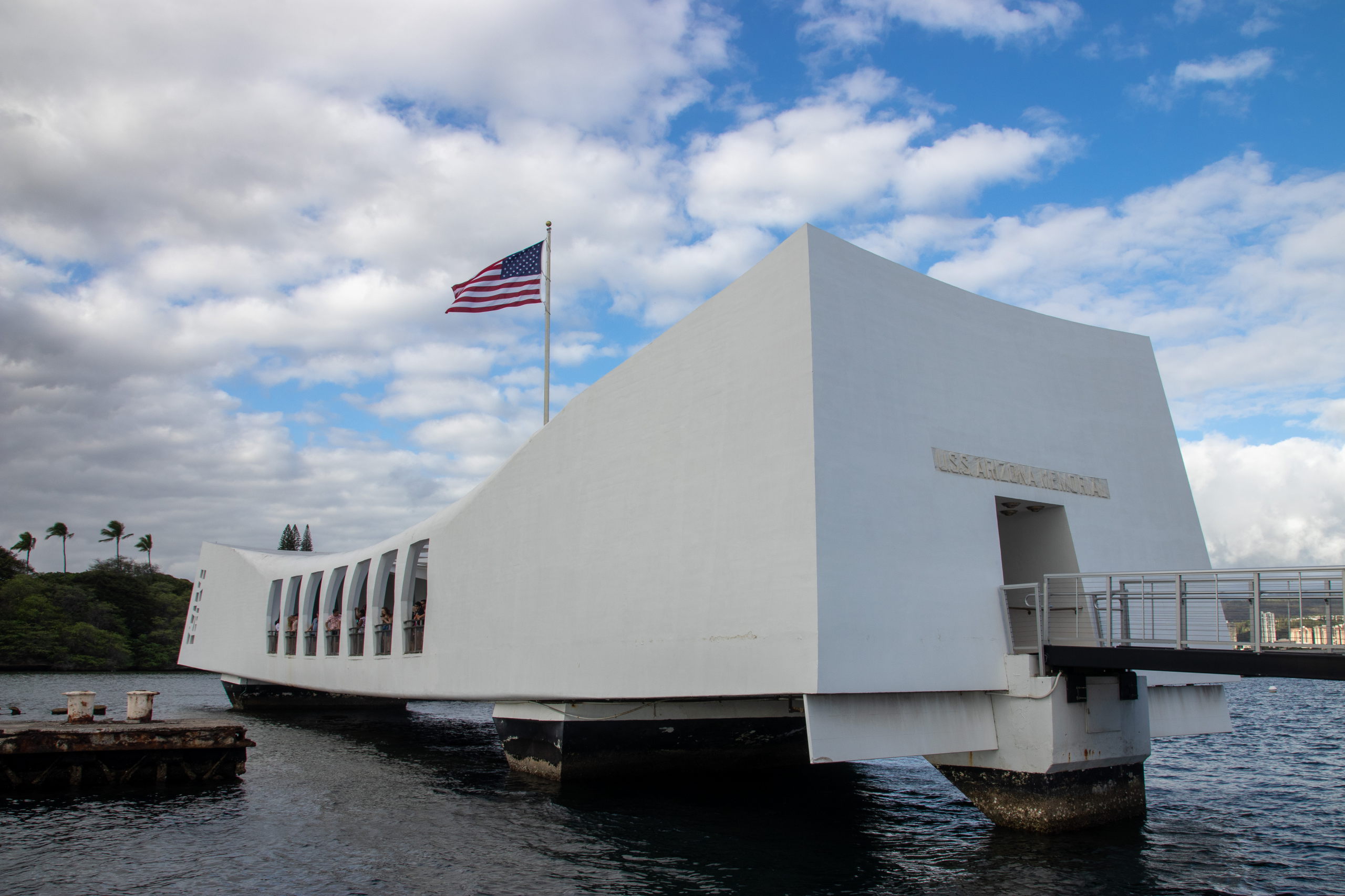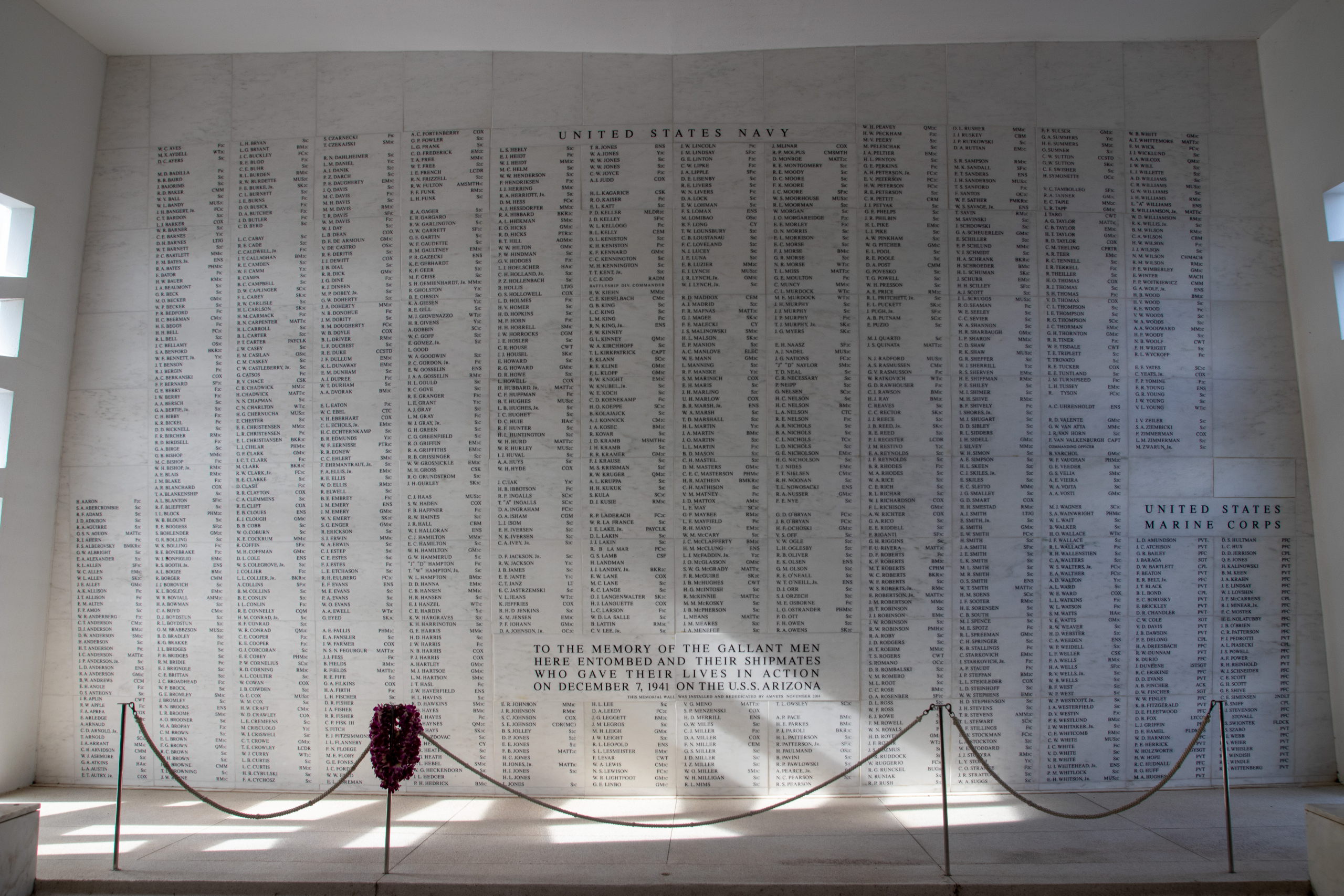 Hier ist das Museum, das dem Überraschungsangriff der Kaiserlich Japanischen Marineluftstreitkräfte auf die vor Anker liegende Pazifikflotte der USA am 7. Dezember 1941 gedenkt. Ich sehe mich ein wenig um und entdecke, dass man mit einem Boot zum Denkmal der USS Arizona fahren kann. Eigentlich benötigt man dafür eine Reservierung, aber die Dame vom Schalter sagt mir, dass es mit etwas Warten auch ohne Reservierung geht. Ich muss mich aber beeilen, da die Schlange lang ist. Also ab und anstellen. Ich habe Glück und erwische um drei Uhr eine der letzten 40-minütigen Touren. Nach einer kurzen Einführung geht es mit dem Boot in fünf Minuten zum USS Arizona Memorial. Das Schiff wurde bei dem Angriff völlig zerstört und sank. Über dem Wrack wurde eine markante Gedenkstätte errichtet, in deren Inneren die Namen aller Opfer in eine Wand graviert wurden. Als ich wieder zurück bin, sehe ich mir die anderen Ausstellungsräume an, in denen der genaue Ablauf des Angriffs mit akustischer Untermalung beschrieben wird. Hier herrscht eine ganz eigene Stimmung, besonders wenn man sich die Videos ansieht, in denen sich ältere Herren daran erinnern, was sich hier vor mehr als 80 Jahren ereignet hat.