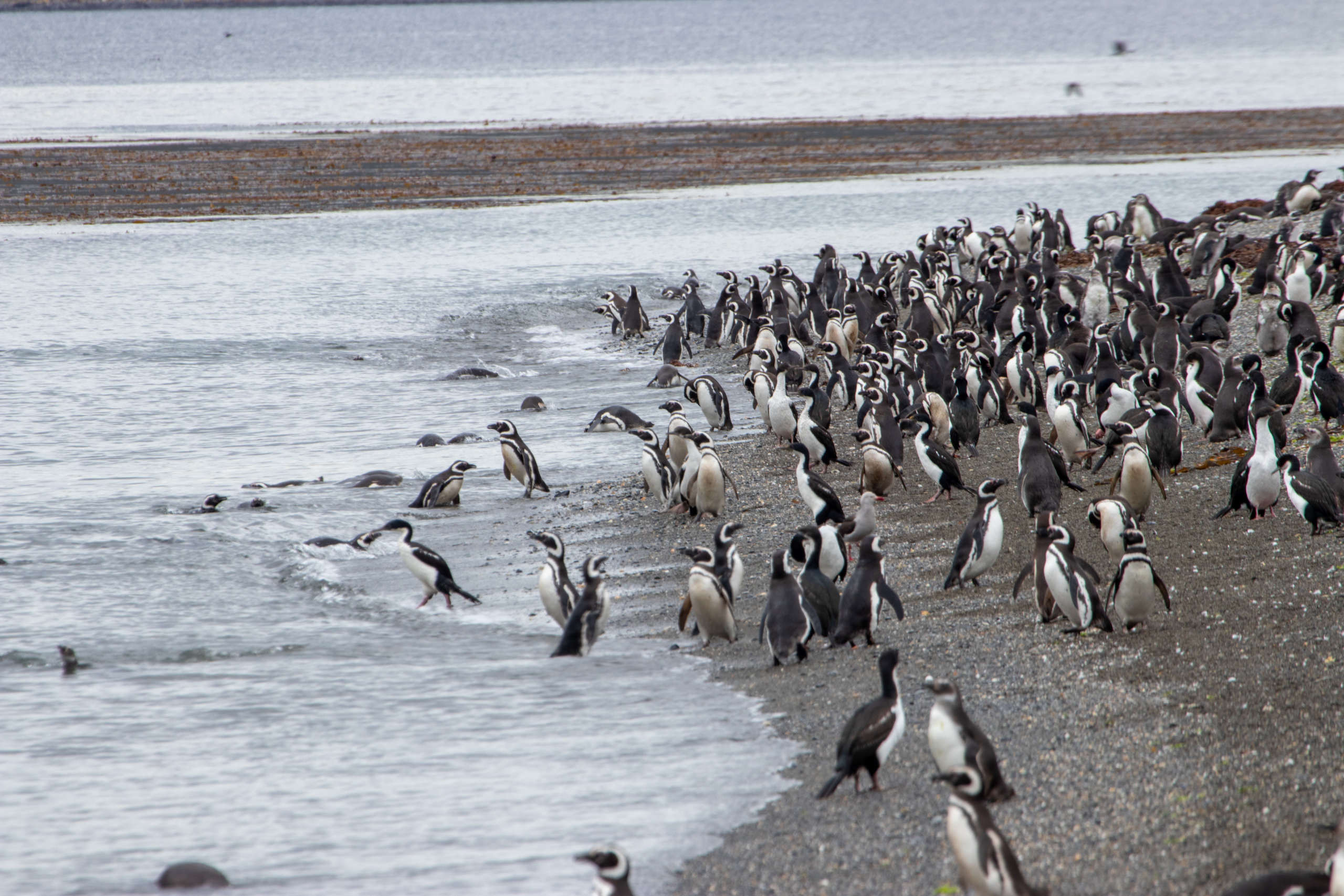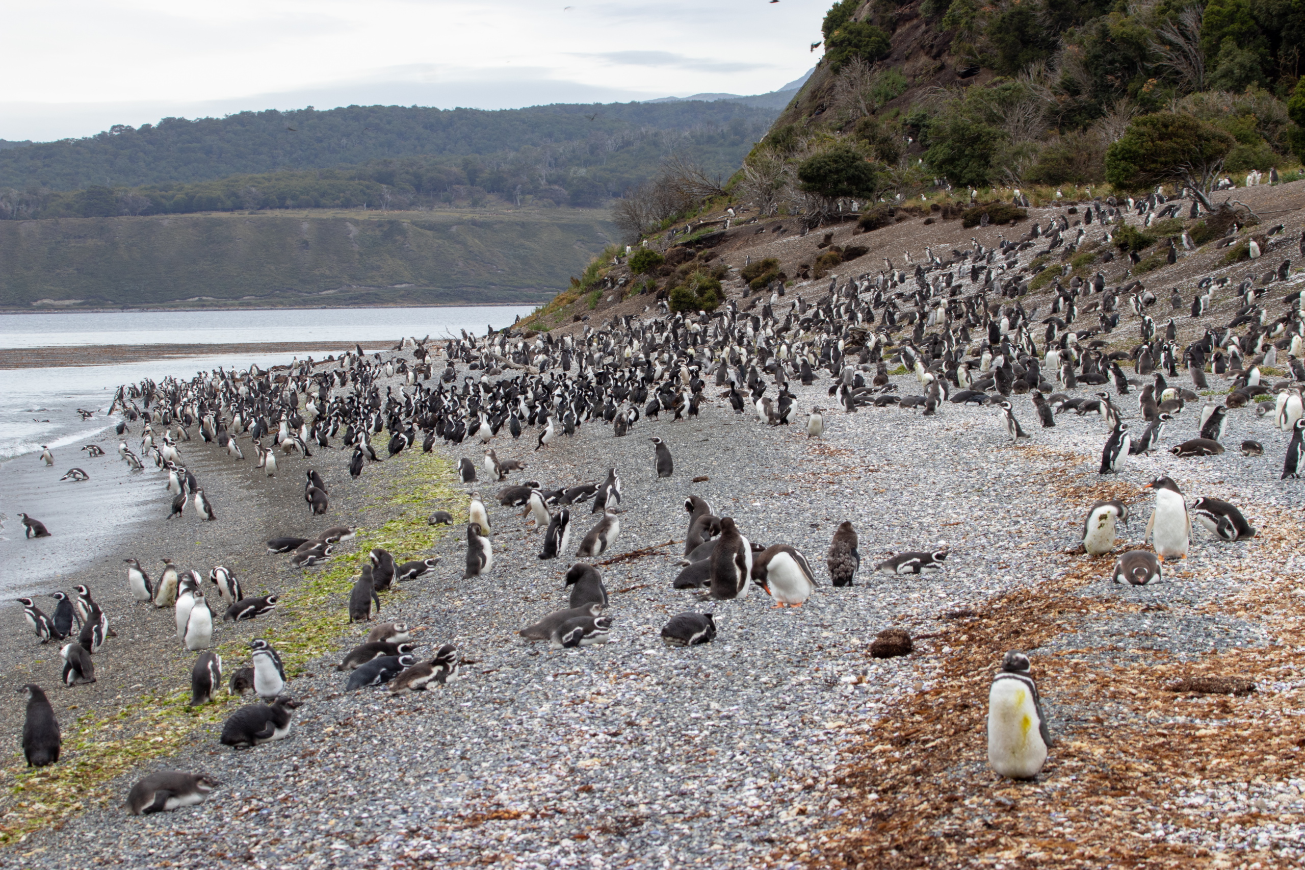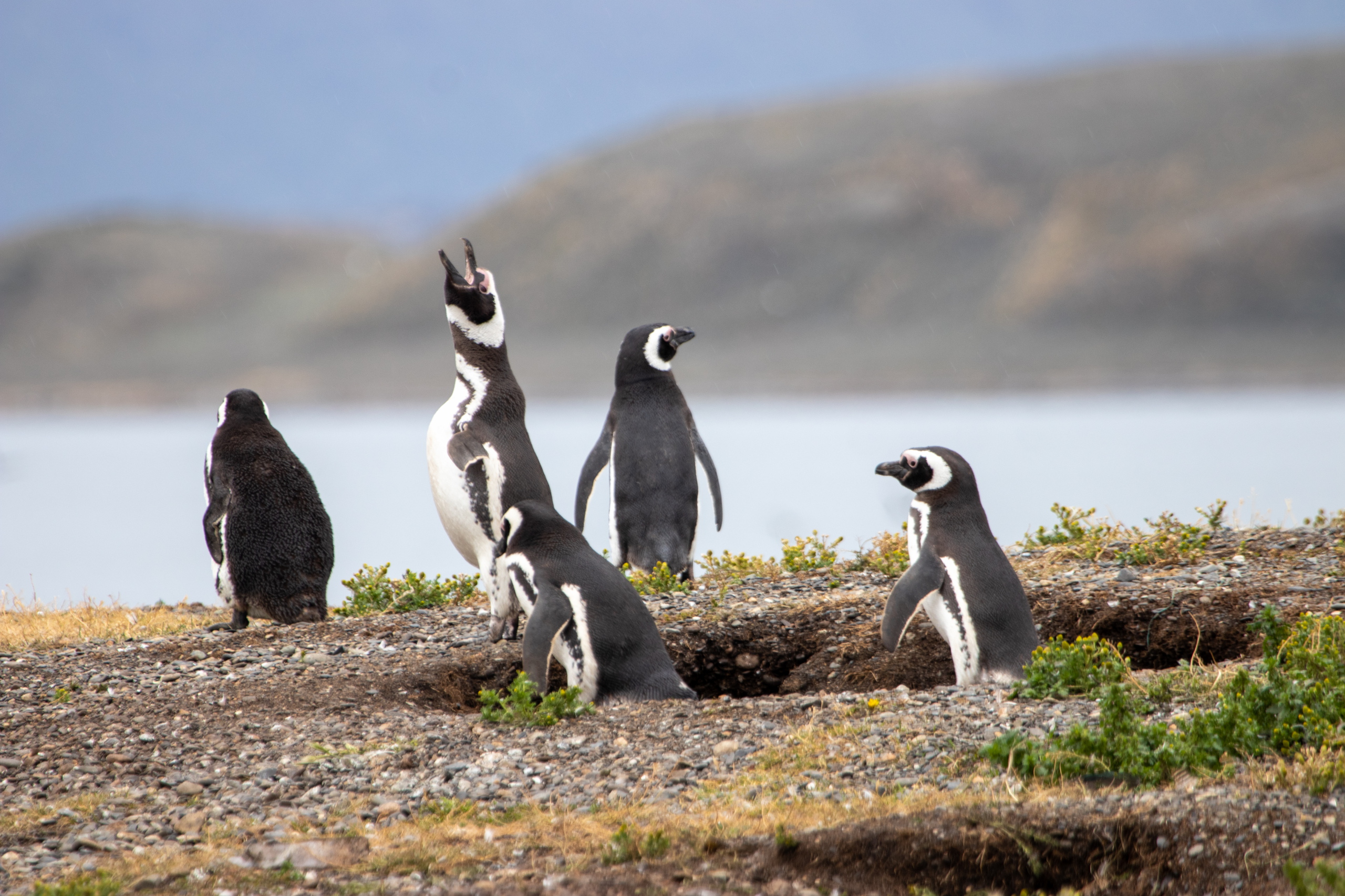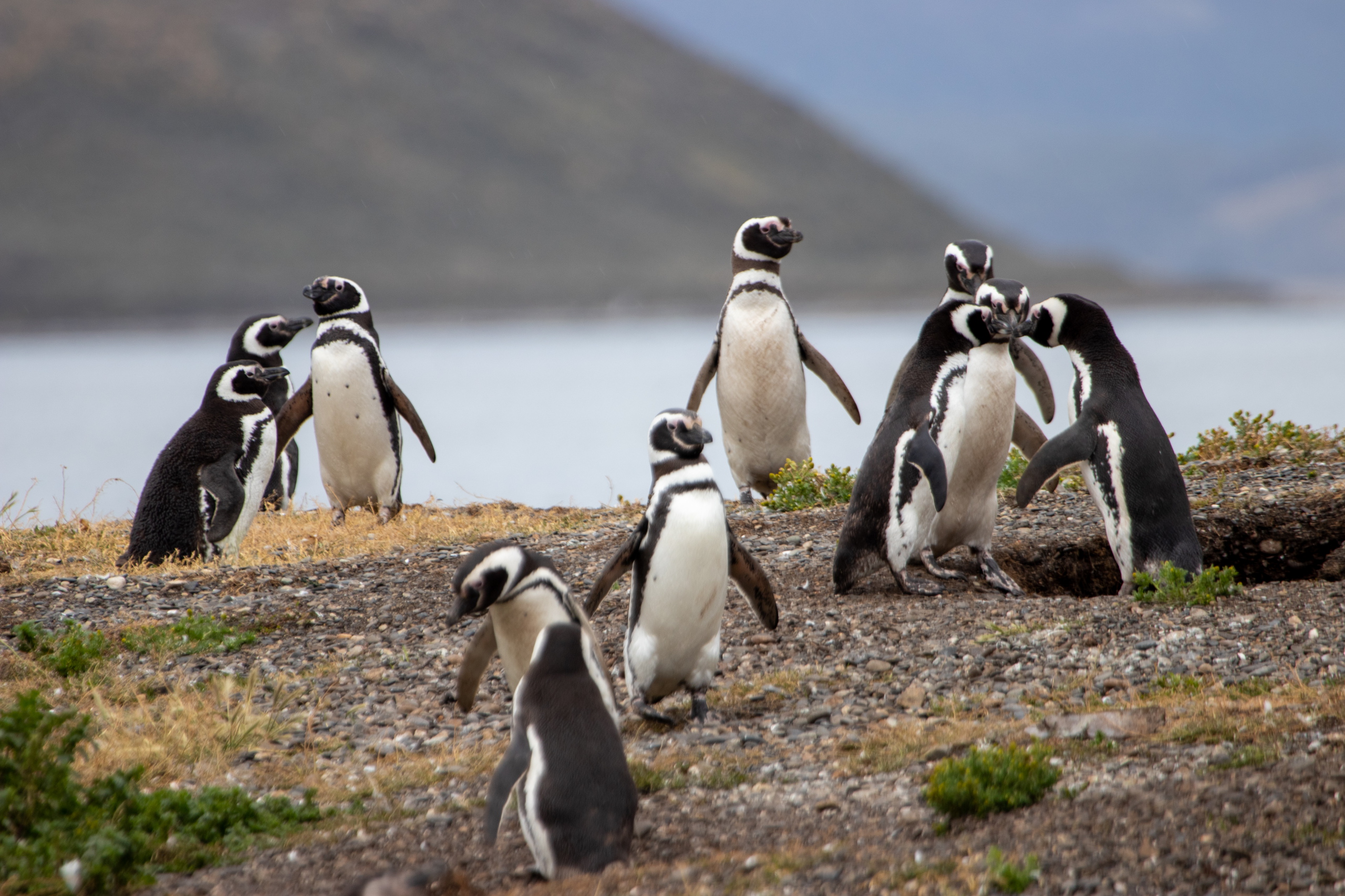 Nach ca. einer Stunde Fahrt und einer Pause an einem Aussichtspunkt über den Beagle Kanal, erreichen wir den Ausgangspunkt in der Nähe der Estancia Haberton. Ein kleines Boot bringt uns in nur zehn Minuten zur Isla Martillo, wo schon das Empfangskomitee auf uns wartet.