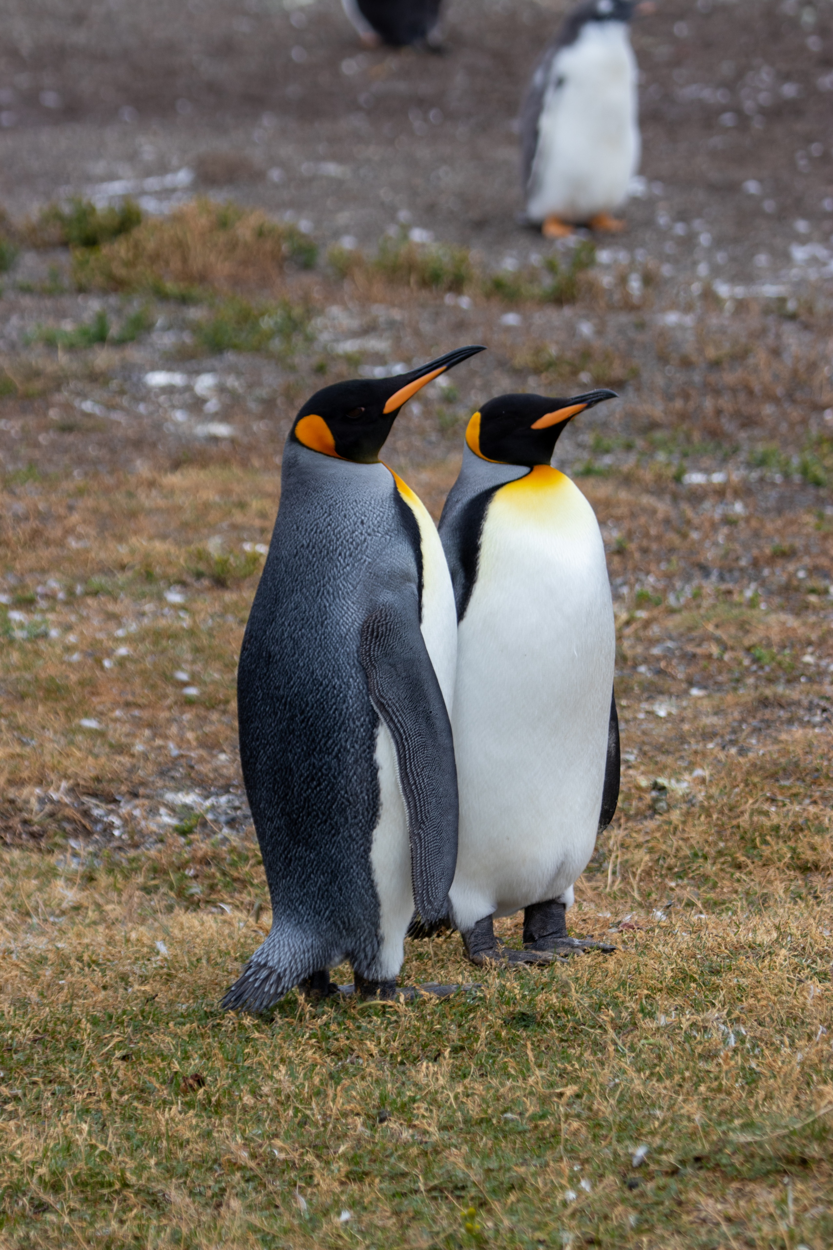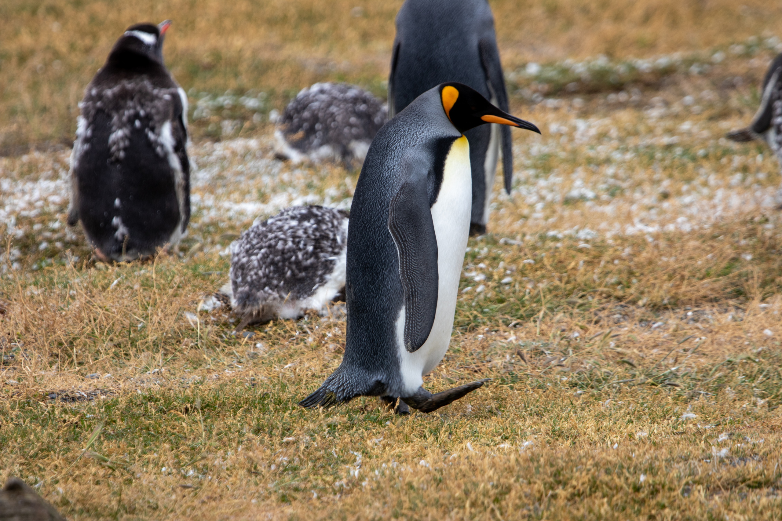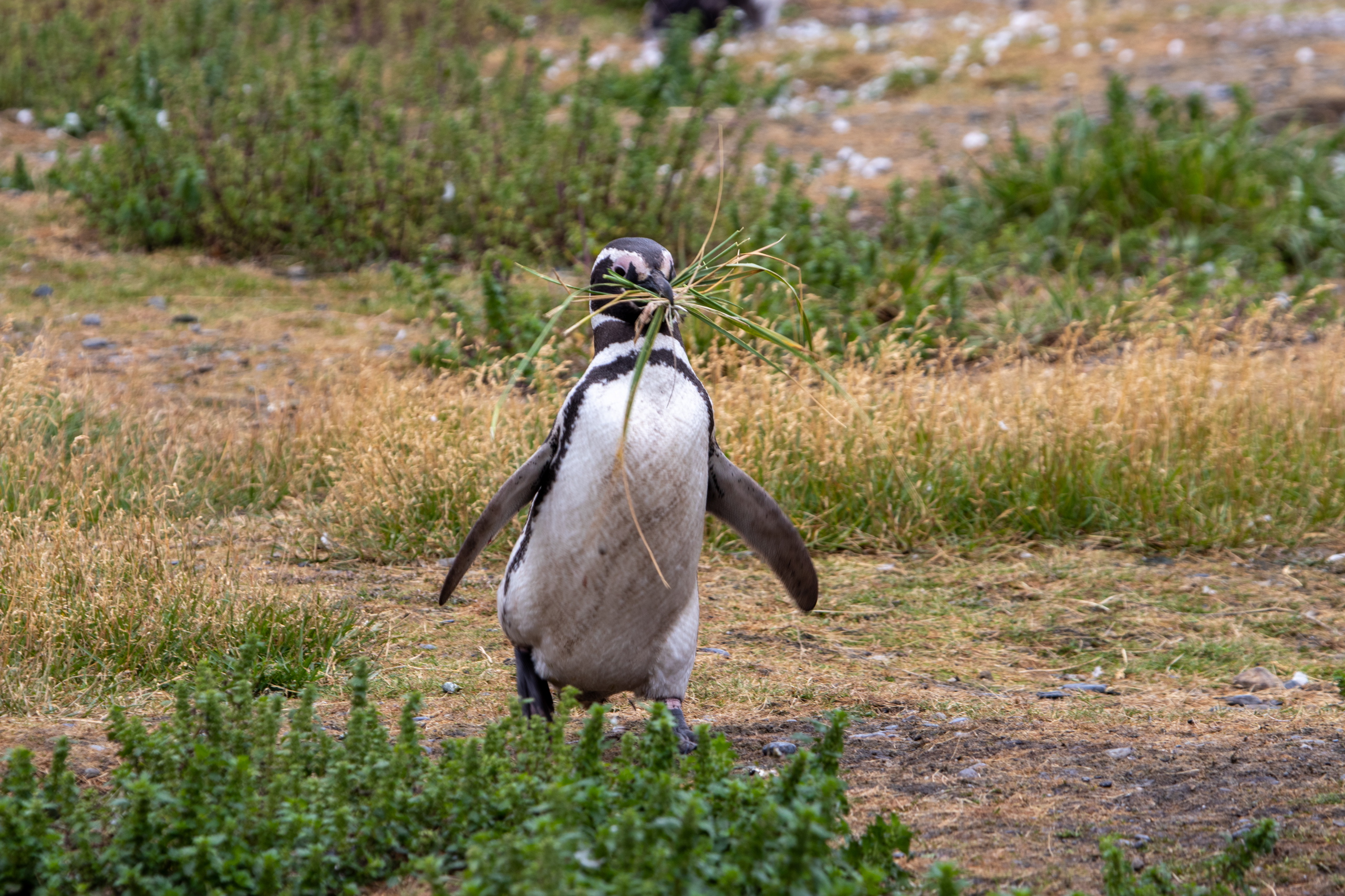 Auf der Insel leben ca. 10.000 Magelan-Pinguine und ca. 120 Eselspinguine. Wir gehen an Land und können beide Arten sehen. Etwas weiter weg entdecke ich zwei einer anderen Art. Es sind Königspinguine. Die aus der Österreich-Werbung, wer’s noch kennt. Die Arten unterscheiden sich im Verhalten, wie sie ihre Nester bauen und natürlich im Aussehen. Die Magelan-Pinguine brüten in Höhlen oder Mulden, während die Eselspinguine einfach nur einen Steinhaufen bauen. Da Steine Mangelware sind, wird schon mal einer vom Nachbarn geklaut. Die Königspinguine haben laut unserem Guide schon seit Jahren keinen Nachwuchs mehr auf dieser Insel. Vermutlich sind die Bedingungen für ihren Nachwuchs nicht ideal.