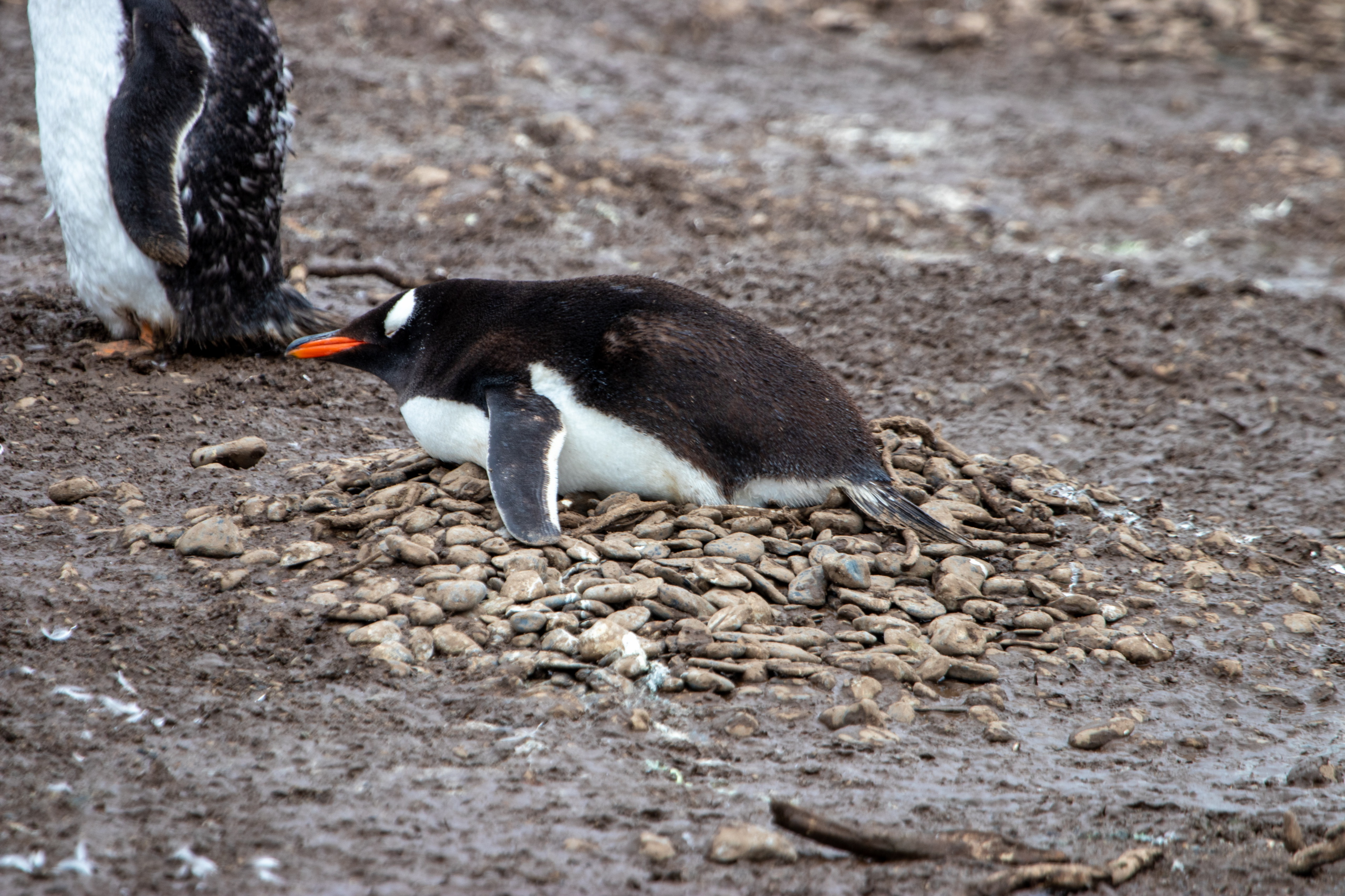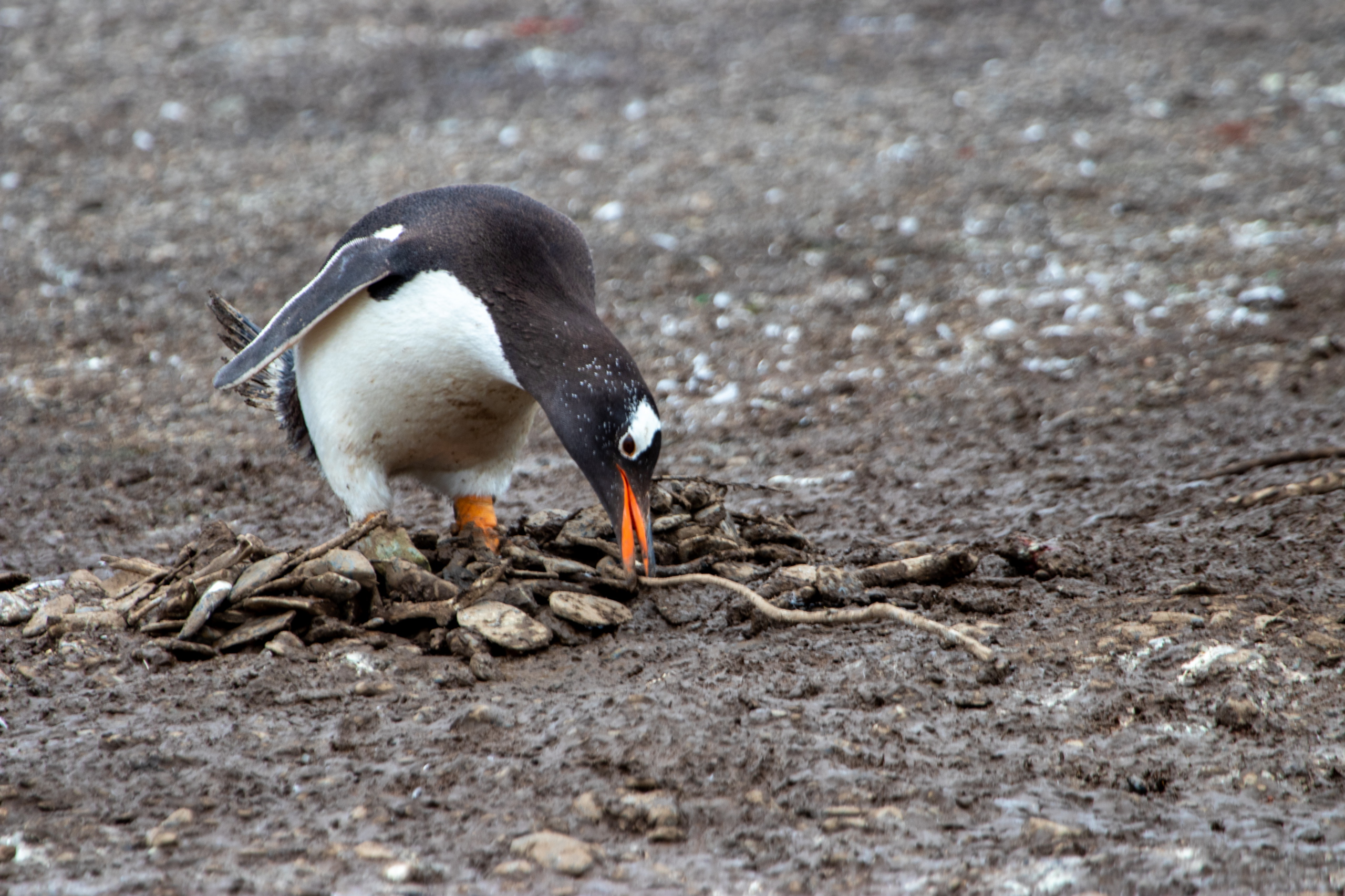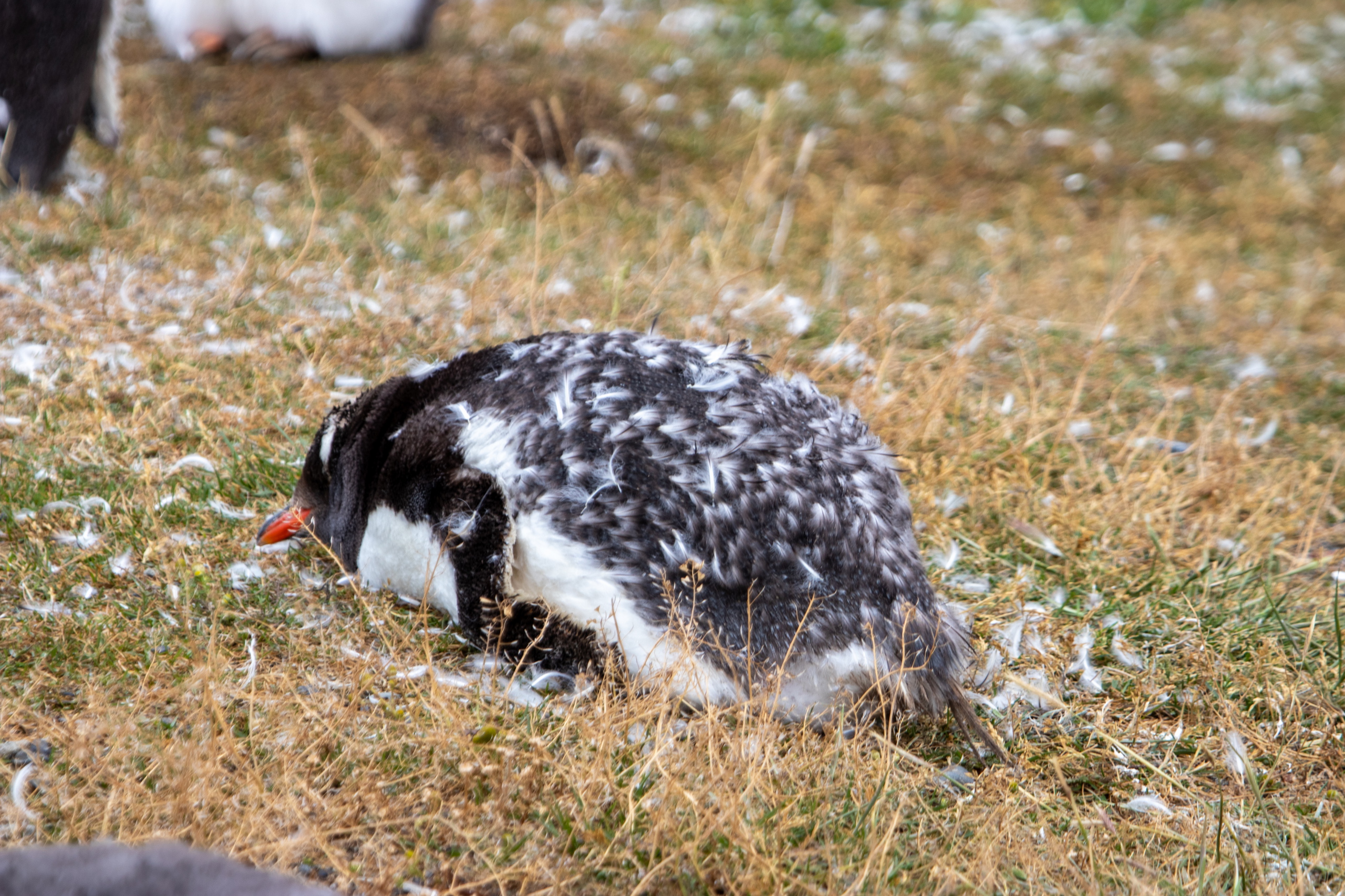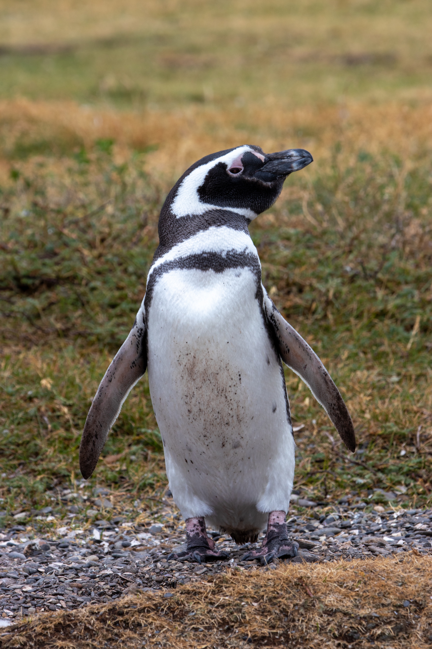 Auf der Insel leben ca. 10.000 Magelan-Pinguine und ca. 120 Eselspinguine. Wir gehen an Land und können beide Arten sehen. Etwas weiter weg entdecke ich zwei einer anderen Art. Es sind Königspinguine. Die aus der Österreich-Werbung, wer’s noch kennt. Die Arten unterscheiden sich im Verhalten, wie sie ihre Nester bauen und natürlich im Aussehen. Die Magelan-Pinguine brüten in Höhlen oder Mulden, während die Eselspinguine einfach nur einen Steinhaufen bauen. Da Steine Mangelware sind, wird schon mal einer vom Nachbarn geklaut. Die Königspinguine haben laut unserem Guide schon seit Jahren keinen Nachwuchs mehr auf dieser Insel. Vermutlich sind die Bedingungen für ihren Nachwuchs nicht ideal.
