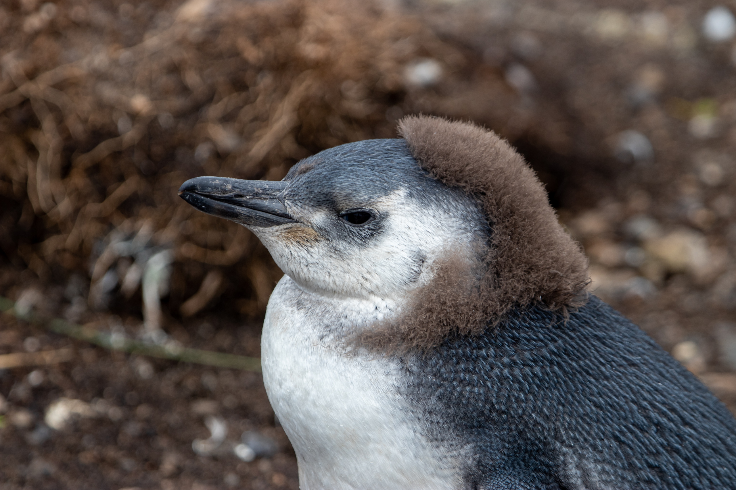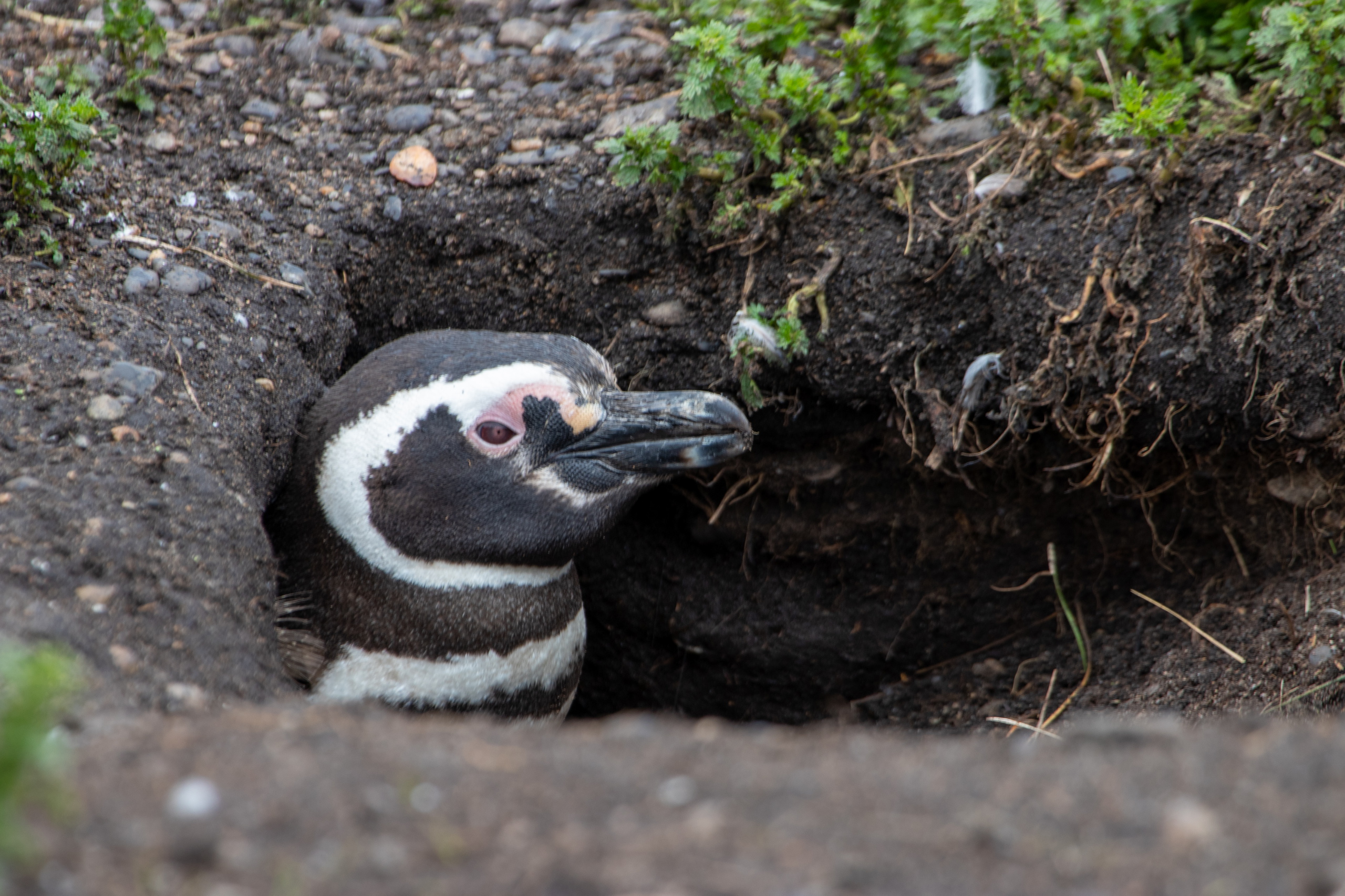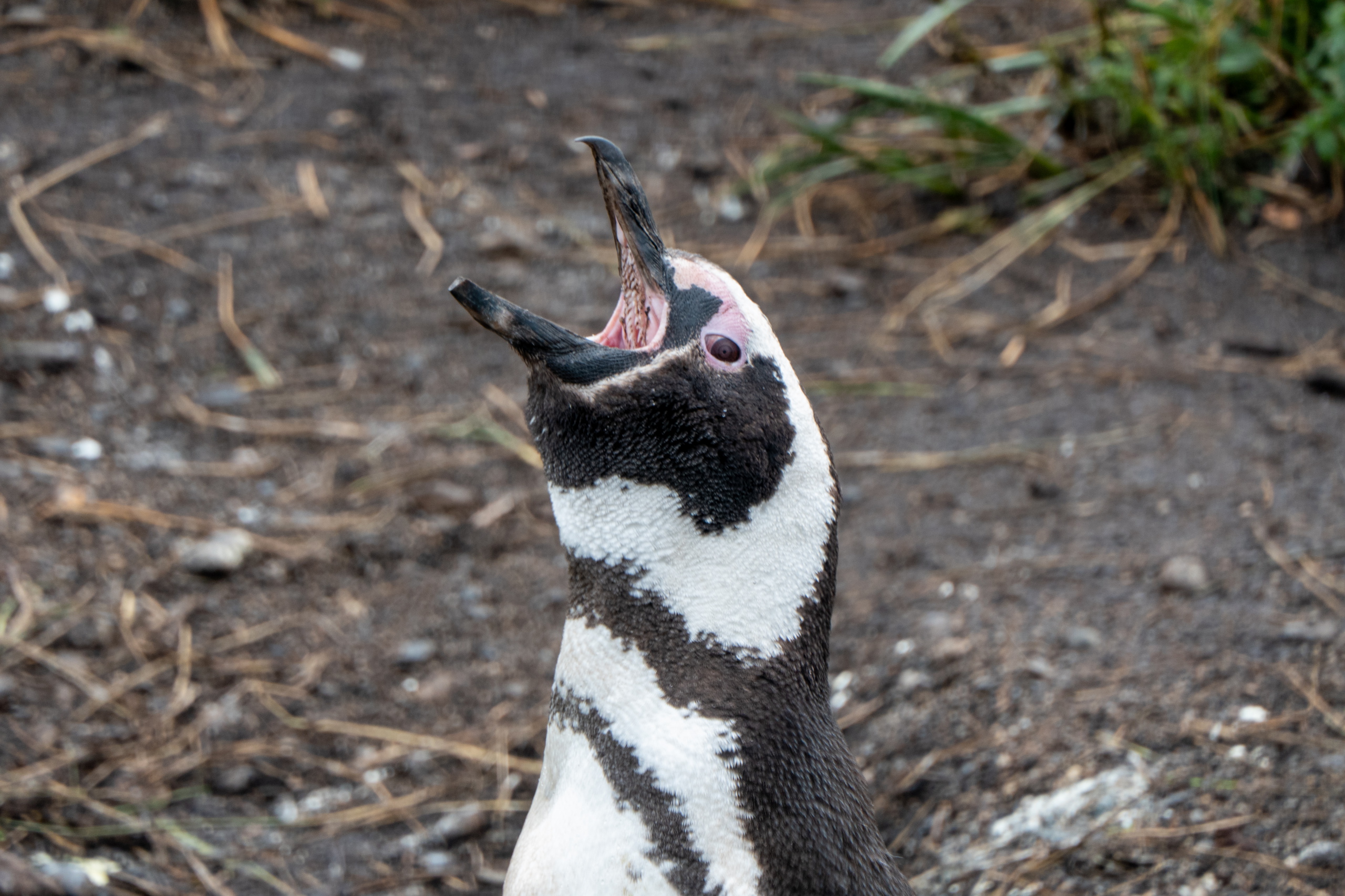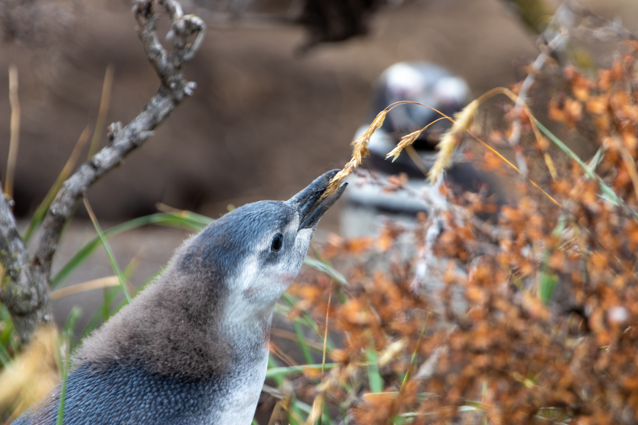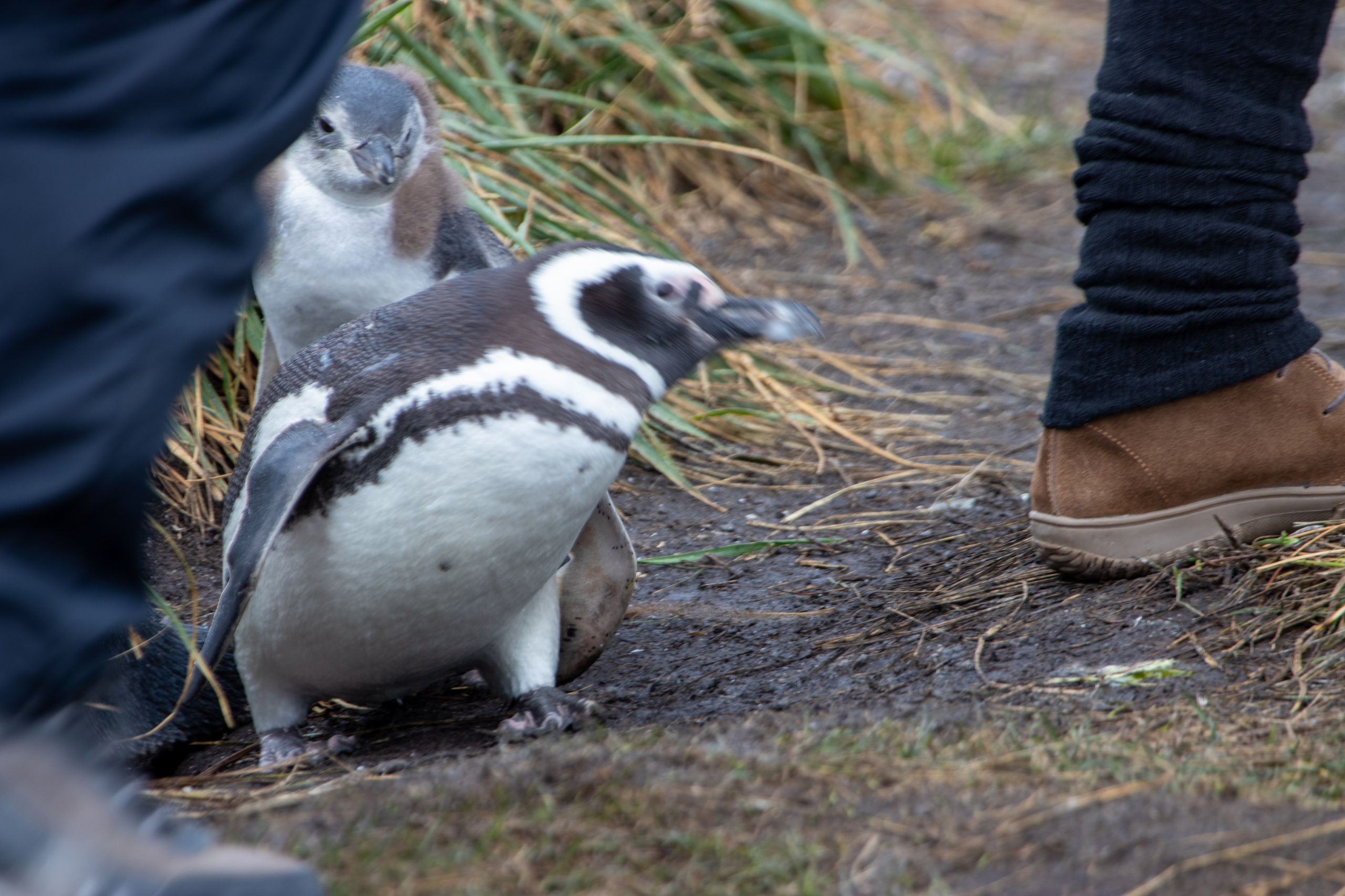 Bis auf ein paar Spezialisten geht die Gruppe immer unserem Guide nach und wir sehen die unterschiedlichen Nistplätze und hören ständig Magelan-Pinguine schreien. Es ist ganz schön laut hier. Ein paar der Jungen sind schon in der Mauser. Sie verlieren dabei ihr flauschiges Gefieder und es kommt ein wasserdichtes Federkleid zum Vorschein. In dieser Zeit fressen sie nichts und liegen nur faul herum. Immer wieder gibt es ein paar Spezialisten unter den Vögeln, die glauben es ist eine gute Idee, ihr Nest direkt neben dem Weg zu bauen. Und so müssen wir an machen Tieren ganz nahe vorbei. Einem Pinguin schmeckt das gar nicht und er pickt nach einem Touristen. 🙂 Ist ja auch sein Revier und nicht das des Besuchers.