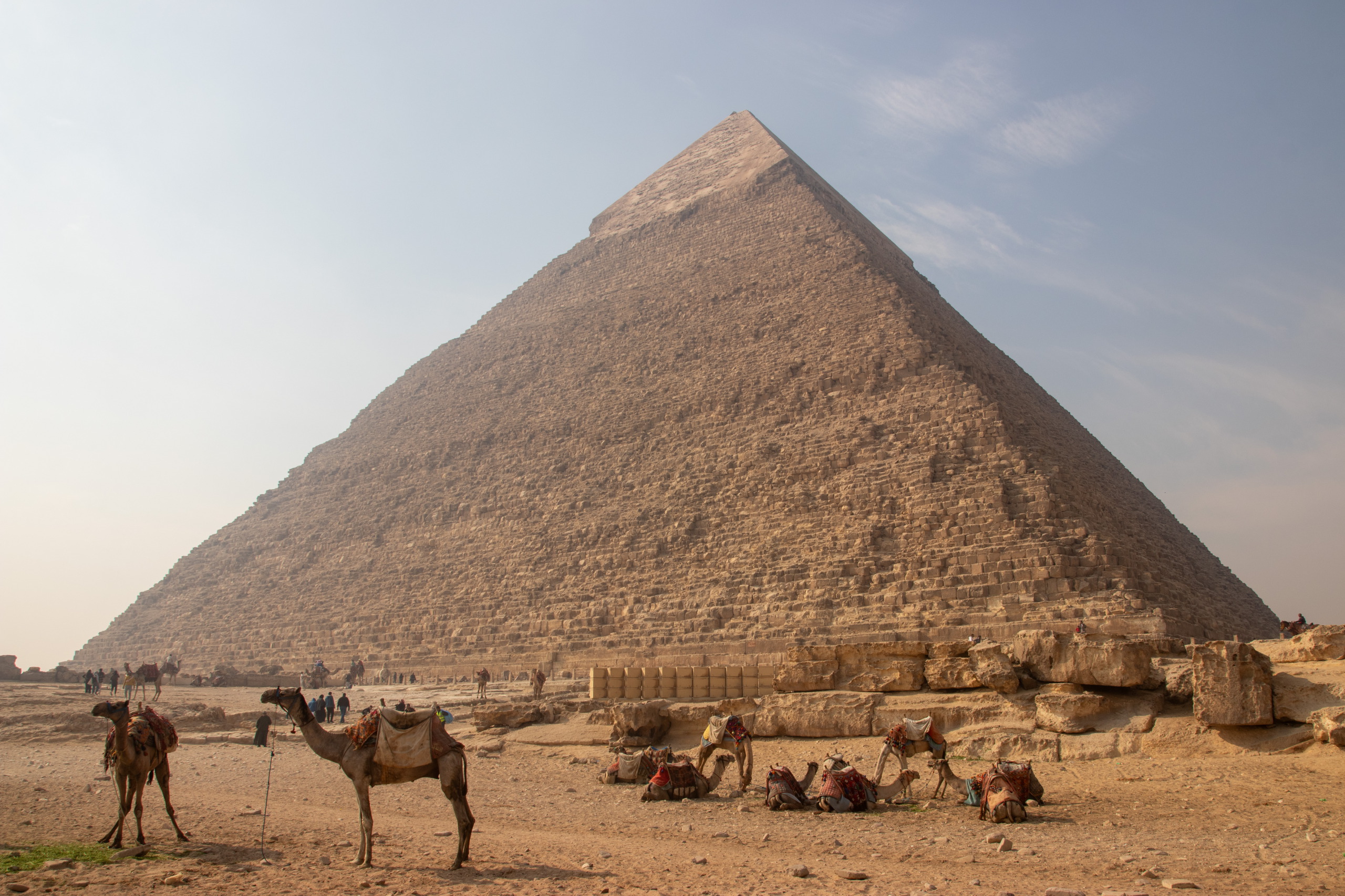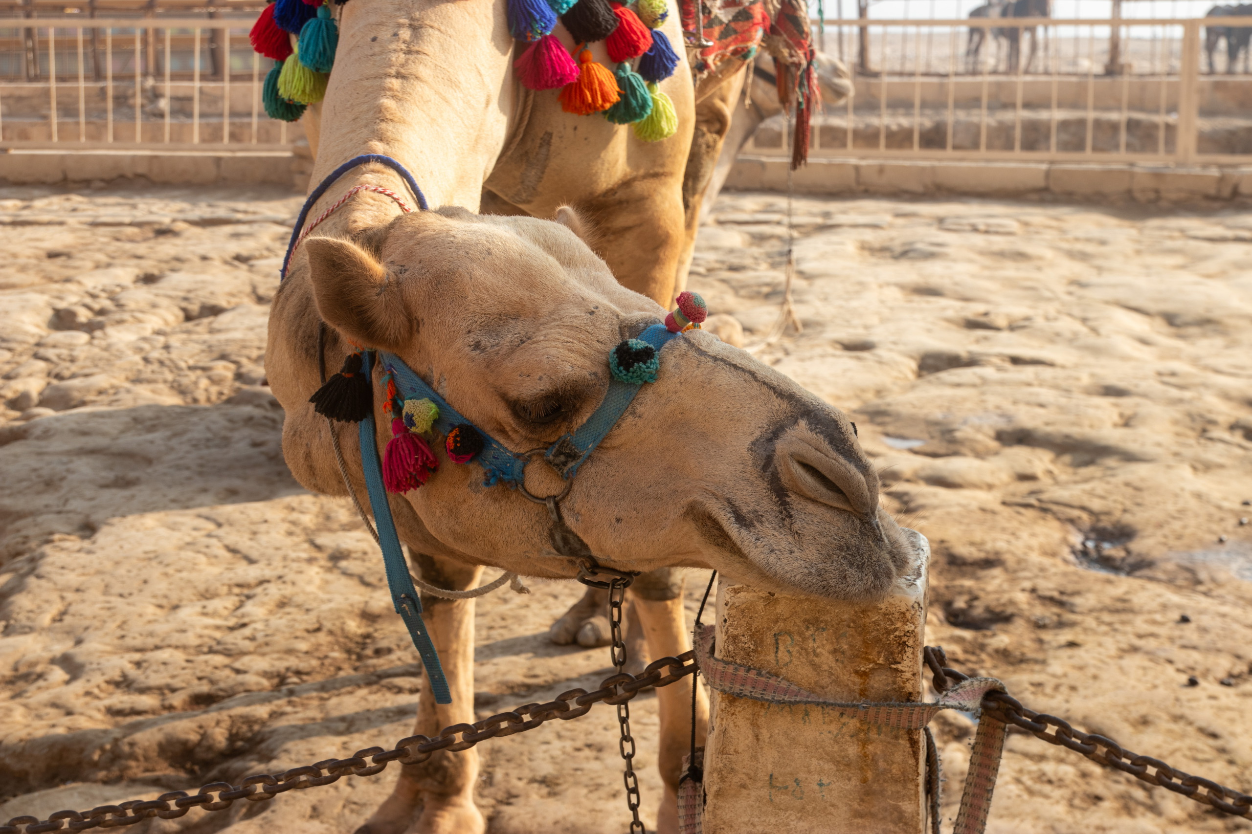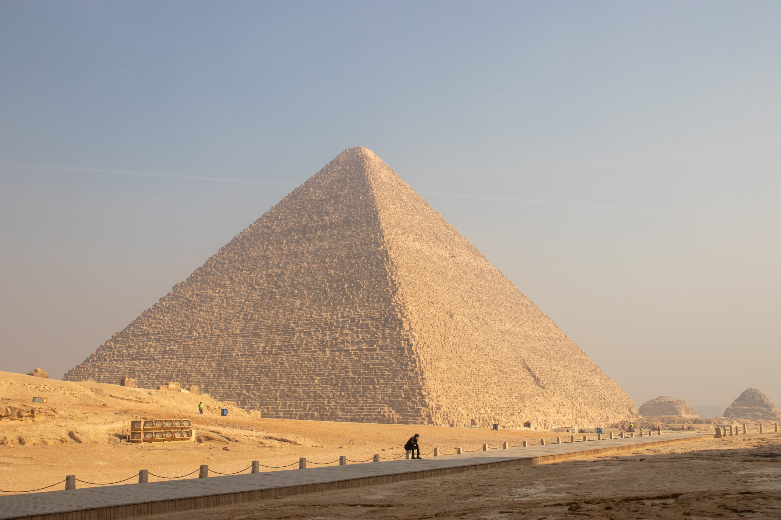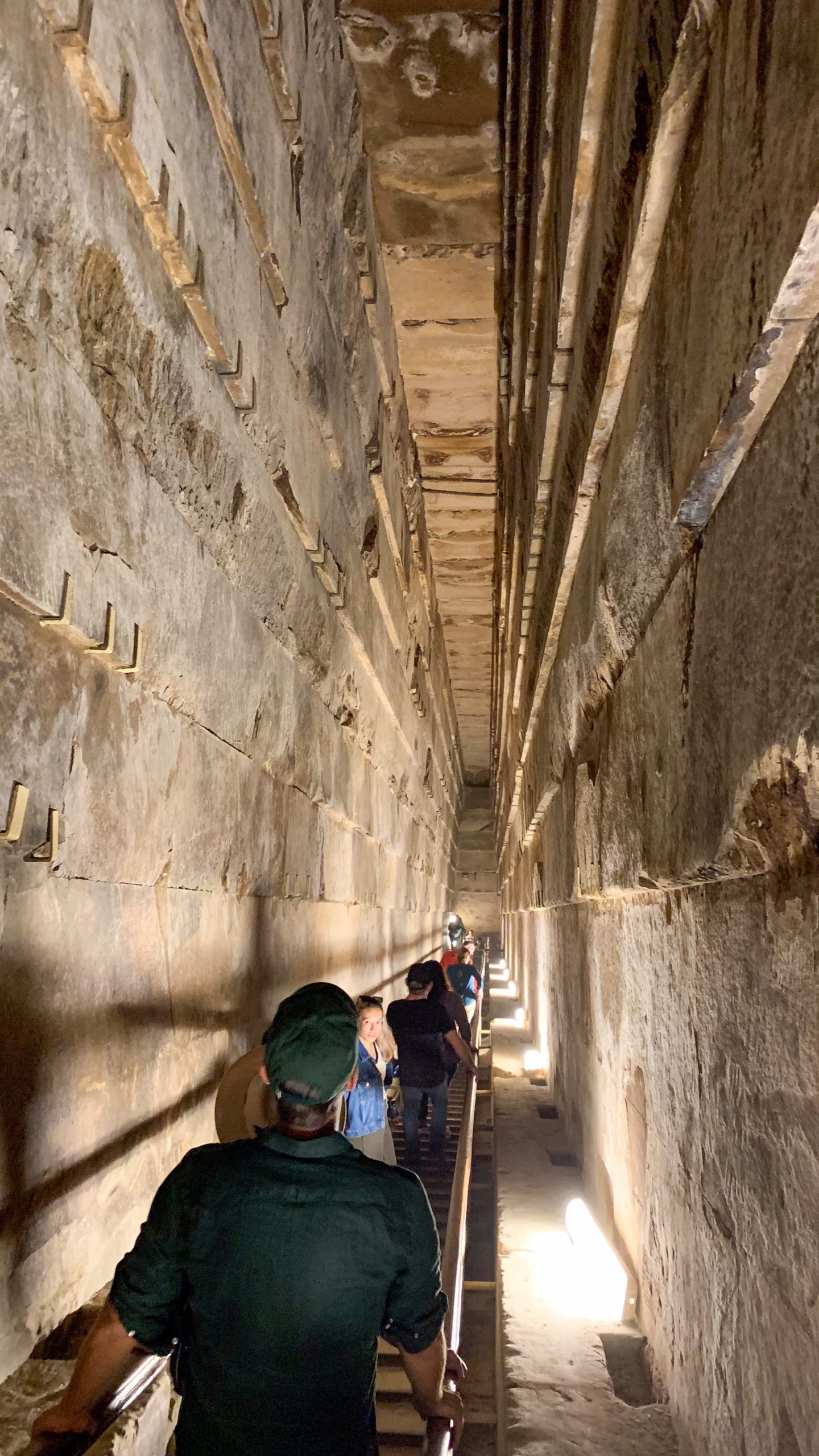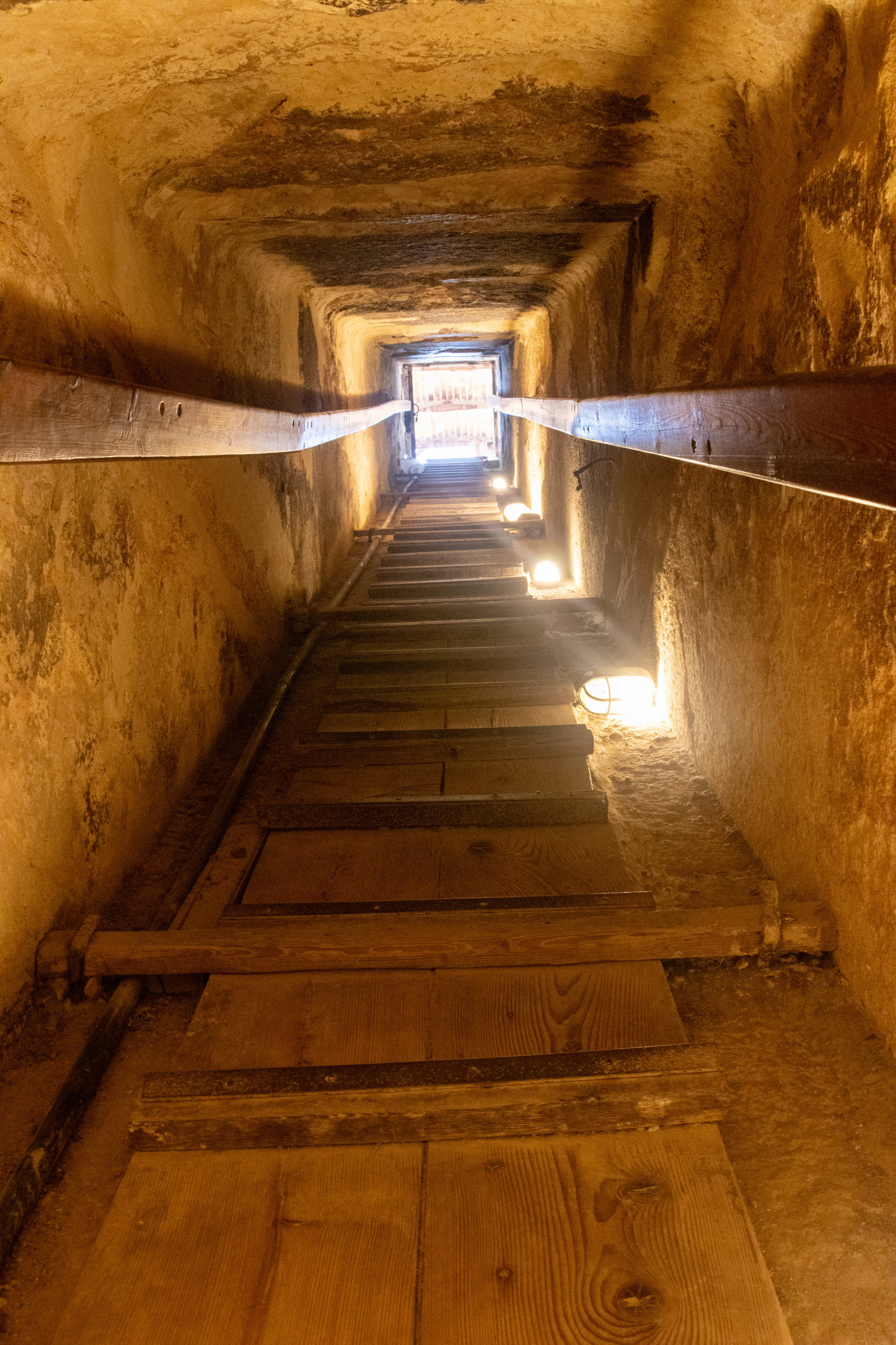Noch sind nicht viele Leute unterwegs und so starte ich an der Sphinx vorbei hoch in Richtung Cheops-Pyramide. Davor aber noch schnell zum Grab der Hetepheres I. Über einen steilen, engen Gang geht es einige Meter hinunter zur Grabkammer. Dabei muss ich fast auf allen Vieren kriechen. Okay, damals waren die Leute zwar kleiner, aber so klein waren sie sicher auch nicht. 😁 Die Grabkammer ist nicht gerade spektakulär, dafür im allgemeinen Ticketpreis enthalten. Es ist unangenehm warm hier drinnen. Nachdem ich mich wieder ans Tageslicht gekämpft habe, geht es weiter um die Cheops-Pyramide herum. Hier sind schon deutlich mehr Leute, die mit Bussen angekarrt werden. Also schnell ein paar Stufen an der Pyramide hoch und in den nächsten engen Schlurf hinein. Diesmal geht es allerdings aufwärts zur Grabkammer. Und das ist sogar im Stehen möglich. 👍 Wenn auch die Grabkammer sehr unspektakulär ist, ist es dennoch faszinierend, dass sie bereits vor 4500 Jahren erbaut wurde. Nun geht es weiter zur Mykerinos-Pyramide und hinunter zur Grabkammer. An einigen Wänden sind sogar Malereien zu sehen. Cool. Wieder draußen angekommen, fragen mich mehrere “Kamelfahrer”, ob ich nicht zum Aussichtspunkt hoch möchte. Klar möchte ich, aber zu Fuß. Einer sieht das nicht recht ein und flucht oder schimpft mir noch nach. Na dann erst recht nicht.