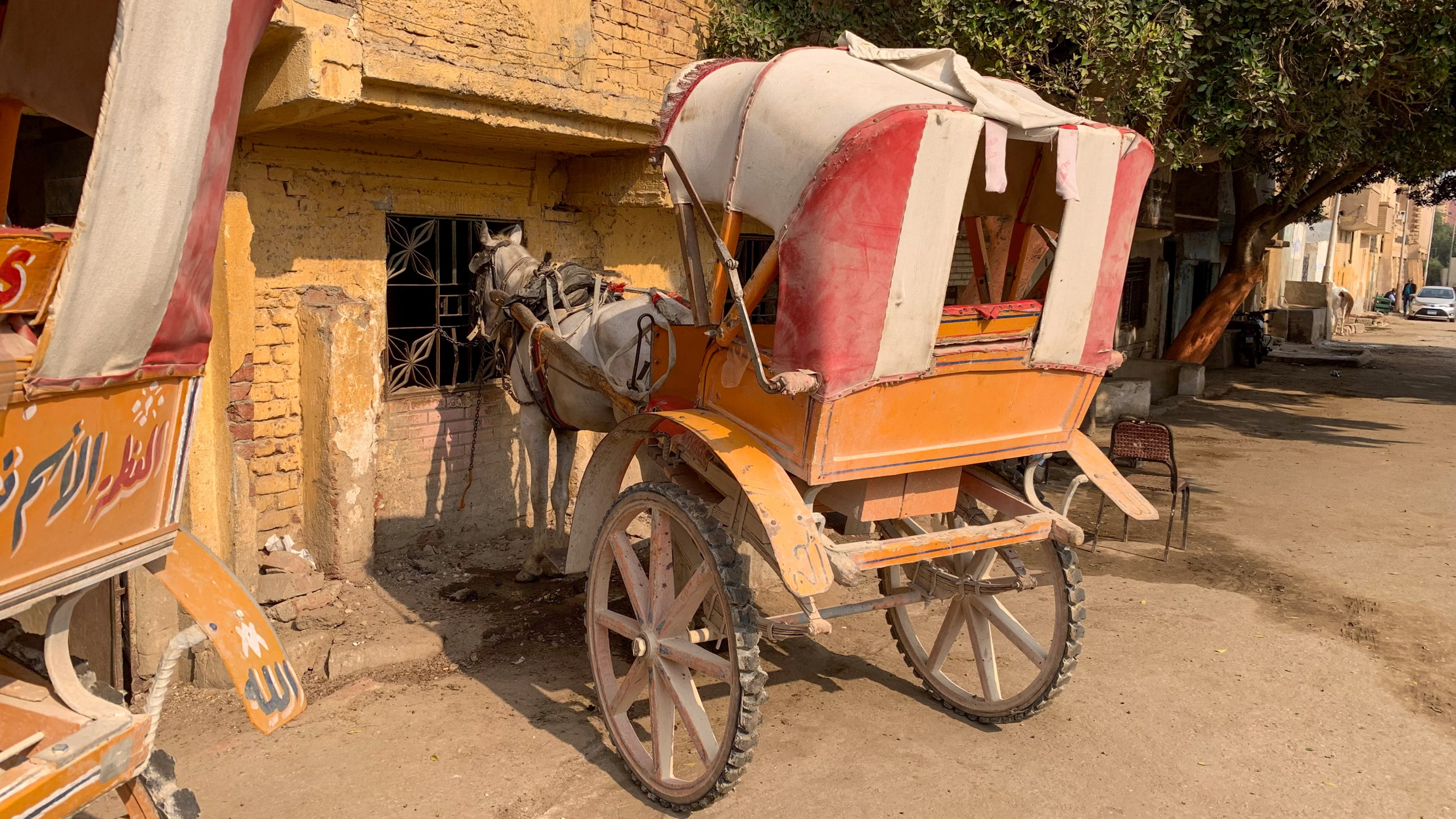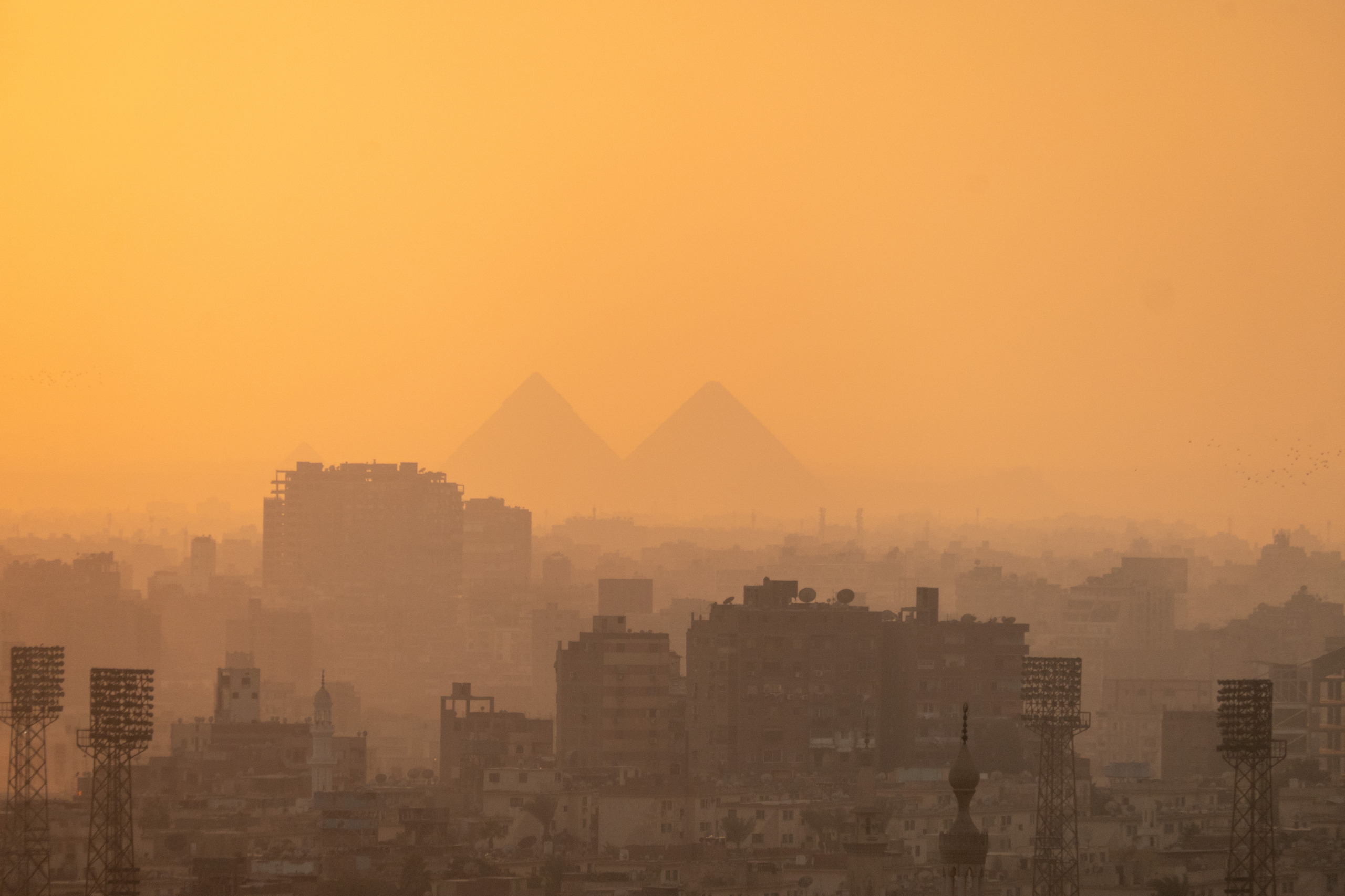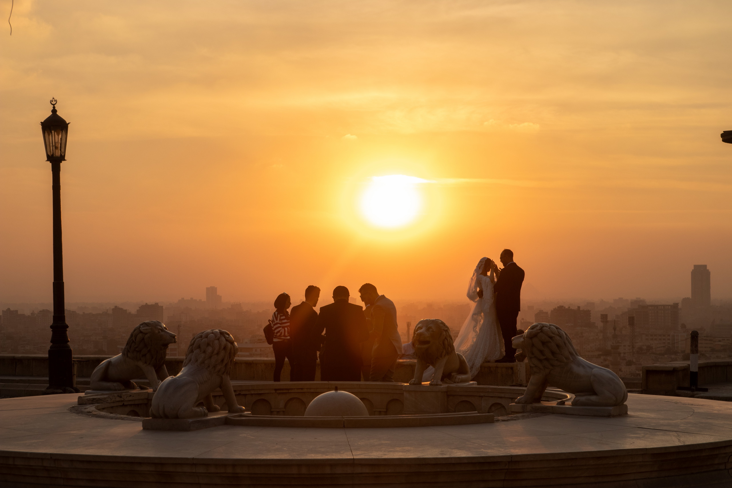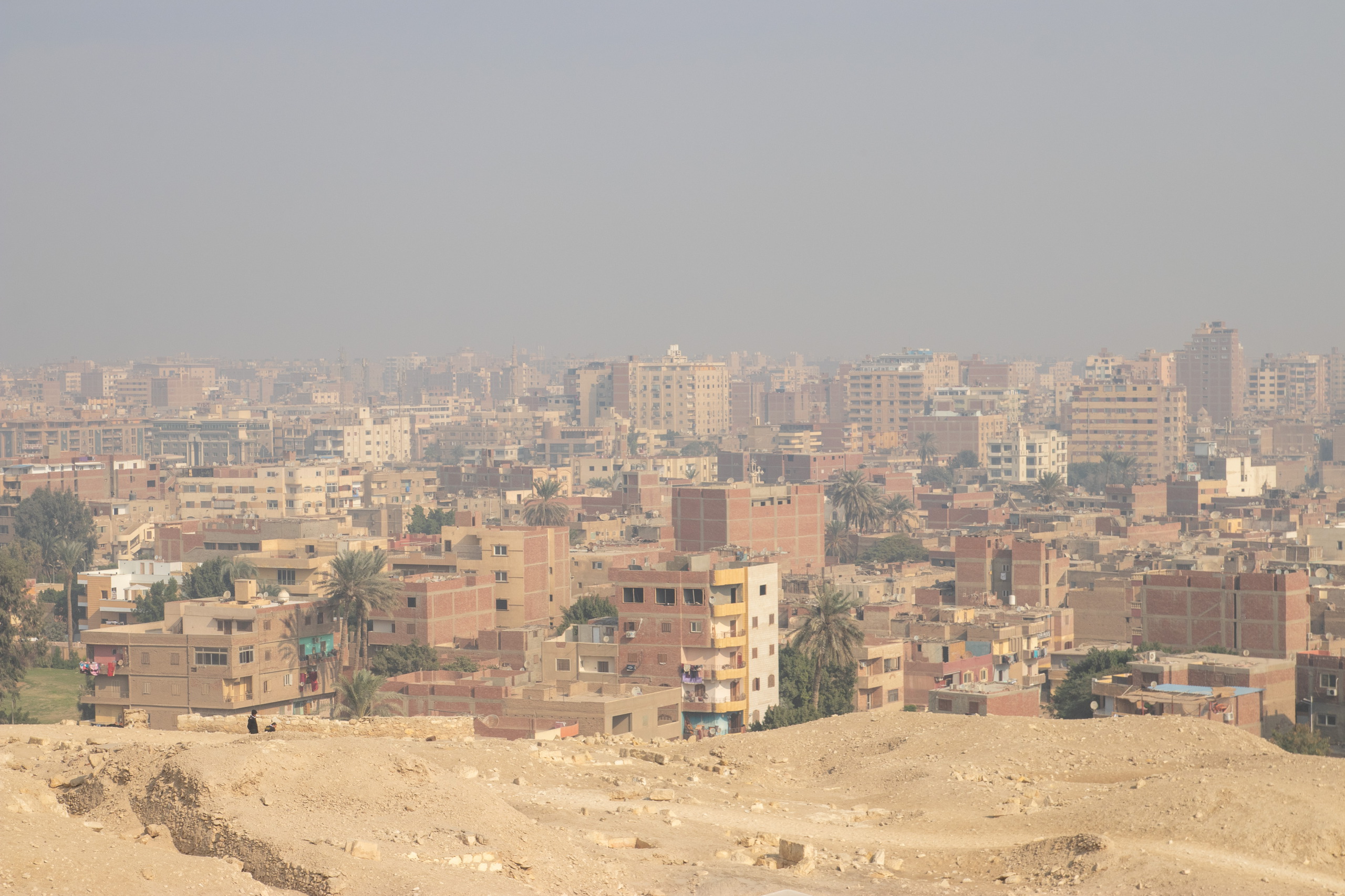 Ich erkunde noch ein wenig die Umgebung und gehe zur Moschee zurück. Die Vorbereitungen für die Hochzeit sind immer noch in vollem Gange und am Platz vor der Moschee posiert gerade ein Hochzeitspaar vor dem Sonnenuntergang. Nice. Nun sind auch die Pyramiden in der Ferne auszumachen. Noch mehr nice. Anhand der Fotos im Internet möchte man ja glauben, sie stehen mitten im Nirgendwo. In Wirklichkeit sind sie direkt am Stadtrand von Gizeh, der mit etwas mehr als 4 Millionen Einwohnern drittgrößten Stadt Ägyptens.