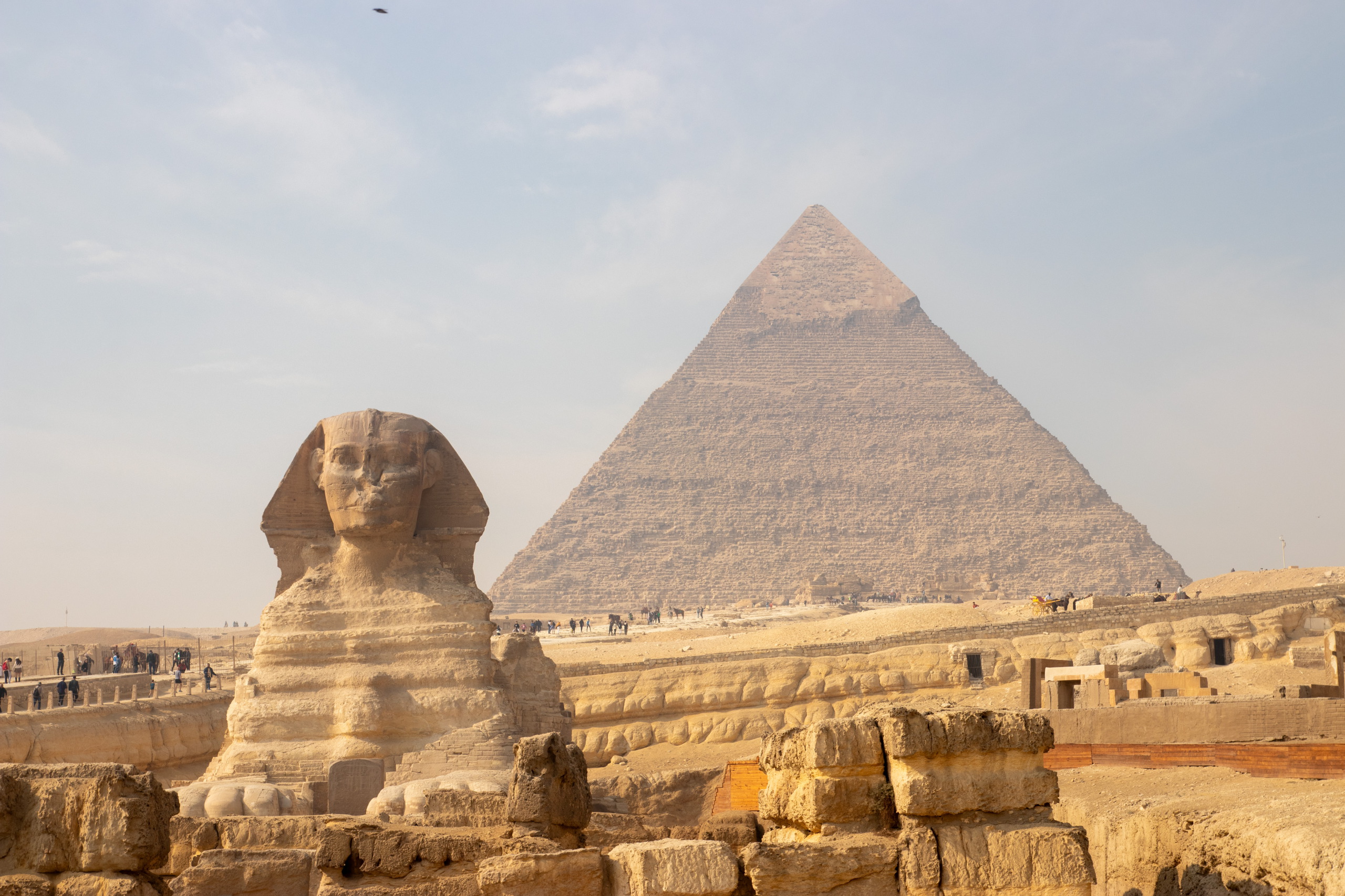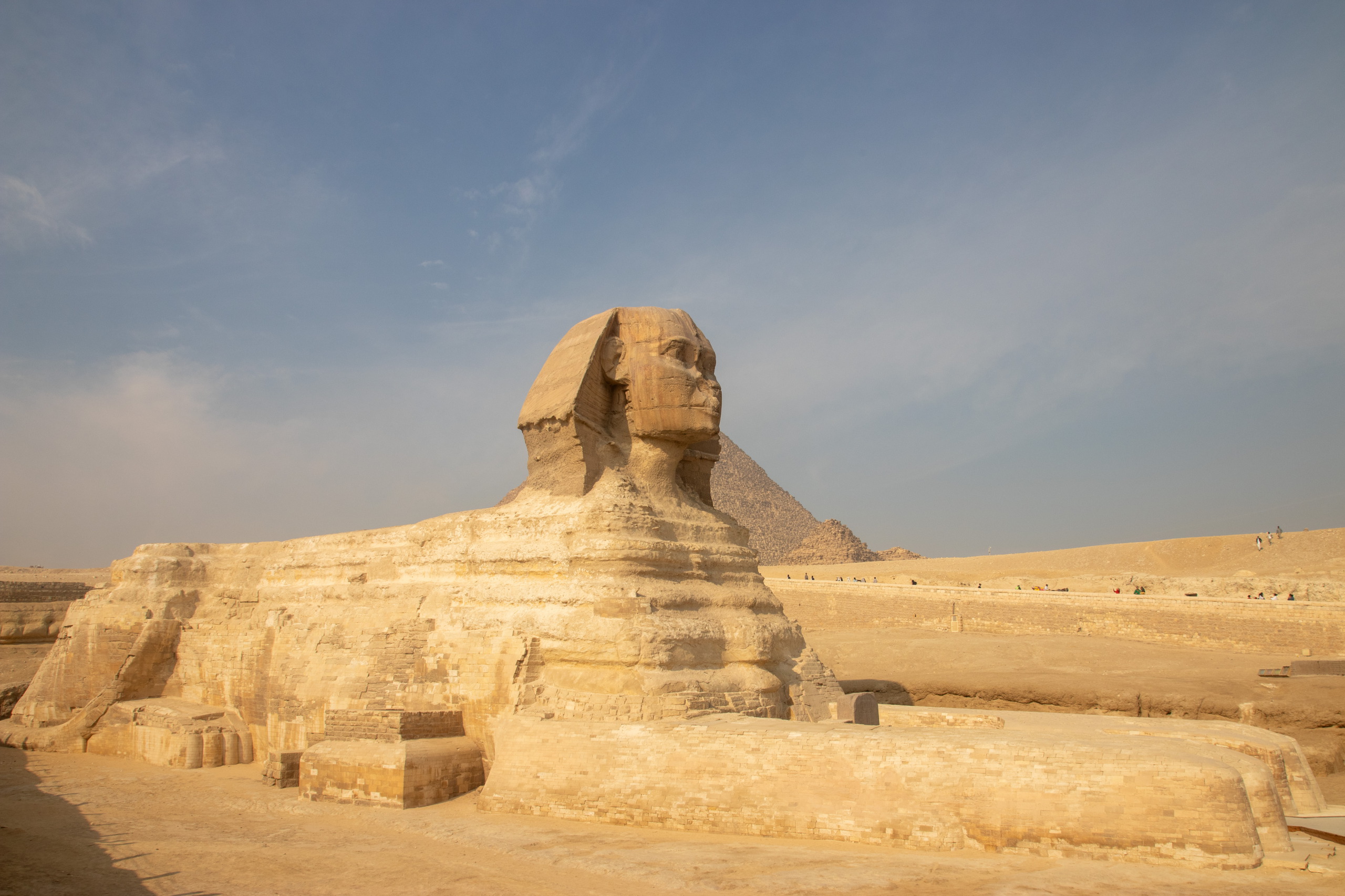 Durch groben Sand stapfe ich einen Hang hinauf, von dem aus die Pyramiden fast in einer Linie zu sehen sind. Immer wieder ziehen Touristen auf Kamelen vorbei. Durch den vielen Staub in der Luft ist es leider sehr diesig. Zum Sonnenuntergang muss der Ausblick aber der Wahnsinn sein. Am Rückweg suche ich den Eingang zur Mars Ankh Tomb. Hmmm, warum sind hier so wenige Leute? Ahja, die Grabkammer ist geschlossen. Warum hat man mir dann dafür ein Ticket verkauft? Tja, das werde ich den Typen am Schalter noch fragen. Zuvor steht aber noch die Sphinx auf der Liste.