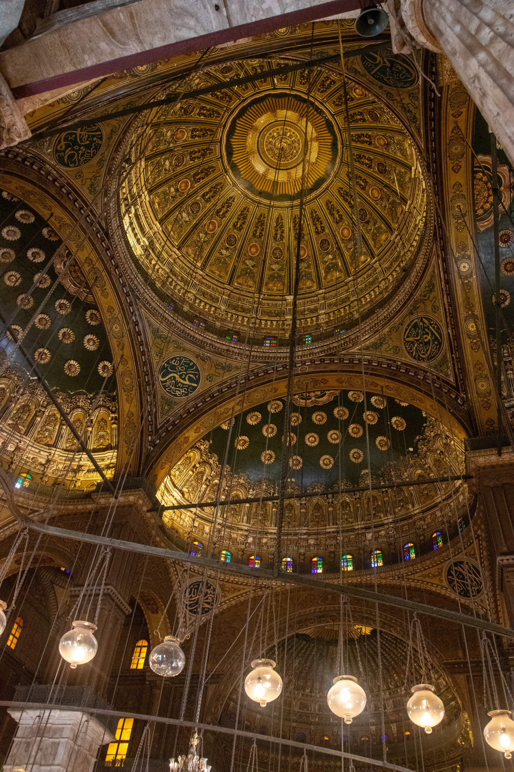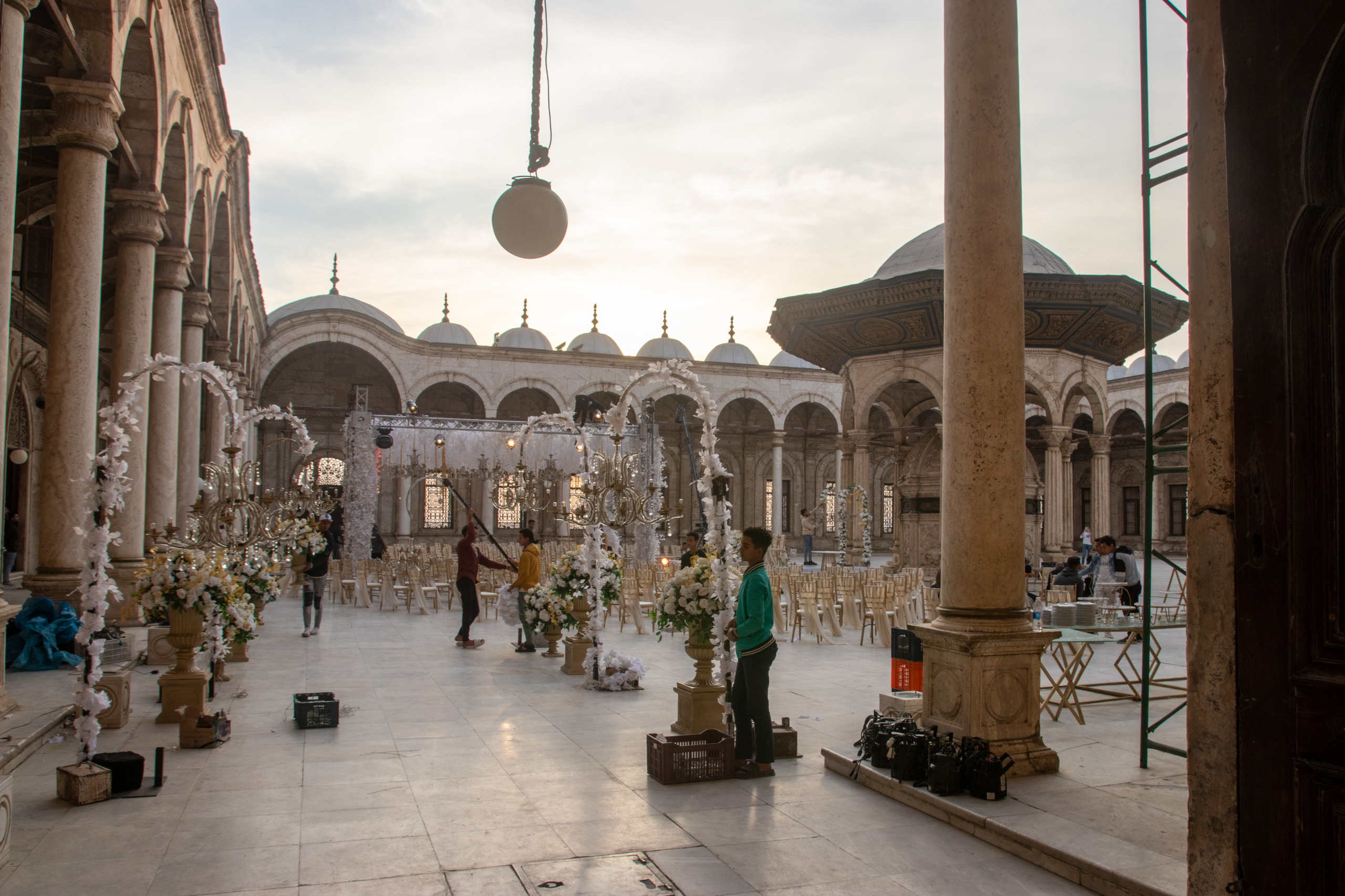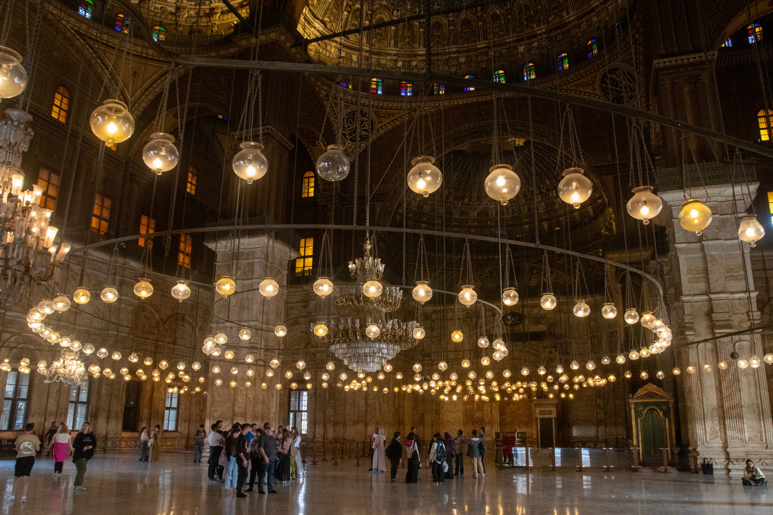 Am frühen Nachmittag düse ich mit einem Uber nach Kairo zur Zitadelle von Saladin, wo es zuerst den Hügel hinauf zur Muhammad-Ali-Moschee geht. Von hier hat man einen tollen Blick über ganz Kairo. Die Pyramiden kann ich leider nicht ausmachen, da es immer noch sehr diesig ist. Wie auch schon in einigen anderen Ländern, möchte jemand ein Foto mit mir. Diesmal ist es eine Gruppe Halbwüchsiger. Oki, warum nicht. Nun aber ab und die Moschee. Mit den vielen Lampen und den verzierten Kuppeln sieht das alles sehr schön aus. Im Innenhof wird gerade alles für eine Hochzeit aufgebaut. Hui, sieht das kitschig aus.