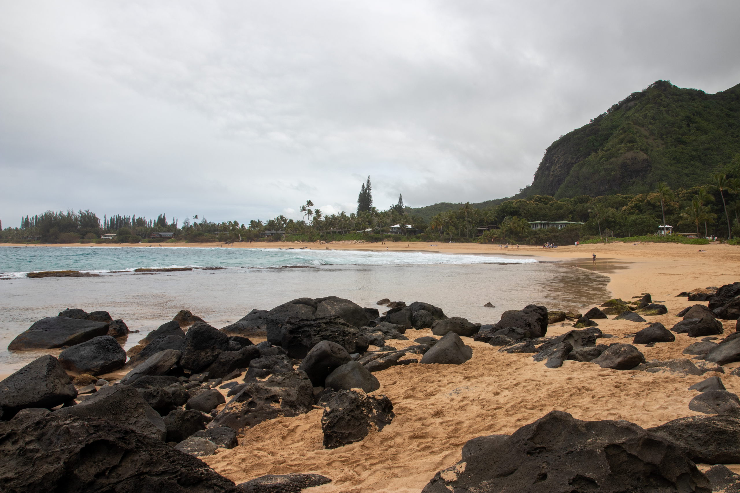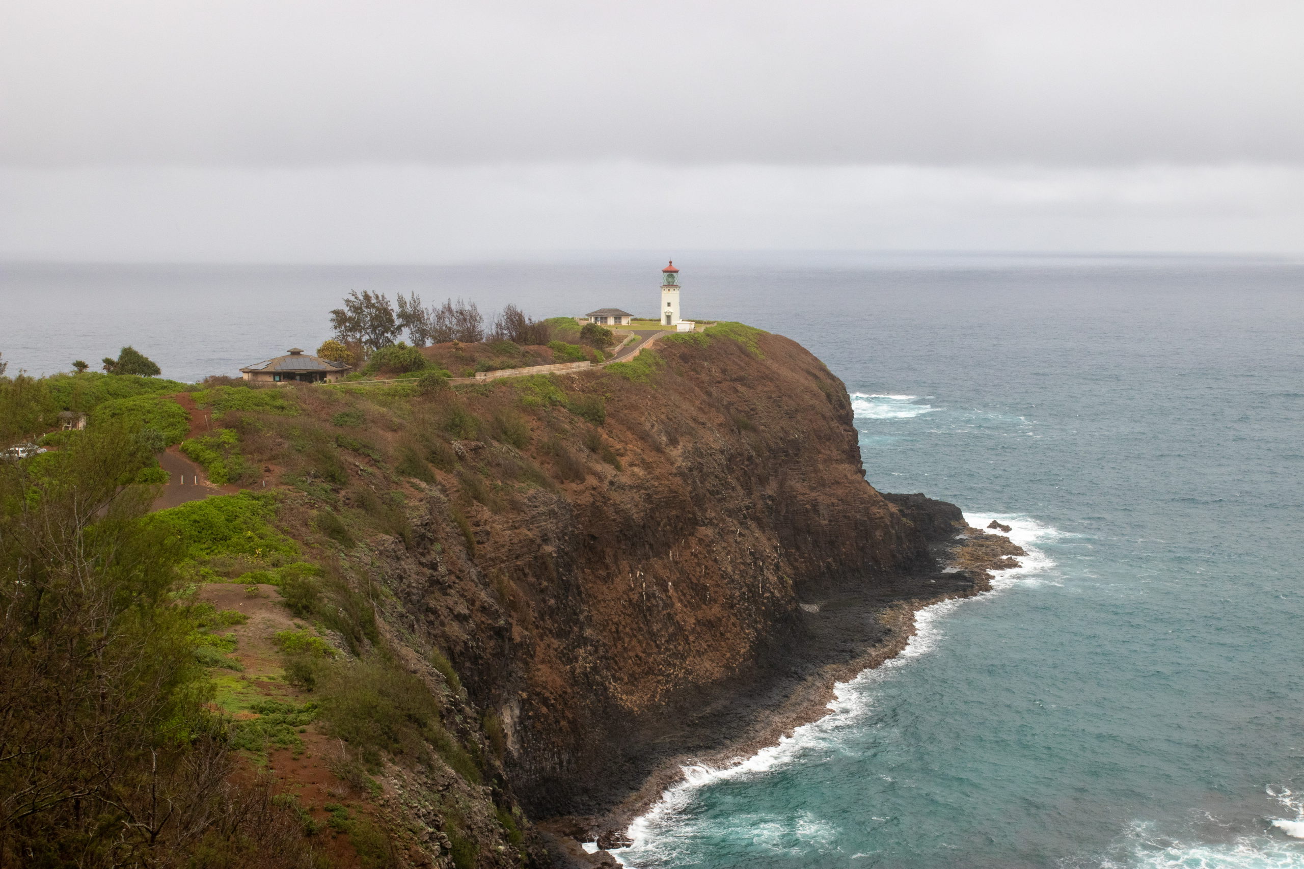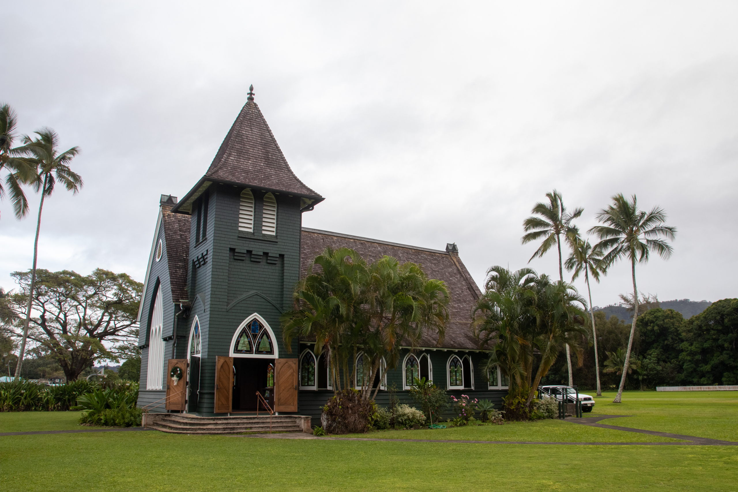 Es geht zum Tunnels Beach. Der Name ist Programm, denn gegenüber dem Strand ist eine Höhle. Diese ist zwar groß, aber dafür ziemlich unspannend. Dann lieber zum Strand und noch ein wenig knipsen. Inzwischen hat es komplett zugezogen und es sieht nach Regen aus. Ich fahre noch ein Stück weiter zum Gate vom Haena State Park, von wo aus man eine zwei- bis dreitägige Wanderung an die Na Pali Küste machen kann, wenn man eines der sehr begrenzten Tickets ergattert. Habe ich aber nicht und so drehe ich wieder um und komme auf der Rückfahrt an der netten Wai’oli Hui’ia Church vorbei. Allerdings ist sie nur von außen zu bestaunen, da drinnen gerade geheiratet wird. Brautpaar, zwei Trauzeugen und ein Pater. Fertig. Ein weiterer kurzer Stop wird noch beim Kilauea Lighthouse eingelegt, das heute leider geschlossen ist. Schade. Eventuell morgen.