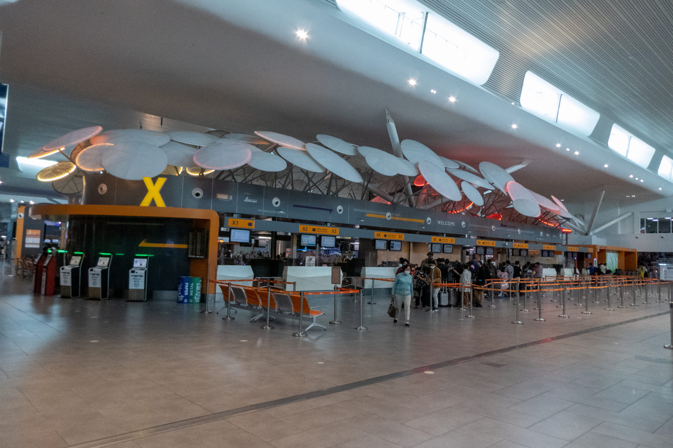 Der “Anschlussflug” geht aber erst in zehn Stunden und der Check-in-Schalter öffnet erst drei Stunden vorher. Also muss ich mit dem gesamten Gepäck im Check-in-Bereich herumlungern. Zum Glück gibt es genug zu tun: Essen, Fotos aussortieren, mit dem Trolly blöd in der Gegend herum fahren und Blogartikel schreiben. Trotzdem zieht es sich, bis der Check-in-Schalter öffnet. Und kaum passt man nicht auf, hat sich auch schon eine lange Schlange gebildet. Es geht flott voran und das Frage-und-Antwortspiel beginnt. Ich muss Unmengen an Dokumenten vorlegen. Jedoch fehlt eines. Grrr. QR-Code gescannt, ausgefüllt und fertig. Denkste, da mein Handgepäck gewogen wird und zu schwer ist. Ich stecke ein paar Akkus in die Hosentaschen und hänge mir die Kamera um. Jetzt passt’s. 🙄 Die nette Dame gibt mir noch den Tipp, die Kamera erst im Flugzeug wieder in den Rucksack zu geben, falls er dazwischen irgendwo gewogen wird. 👍 Das ist zwar nicht der Fall, aber er wird bei einer automatischen Sicherheitskontrolle mit einigen anderen zur weiteren Prüfung aussortiert. Natürlich muss ich warten, bis alle anderen vorher gefilzt werden, aber heute habe ich alle Zeit der Welt. Ach ja, es war natürlich falscher Alarm und keiner inspiziert meinen Rucksack. Nach der automatischen Passkontrolle geht es durch das Shopping Center mit angeschlossenen Gates. Das Boarding verzögert sich, da das Flugzeug Probleme mit den Bremsen hat. Na dann sind wir sicher schneller am Ziel. 😁
