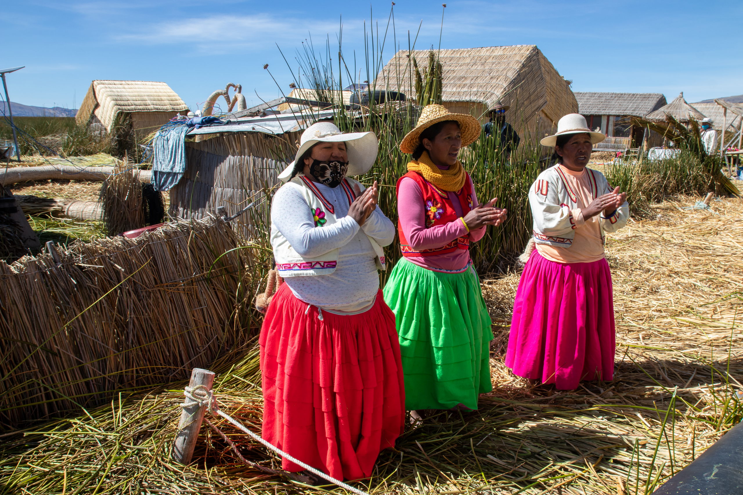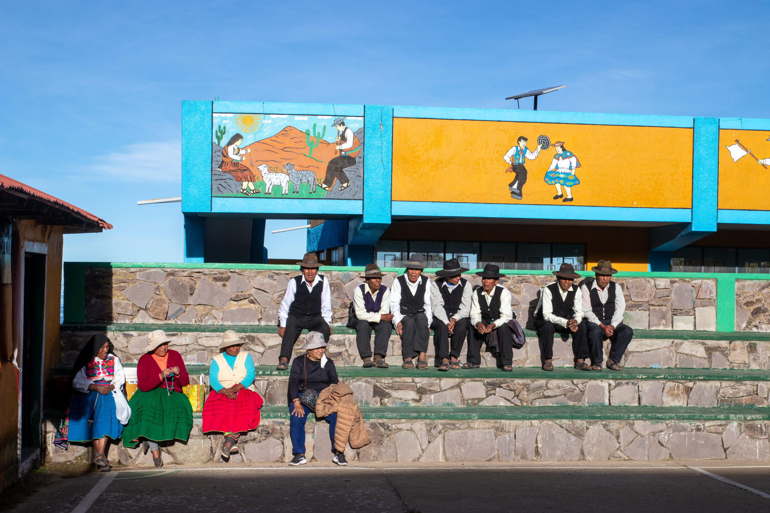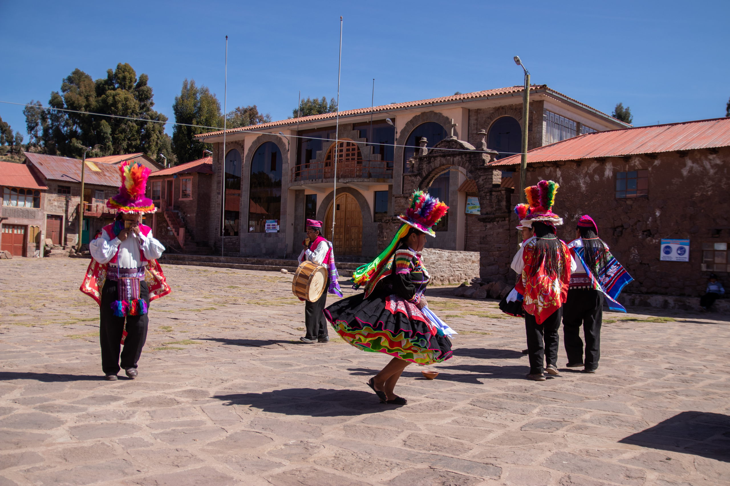 Zum Frühstück gibt es wieder Muña-Tee und Pfannkuchen mit Marmelade. Mjam. Wir verabschieden uns von der Familie und gehen zum Hafen hinunter, von wo wir in knapp einer Stunde zur Insel Taquile übersetzen. Nach einer kurzen Wanderung hinauf zum Hauptplatz sehe ich mich etwas um, bevor von einer Familie ein klassischer Tanz aufgeführt wird. Im Anschluss kann man sich mit den farbenfrohen Hüten und der Familie fotografieren lassen.