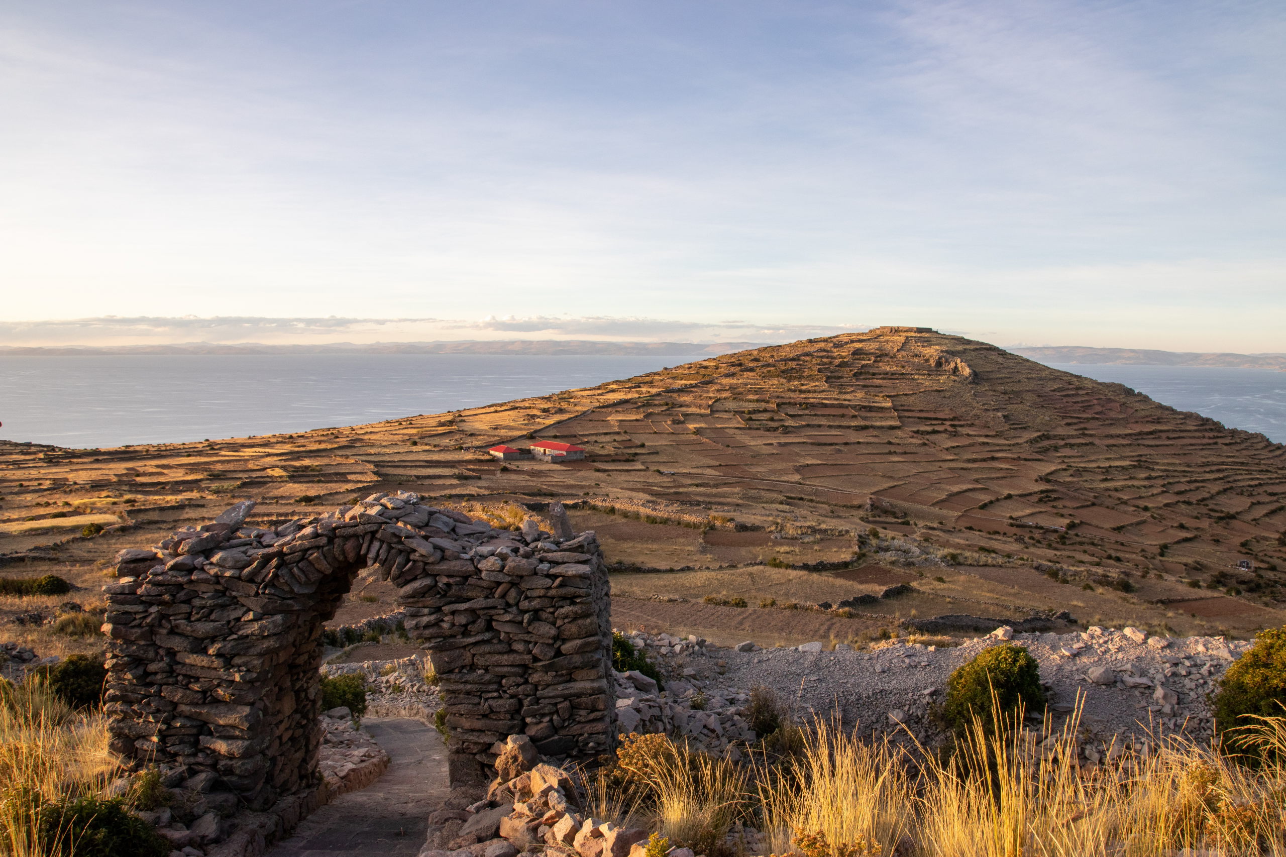 Um drei Uhr machen wir uns auf den Weg zum Treffpunkt, wo ich Jean Luc vom Huayna Potosí wieder treffe. Wie klein doch die Welt unter Reisenden ist. Unser Guide Roger erzählt uns jede Menge über die Kultur der Insel und die Religion der Inka. Gemeinsam gehen wir ein Stück hoch zu einer Abzweigung. Hier kann sich nun jeder entscheiden zu welchem Tempel er gehen möchte um den Sonnenuntergang zu beobachten. Pachamama oder Pachatata. Ich entscheide mich für den höheren der beiden, Pachamama auf 4120 m. Es ist immer noch anstrengend und ich kann nur langsam gehen. Wir beobachten den Sonnenuntergang, die meisten gehen aber schon früh und so bin ich wieder einmal der letzte, der sich das Schauspiel ansieht. Am Sportplatz treffe ich auf die anderen und wir gehen gemeinsam zum Haus, wo das Abendessen schon auf uns wartet.