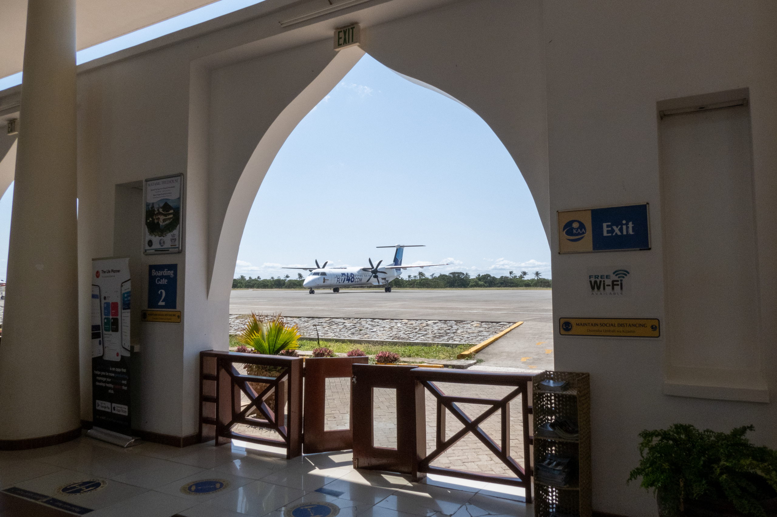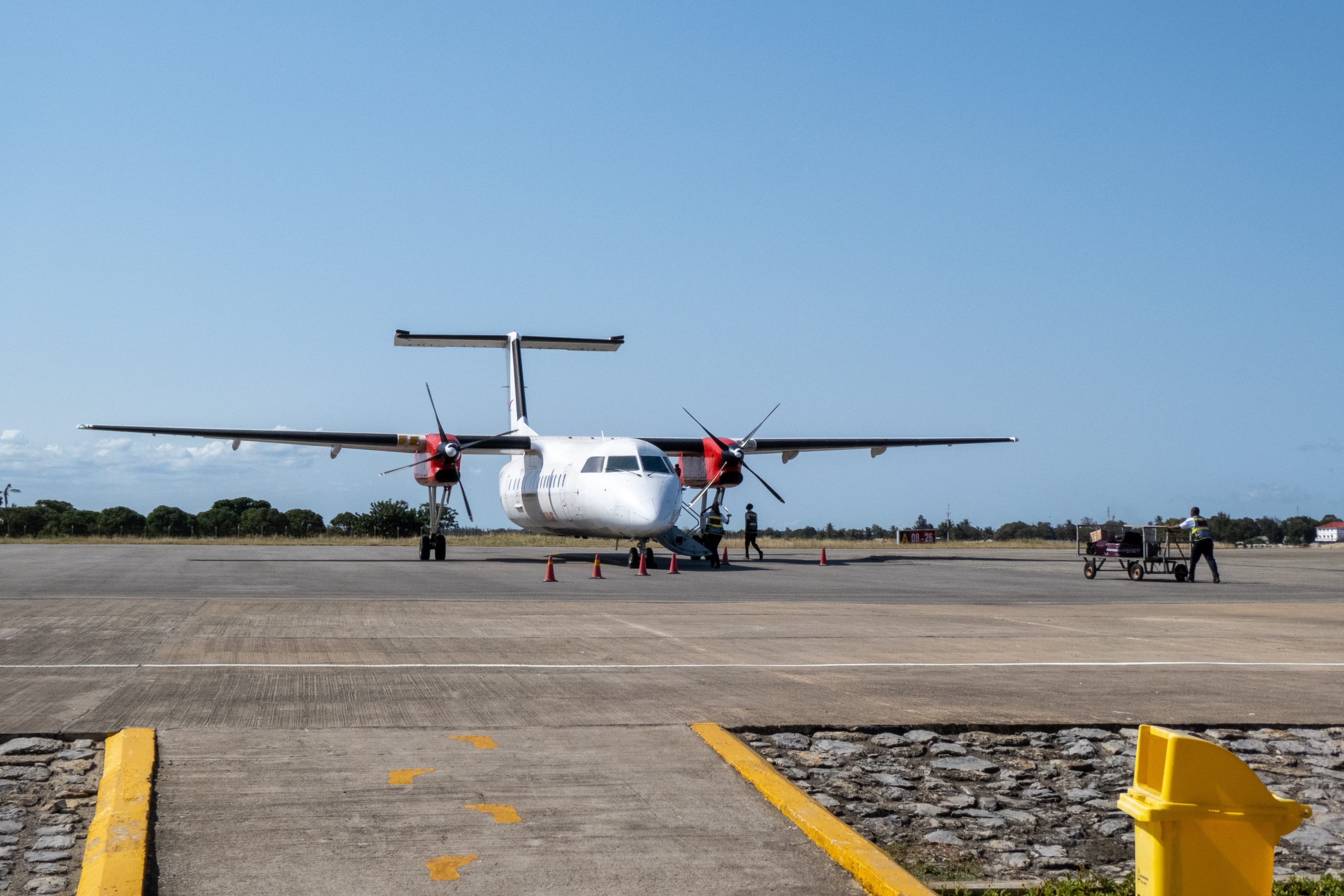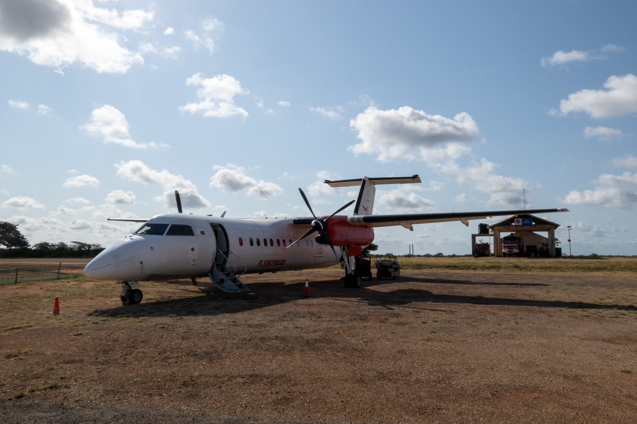 Mit dem Boda Boda geht es in einer knappen halben Stunde zum Malindi International Airport. Dort sind Boda Bodas nicht erlaubt und ich werde an der Einfahrt abgeladen und gehe mit vollem GepĂ€ck zu FuĂ zum Flughafen. Lt. Noah wird das gesamte GepĂ€ck gemeinsam gewogen. FĂŒr alles ĂŒber 20 kg ist zu blechen. Da bin ich definitiv drĂŒber. Also ab in eine Toilette und umziehen. Mit Bergstiefel und dicker Kleidung gehe ich durch den Sicherheitscheck. Jetzt noch die Taschen mit schwerer Elektronik fĂŒllen und ab zum Check-in. Falsche Info. Es wird nur das AufgabegepĂ€ck gewogen. Also umsonst das warme Outfit angelegt. Egal, gegen zwei Uhr sitze ich entspannt in der offenen Abflughalle. Die drei Gates sind Holzgatter auf das Flugfeld. Nachdem ich von einem Powernap munter werde, wird gerade das GepĂ€ck von zwei Leuten vorbei gerollt. Das Flugzeug von Skyward Express trudelt ein und elf Minuten spĂ€ter heben wir ab. So mancher Halt mit dem Matatu hat lĂ€nger gedauert. Es gibt sogar gratis Wasser. Da können sich unsere Airlines noch etwas abschauen. Nach 22 Minuten landen wir am Manda Airport und halten auf einem Schotterfeld.