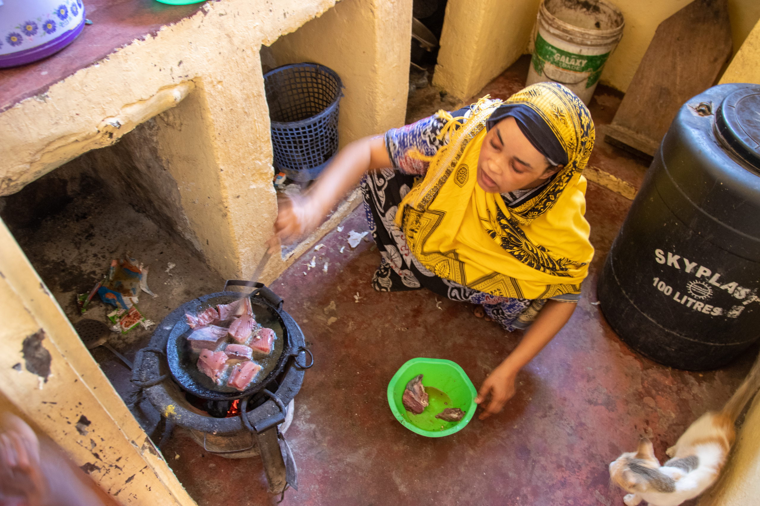Zum FrĂŒhstĂŒck gibt es eine groĂe Auswahl an Optionen. Ich entscheide mich fĂŒr den French Toast, der vorzĂŒglich schmeckt. Arnold hat’s echt drauf. AnschlieĂend gönne ich meinem staubigen Zelt und mir eine Dusche, bevor ich noch etwas am Laptop werke. Hunger. Gegen ein Uhr geht es in die Stadt auf der Suche nach einem einheimischen Restaurant. Ein Typ quatscht mich an. Er ist Fischer und bietet mir an, mit seiner Familie zu essen. Hmmm, das war eigentlich nicht der Plan, aber es könnte ganz nett werden. Wir gehen ins angrenzende Dorf Kashmir, wo ich Tamarindensaft und frisch gebratenem Thunfisch bekomme. Umringt von sechs Katzen, die schon auf die Reste vom Fisch geiern, sitzen wir am Boden, quatschen und essen. Die Essensreste am Boden werden zuerst von den Katzen und dann von der Hausherrin beseitigt. Was von beiden ĂŒbersehen wurde, wird von Ameisen abtransportiert. So ist nach einiger Zeit wieder alles schön sauber. đ Er bringt mich noch zurĂŒck und wir verabschieden uns.
