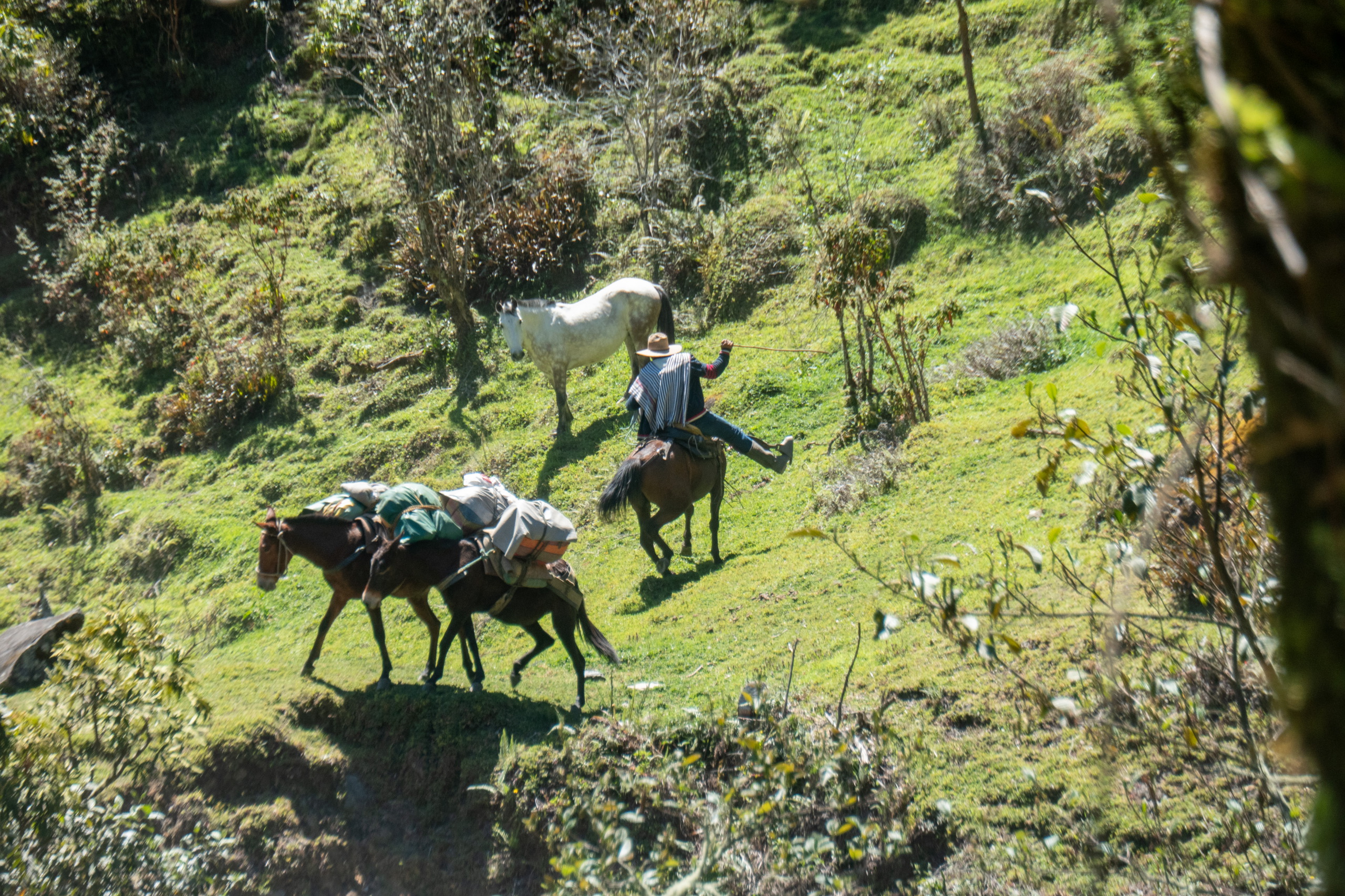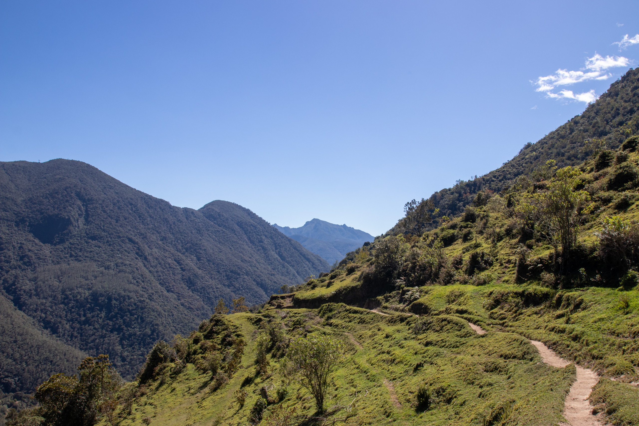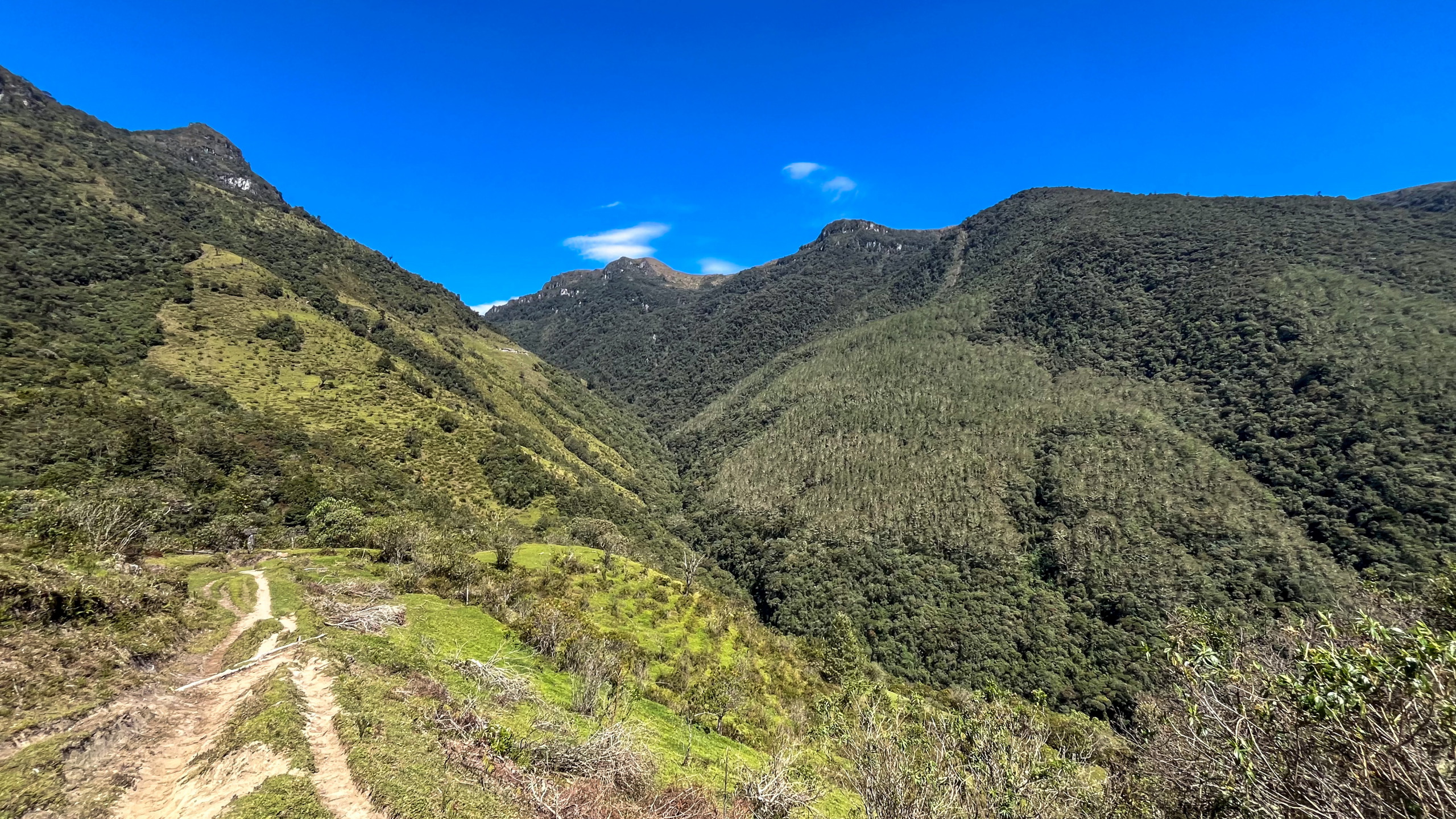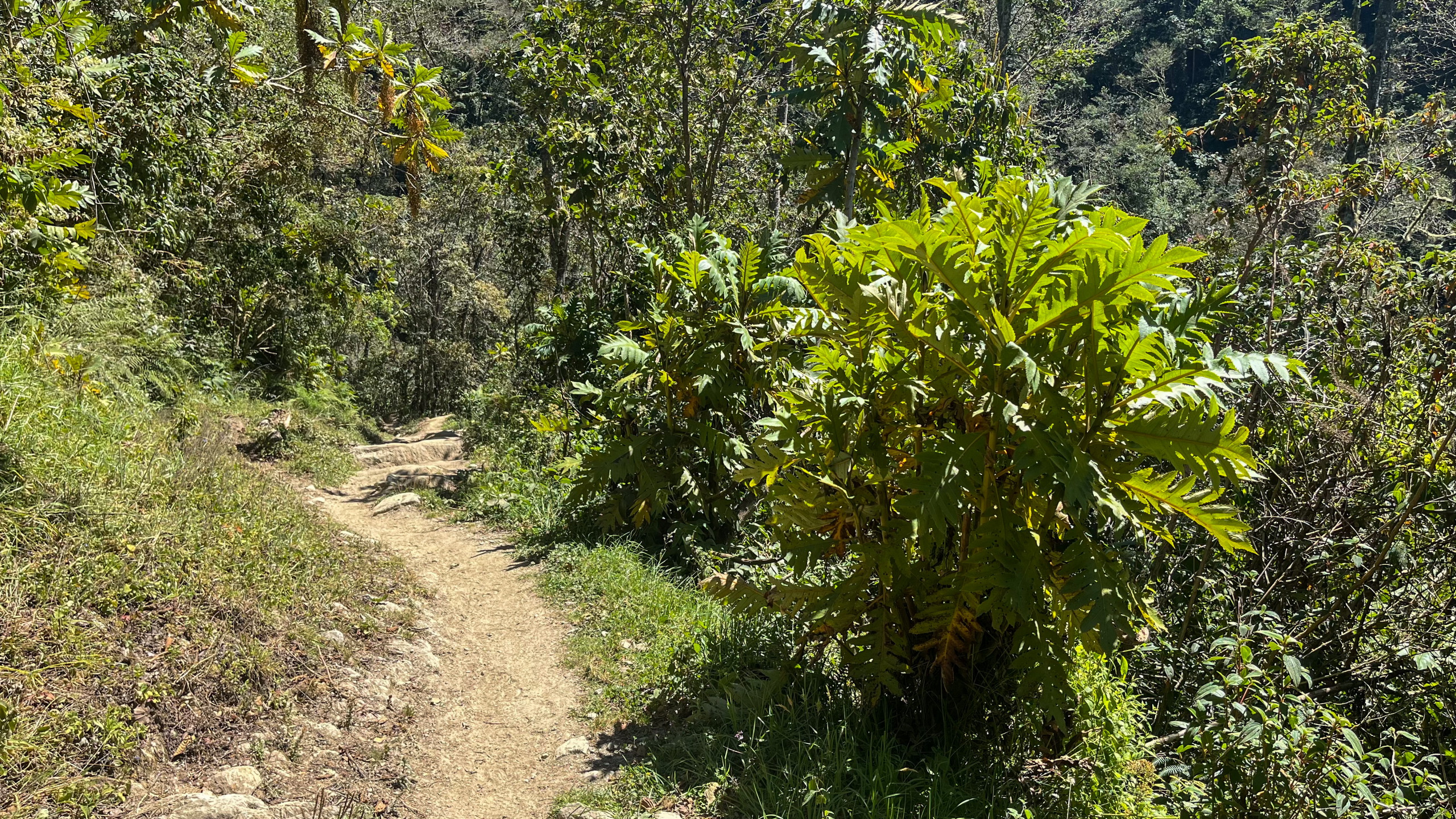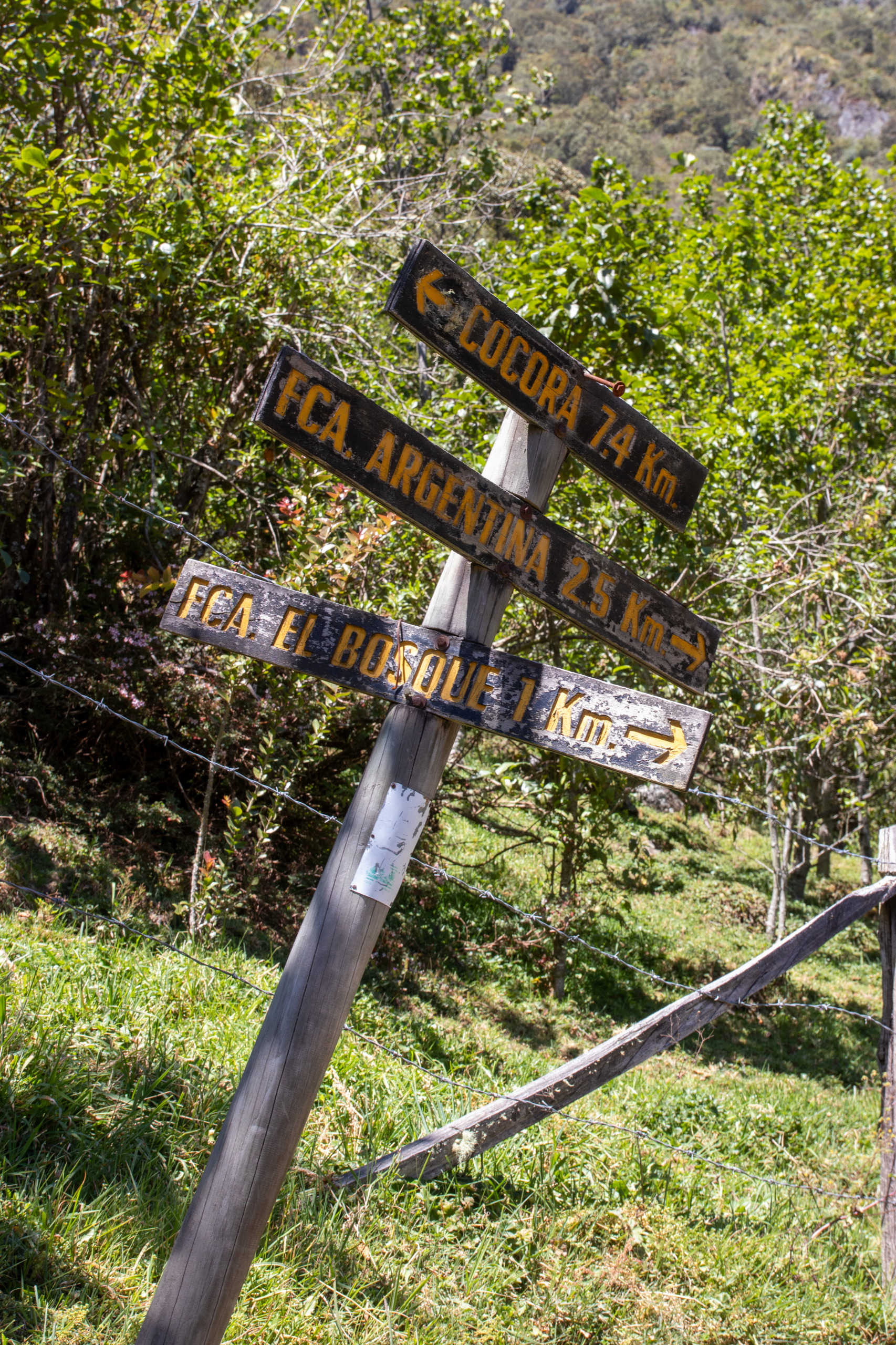 Kaum aus dem schattigen Wald raus, knallt die Sonne ordentlich runter und es ist ziemlich warm. Ab 3200 m beginne ich die Höhe zu merken und es wird noch anstrengender. OK, ich habe auch schon 1000 Höhenmeter in den Beinen. Obwohl die Finca mit nur mehr 2,5 Kilometer angeschrieben ist, zieht sich das Auf und Ab gewaltig. Eine Pause muss her. Die mitgebrachten Empanadas mit Teig aus Mais sind nicht schlecht, aber der Nussmix mit gerösteten Maiskörnern ist der Oberhammer und knallt voll rein.