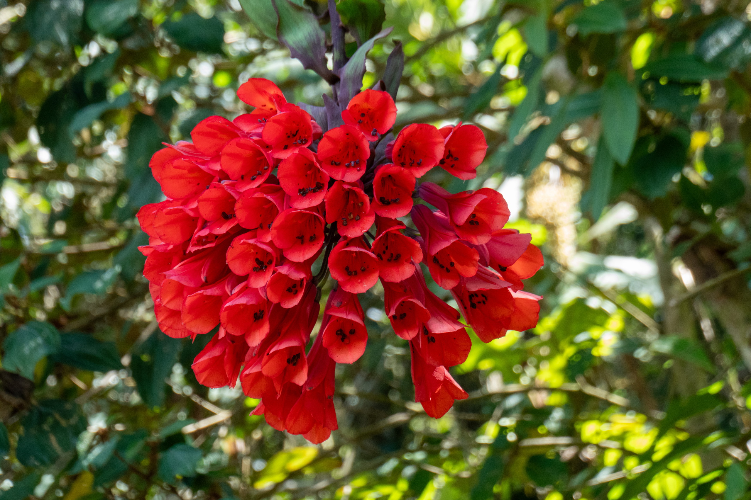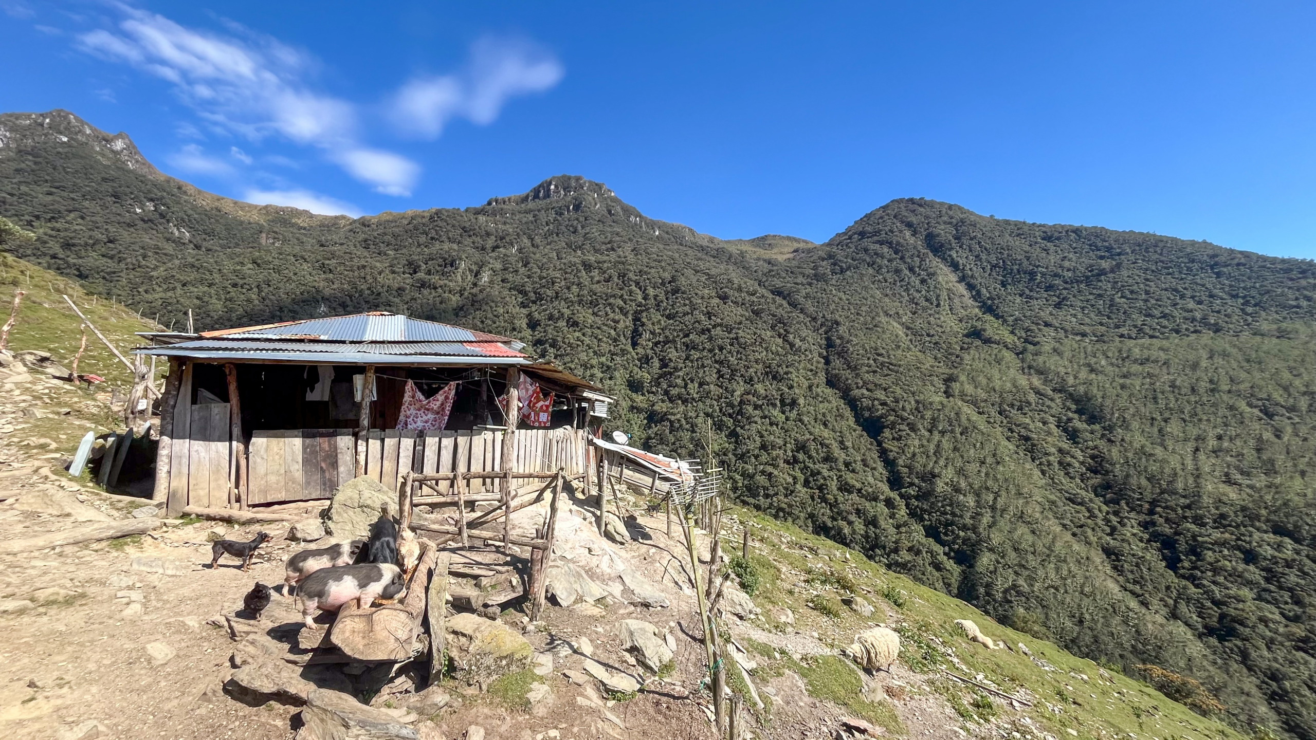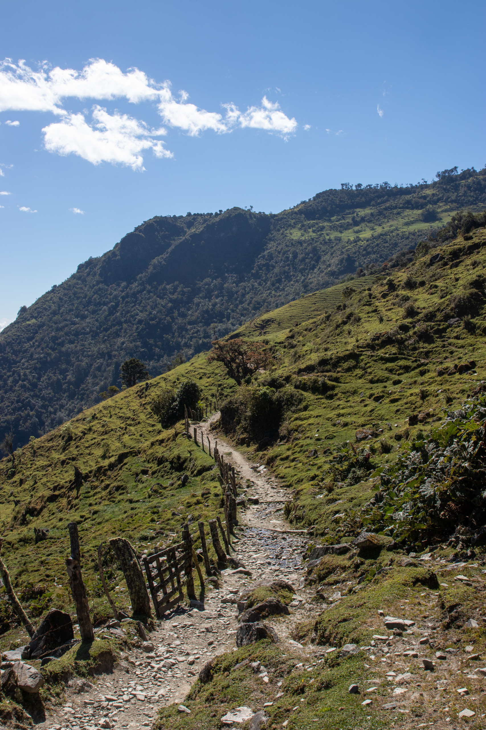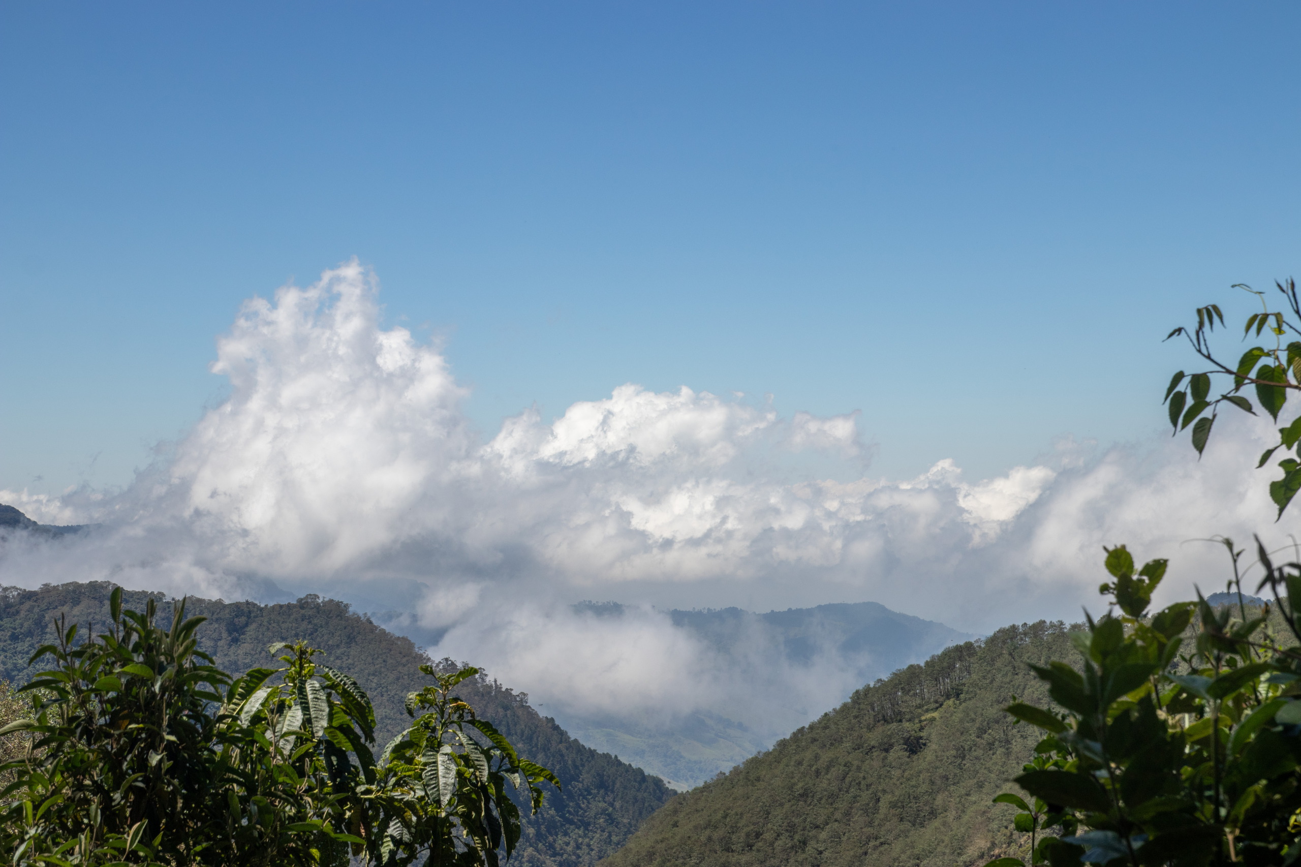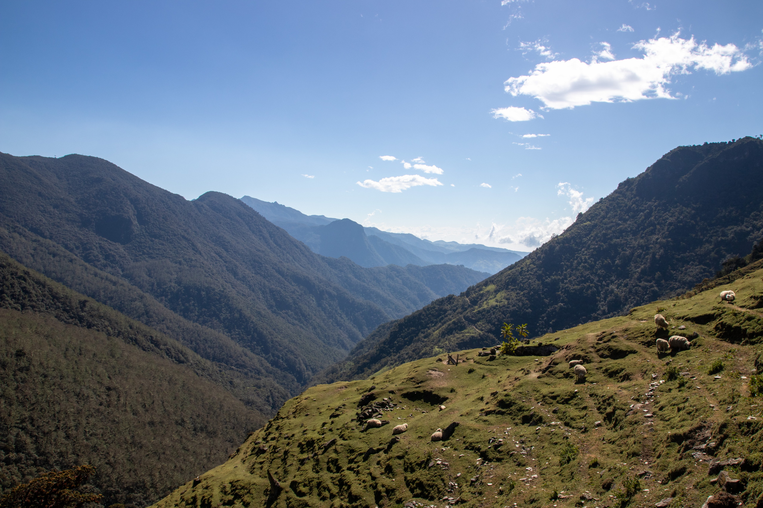 Kaum aus dem schattigen Wald raus, knallt die Sonne ordentlich runter und es ist ziemlich warm. Ab 3200 m beginne ich die Höhe zu merken und es wird noch anstrengender. OK, ich habe auch schon 1000 Höhenmeter in den Beinen. Obwohl die Finca mit nur mehr 2,5 Kilometer angeschrieben ist, zieht sich das Auf und Ab gewaltig. Eine Pause muss her. Die mitgebrachten Empanadas mit Teig aus Mais sind nicht schlecht, aber der Nussmix mit gerösteten Maiskörnern ist der Oberhammer und knallt voll rein.