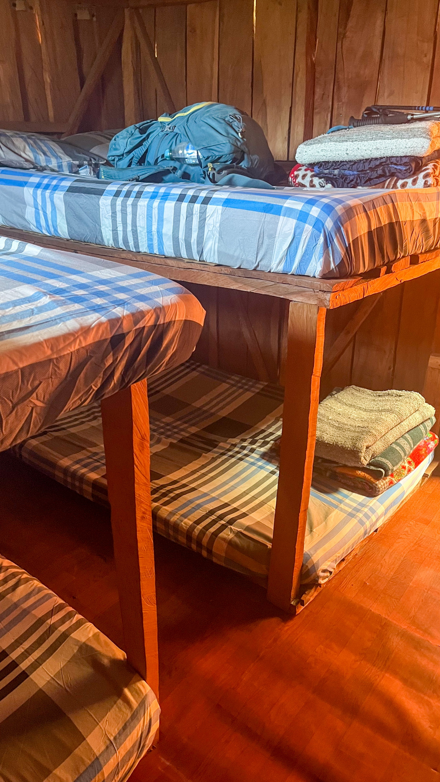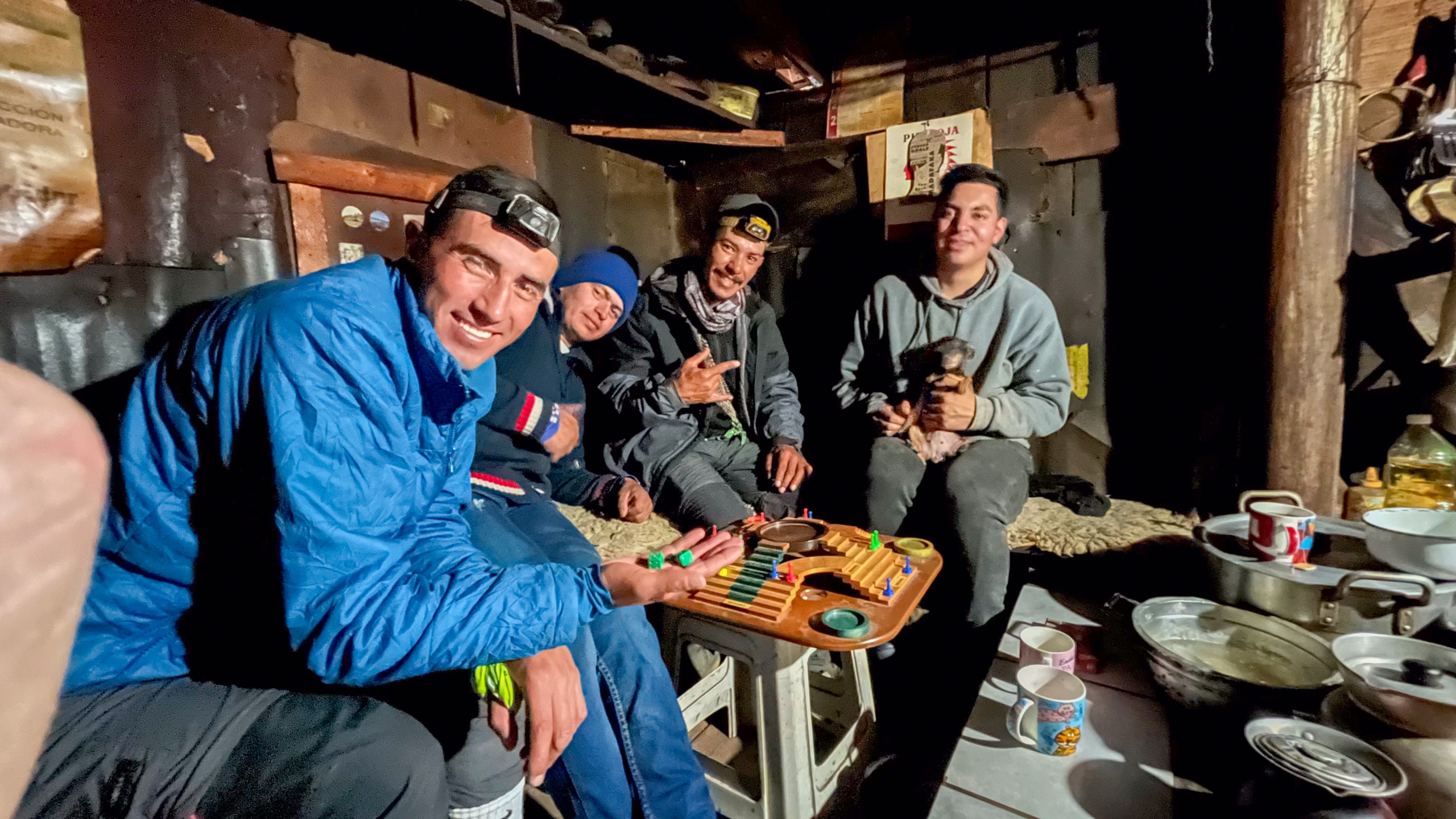 Gegen acht Uhr gibt es Abendessen, das, wie die Finca selbst, sehr basic ausfällt. Zwar schmeckt es sehr gut, aber satt werde ich davon nicht. Da die meisten früh ins Bett gehen, setze ich mich noch zu den Guides in die warme Küche. Sie spielen Mensch ärgere dich nicht, allerdings mit einem komplett anderen “Brett”. Joe gesellt sich dazu und wir quatschen bis es um neun Uhr in die Heia geht. Ein Stockbett, das eher für zwei gedacht ist. Supi.