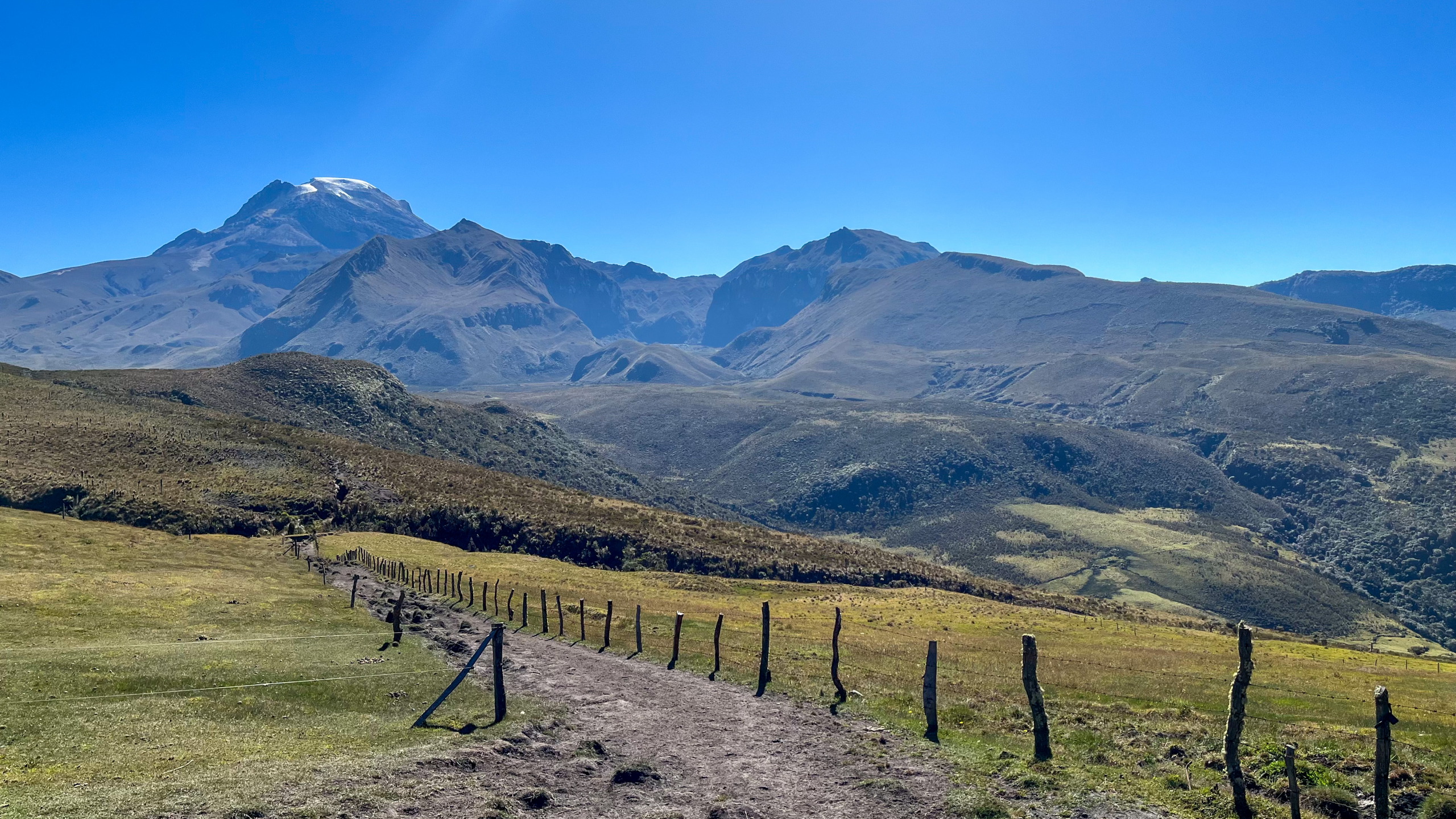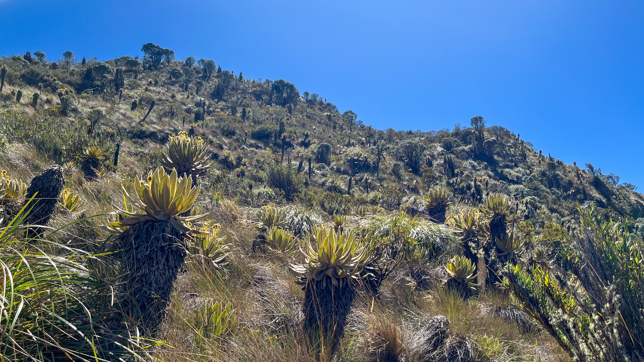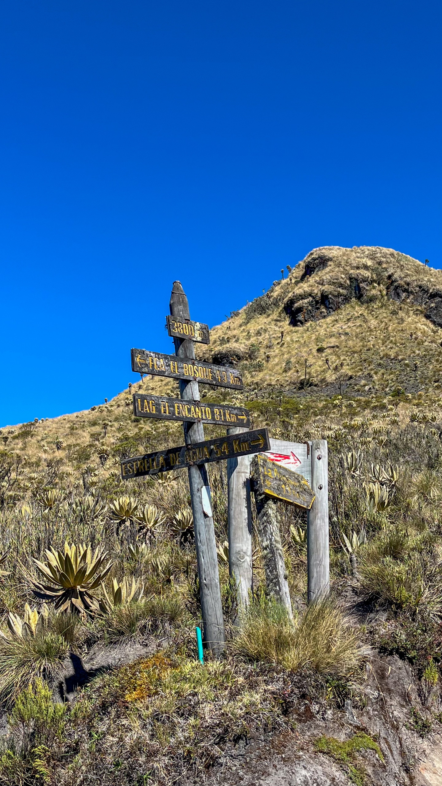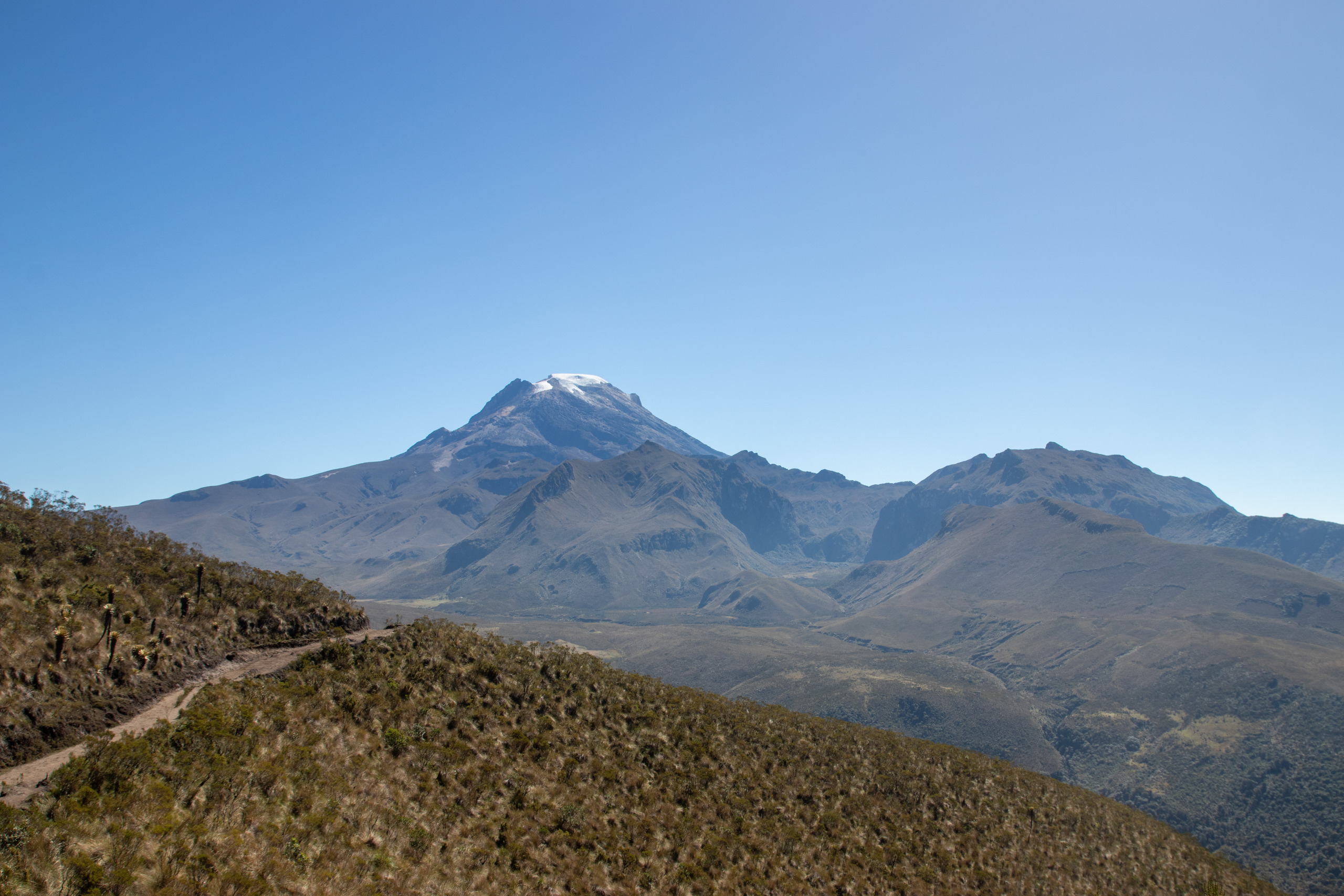 Nach einer tollen Nacht im Zelt stehe ich um sieben Uhr auf, packe alles zusammen und gehe frühstücken. Ich quatsche mit einem Mädchen aus Polen, das nun in Zürich lebt. Sie hat Probleme mit der Höhe und ist nicht bereits gestern mit dem Rest der Gruppe um elf Uhr am Abend zum Gipfel des Nevado del Tolima aufgebrochen. Ein Bursche aus ihrer Gruppe kommt samt Guide zurück. Er musste auf 4800 m abbrechen, da ihm die Luft ausging. Kein Wunder, denn er ist gleich schlecht akklimatisiert wie ich und von hier aus sind es 1600 Hm bis zum Gipfel. Ich quatsche noch eine Weile mit ihm, verabschiede mich von den Leuten aus Alaska und Patricia und breche bei wiederum schönstem Wetter auf. Am kurzen Weg zur Finca Primavera kommt mir tatsächlich Hernan mit seiner Gruppe entgegen. Er gibt mir noch einen Tipp für Cartagena, bevor ich weitergehe. 👍 Nach der Finca Primavera geht es immer leicht bergauf und man hat freie Sicht auf den Nevado del Tolima. Nice.