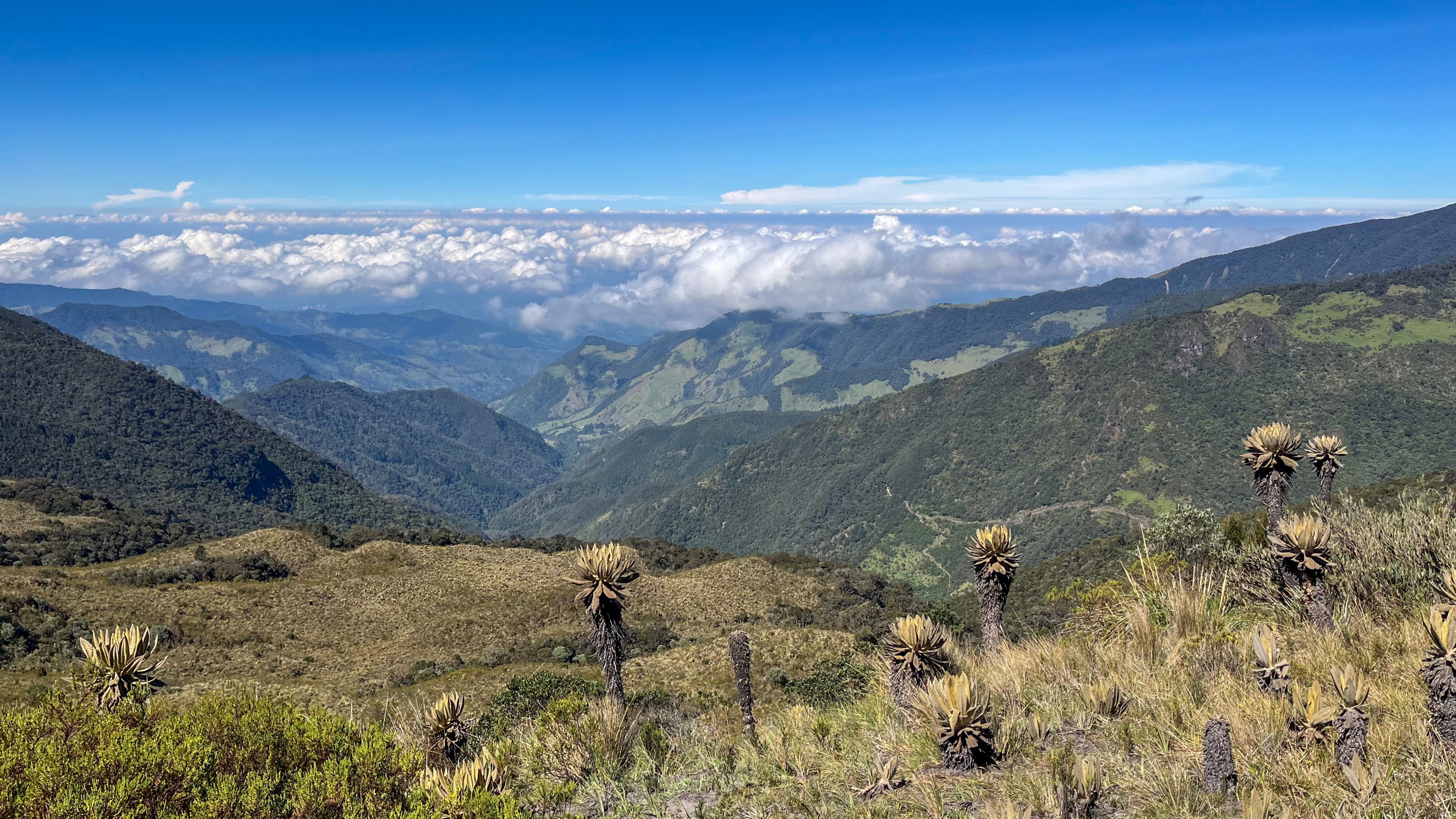 Nachdem ich ein steiles, steiniges Stück hinunter gegangen bin, sehe ich wieder einmal auf der Karte nach. Mist, Abzweigung verpasst. Auf direkter Linie einen steilen Hang hinauf kann ich so etwas wie einen Weg ausmachen, weshalb ich quer durchs Gemüse aufsteige. Der vermeintliche Weg ist zwar nur ein ausgetrockneter Wasserlauf, aber trotzdem einfacher zu gehen als durch das dichte Gestrüpp. Trotzdem ist es wieder sehr kräfteraubend. Zwar kann ich noch immer keinen Weg ausmachen, aber ich habe vorhin Stimmen aus dieser Richtung gehört. Oben angekommen öffnet sich der Blick zurück zum Paramillo de Quindío und zum Nevado del Tolima. Zeit für eine Pause. Ich entscheide, erst morgen abzureisen und mir heute noch einen gemütlichen Abend zu machen. Cool, hier gibt es Empfang. Meine Unterkunft ist leider nicht mehr frei, weshalb ich ein Zimmer direkt im Zentrum buche. Dann kann ich meinen großen Rucksack heute holen und muss morgen nicht mit beiden hoch latschen. 😁