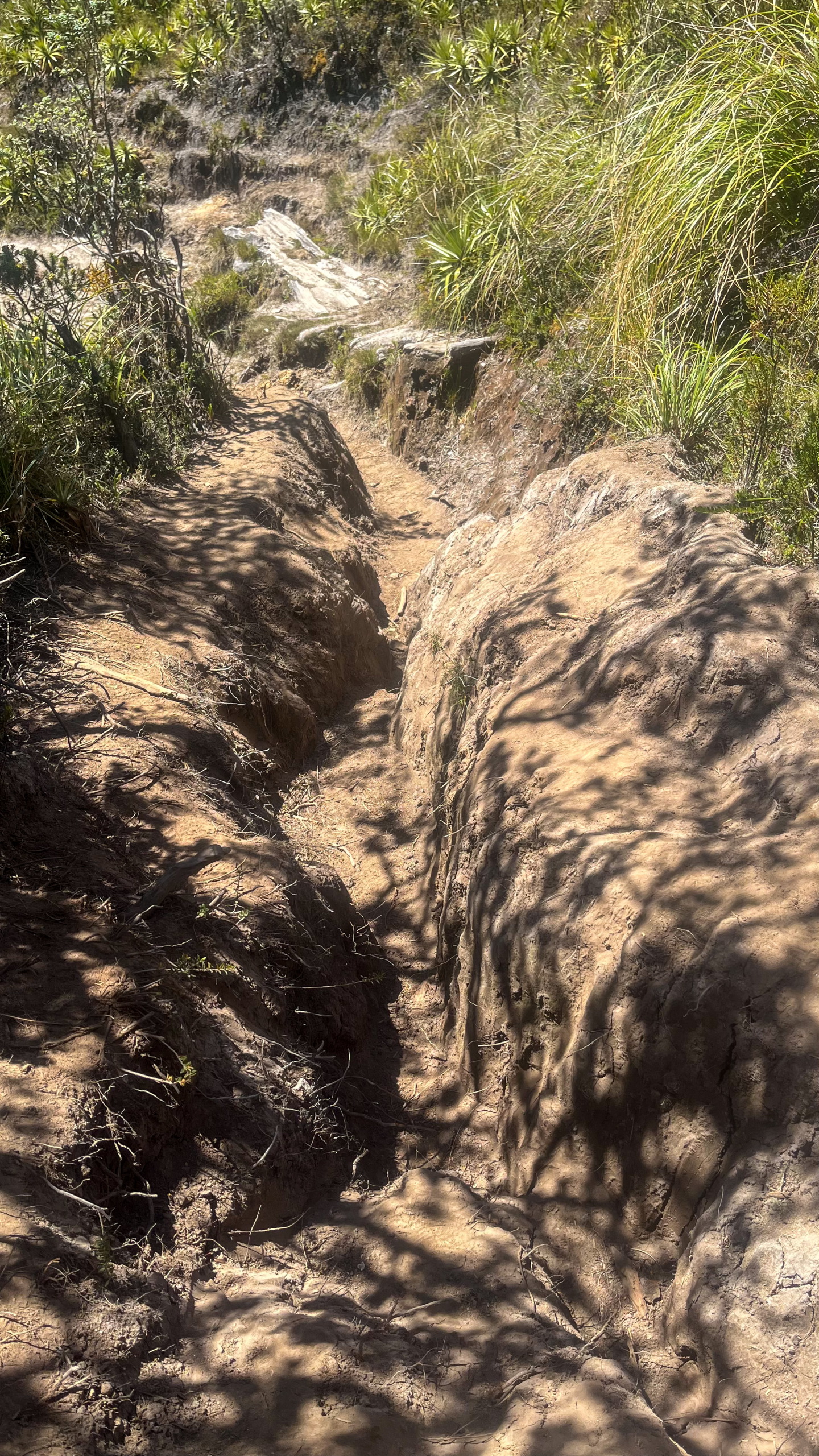 Endlich treffe ich auf den anderen Weg, der hauptsächlich bergab führt. Gut so. An einem Bach ist ein direkter Weg zur Finca Primavera angeschrieben, allerdings nicht auf meiner Karte eingezeichnet. Grrrr. Zumindest beginnt nun der schattige Wald, durch den es unterschiedlich steil hinunter geht.