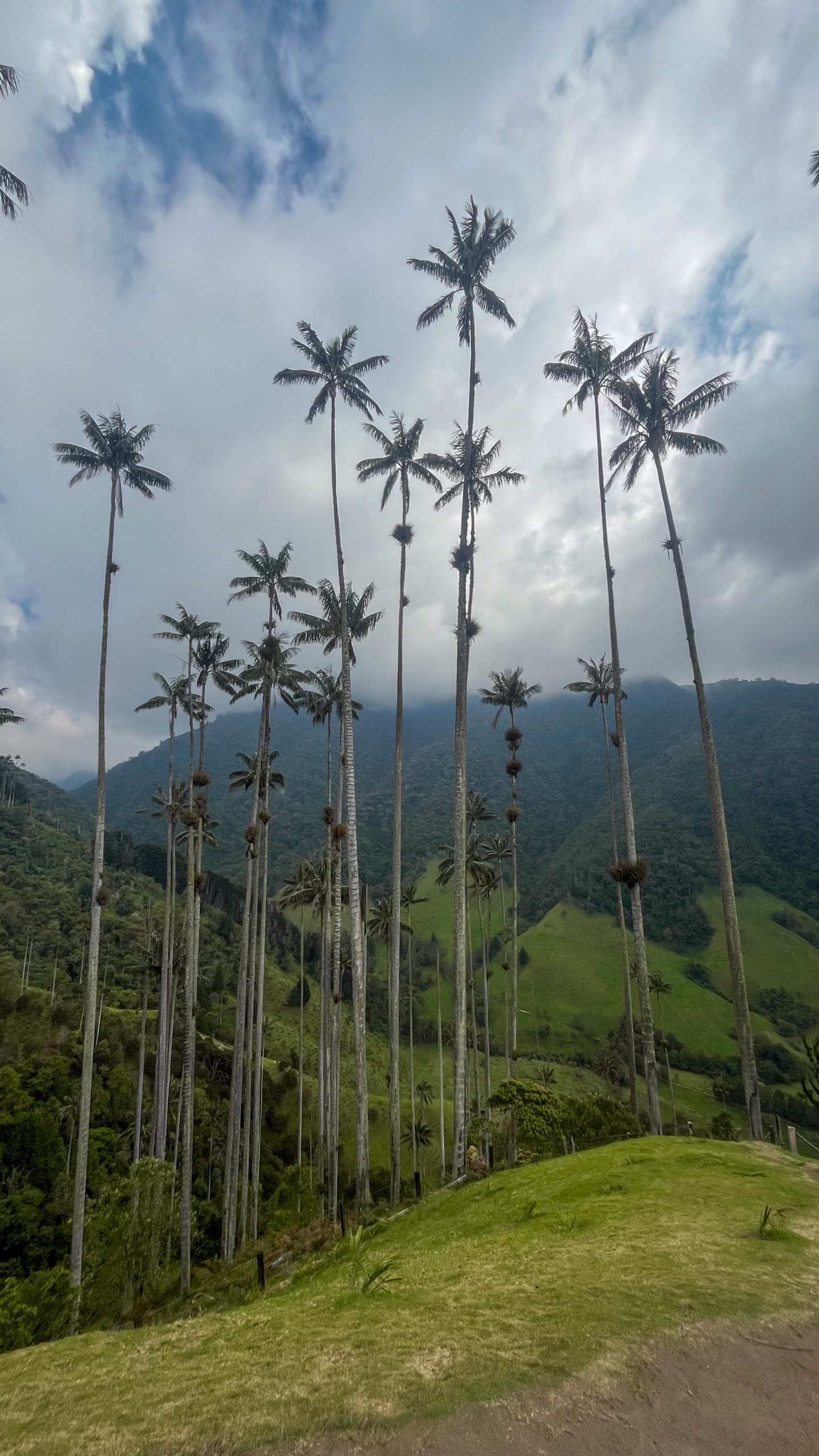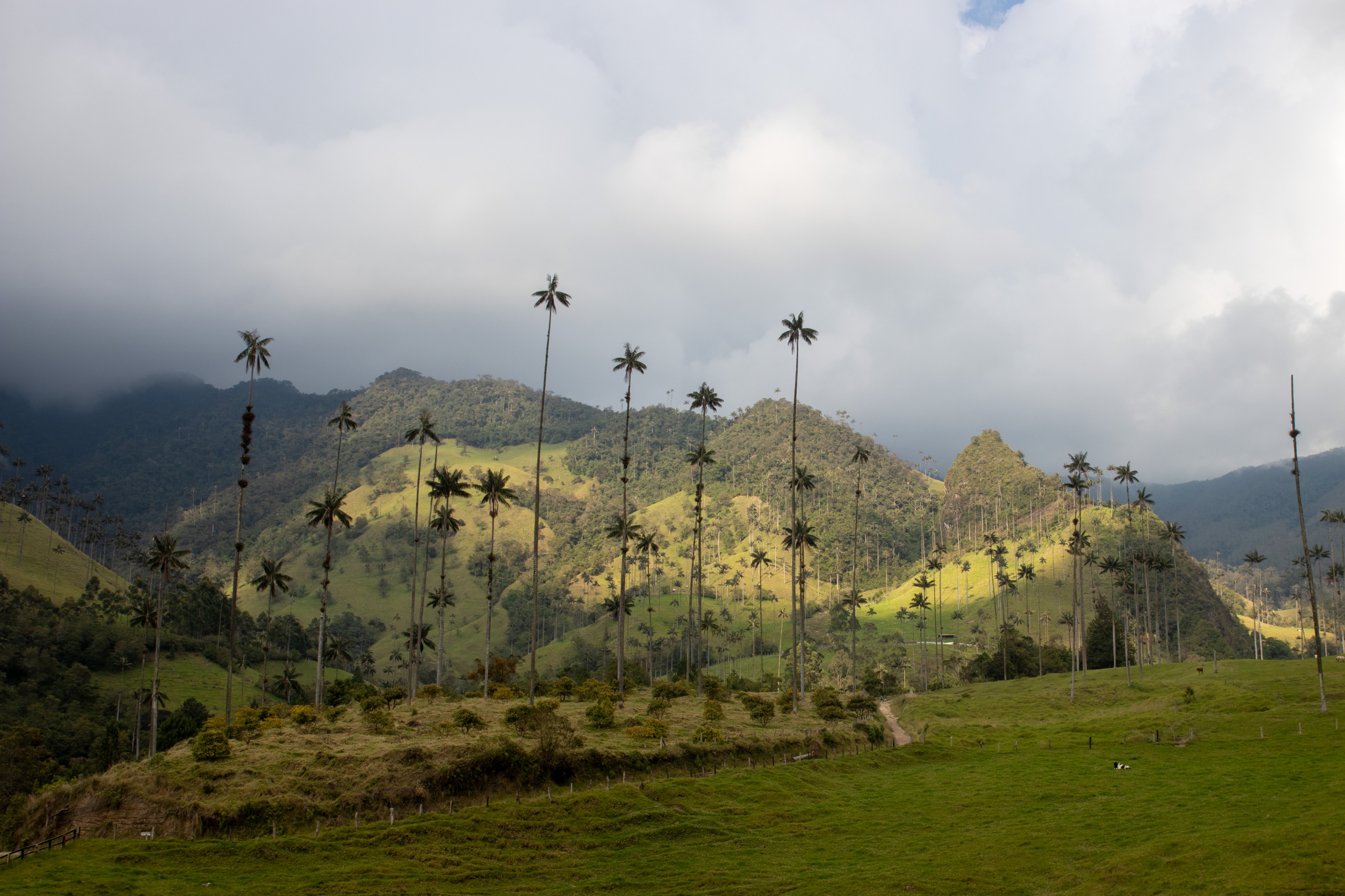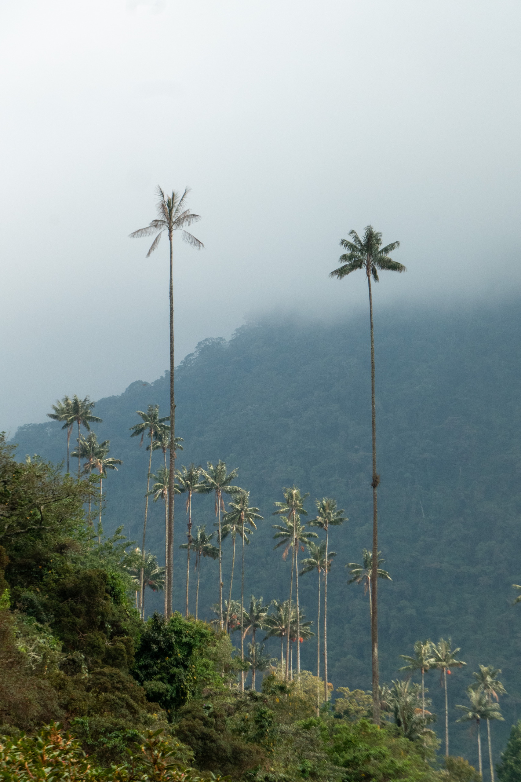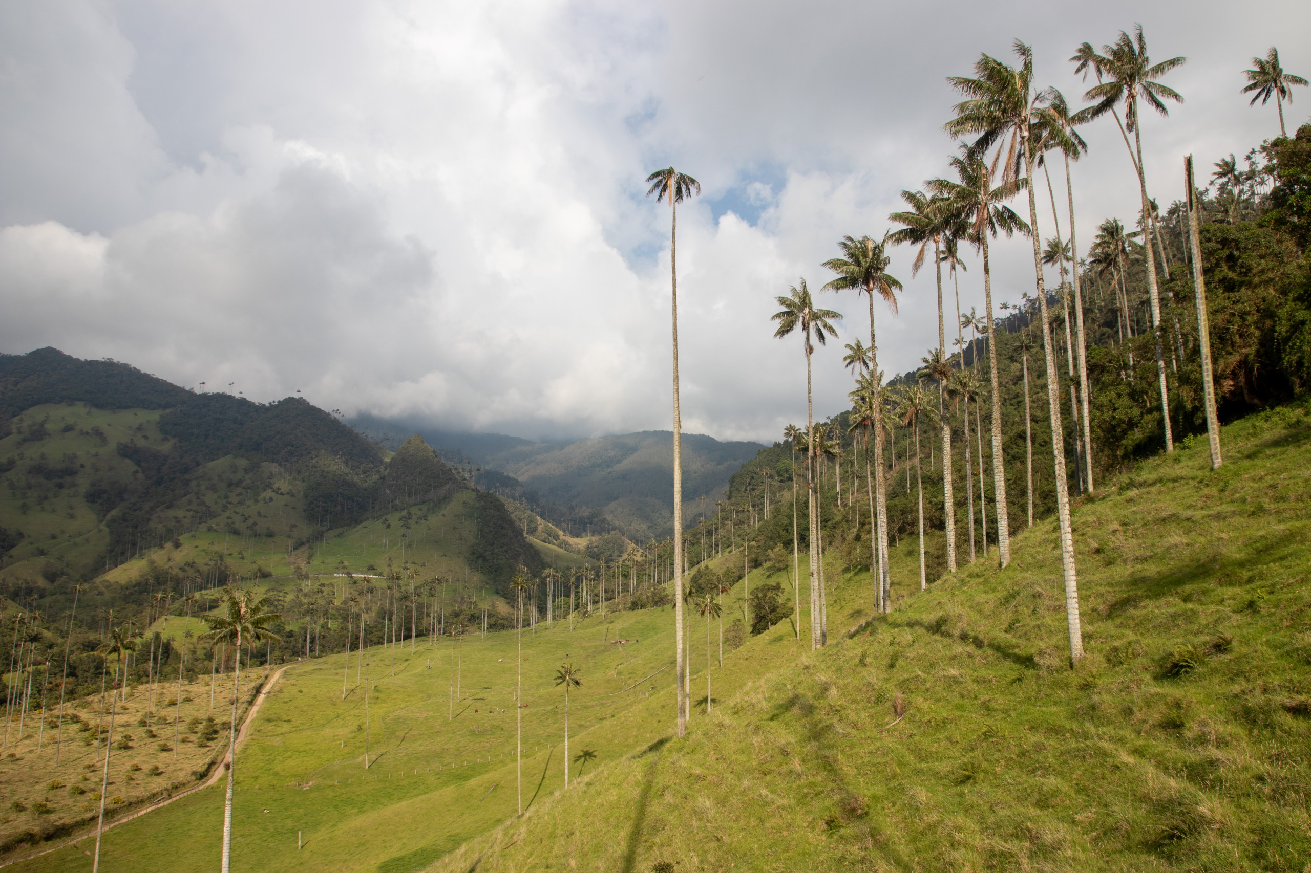 Ich komme zu einer Abzweigung, mein geplanter Weg ist jedoch gesperrt und die Alternative geht noch einmal 200 Hm hoch. Alter, muss das jetzt noch sein? Oben bei einem netten Haus angekommen geht es eine Straße entlang. Plötzlich rieche ich Kiefern? Ich blicke auf und tatsächlich stehe ich in einem Kiefernwald. Da war wohl jemandem langweilig. Weiter geht der öde Straßenhatscher, bis ich zu einem Schranken komme. Wenn ich weiter will, sind 20000 COP fällig. Tja, da wäre ein Schild bei der Abzweigung nett gewesen. Der Typ meint, dass das nicht geht, da es nicht sein Grundstück ist. Jaja, genau. Ich bekomme ein Armband und marschiere weiter bergab, bis ich den Bosque de Palmas erreiche. Die riesigen Wachspalmen, die höchsten Palmen der Welt, sehen schon spektakulär aus, wenn auch das Gelände eher zu einem Insta-Spot umfunktioniert wurde.