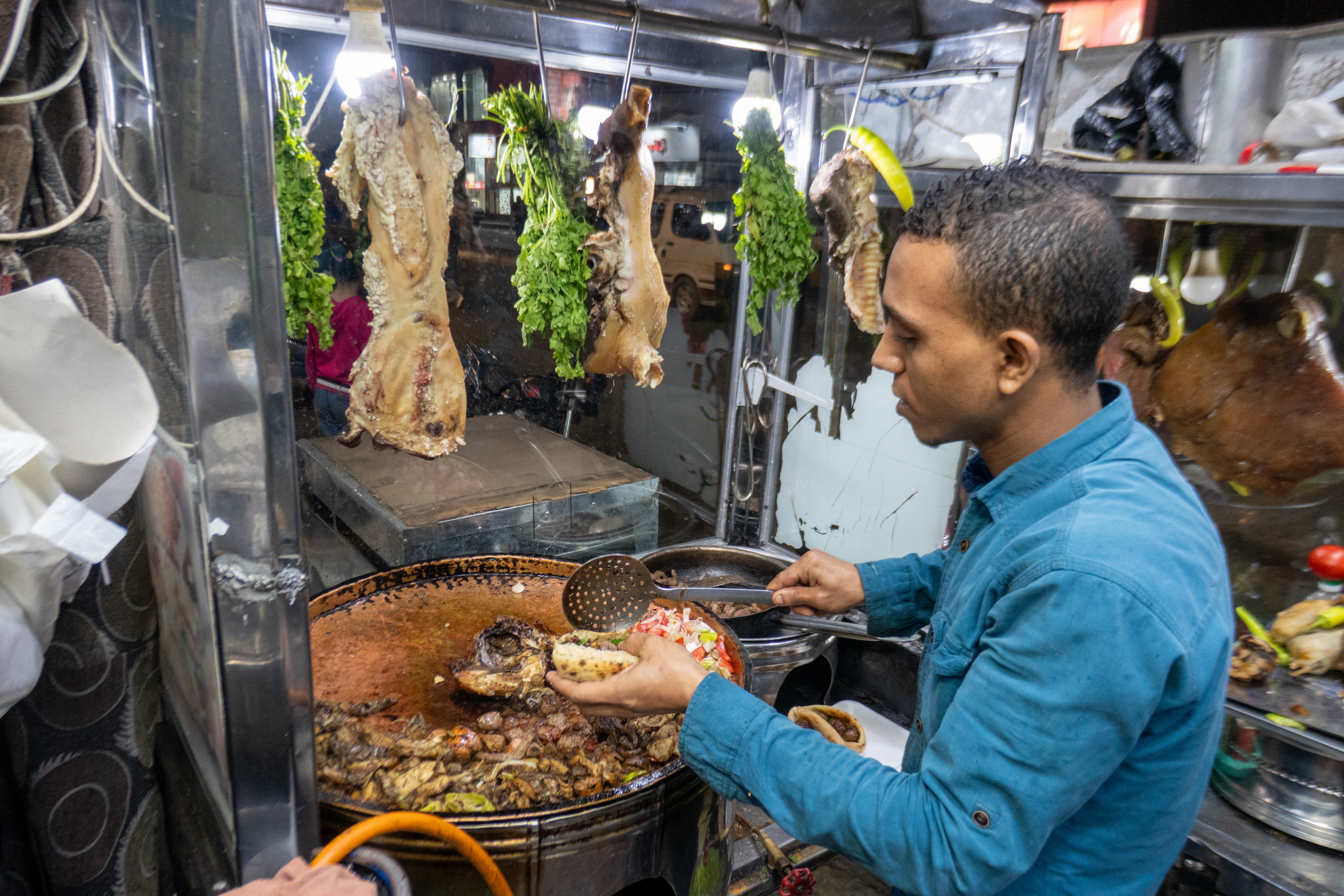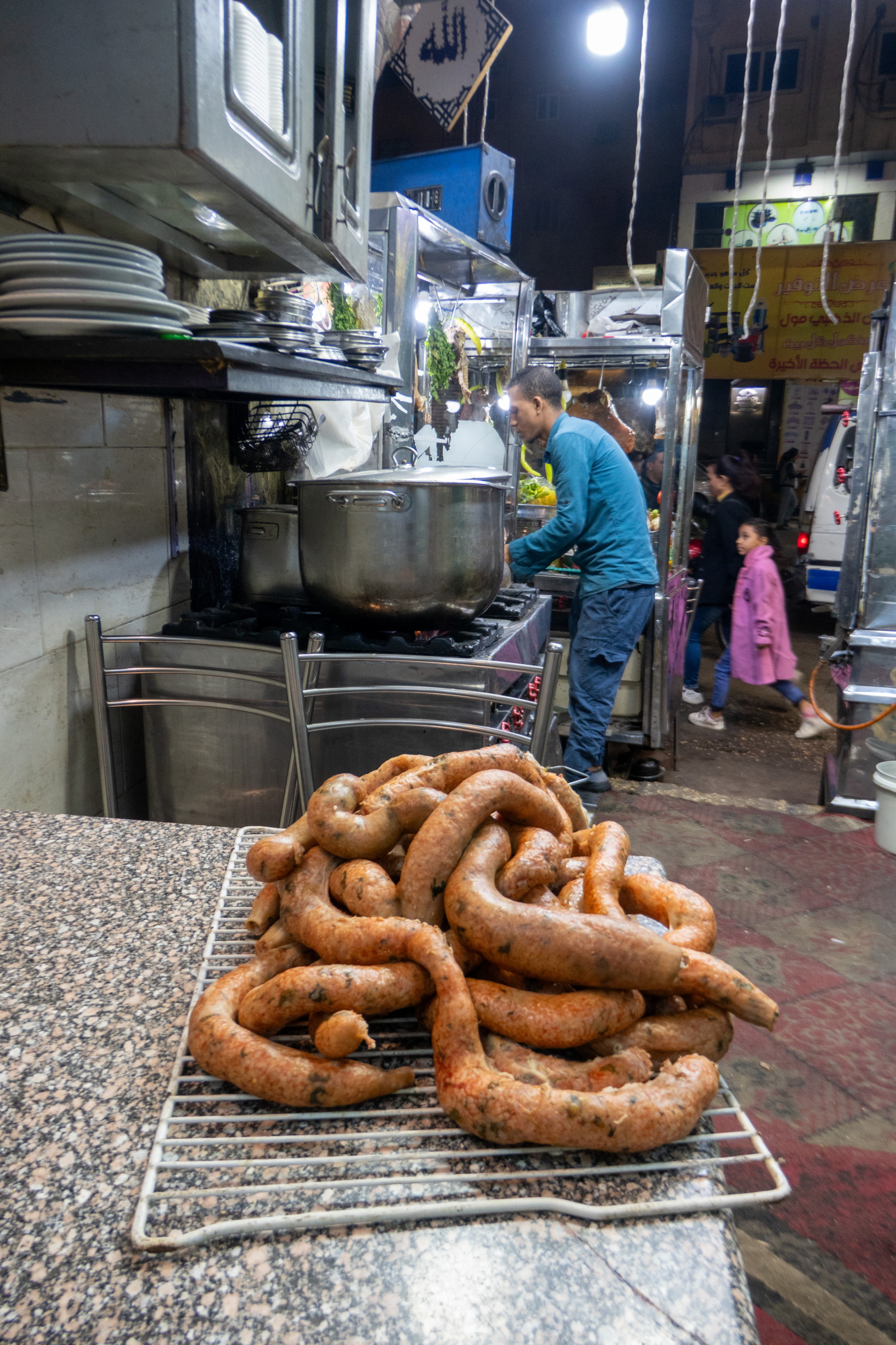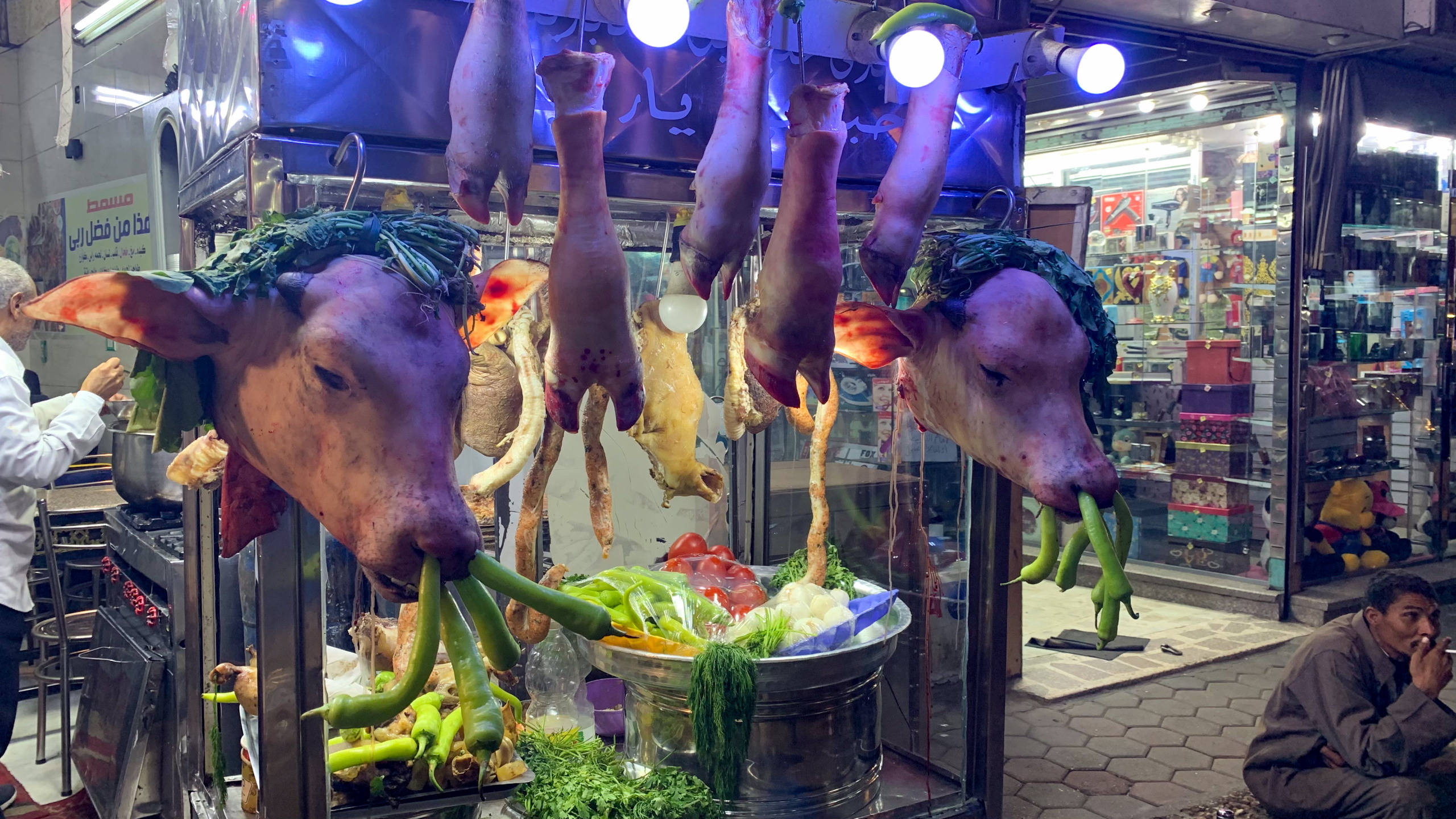 Nächster Halt: Kuhkopf im Fladenbrot. Es schmeckt nicht schlecht, wenn auch etwas Salz fehlt. Das ist hier aber oft so. Wenn man will, kann man ja nachsalzen. Etwas weiter entdecke ich in einer Seitengasse einen kleinen Stand mit Falafel. Für unschlagbare EGP 5 vertickt der sympathische Mann sein köstliches Ful Falafel mit Paprikaschote. Wow, das gibt Trinkgeld. Am Weg zurück treffe ich den Holländer von gestern. Und das in einer Millionenstadt. Unglaublich. Kurz darauf sehe ich einen winzigen Laden, der Alkohol verkauft. Klar, dass ich mir das genauer ansehe. Ich frage nach ägyptischem Bier und werde “fachmännisch” beraten. Stella, Heineken und Sakara. OK, Sakara ist definitiv von hier. Gekauft. Da gestern jemand am Nebentisch aus einer mit Alufolie umwickelten Dose getrunken hat und ich gelesen habe, dass es von manchen Leuten als Provokation aufgefasst werden kann, wenn jemand in der Öffentlichkeit Alkohol trinkt, frage ich lieber nach, wie das hier in Luxor ist. “Hmmm!”, meint der Verkäufer. Ok, ich kenne mich aus. Dann trinke ich es lieber im Hotelzimmer.