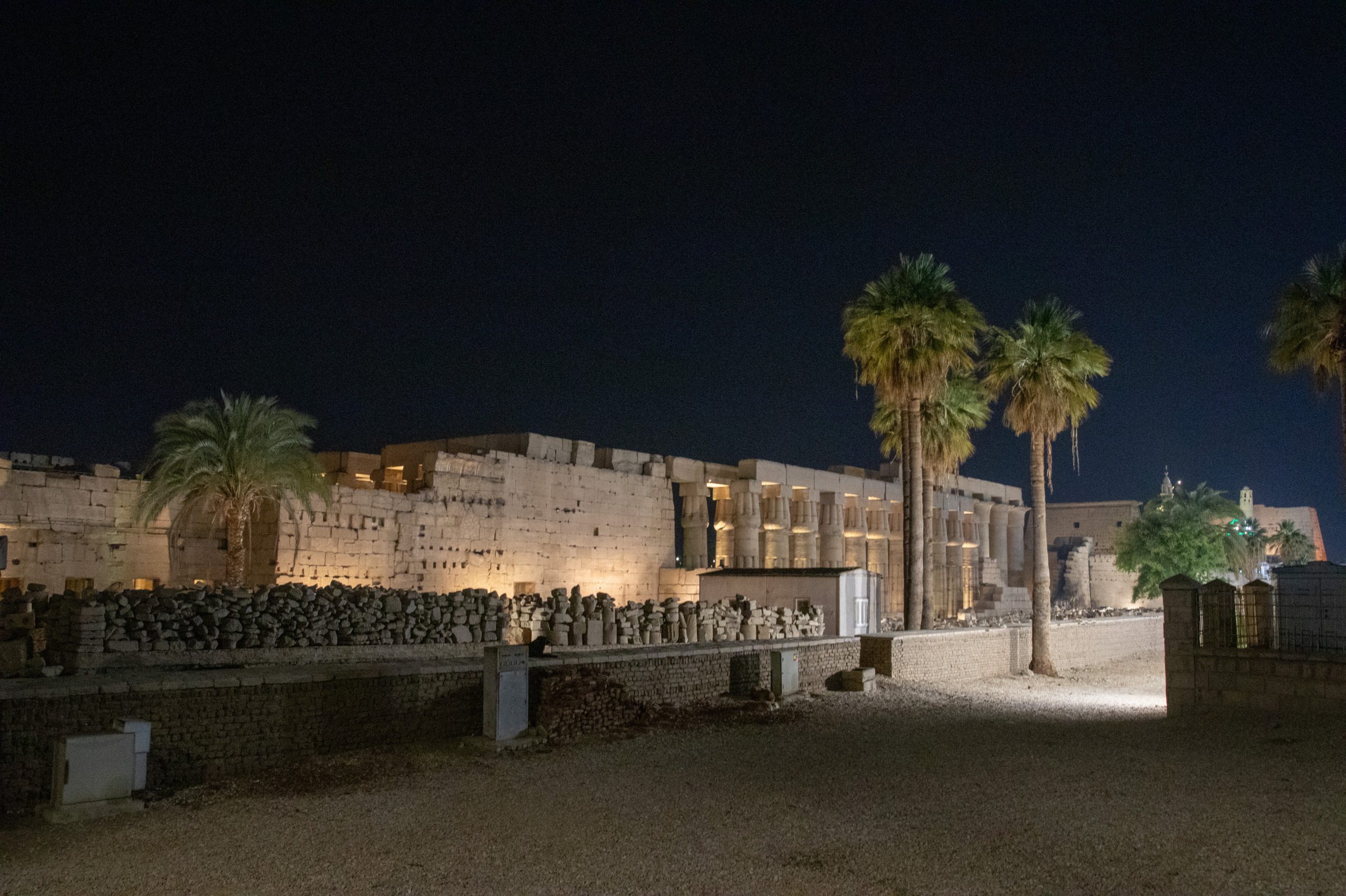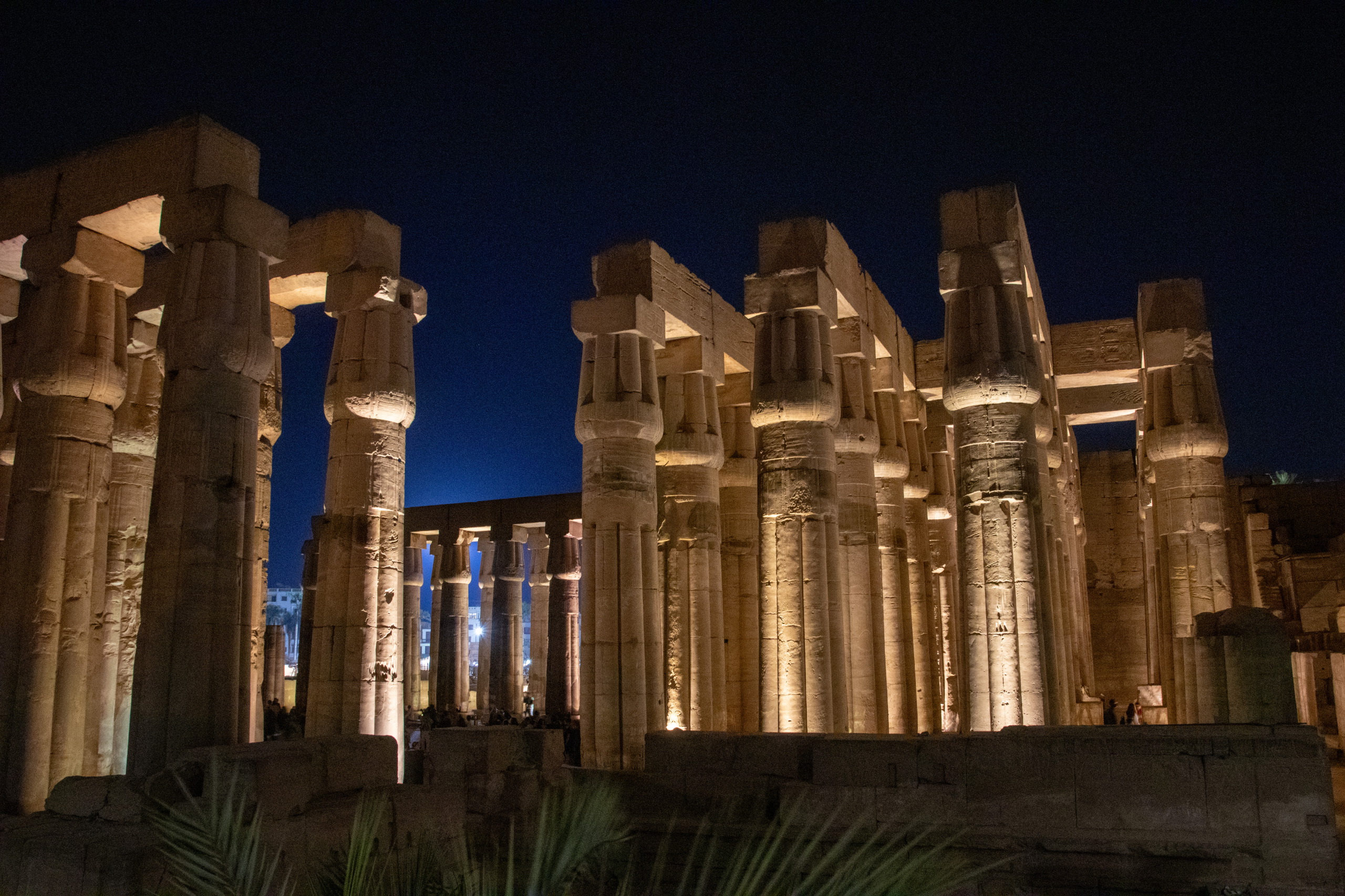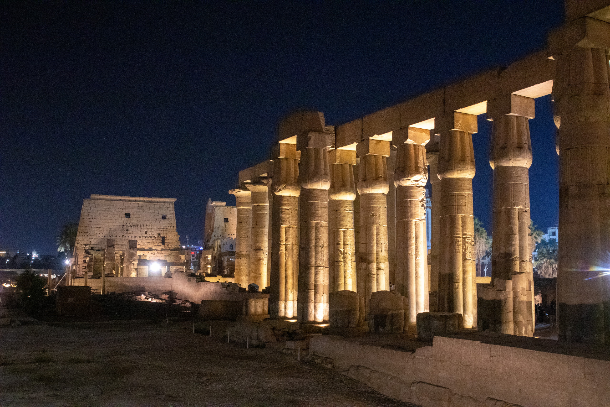 Um sechs Uhr treibt mich schließlich der Hunger aus dem Zimmer. Ich bin gespannt, wie viele Leute mich heute wieder anquatschen werden und mit wie vielen davon ich mich auf ein Gespräch einlasse. Zeit habe ich ja genug und Spaß macht es mir auch. Am Luxor-Tempel angekommen, fotografiere ich etwas, da noch “Licht brennt”. Ein Stück weiter ruft jemand meinen Namen. Wie bitte? Es ist der Feluka-Kapitän, der mich gestern ein Stück begleitet hat. Wir quatschen wieder eine Weile. Leider macht er mit mir kein Geschäft, ich habe aber den Eindruck, dass er sich gerne mit mir unterhält. Witzigerweise bestätigt er mir das bei der Verabschiedung. Vielleicht sucht er ja auch etwas Anschluss, da er vermutlich nicht ursprünglich aus Ägypten stammt. Sein schwarzes Äußeres und sein sehr gutes Englisch würden das bestätigen, gefragt habe ich ihn aber nicht.