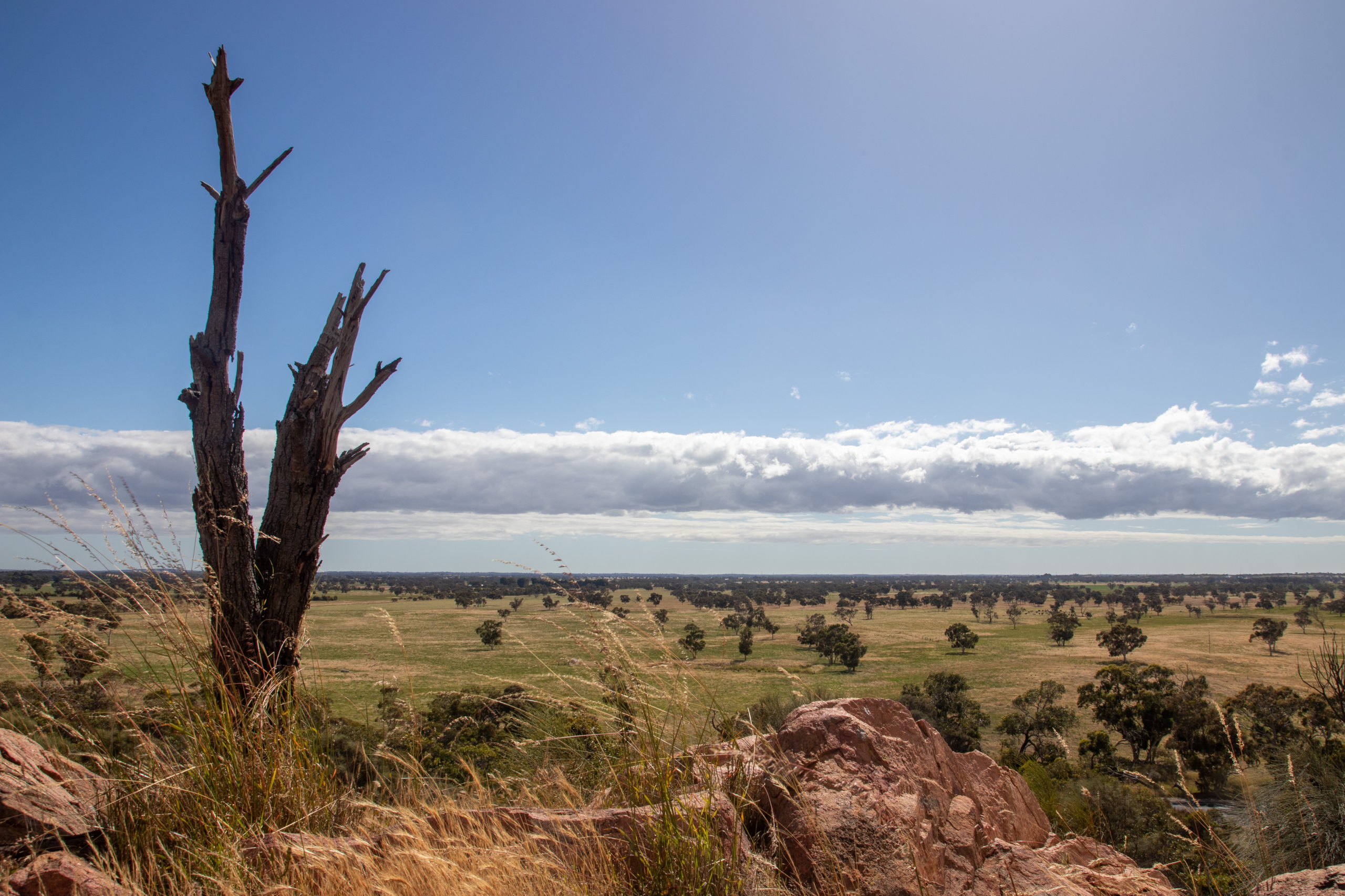 Bevor ich mich auf den weiteren Weg mache, kaufe ich noch zwei Insektengitter, um für das Outback gerüstet zu sein. Eine extrem gute Idee, wie sich noch herausstellen wird. Die weitere Strecke Richtung Adelaide ist nicht besonders spannend und so verwundert es mich nicht, dass ich für einen Powernap halten muss. Ausgeschlafen fahre ich weiter, bis mitten im Nichts die Christmas Rocks, nicht viel mehr als ein Haufen Steine, ausgeschildert ist. Der Weg führt hintenrum auf den kleinen Hügel, der mir einen tollen Blick über die umliegende Gegend ermöglicht. Vorsichtig folge ich dem Weg und trete fest auf den Boden auf, um eventuelle Schlangen auf mich aufmerksam zu machen, damit sie genügend Zeit haben, sich zu verziehen. Schlangen sehe ich keine, dafür hüpfen ein paar lustige Kängurus herum. 😀