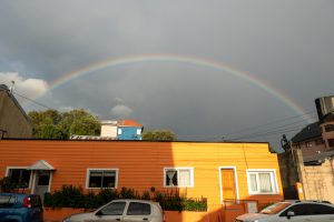 Da sich von meiner neuen Airbnb-Unterkunft noch immer niemand auf meine Anfrage gemeldet hat, rufe ich an. “Bitte nur über WhatsApp”, heißt es am Telefon. Na gut, dann eben über WhatsApp. Kurz wird mir mitgeteilt, dass sie nicht mehr mit Airbnb zusammenarbeiten. Ja schön für sie, aber wo schlafe ich heute? Es ist Hochsaison. Ich schreibe meinen aktuellen Host an und siehe da, die Unterkunft wurde frei, da jemand abgesagt hat. Schein gehabt. Nach einer ausgedehnten Dusche gehe ich gut aufgelegt zu einem einheimischen Imbiss. Am Weg dorthin sehe ich einen Regenbogen hinter einem Haus. Und schon wieder Glück gehabt. Das Essen schmeckt ausgezeichnet und das Bier gibt es in vernünftigen Einheiten. Vernünftig heißt hier 970 ml, also fast ein Liter. Vollgefressen melde ich den Vorfall bei Airbnb und schreibe endlich die ersten beiden Artikel für den Blog.