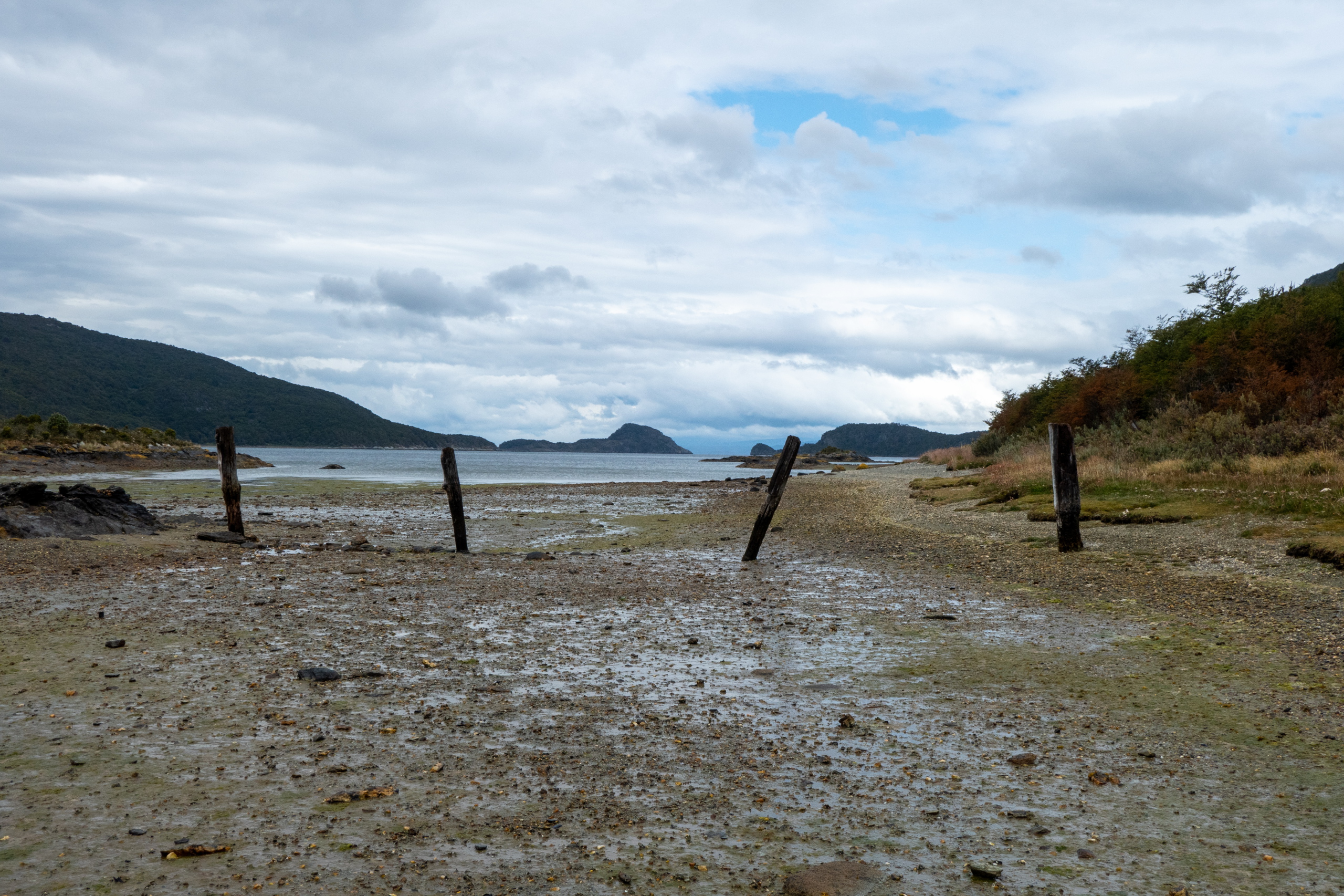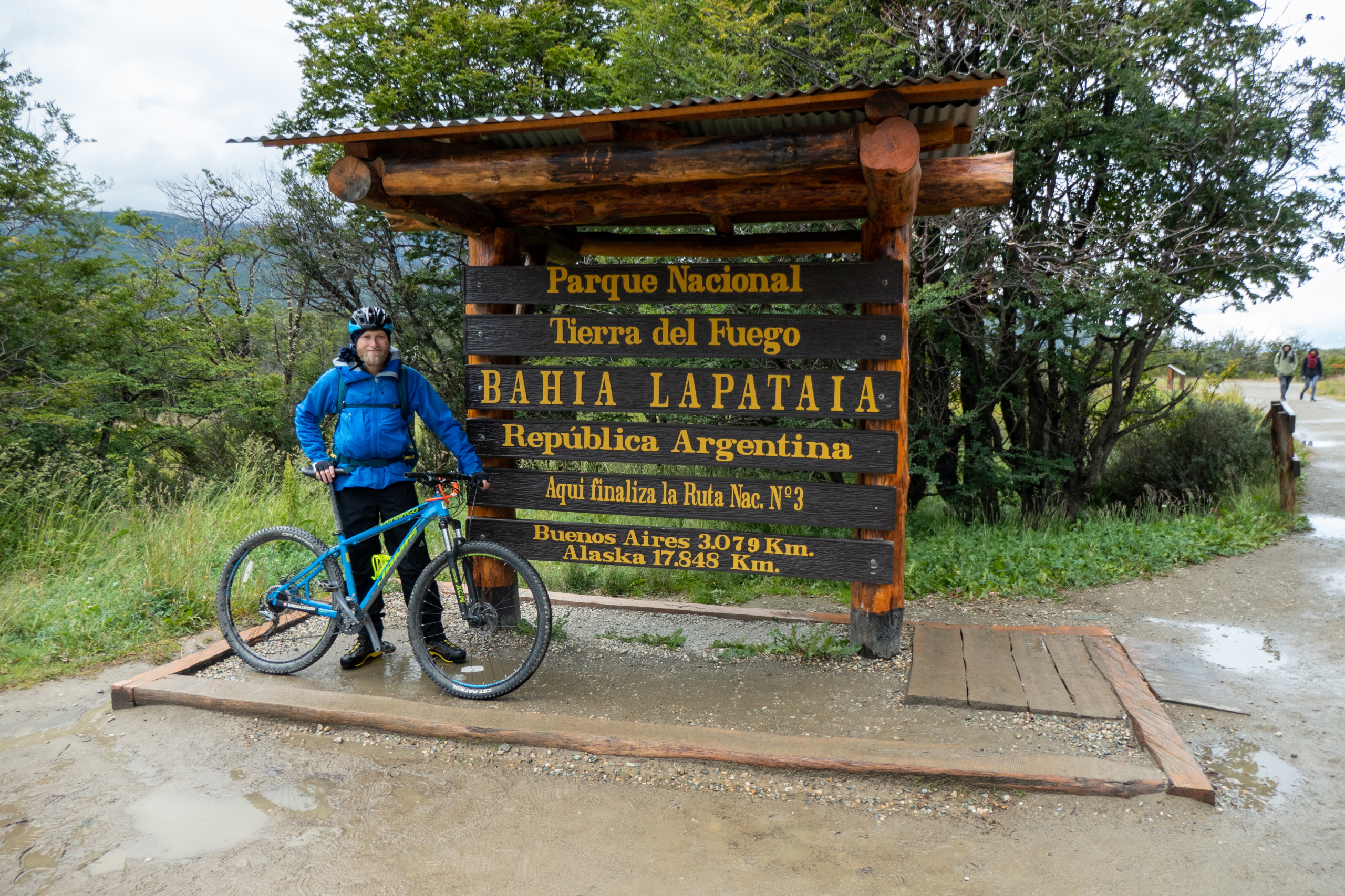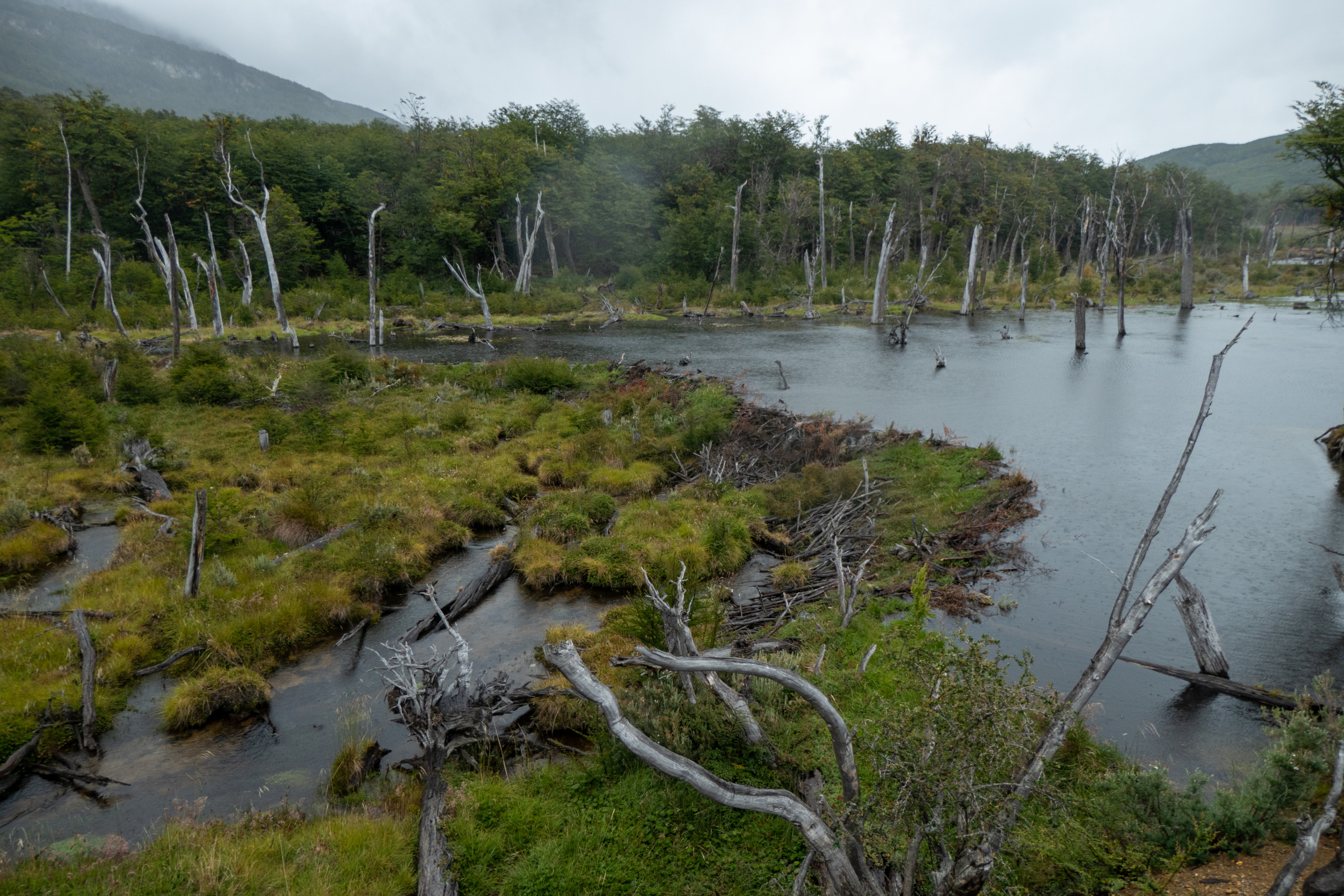 Auf meinem Weg weiter durch den Park beginnt es zu regnen. Bis ich Regenhose und Regenjacke angezogen habe, hat es auch schon wieder aufgehört und die Sonne kommt ein wenig raus. Egal, ich behalte die Sachen an und fahre die Straße weiter entlang, überquere den Rio Ovandi und mache einen Abstecher zu einem Biberdamm. Dieser staut das Wasser beinahe zwei Meter hoch. Nicht schlecht. Nach einer Weile habe ich die Laguna Lapataia erreicht, dem Ende der Ruta Nacional 3. Von hier sind es 3079 km bis Buenos Aires. Etwas Posen vor dem Schild muss natürlich sein. Im Anschluss führt mich eine kurze Wanderung bis zu einer netten Bucht.