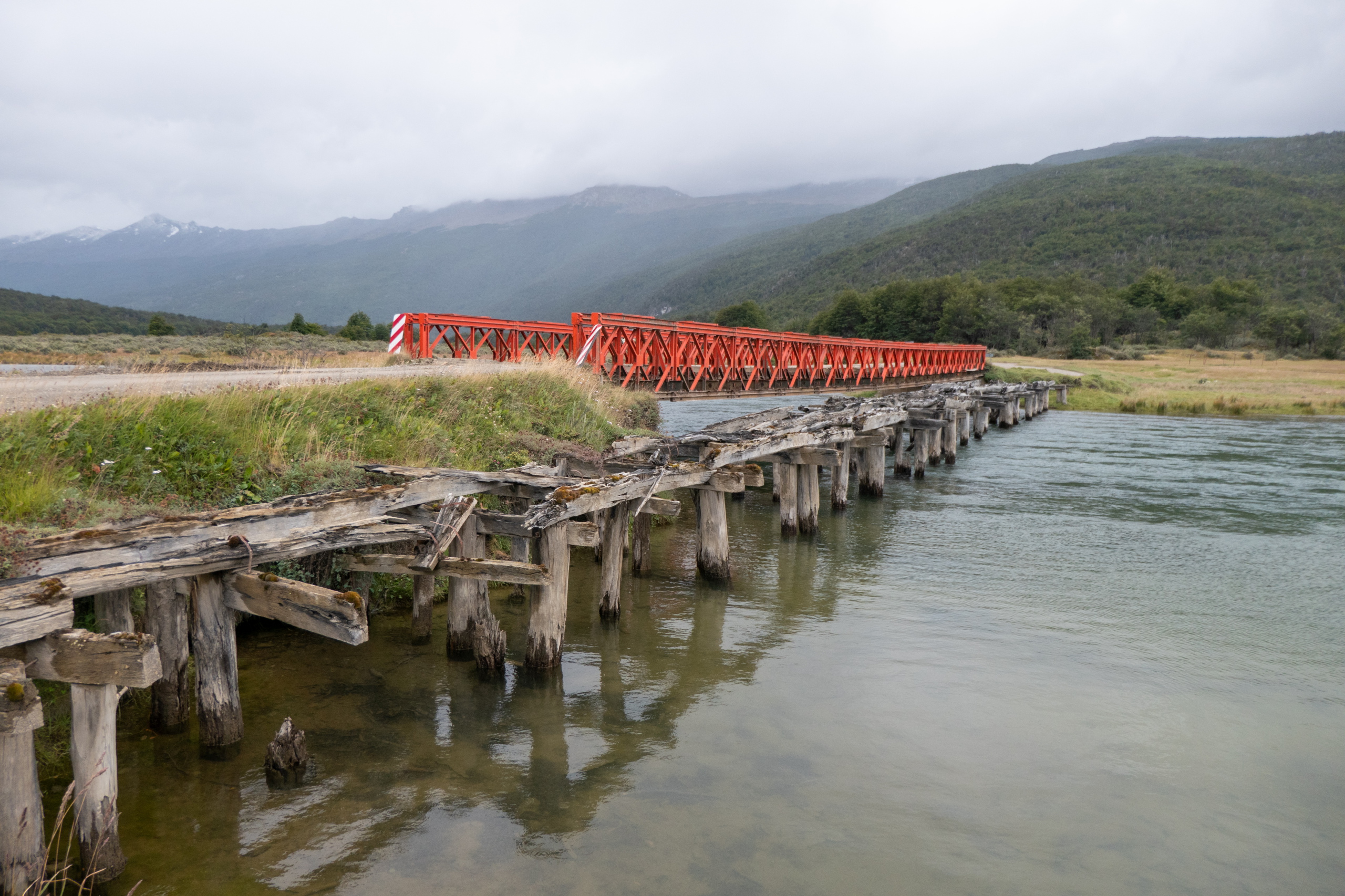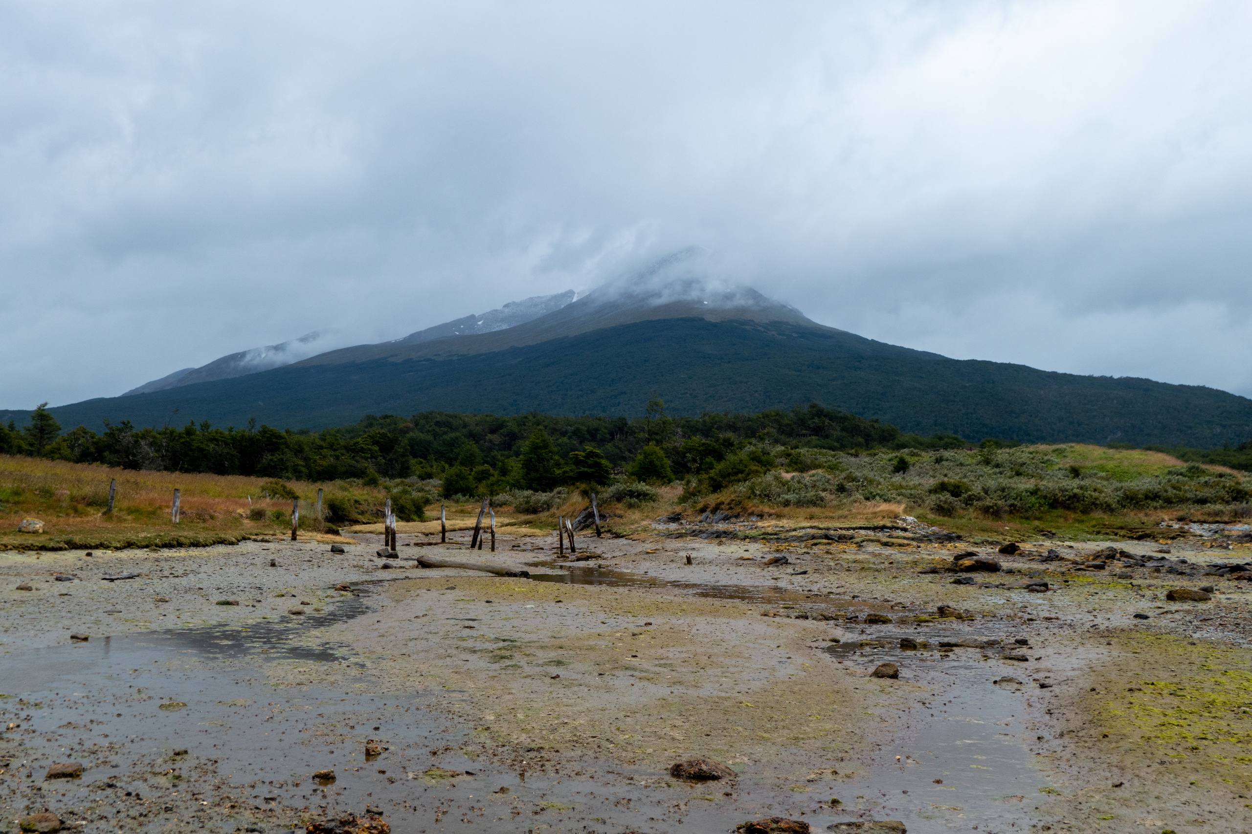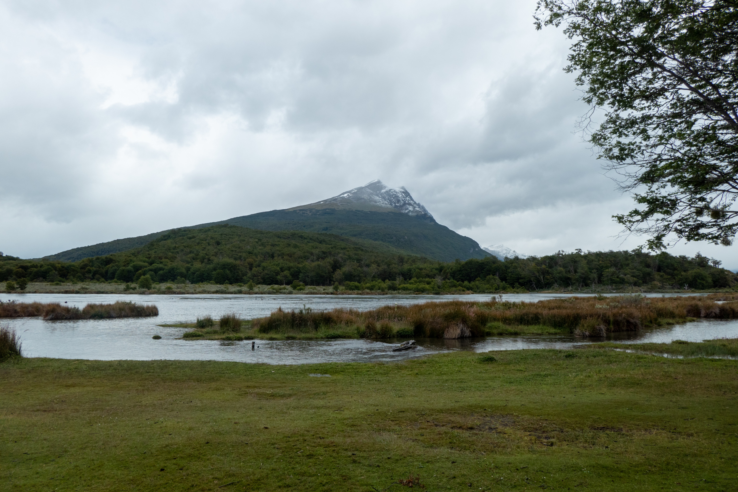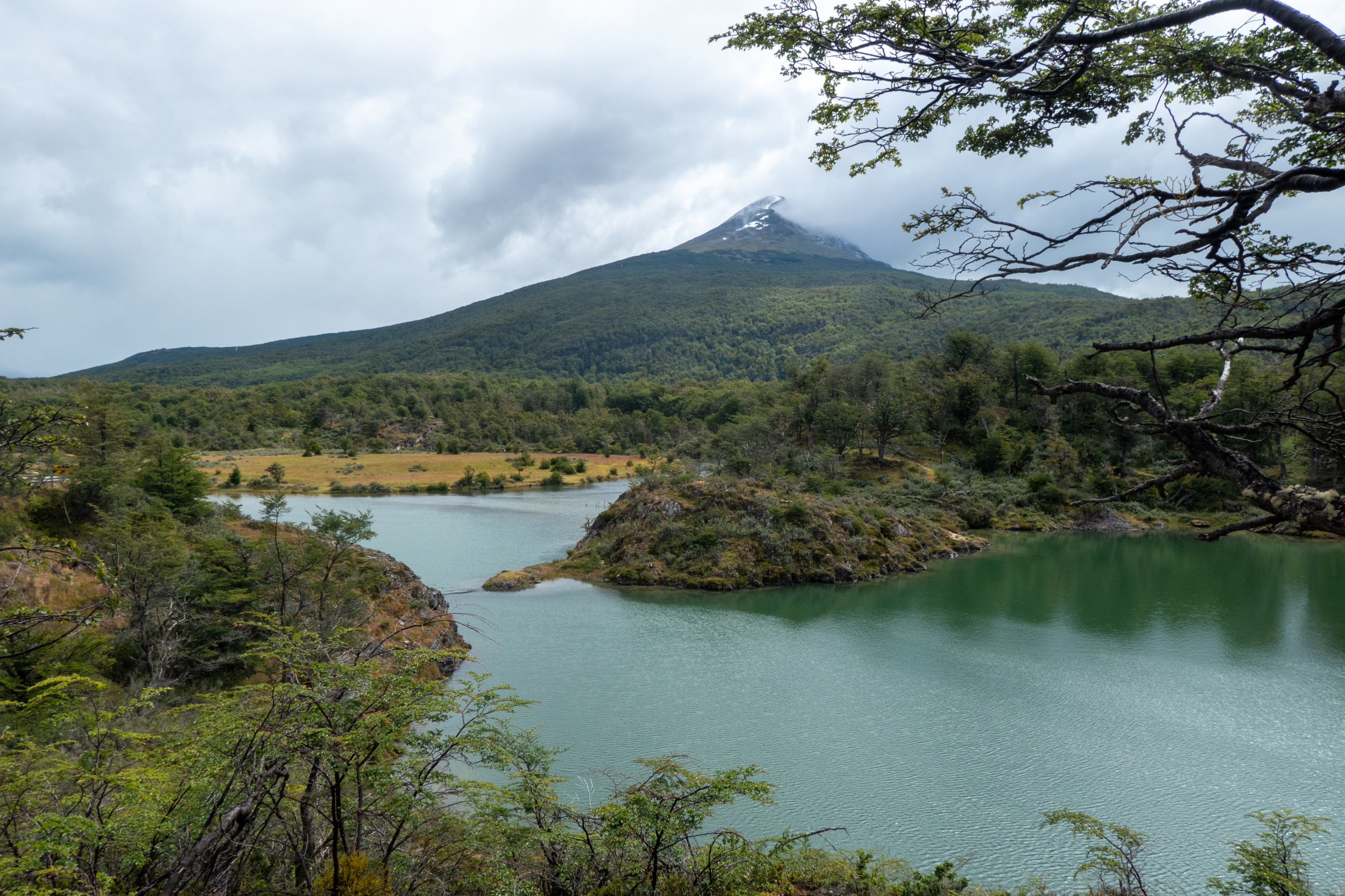 Auf meinem Weg weiter durch den Park beginnt es zu regnen. Bis ich Regenhose und Regenjacke angezogen habe, hat es auch schon wieder aufgehört und die Sonne kommt ein wenig raus. Egal, ich behalte die Sachen an und fahre die Straße weiter entlang, überquere den Rio Ovandi und mache einen Abstecher zu einem Biberdamm. Dieser staut das Wasser beinahe zwei Meter hoch. Nicht schlecht. Nach einer Weile habe ich die Laguna Lapataia erreicht, dem Ende der Ruta Nacional 3. Von hier sind es 3079 km bis Buenos Aires. Etwas Posen vor dem Schild muss natürlich sein. Im Anschluss führt mich eine kurze Wanderung bis zu einer netten Bucht.