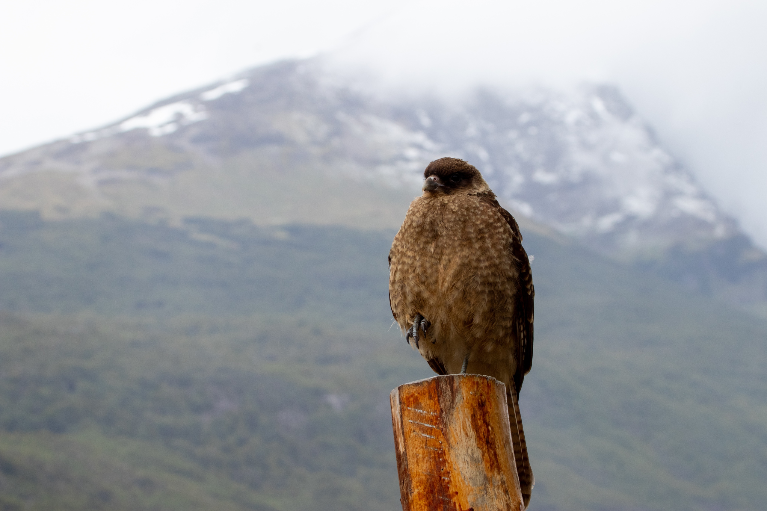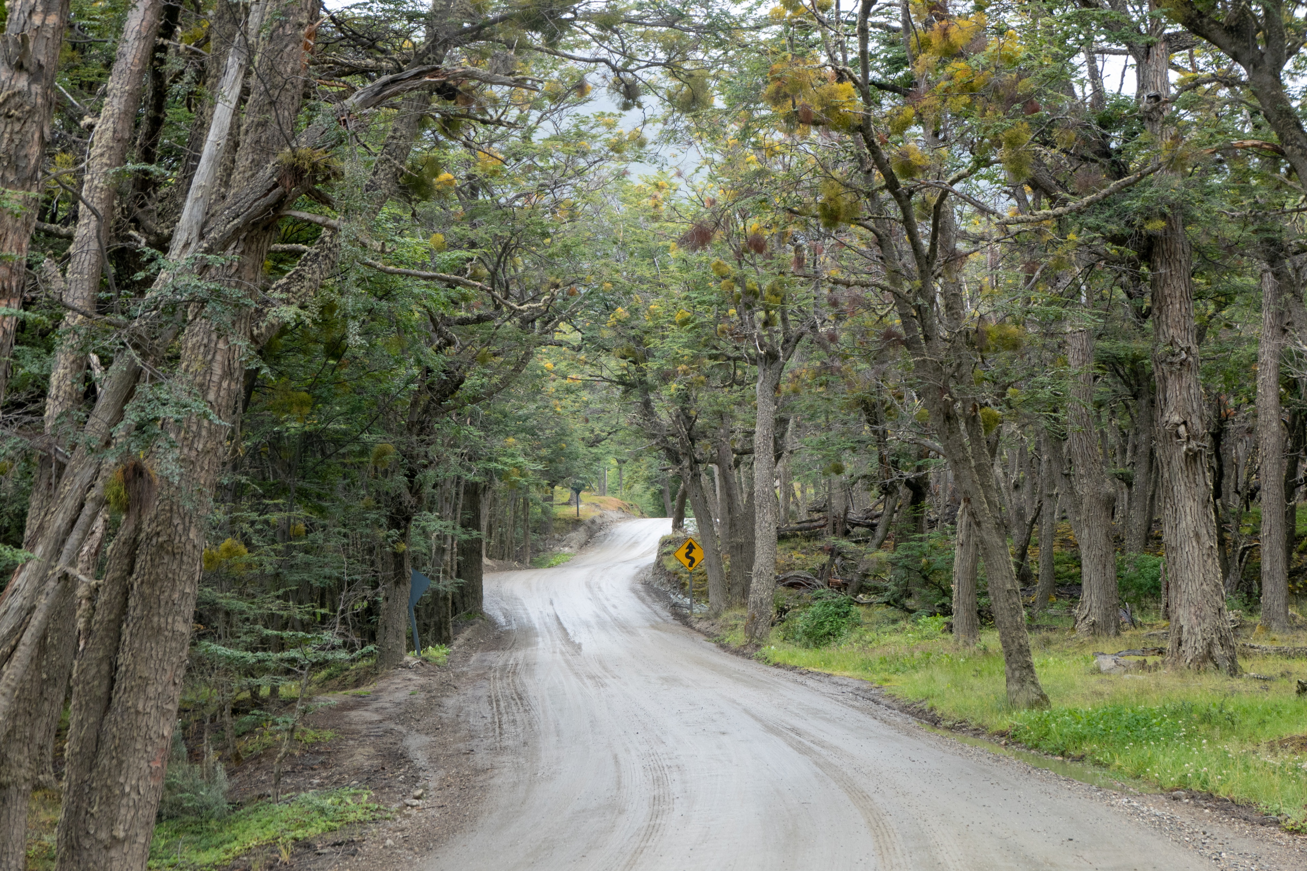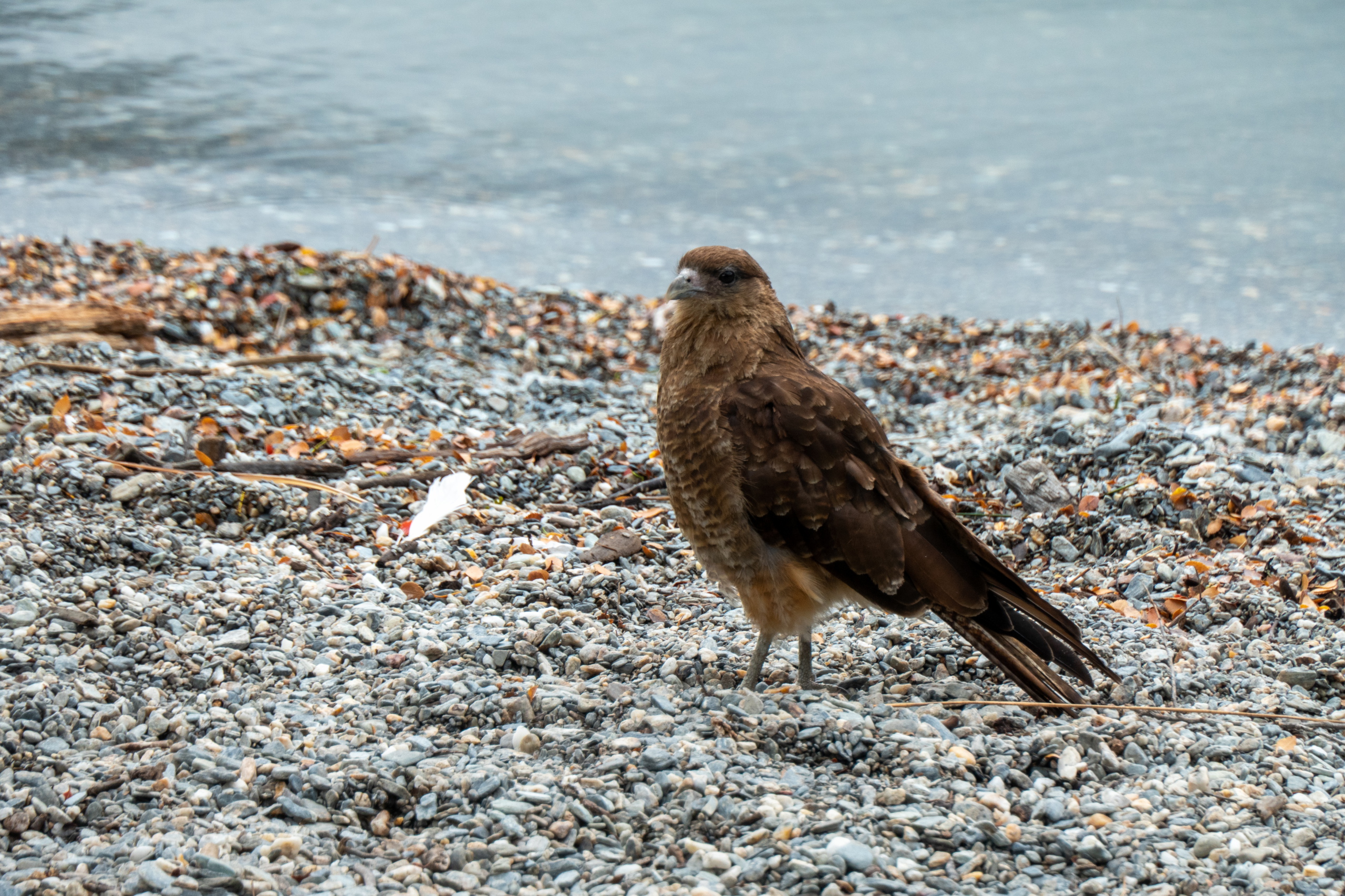 Die letzten Tage waren anstrengend. Darum schlafe ich so richtig aus und stehe erst um 9:30 auf. Ich packe mein Zeugs, da ich heute in eine andere Airbnb-Unterkunft umziehen muss. Mit dem 29er geht es zum Supermarkt Jause ausfassen und dann entlang der Ruta Nacional 3 nach Westen zum Nationalpark Tierra del Fuego. Gegenwind, was sonst. Kann man ja gut an der Wuchsrichtung der Bäume erkennen, dass dies keine Seltenheit ist. Teilweise muss ich bergab in die Pedale treten um vorwärts zu kommen. Es liegt ein wenig frischer Schnee auf den Bergen und es regnet leicht. Klassisches patagonisches Wetter eben. Vor ein paar Tagen noch haben die Einheimischen bei 20 Grad geschwitzt wie die Schweine. Woher kommt eigentlich dieser Spruch? Egal. Ich schwitze beim Ankämpfen gegen den kalten Wind. Im leichten Auf und Ab geht es zwölf Kilometer bis zum Eingang zum Nationalpark. Von hier sind es noch mal neun Kilometer auf einer Schotterstraße bis zum Besucherzentrum. Der Weg zum Cerro Guanaco ist heute wegen schlechtem Wetter geschlossen und so fahre ich direkt weiter zum Lago Roca. Dort sehe ich einen Caracara Chimango (Raubvogel) und einen etwas ängstlich wirkenden Andenschakal. Nice!