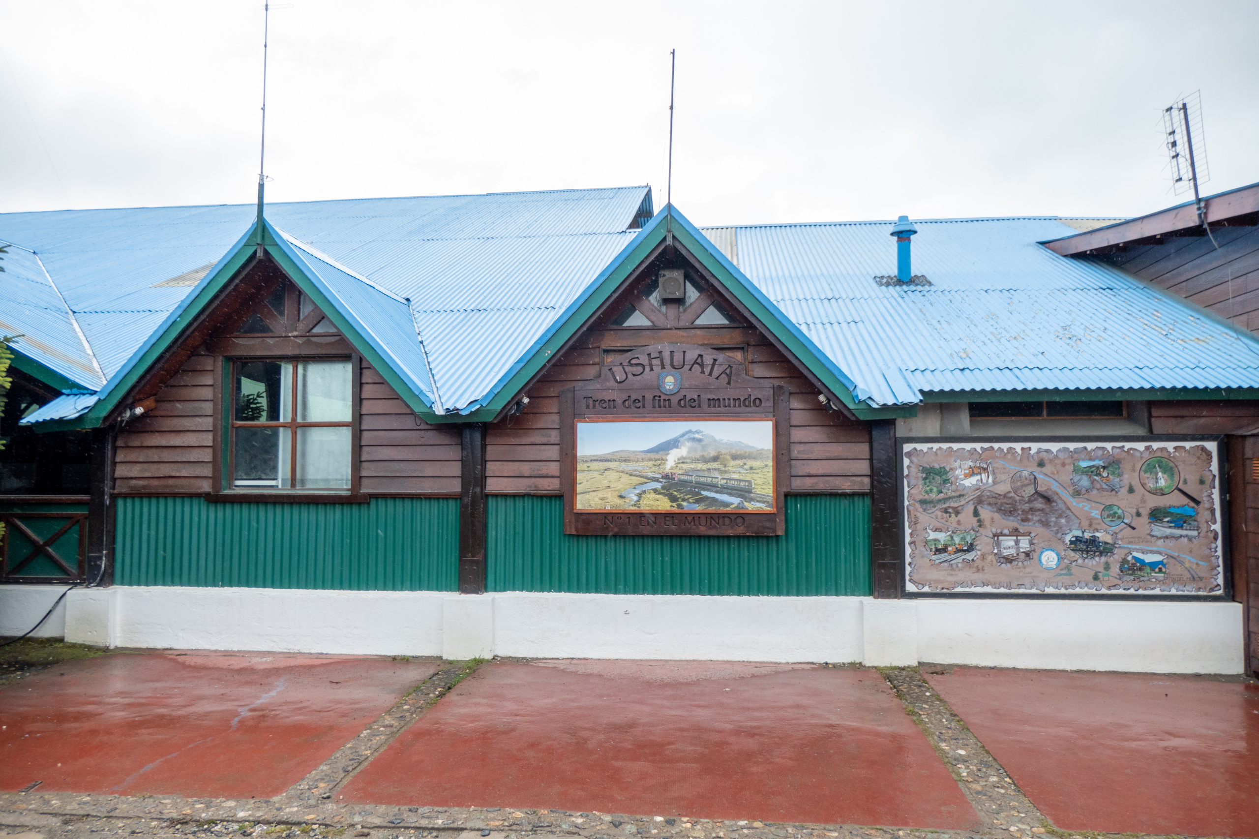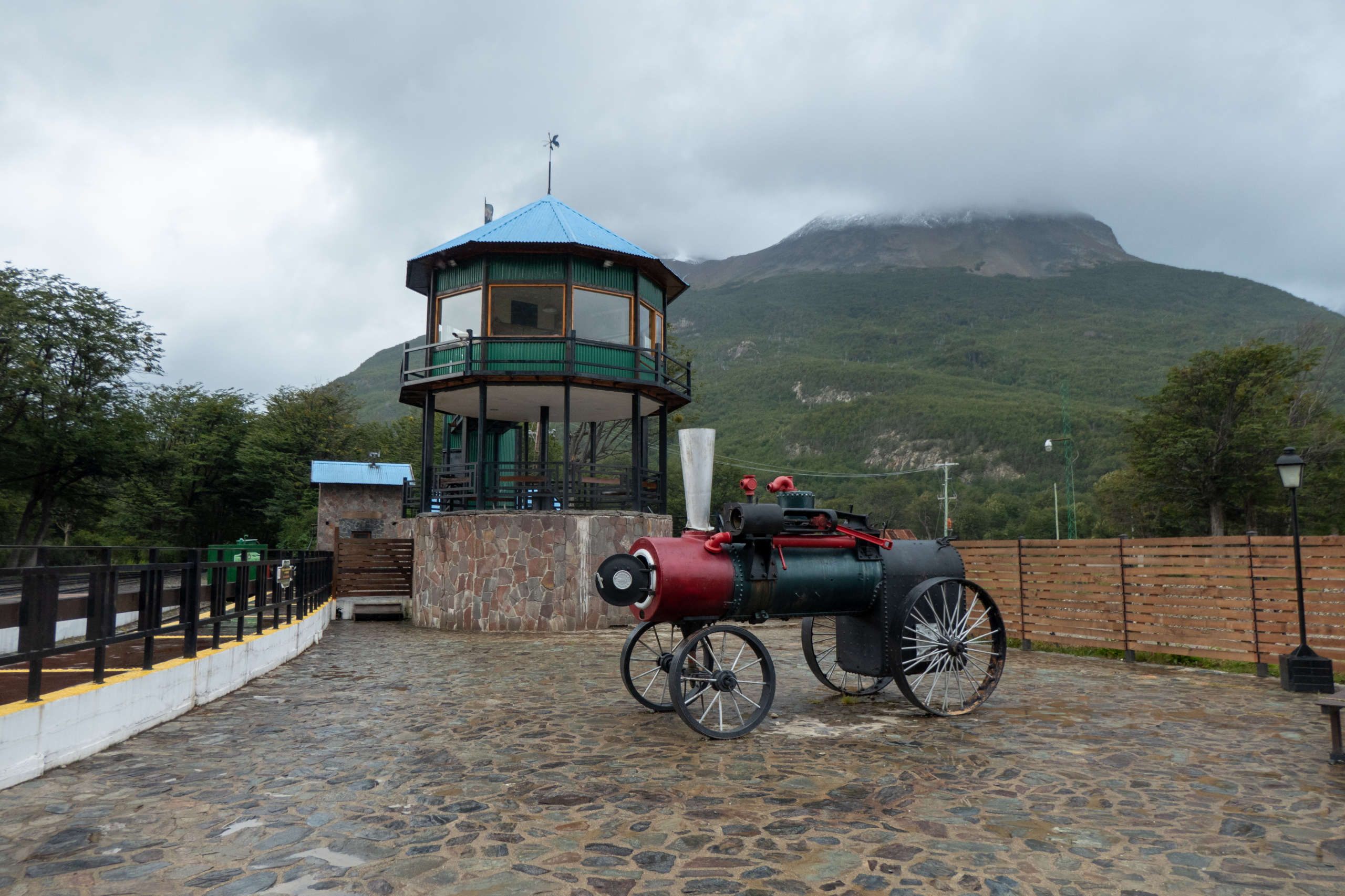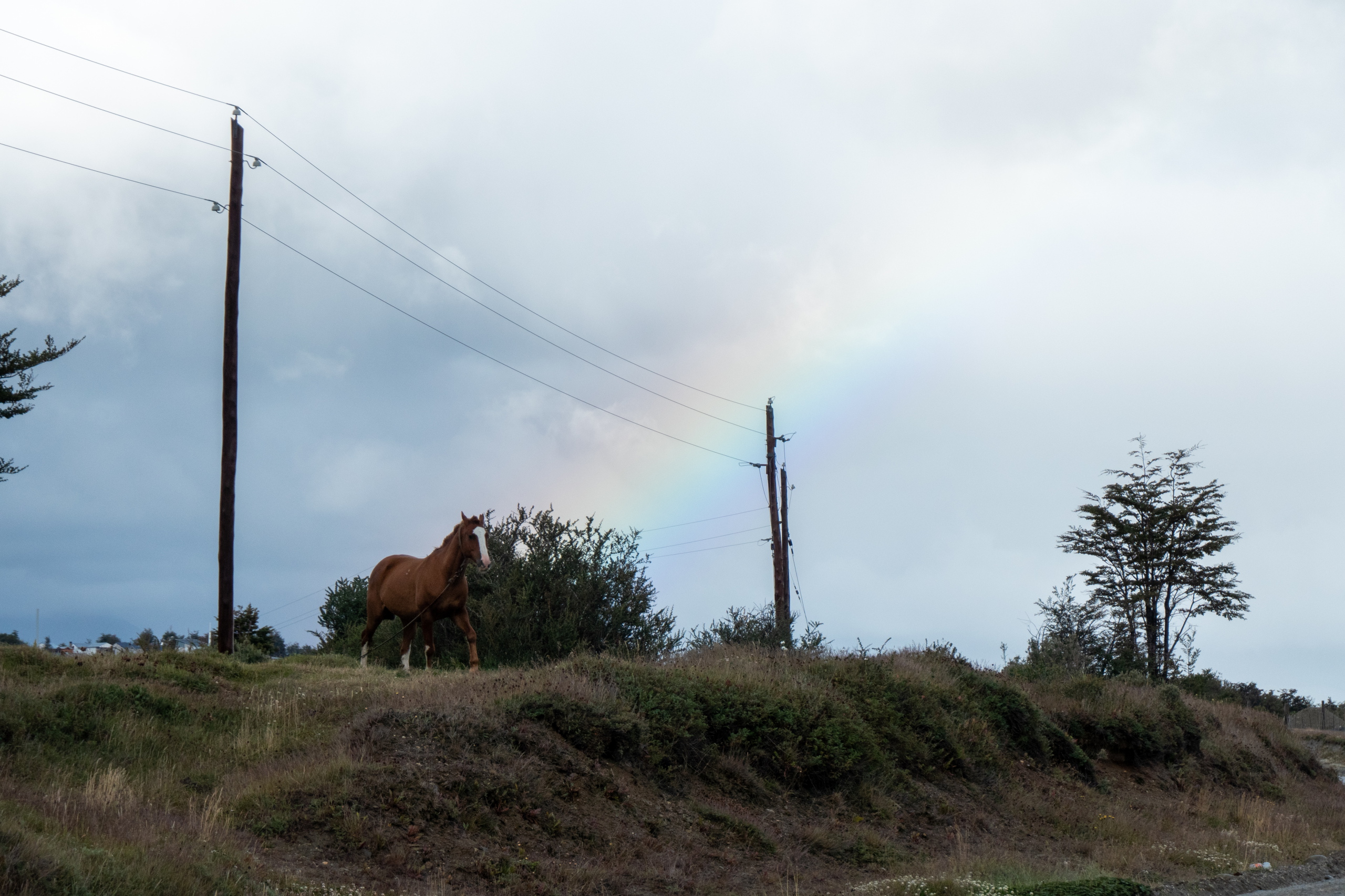Mit dem Wind im Rücken geht es flott zurück Richtung Ushuaia. Ich mache noch einen kurzen Abstecher zum Bahnhof des Zuges am Ende der Welt. Leider ist dieser nicht in voller Pracht zu sehen, dafür aber eine alte Lokomotive, die noch mit Dampf angetrieben wurde. Von der Straße aus sehe ich ein Pferd vor einem Regenbogen. Es wird doch wohl kein Einhorn sein. 🙂