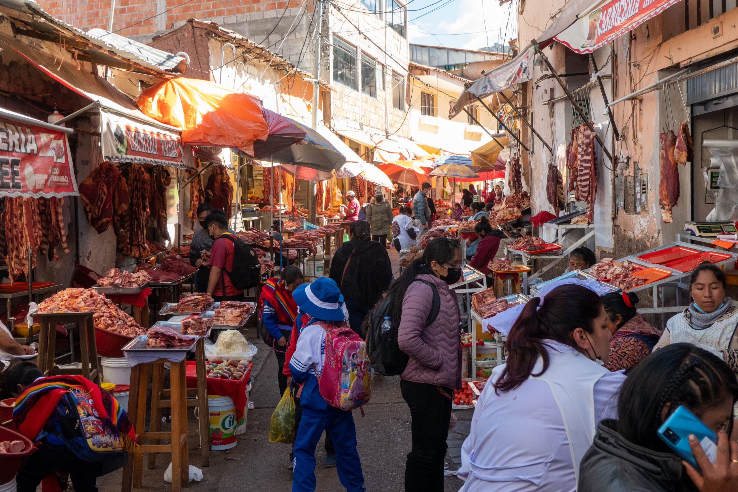 Für heute steht außer Reisen nicht viel auf dem Programm, darum schlafe ich mich aus, gehe spät zum unerwartet guten Frühstück und begebe mich zum schon bekannten Punkt von dem die Colectivos die Stadt verlassen. Heute geht es aber direkt nach Cusco, wo ich etwas nach Mittag ankomme. Nach einem unschlagbar günstigen Almuerzo genehmige ich mir noch den obligatorischen Schokopudding. Heute in einem anderen Mercado, dafür mit Eischnee als Topping.