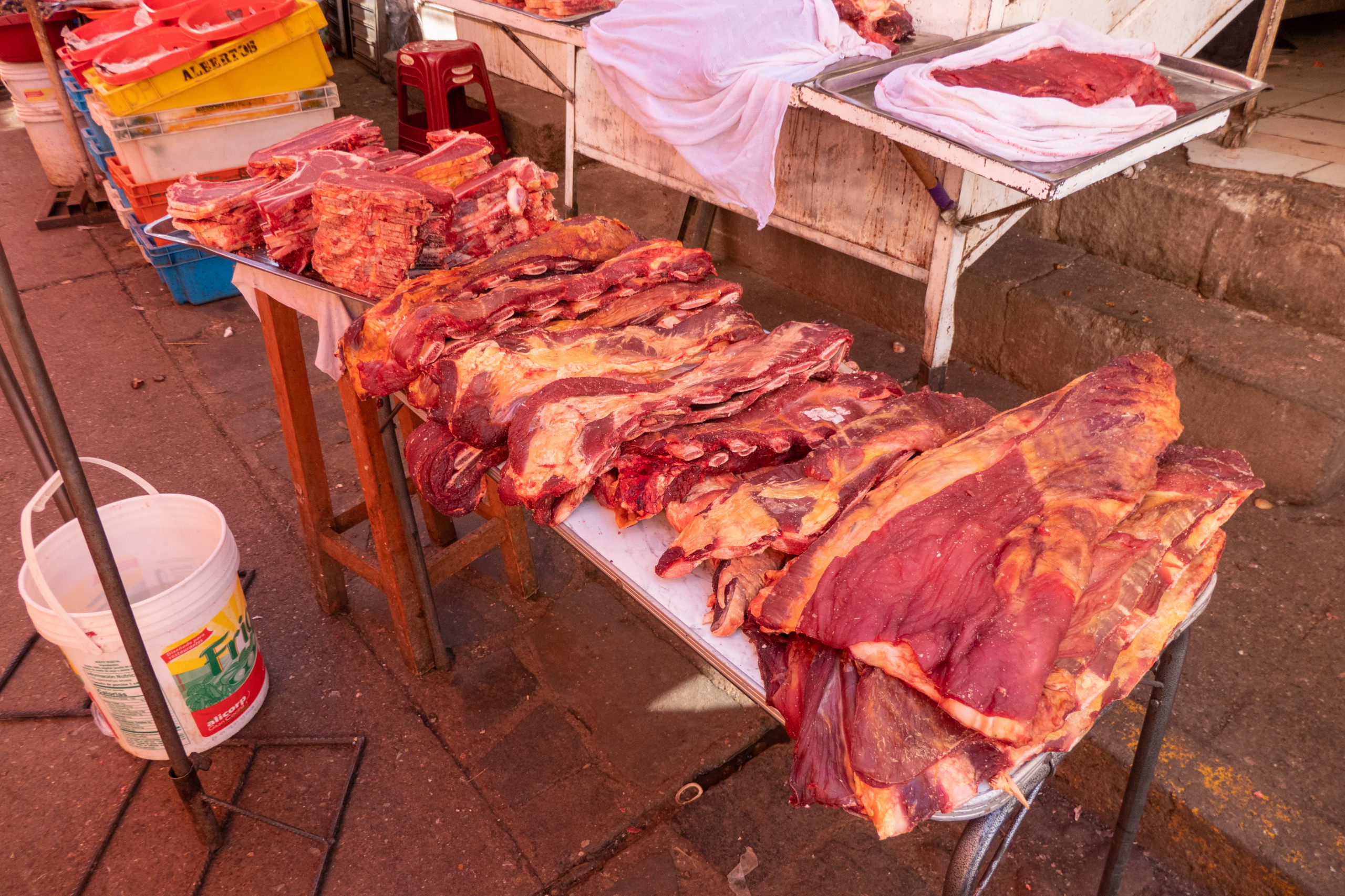 Am Plaza de Armas verabschiede ich mich von Alfonso und Enrique, denn für die beiden geht es weiter nach Lima und in zwei Tagen zurück nach Mexiko. Für mich geht es zuerst in die Unterkunft und dann gleich in die hässliche Stadt, da ich mächtig Hunger habe. Ich bestelle Caldo de Gallina und Fresol de Abodo, was auch immer das ist. Es ist eine riesige Portion Fleisch mit Reis und vielen Bohnen. 👍