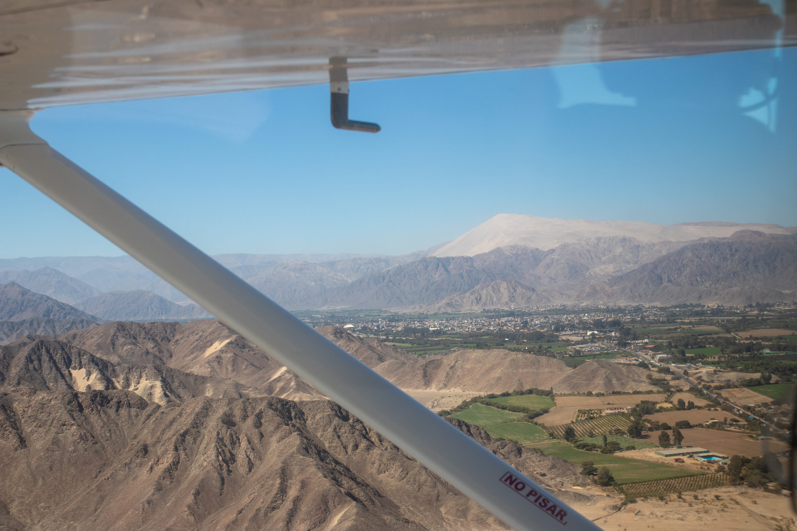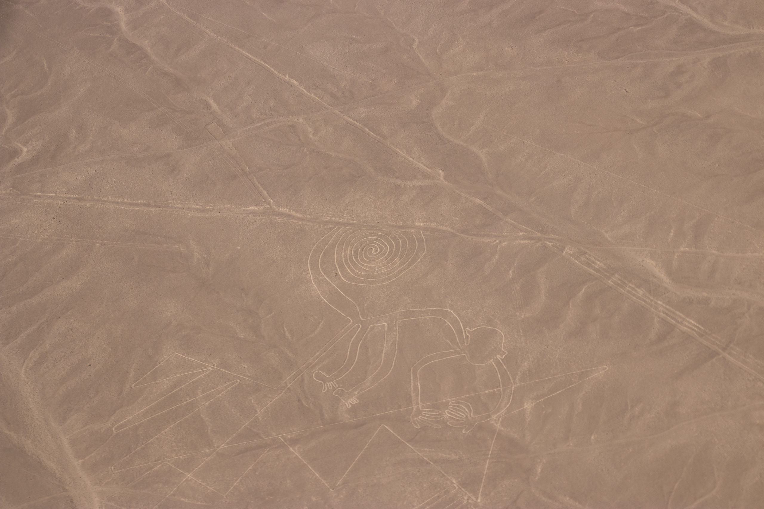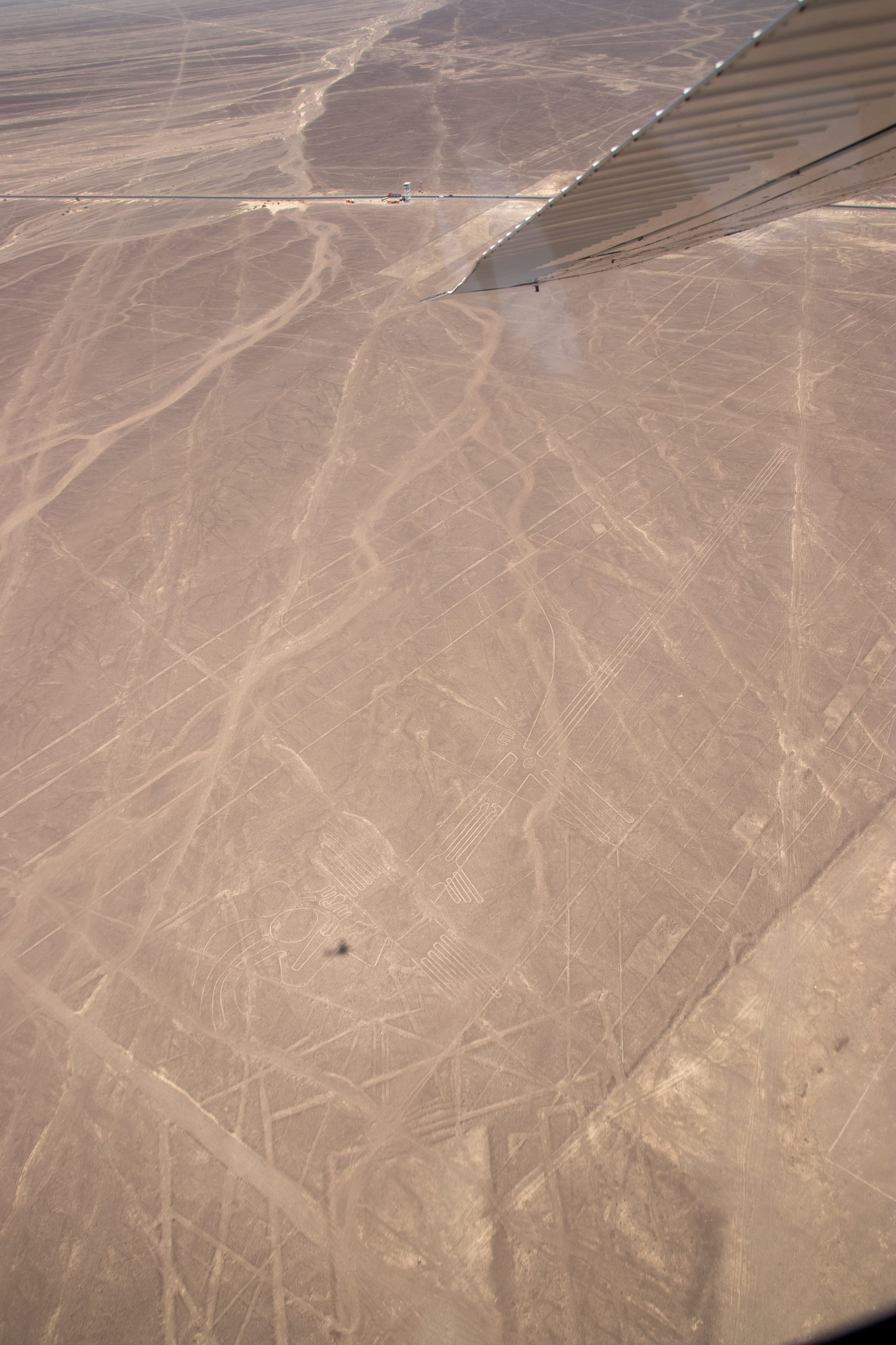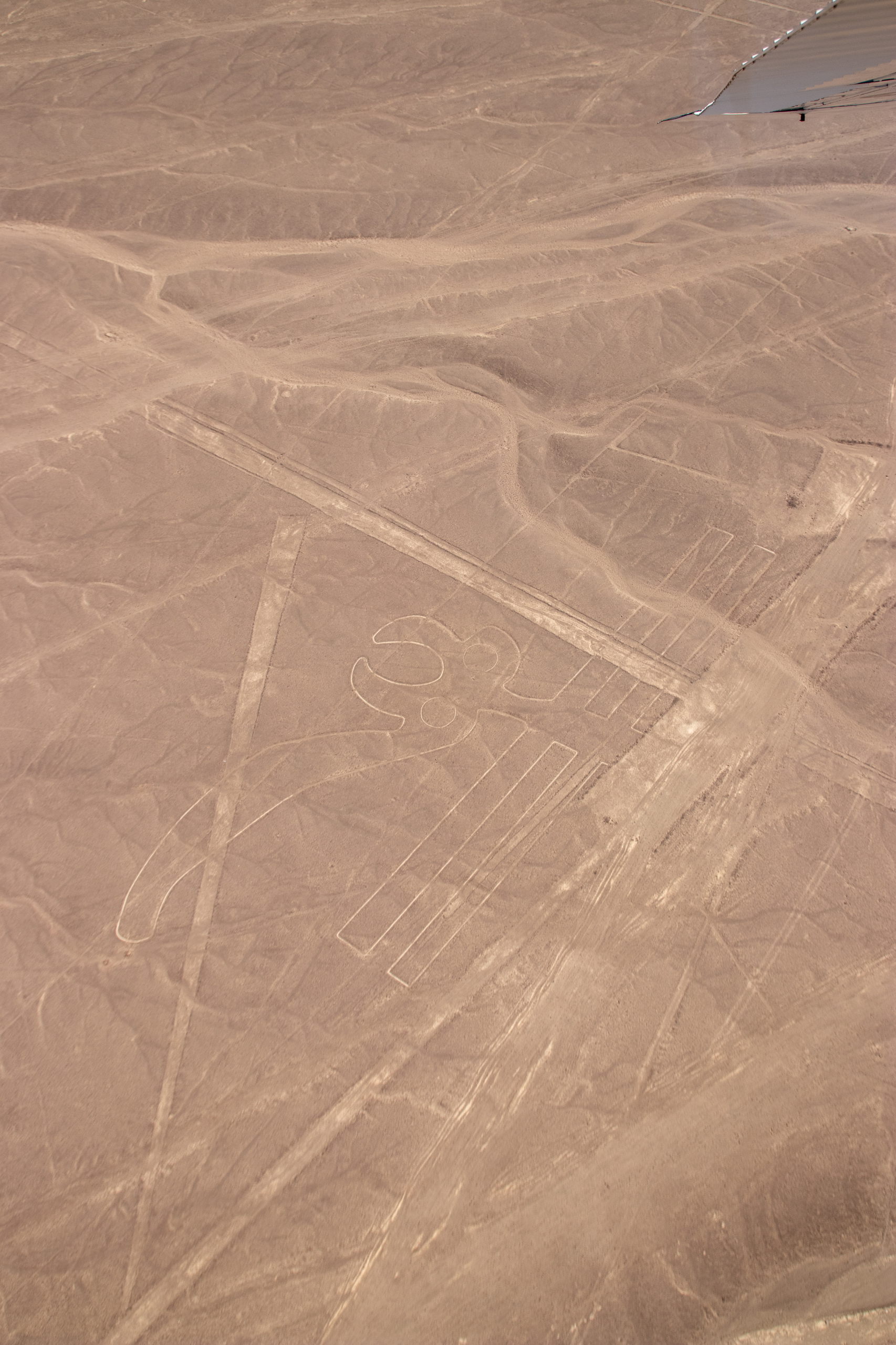 Endlich holt uns jemand ab und um kurz vor Mittag heben wir in einem kleinen Flugzeug ab. In etwas mehr als einer halben Stunde fliegen wir über die wichtigsten Formen wie z.B. Affe, Astronaut, Kolibri, Papagei, Spinne und noch einige andere. Anschließend werden wir wieder in die Stadt gefahren. Nazca selbst gibt nicht viel her, darum geht es für uns drei gleich weiter. Wir checken ein Colectivo und müssen etwas warten, bis es voll ist. Dafür rasen wir dann mit Vollgas nach Ica.